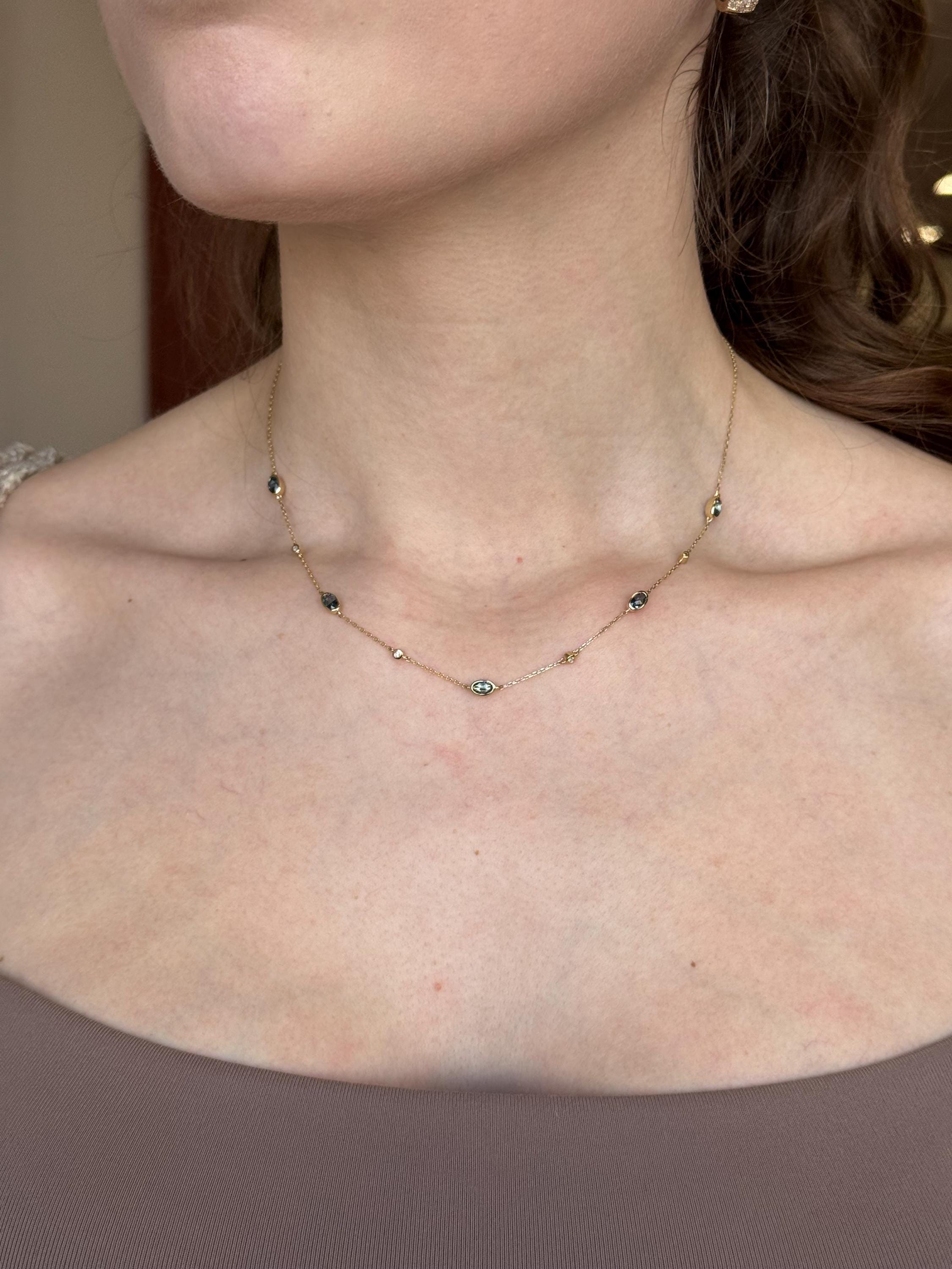Yellow Gold Blue Topaz and Diamond Station Necklace. This necklace is set with five genuine Oval Blue Topaz and four natural Round Brilliant Diamonds. These Blue Topaz amount to a total weight of 1 1/2 carats. The diamonds in this necklace are H color, I1 clarity and weigh a total of .06 carat. This necklace is 10KT Yellow Gold and measures 17" in overall length. The necklace weighs 3.1 grams and will be accompanied by an appraisal written by a GIA Certified Diamond Grader with the retail replacement value of $1,495.00. I will ship this necklace promptly in a beautiful gift box.