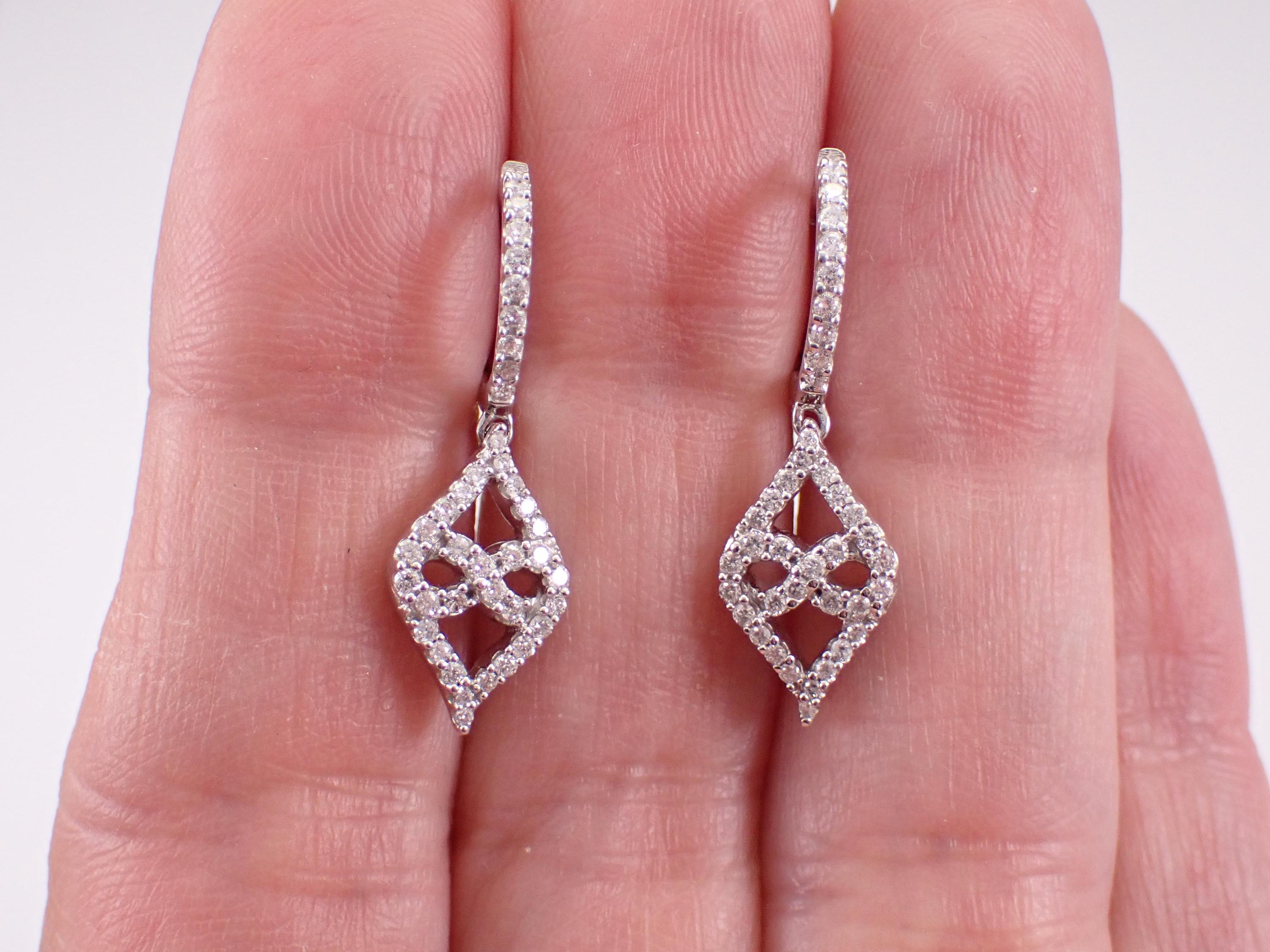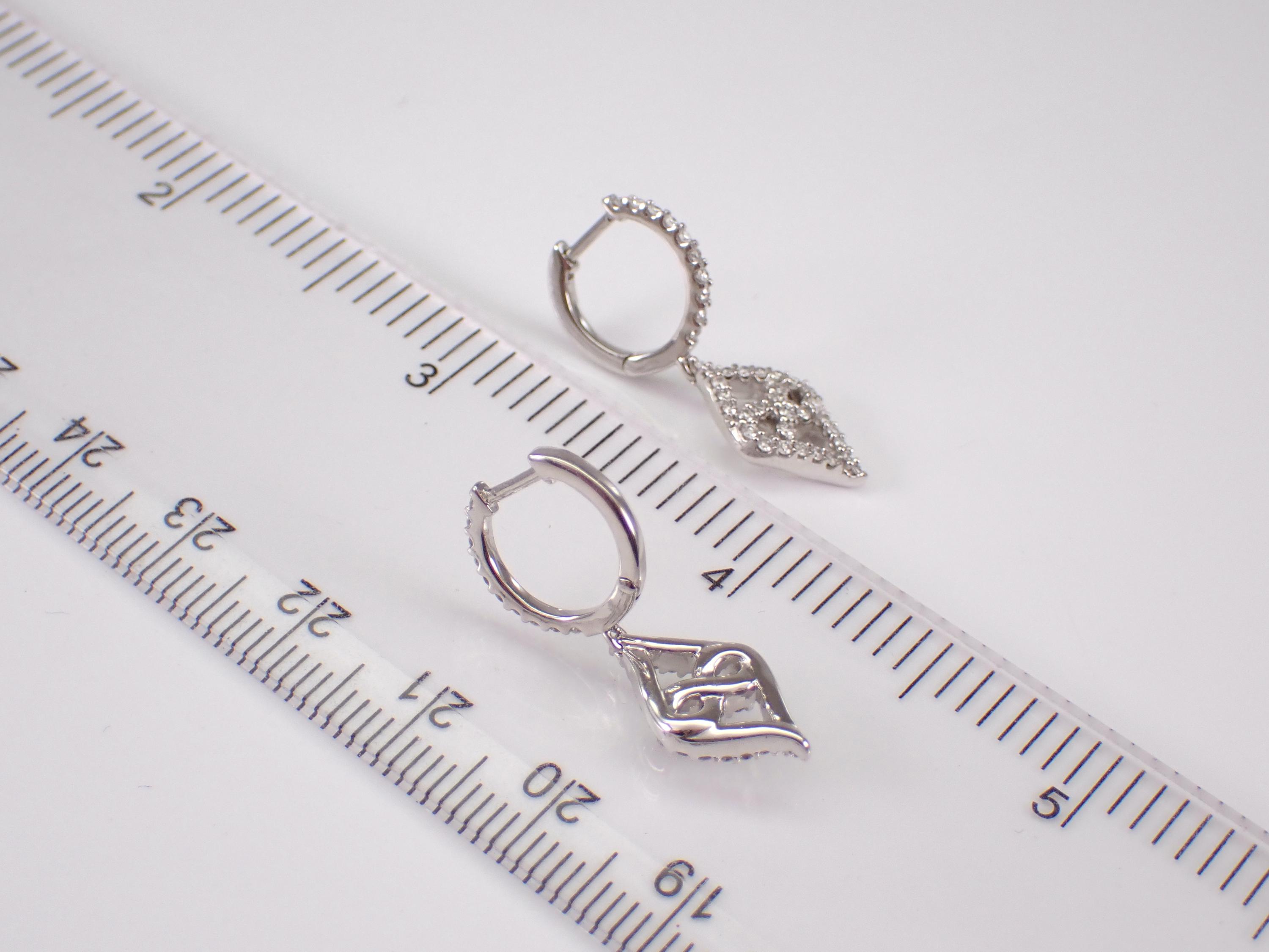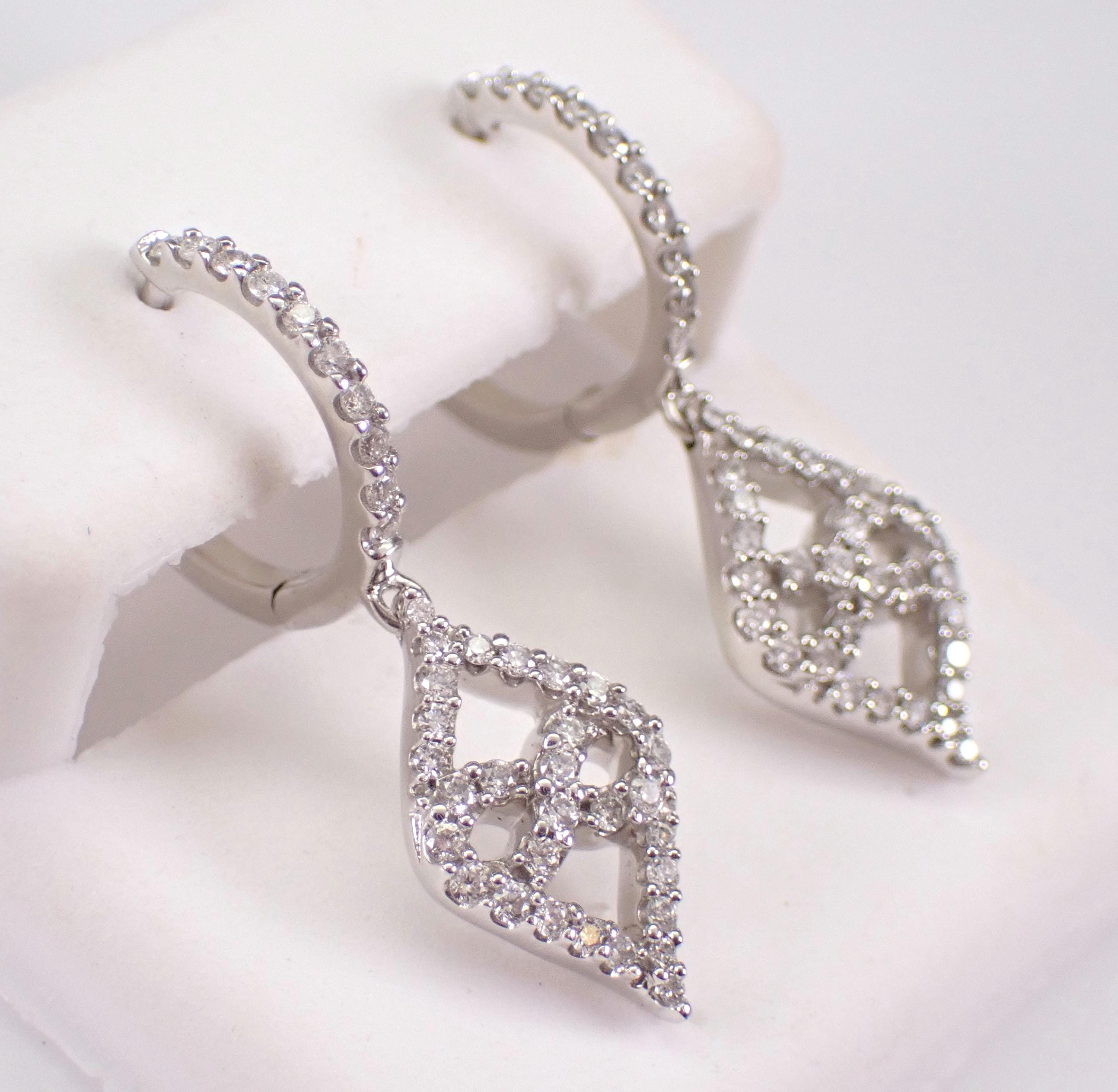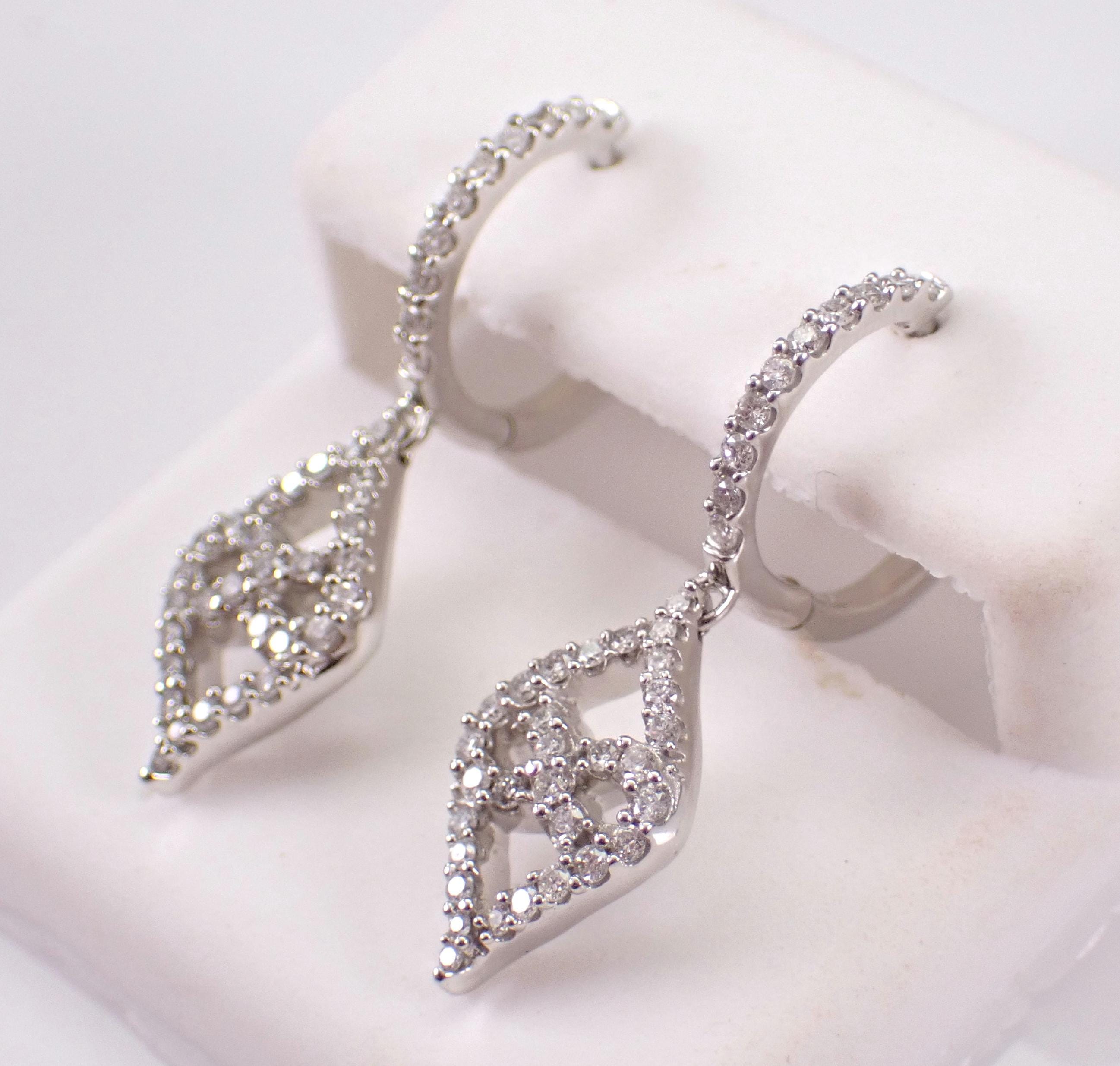 White Gold Diamond Dangle Earrings. These earrings are set with forty natural Round Brilliant Diamonds in EACH earring. These Diamonds are H color, SI/I clarity and amount to a total weight of 1/2 carat. These earrings are 10K White Gold, weigh 3.8 grams and measure 27 mm in length. These earrings are for pierced ears and the earrings have secure latch back closure. These earrings will be accompanied by an appraisal written by a GIA Certified Diamond Grader with the retail replacement value of $1,795.00. I will ship these earrings promptly in a gift box.