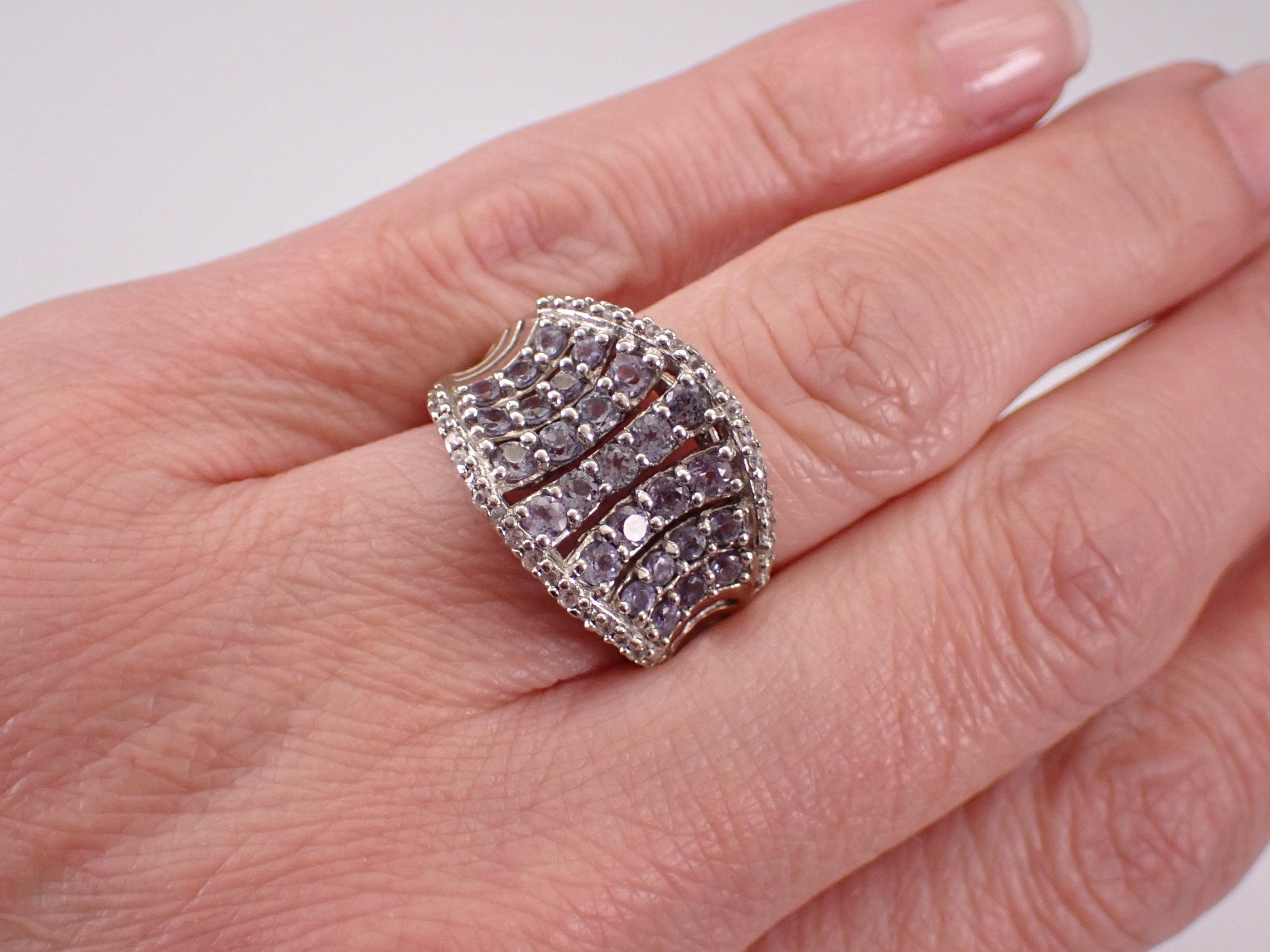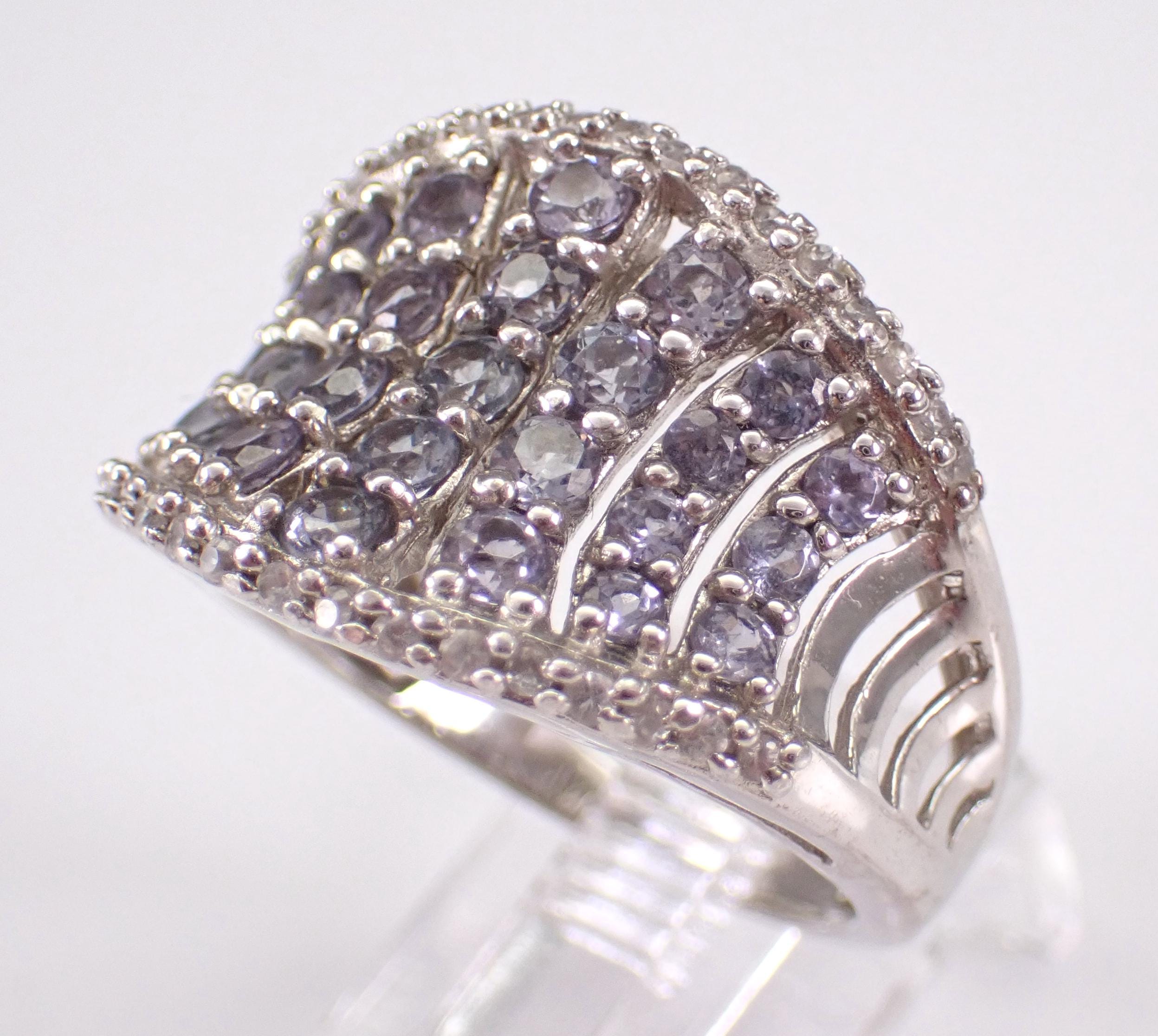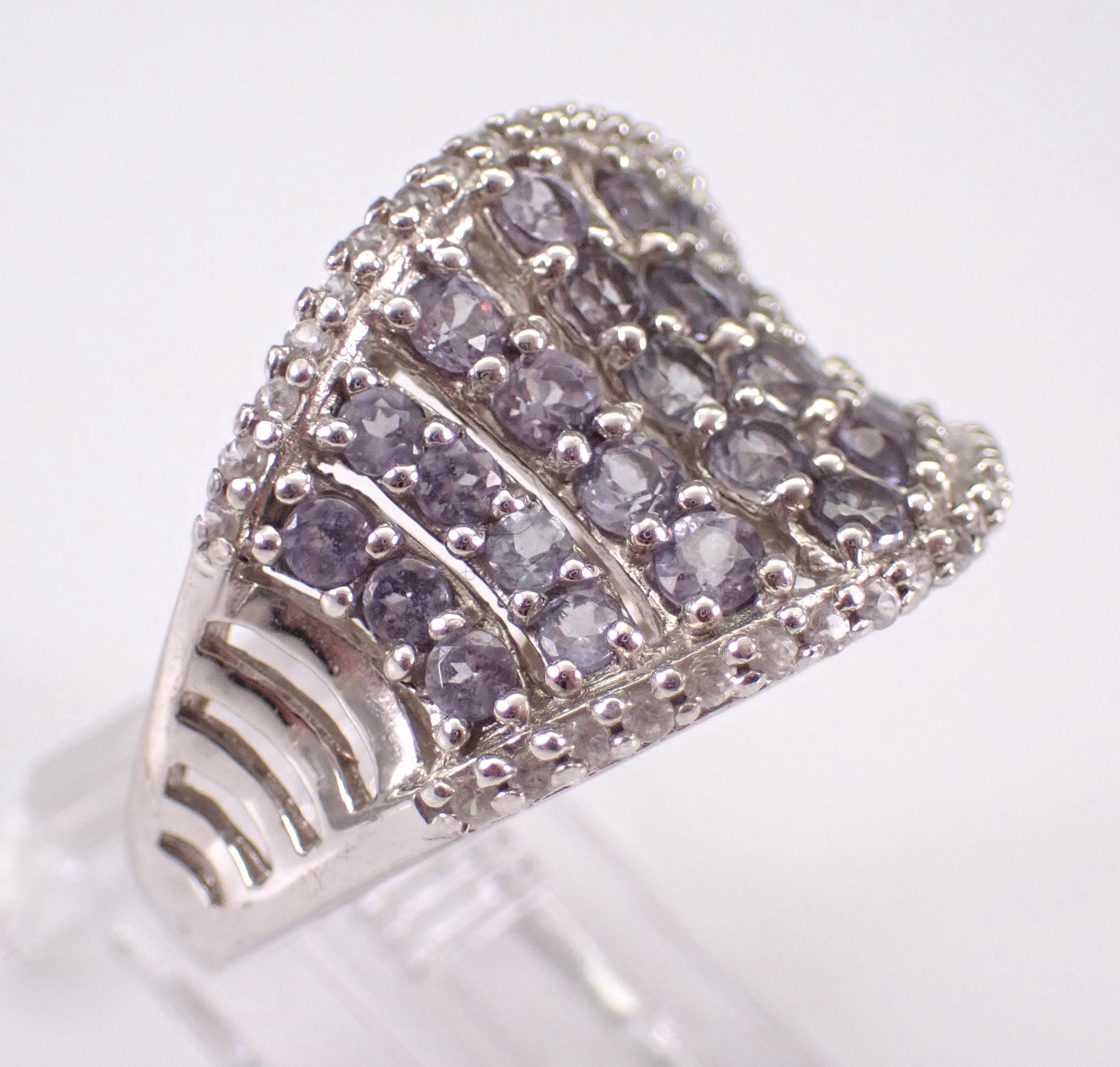 Vintage Sterling Silver White Sapphire and Blue Topaz Ring. This ring is set with thirty-four genuine Round White Sapphires and twenty-seven pale Blue Topaz. This ring weighs 5.1 grams and measures 15.5 mm along the finger. This ring is a finger size 7 and will be shipped promptly in a gift pouch.