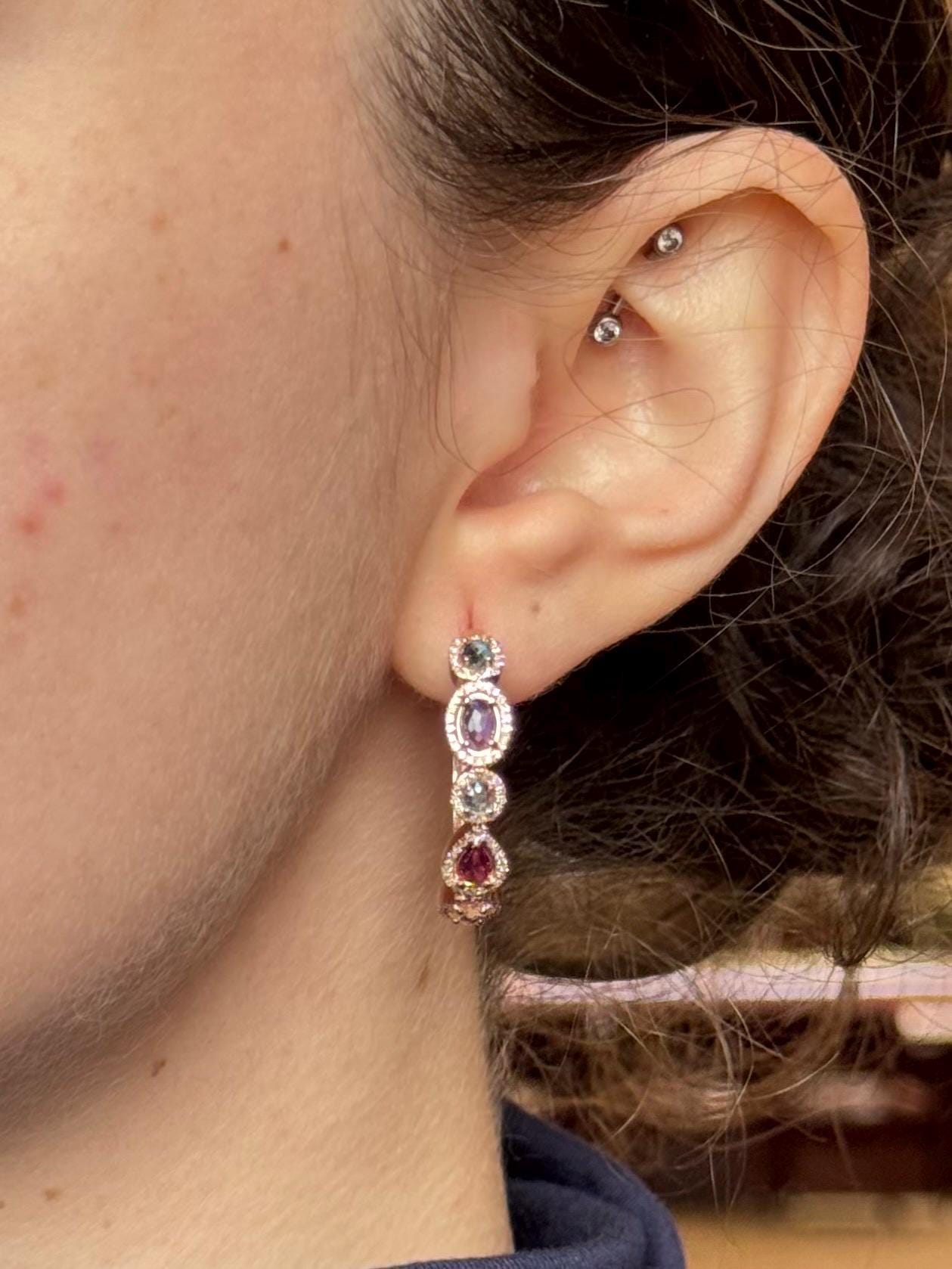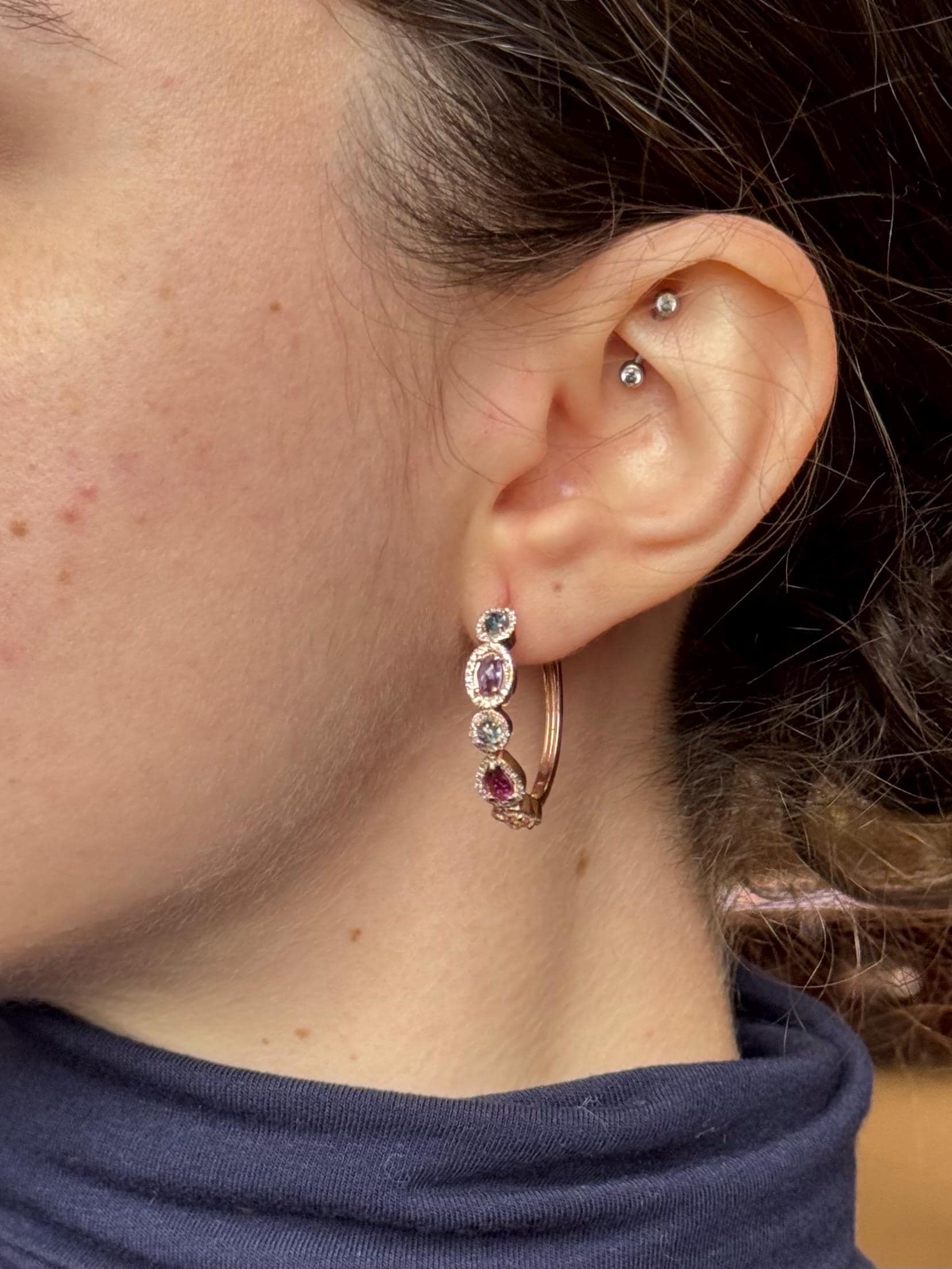 Rose Gold Diamond and Multi Color Gemstone Hoop Earrings. These earrings are set with one hundred (100) genuine Round Brilliant Diamonds and five genuine gemstones in EACH earring. The Gemstones in these earrings include Blue Topaz, Amethyst, Pink Tourmaline and Morganite amount to a total weight of 2 carats. The diamonds in these earrings are H color, SI/I clarity and weigh a total of 1/2 carats. These earrings are 10K Rose Gold and weigh a total of 8.2 grams. These earrings are for pierced ears and measure 28 mm in length. These earrings will be accompanied by an appraisal written by a GIA Certified Diamond Grader with the retail replacement value of $2,985.00. I will ship these earrings promptly in a gift box.