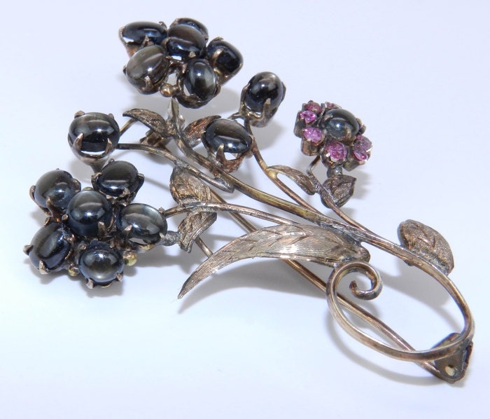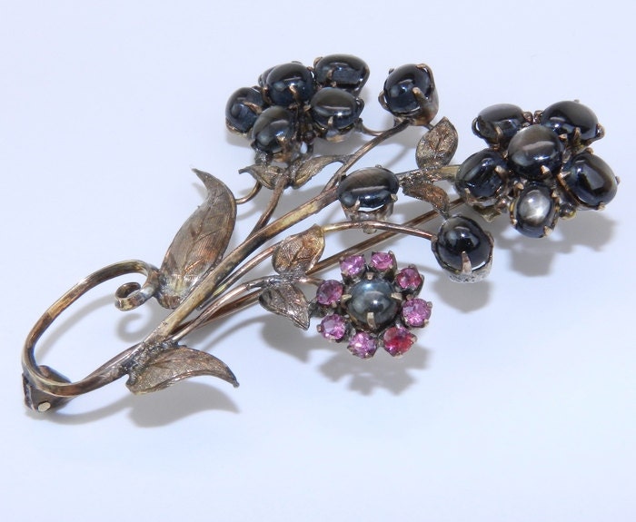 Victorian Edwardian Antique 14K Gold Ruby and Black Star Sapphire Brooch Pin. This pin has a unique design and is all HAND MADE. There are sixteen genuine Black Star Sapphires set in this piece. There are also eight genuine Round Rubies set in the shape of a flower in this pin. This brooch is made of 14KT Yellow Gold, weighs 7.8 grams and measures 52 X 37 mm. This style Pin is very rare and dates back to Circa 1890's. This brooch will also be accompanied by an appraisal with the replacement value of $1,679.00. I will ship this pin promptly in a beautiful gift box.