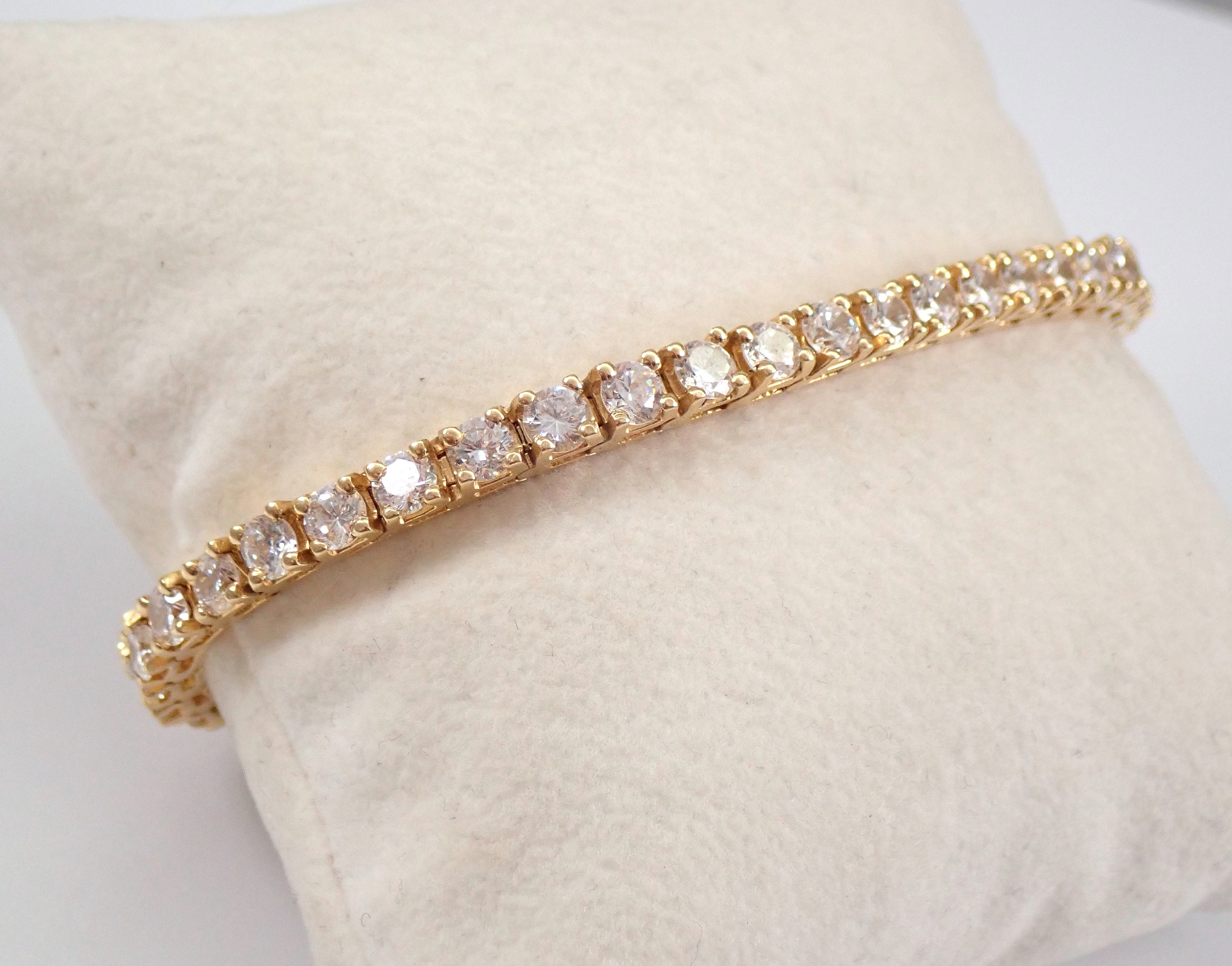 14K Yellow Gold Cubic Zirconia Tennis Bracelet. This bracelet is set with forty-four Round CZ's. These Cubic Zirconia are a brilliant colorless color, measure 3.6 mm in diameter each and the bracelet has the appearance of 9-10ct Tennis Bracelet. The bracelet is solid 14K Yellow Gold, weighs 15.4 grams and measures 7" in length. I will ship this bracelet promptly in a gift box.