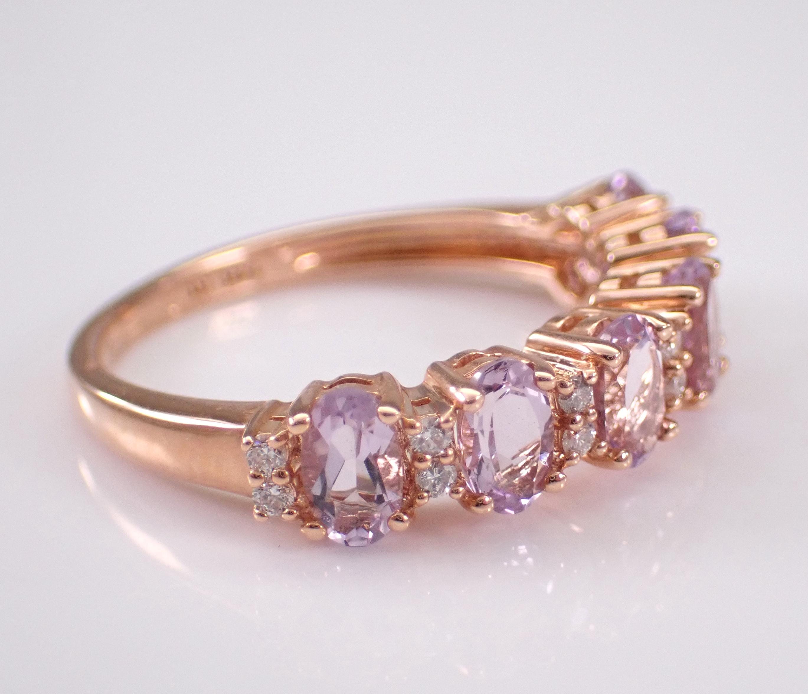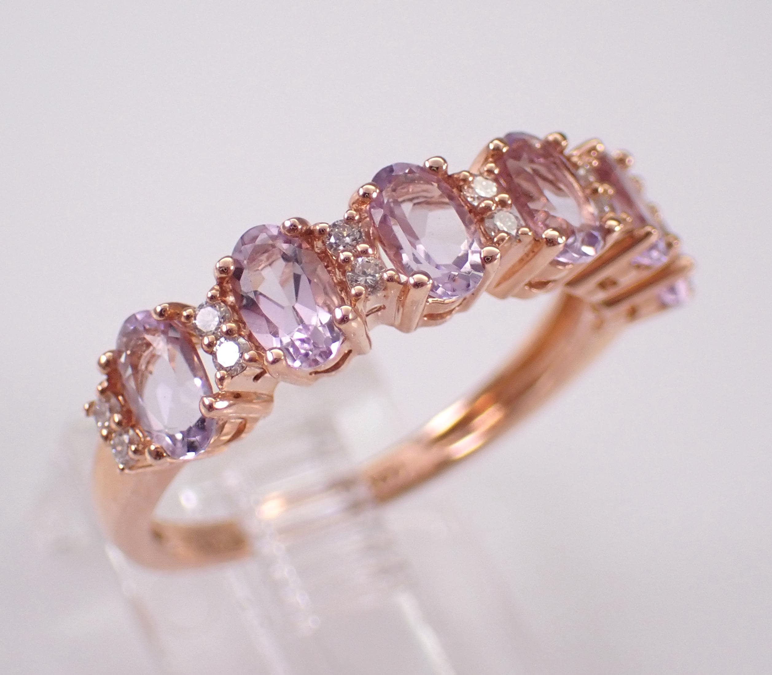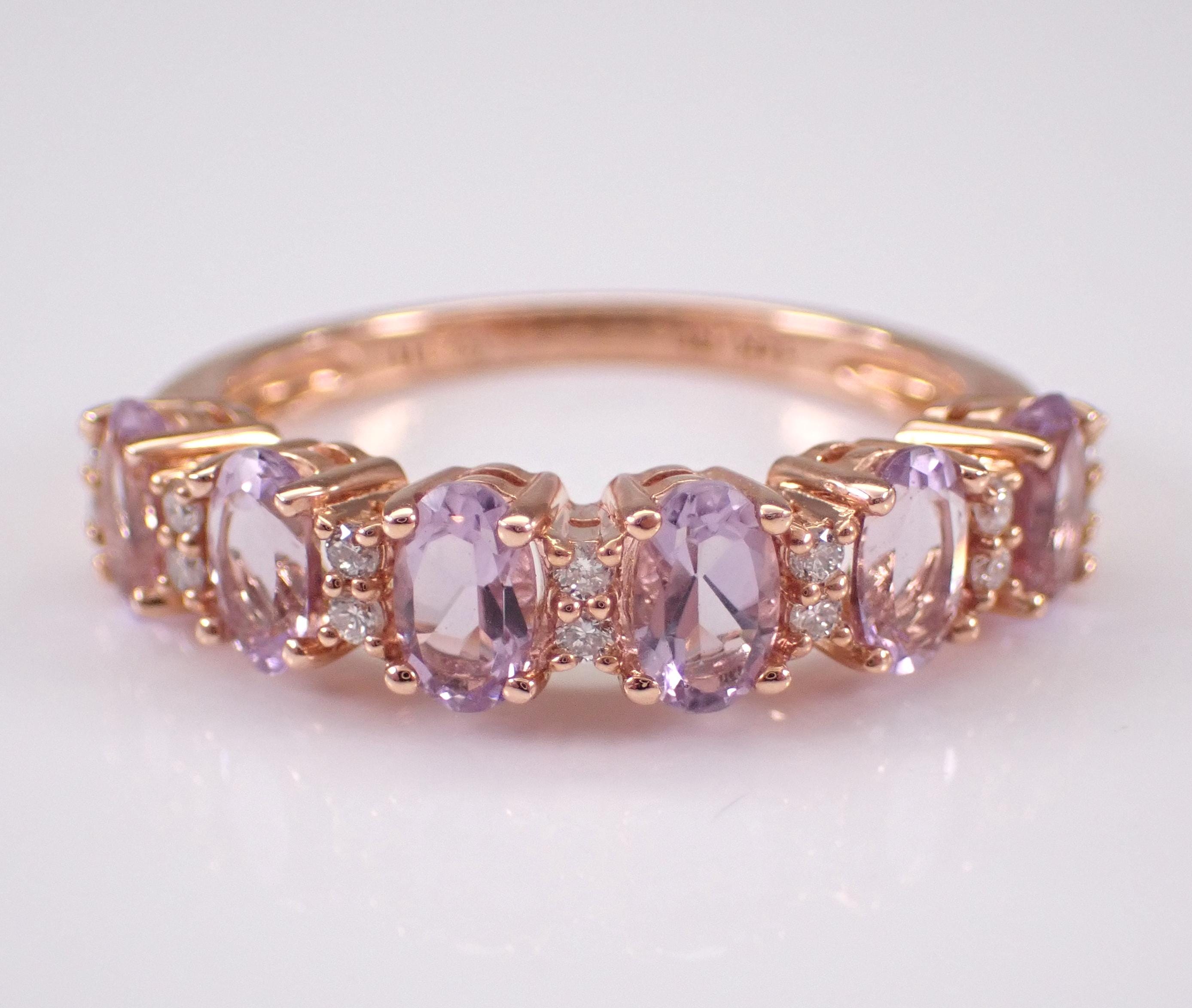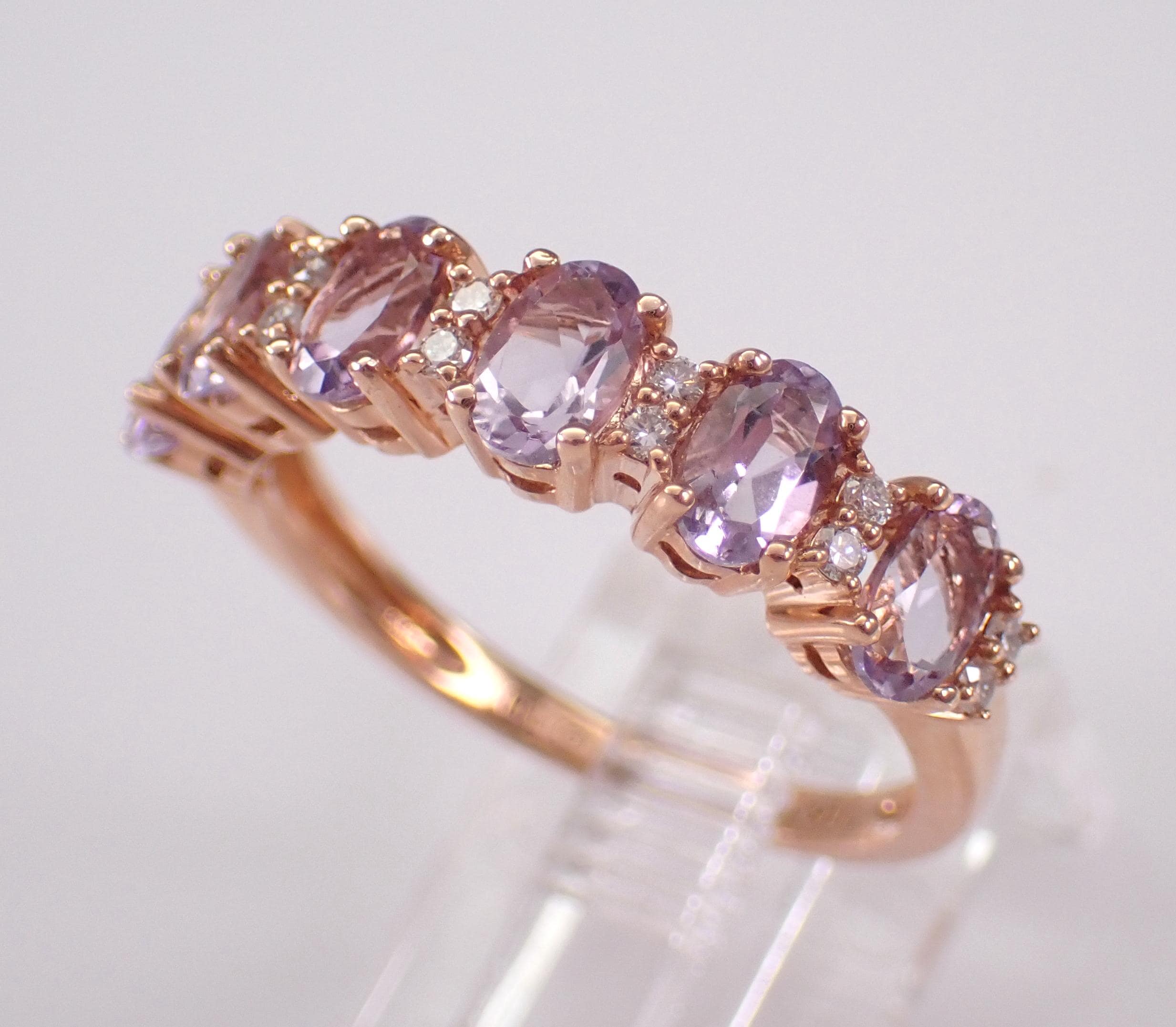 Rose Gold Diamond and Amethyst Wedding Ring Anniversary Band. This ring is set six Oval Amethysts and fourteen Round Brilliant Diamonds. The Amethysts in this ring measure 5 X 3 mm each and amount to a total weight of 1 1/4 carat. The diamonds in this ring are H color, SI clarity and weigh a total of .15 carat. This ring is 10KT Rose Gold, weighs 3.0 grams, measures 5 mm in width and is a finger size 7, which can be resized (please inquire about sizing with the finger size you need). This ring will be accompanied by an appraisal by a GIA Certified Diamond Grader with the retail replacement value of $1,589.00. I will ship this ring promptly in a gift box.
