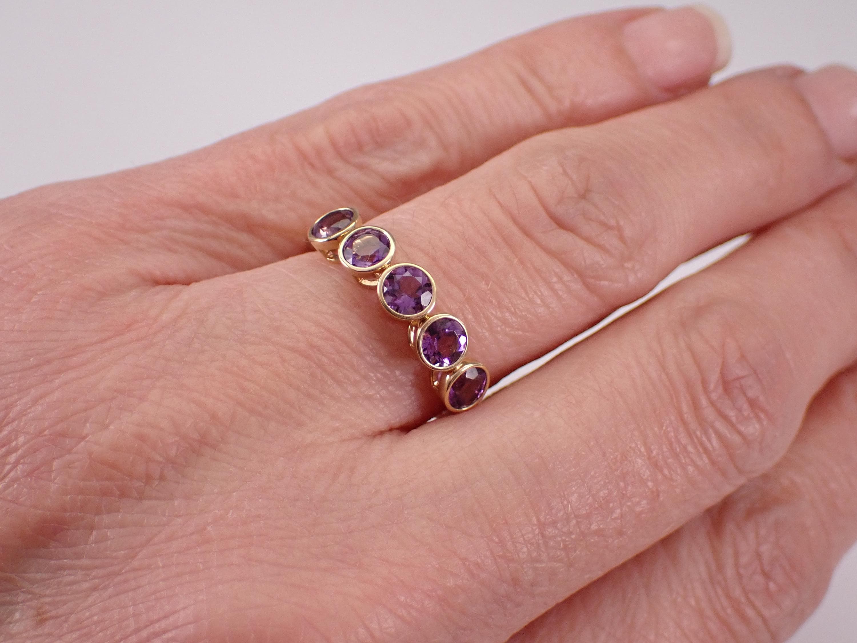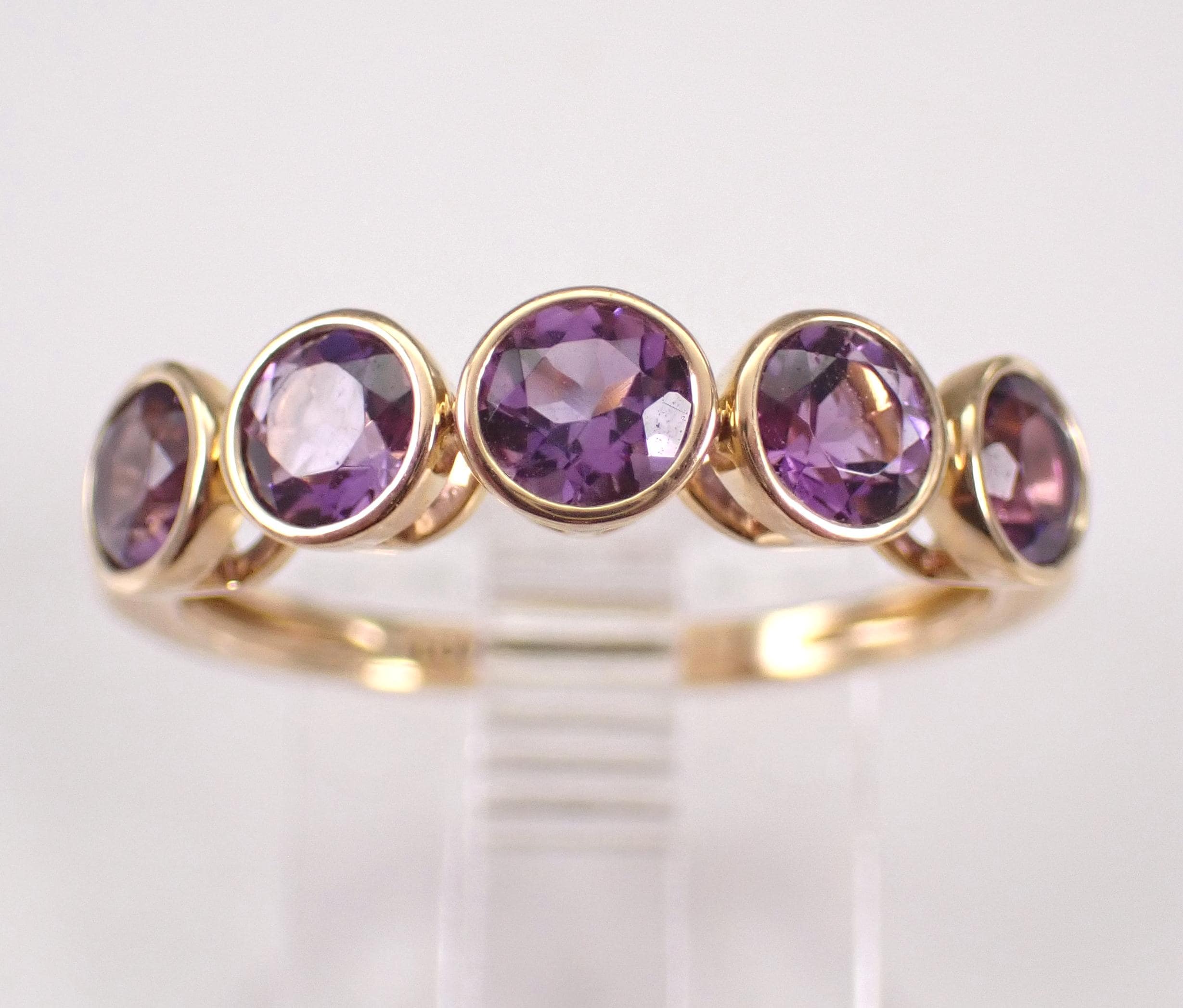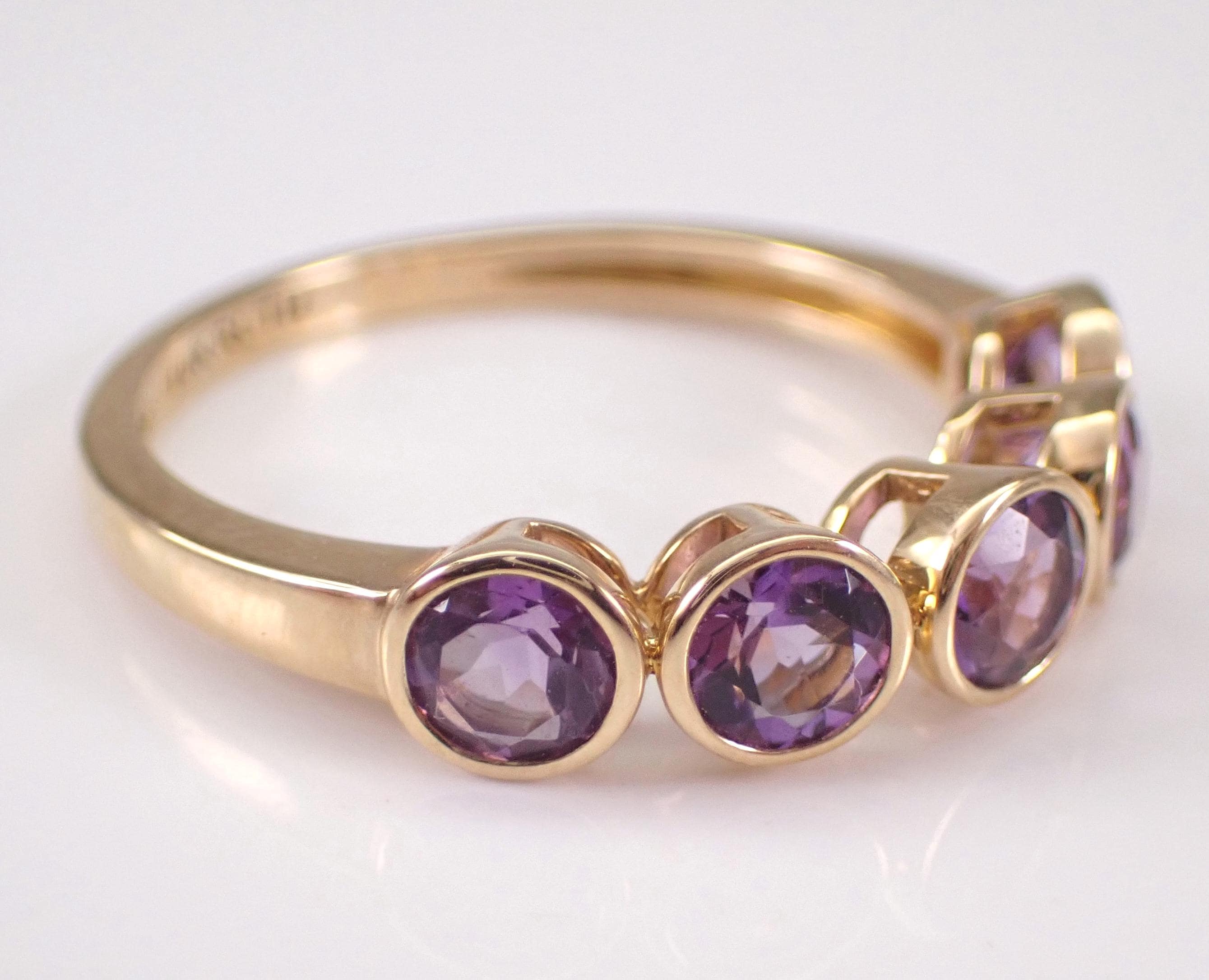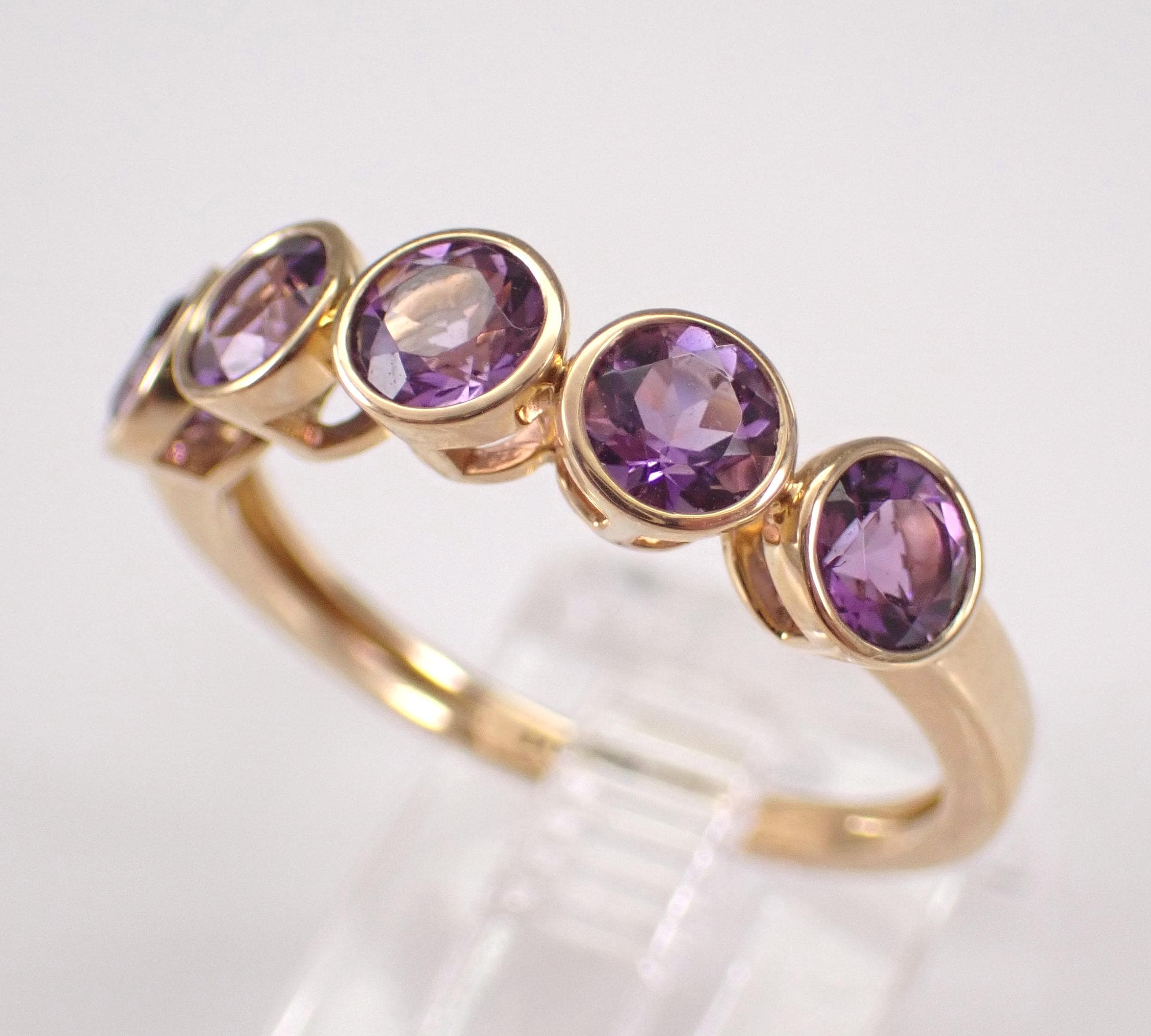Yellow Gold Amethyst Wedding Ring Anniversary Band. This ring is set five Round Amethysts in individual bezels. These Amethysts amount to a total weight of 1 carat. This ring is 10KT Yellow Gold, weighs 2.1 grams, measures 4.5 mm in width and is a finger size 7, which can be resized (please inquire about sizing with the finger size you need). This ring will be accompanied by an appraisal by a GIA Certified Diamond Grader with the retail replacement value of $1,089.00. I will ship this ring promptly in a gift box.
