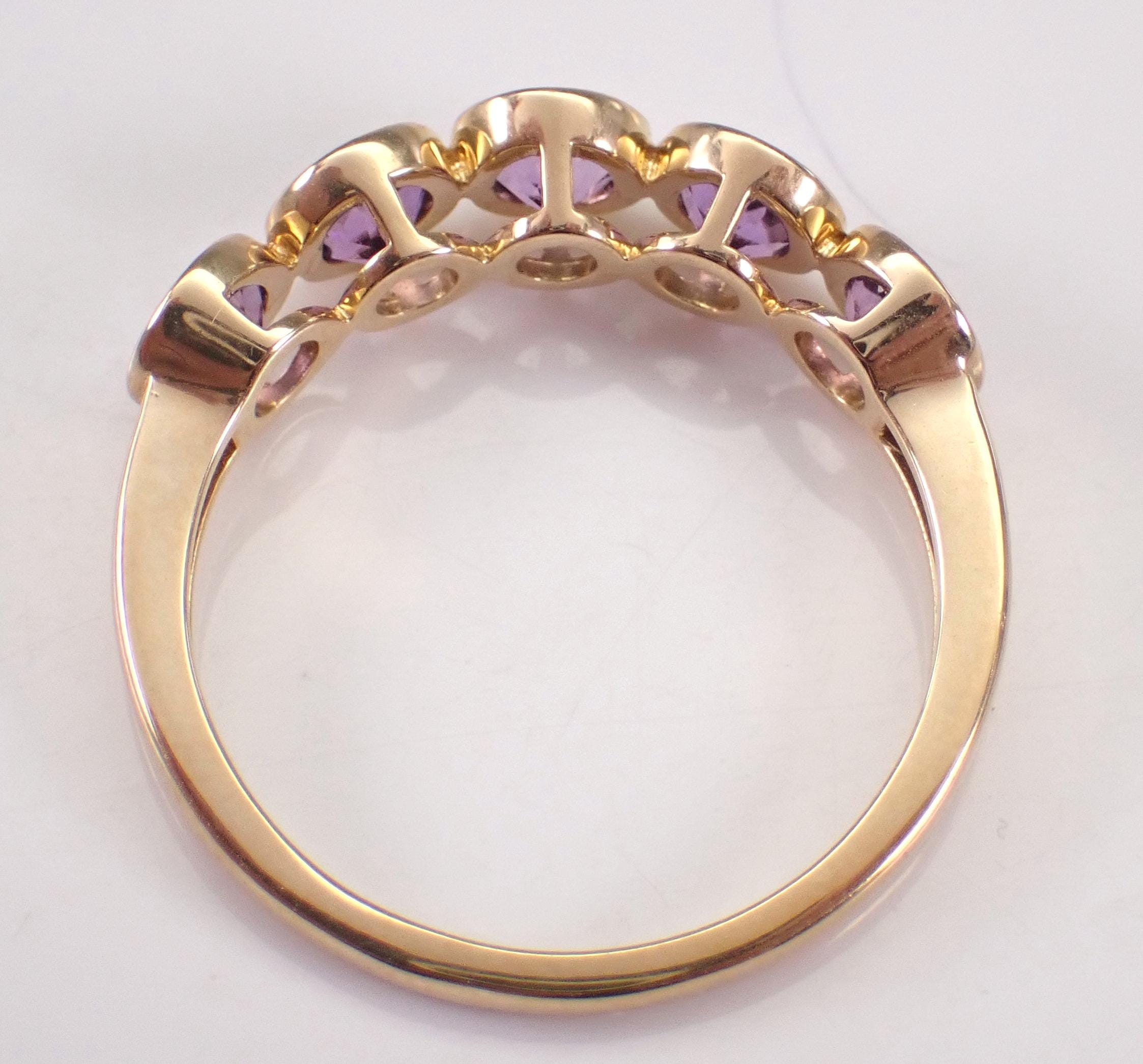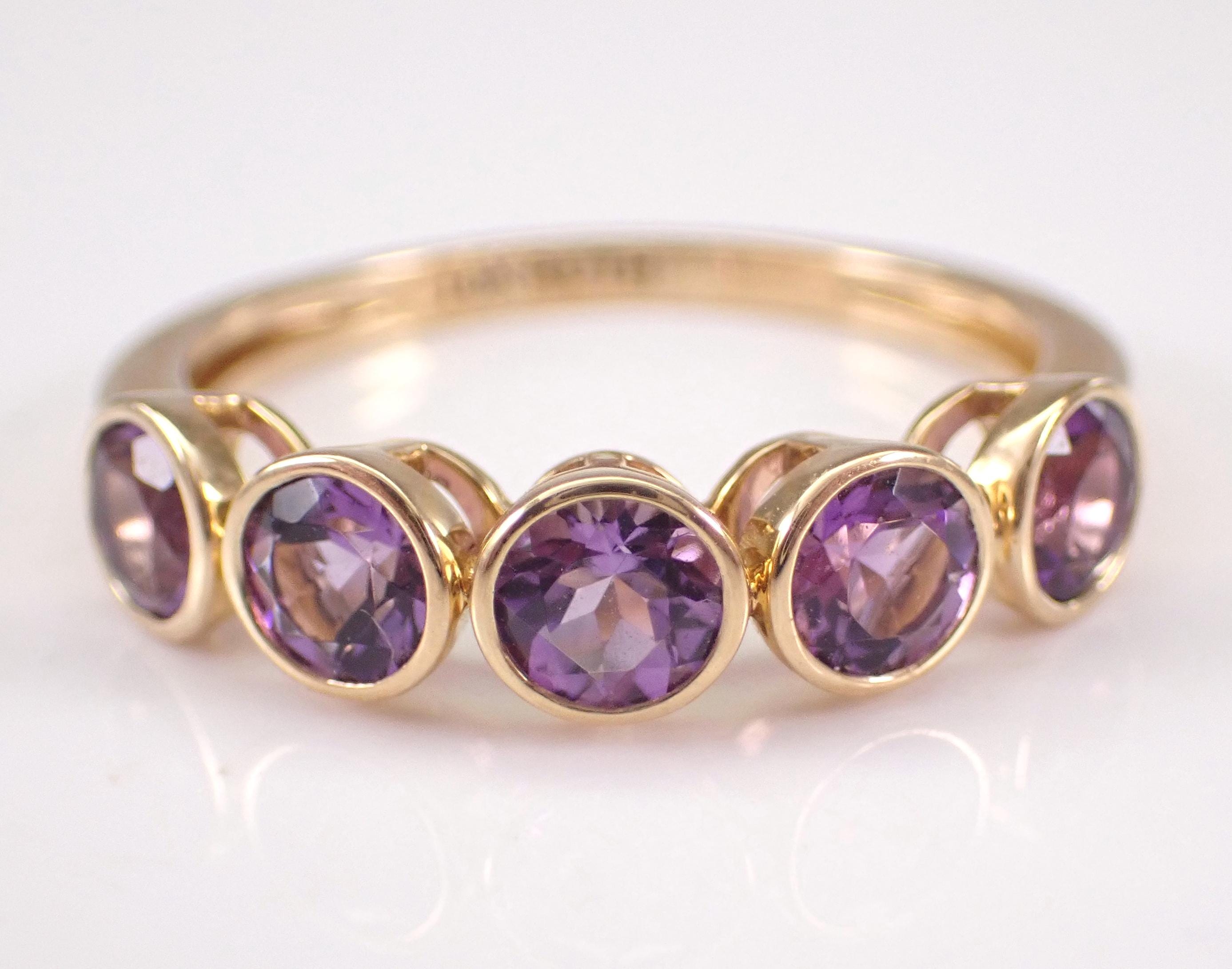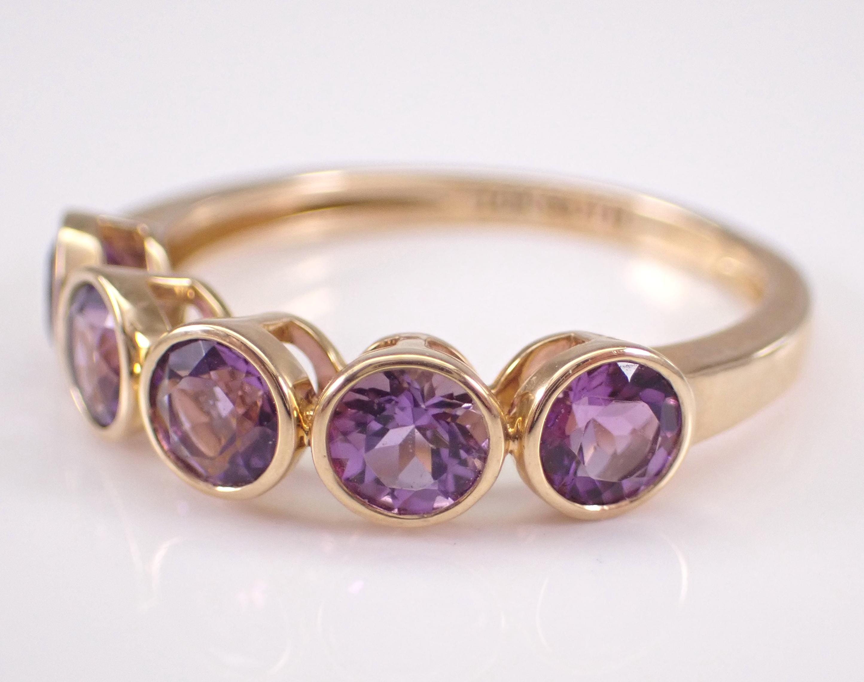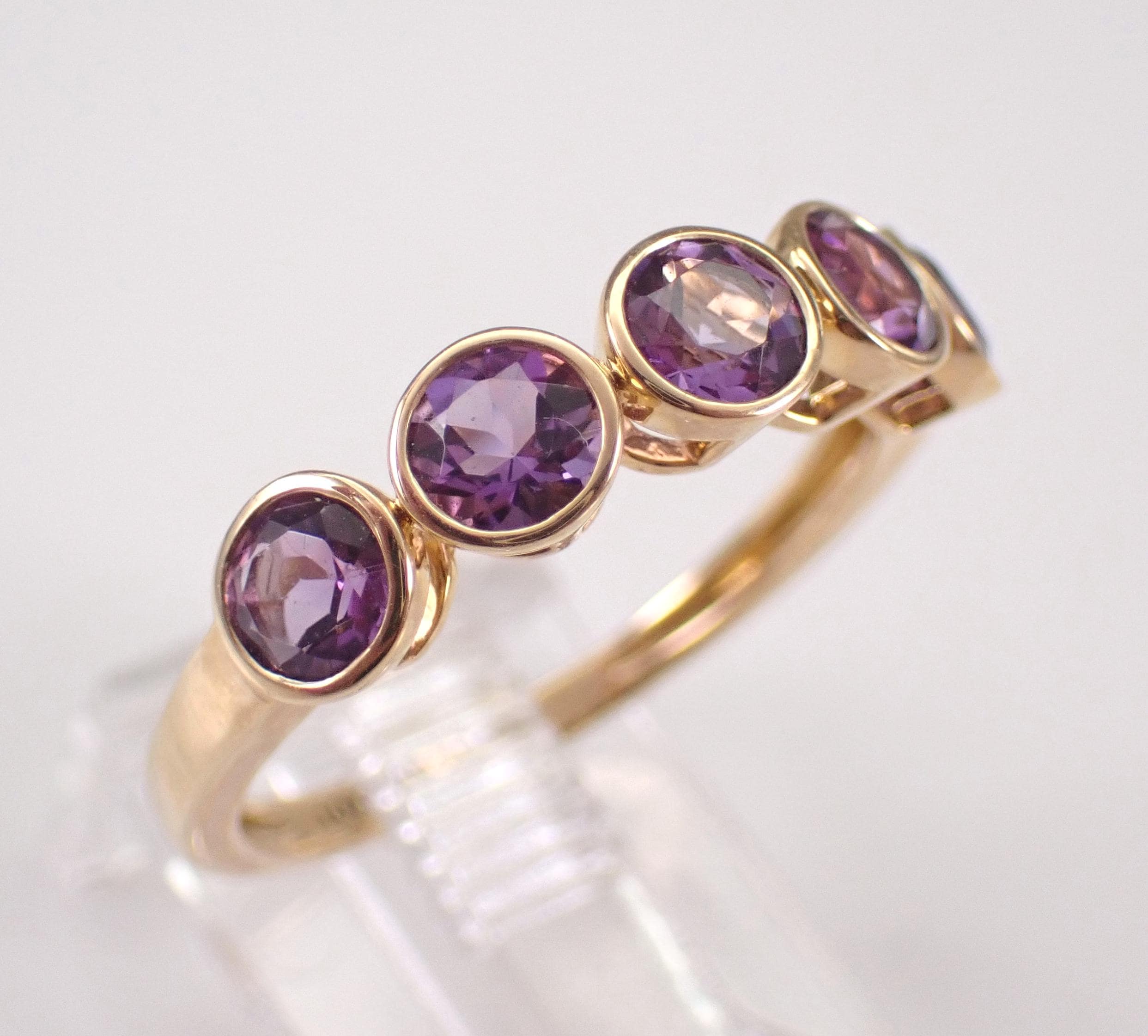 Yellow Gold Amethyst Wedding Ring Anniversary Band. This ring is set five Round Amethysts in individual bezels. These Amethysts amount to a total weight of 1 carat. This ring is 10KT Yellow Gold, weighs 2.1 grams, measures 4.5 mm in width and is a finger size 7, which can be resized (please inquire about sizing with the finger size you need). This ring will be accompanied by an appraisal by a GIA Certified Diamond Grader with the retail replacement value of $1,089.00. I will ship this ring promptly in a gift box.