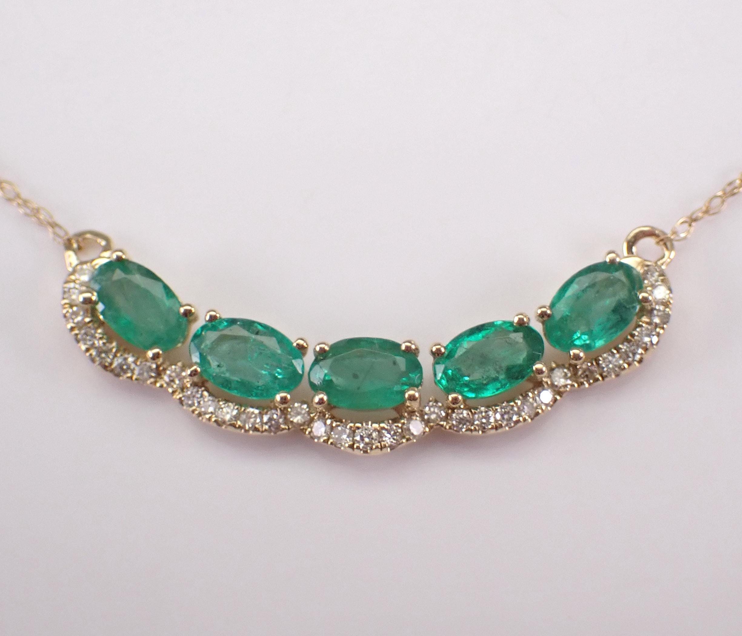 14K Yellow Gold Emerald and Diamond Bar Necklace. This necklace is set with five genuine Oval Emeralds and thirty-two natural Round Brilliant Diamonds. These Emeralds measure 5 X 3 mm each and amount to a total weight of 1 1/4 carat. The diamonds are H color, I1 clarity and weigh a total of 1/4 carat. This pendant is 14K Yellow Gold and comes attached to a 14K Yellow Gold chain that measures 18.5" in overall length. This necklace weighs 1.7 grams and the centerpiece measures 25 mm across. This necklace will be accompanied by an appraisal written by a GIA Certified Diamond Grader with the retail replacement value of $1,679.00. I will ship this necklace promptly in a beautiful gift box.
