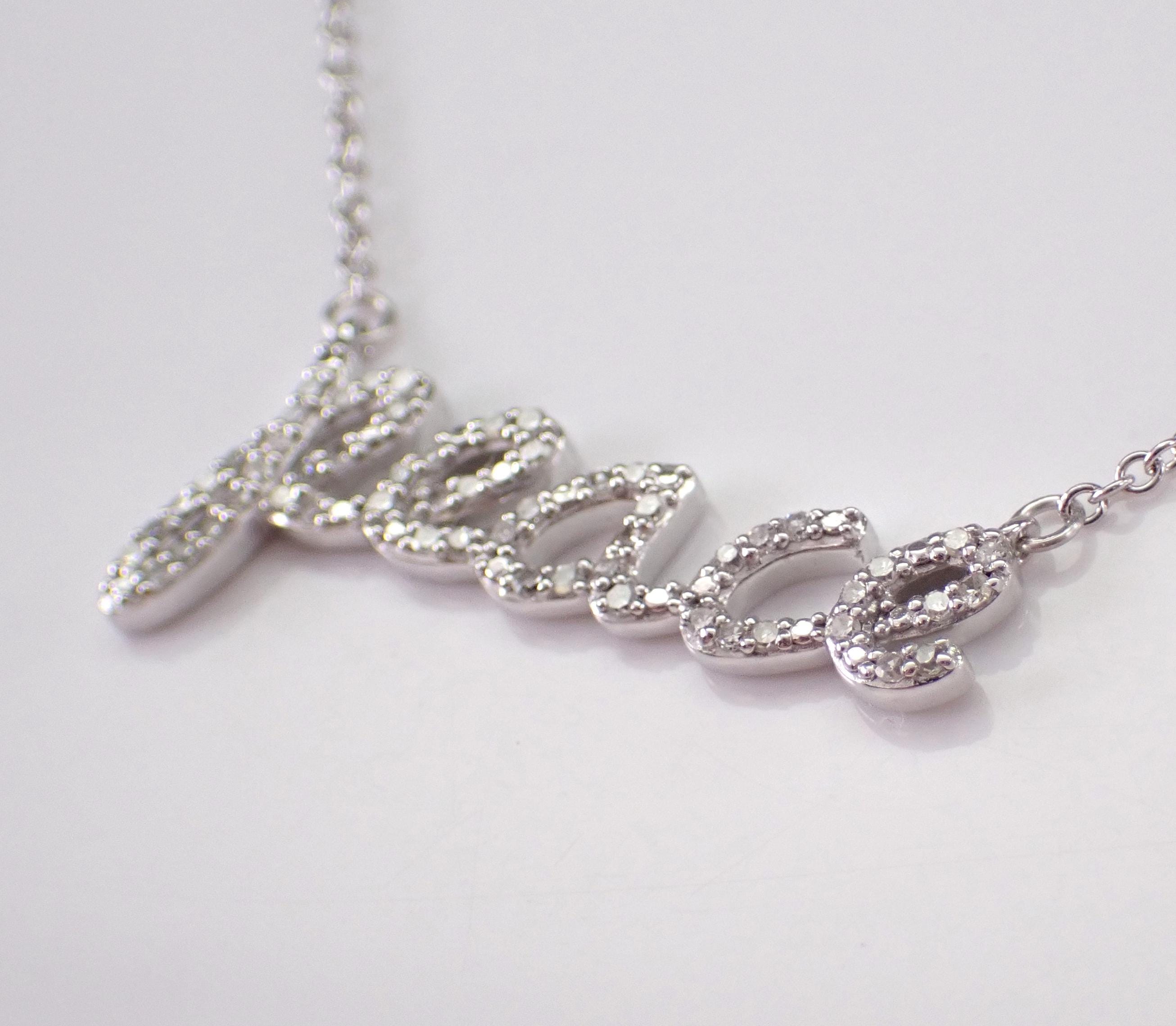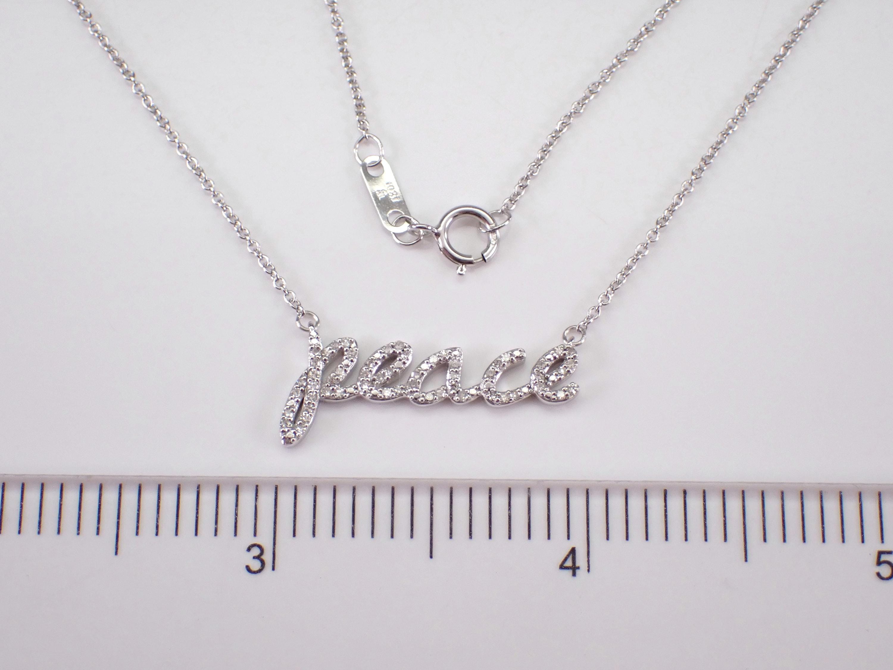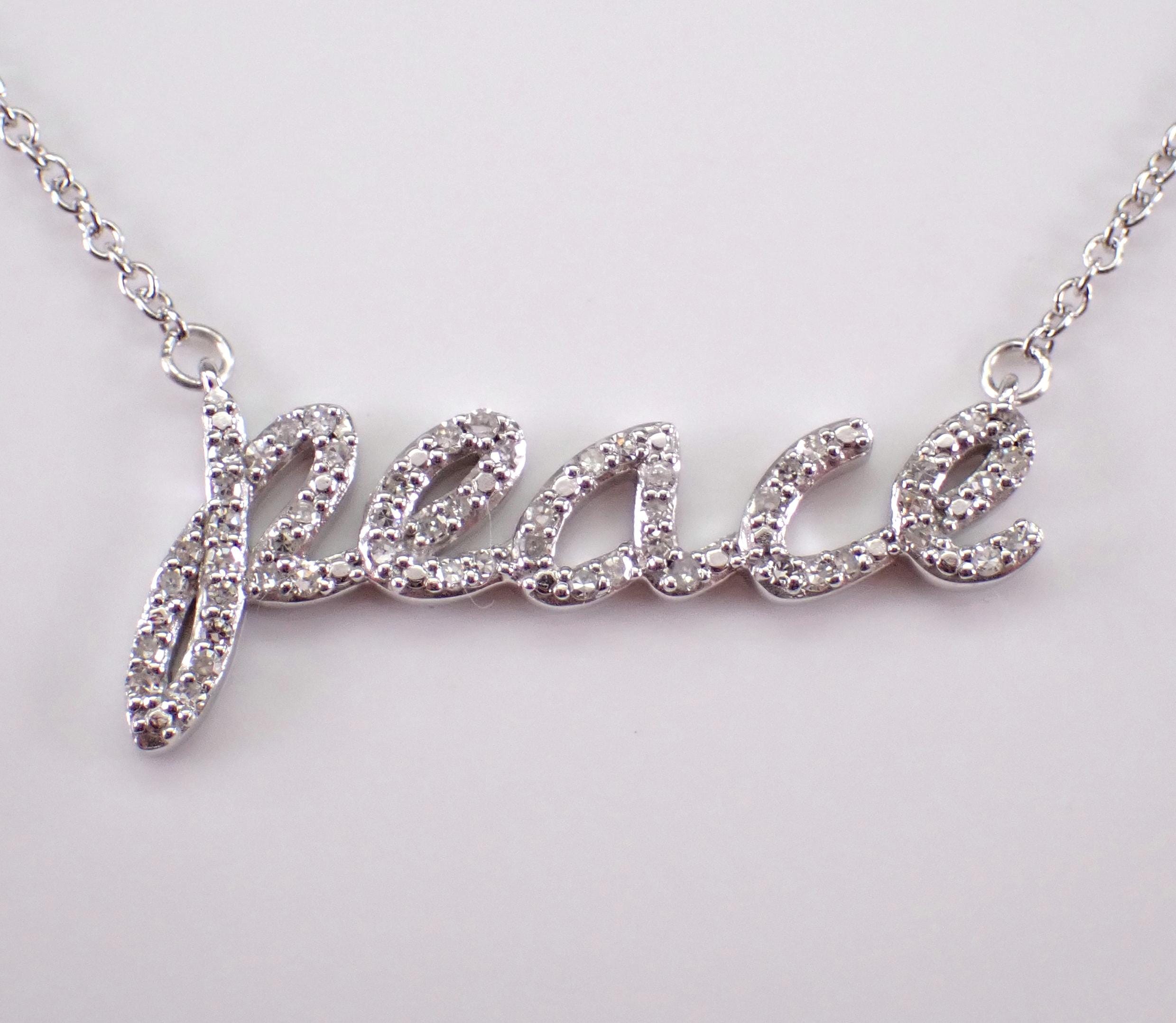 White Gold Diamond PEACE Necklace with Chain. This necklace is set with fifty-five genuine Round Brilliant Diamonds. These diamonds are H color, I1 clarity and combine to a total weight of .20 carat. The centerpiece measures 1" mm across. This necklace and chain are 10K White Gold, weighs 2.3 grams and the overall length of the chain is 17". The pendant and the chain are both solid 10K White Gold and accompanied by an appraisal, valued at $1,475.00. The necklace will be shipped promptly in a gift box.