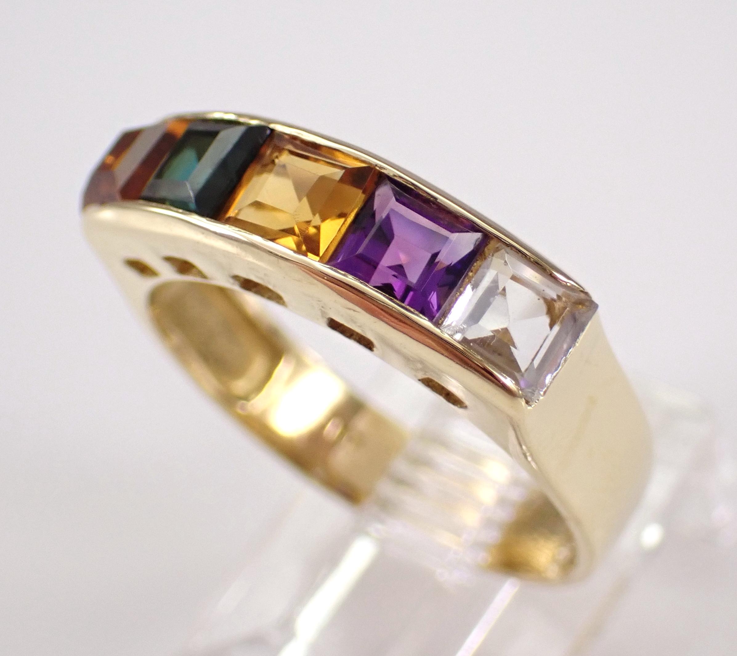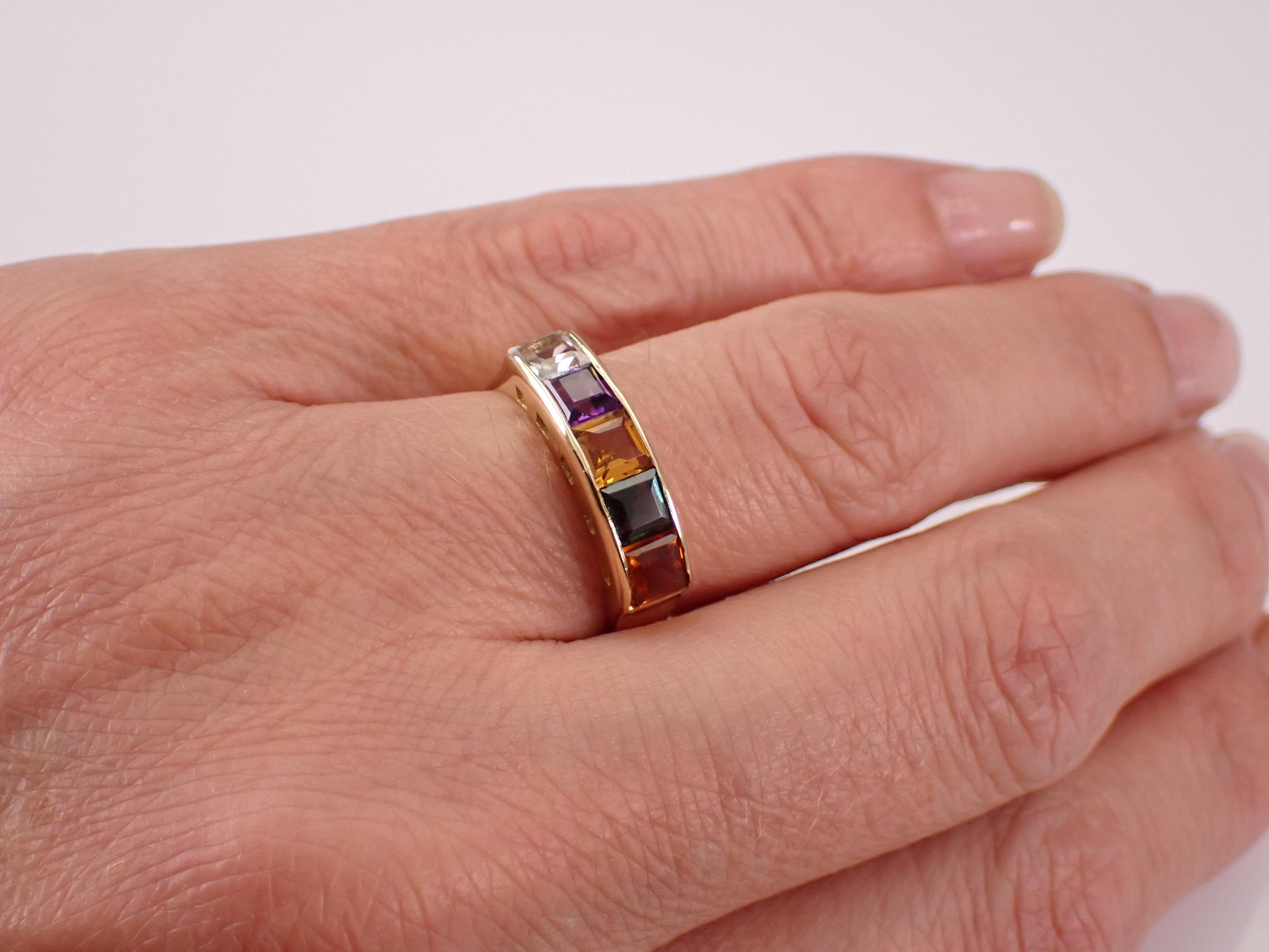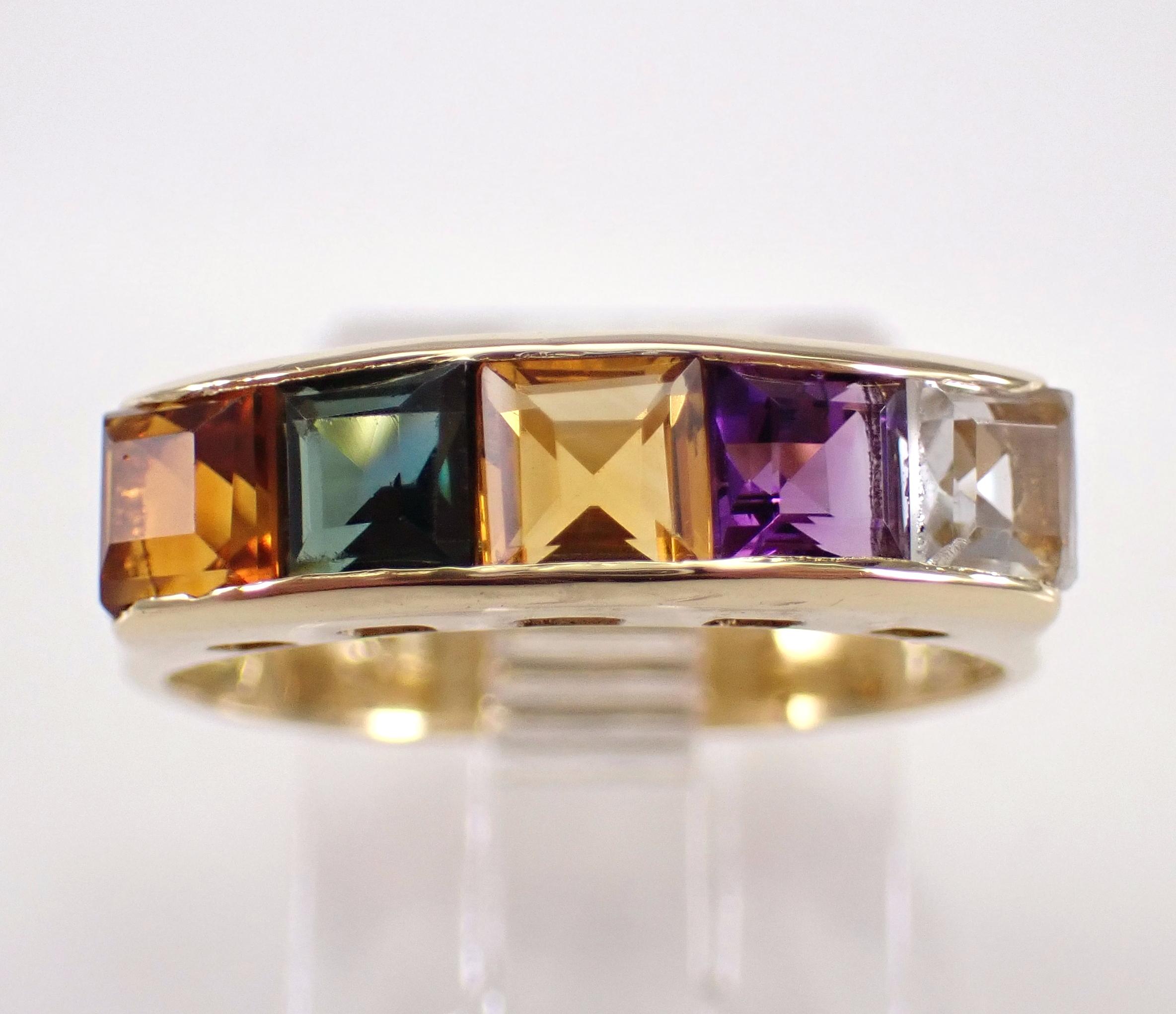 18K Yellow Gold Multi Color Gemstone Wedding Ring Anniversary Band. This ring is set with genuine Princess Cut Gemstones. These Gemstones include Aquamarine, Amethyst, Citrine, Madeira Citrine and Green Tourmaline. These gems measure 3.5 X 3.5 mm each and weigh a total of approximately 1 carat. This ring is 18KT Yellow Gold, weighs 3.7 grams, measures 5 mm in width and is a finger size 7, which can be resized (please inquire about sizing with the finger size you need). The ring will be accompanied by an appraisal by a GIA Certified Diamond Grader with the retail replacement value of $1,675.00. I will ship this ring promptly in a gift box.