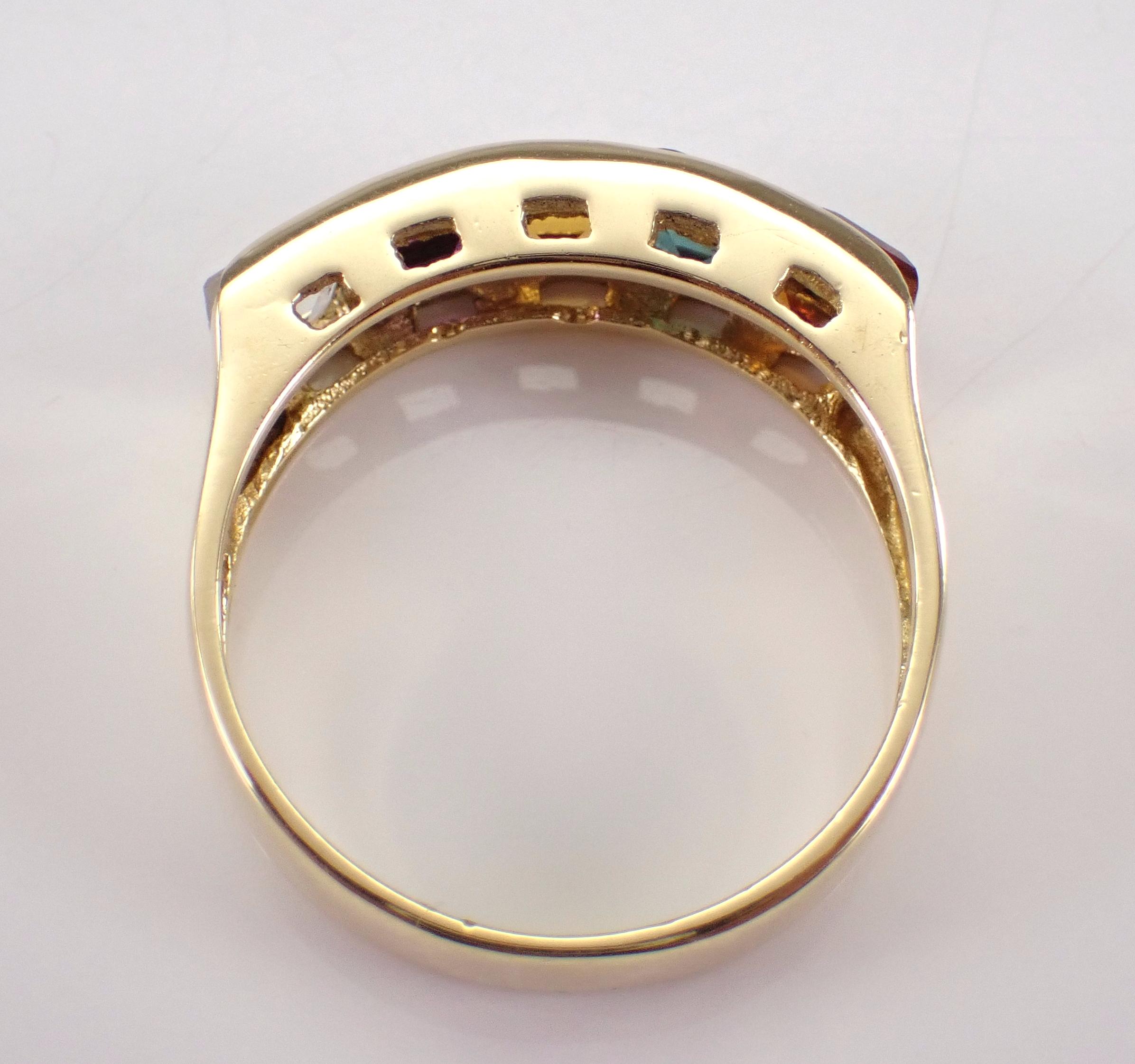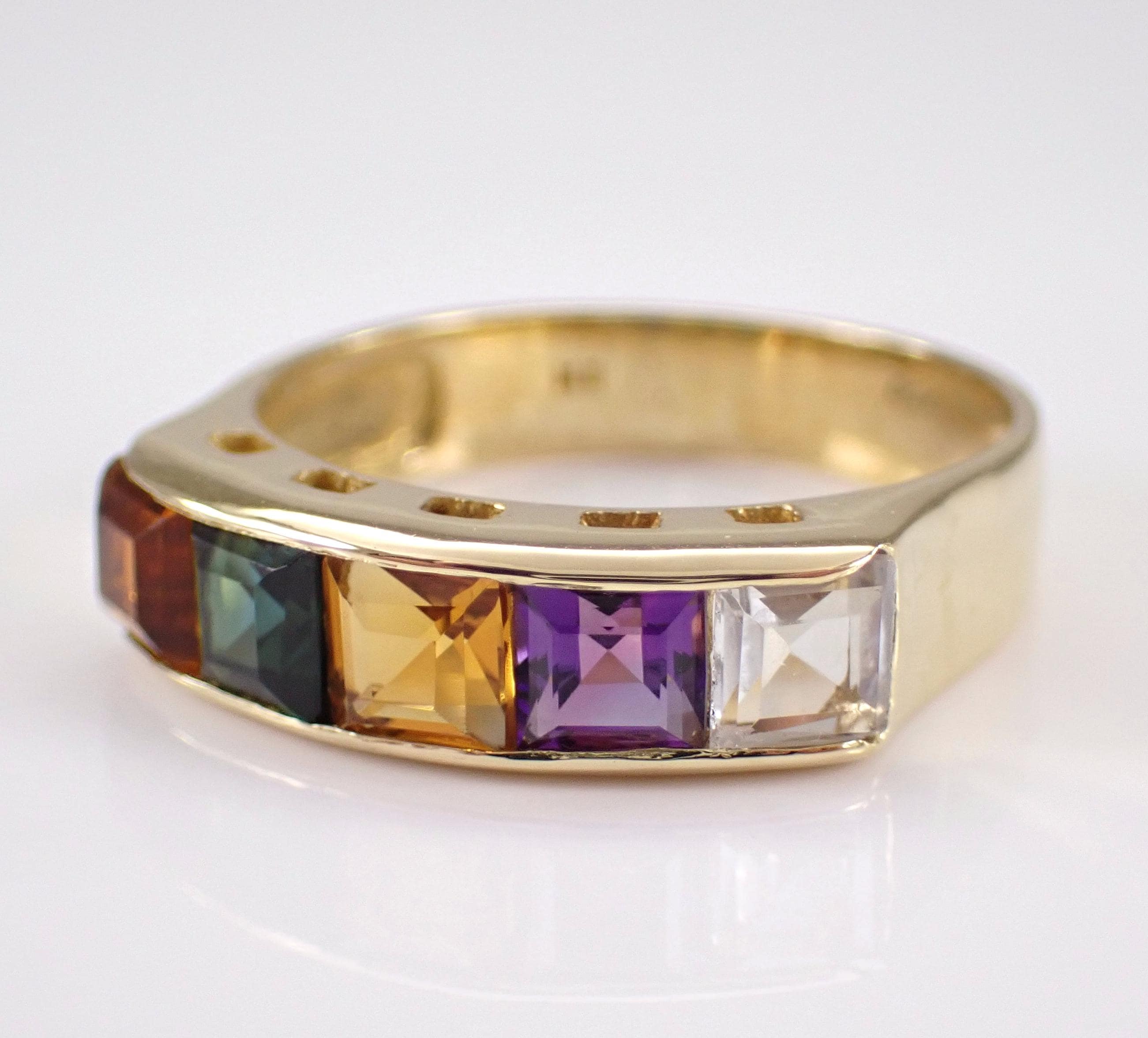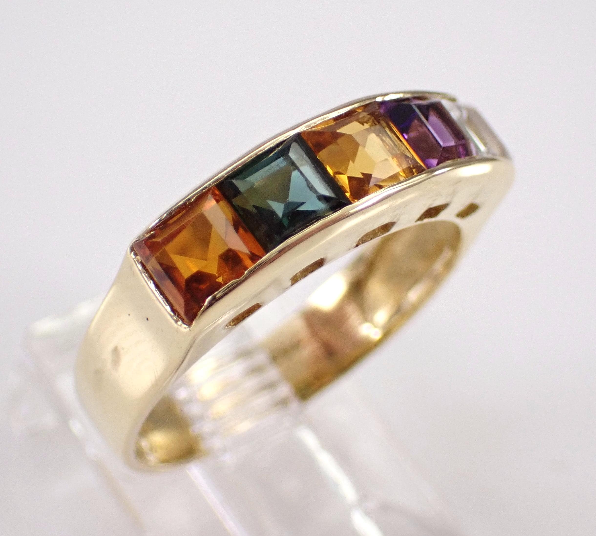 18K Yellow Gold Multi Color Gemstone Wedding Ring Anniversary Band. This ring is set with genuine Princess Cut Gemstones. These Gemstones include Aquamarine, Amethyst, Citrine, Madeira Citrine and Green Tourmaline. These gems measure 3.5 X 3.5 mm each and weigh a total of approximately 1 carat. This ring is 18KT Yellow Gold, weighs 3.7 grams, measures 5 mm in width and is a finger size 7, which can be resized (please inquire about sizing with the finger size you need). The ring will be accompanied by an appraisal by a GIA Certified Diamond Grader with the retail replacement value of $1,675.00. I will ship this ring promptly in a gift box.