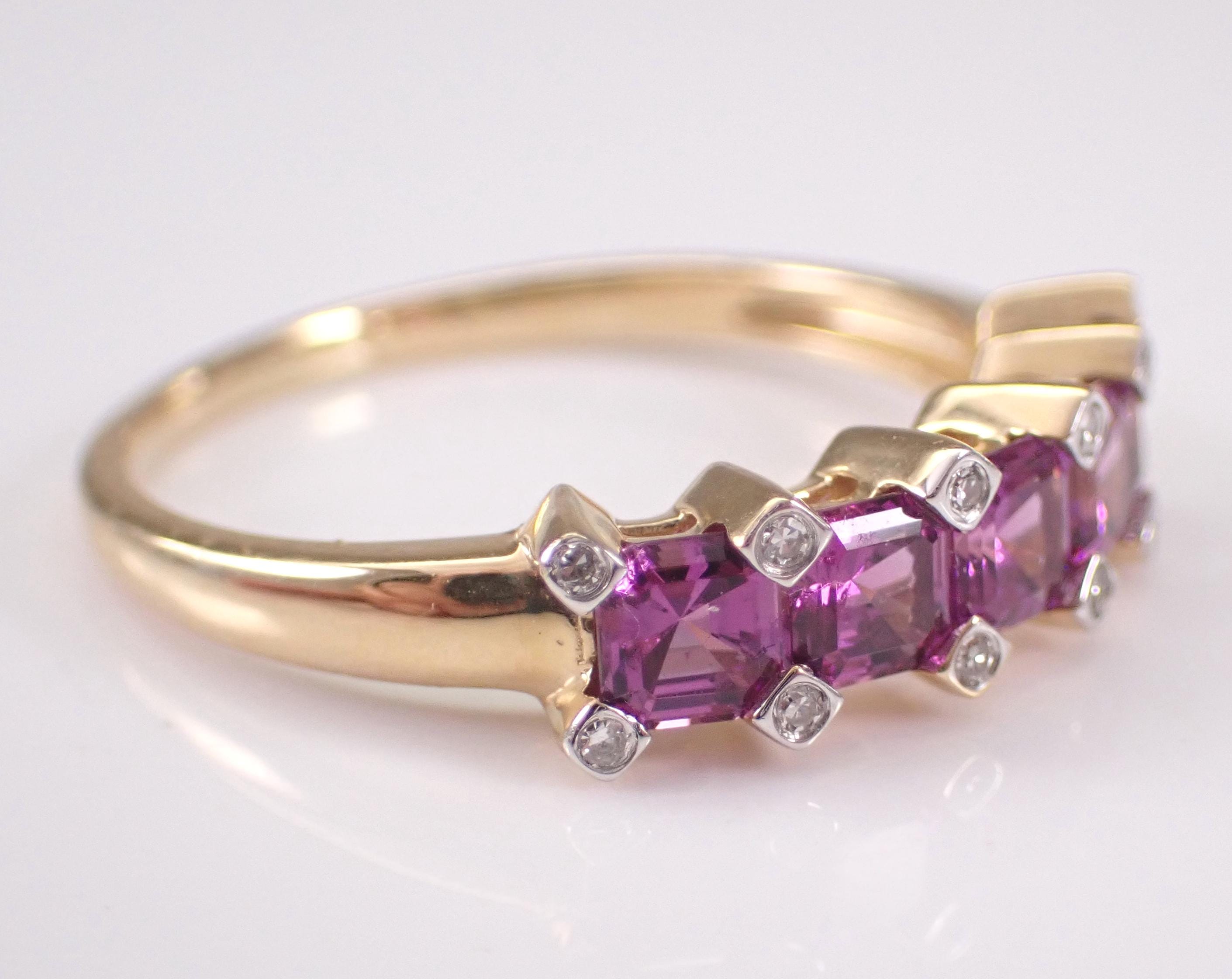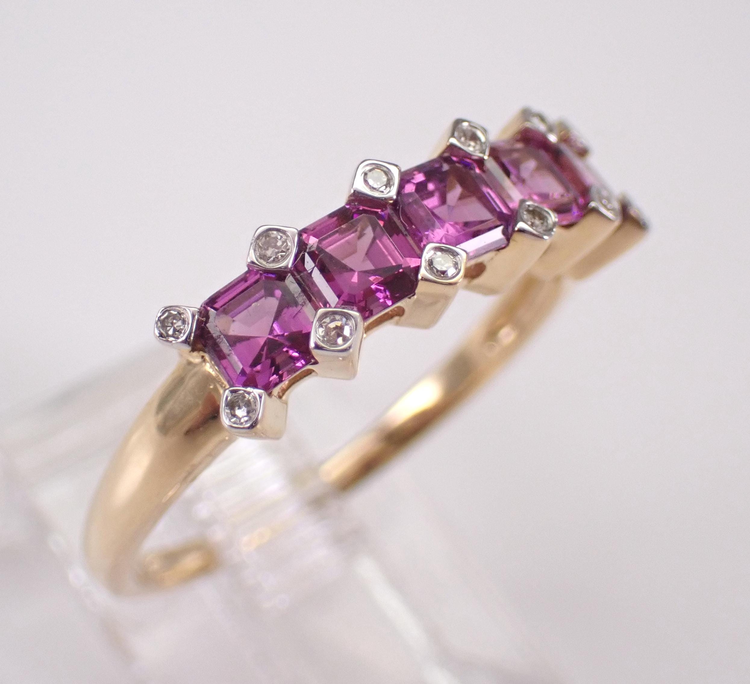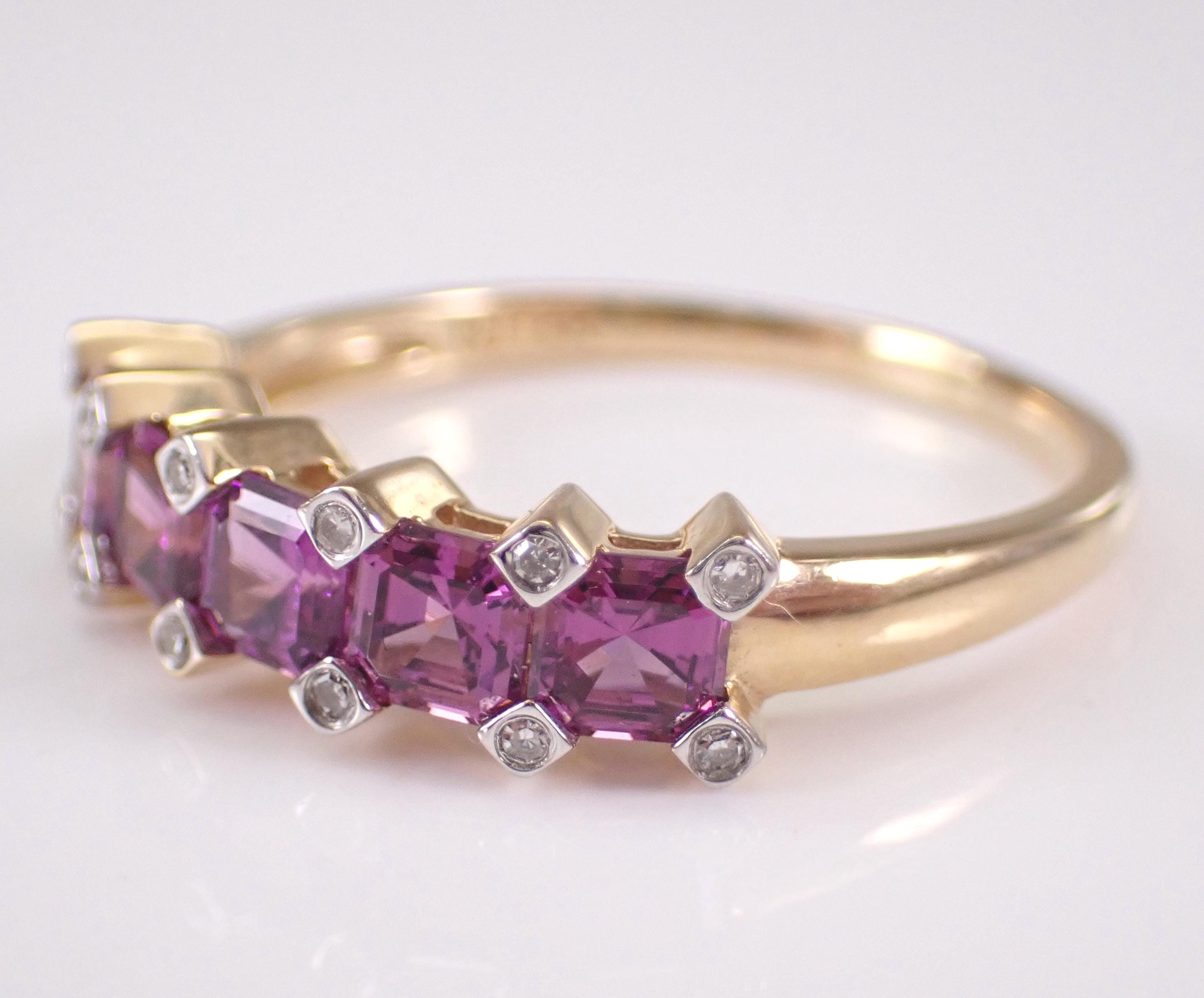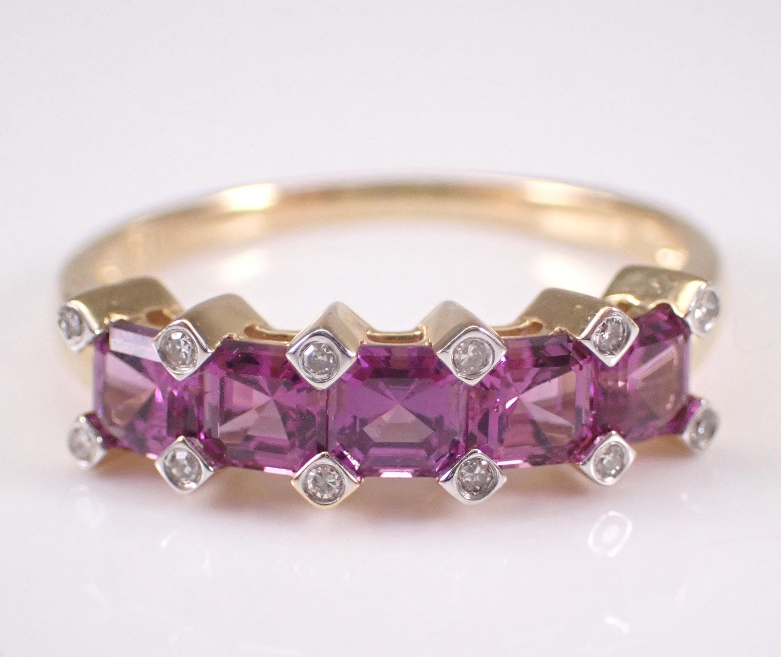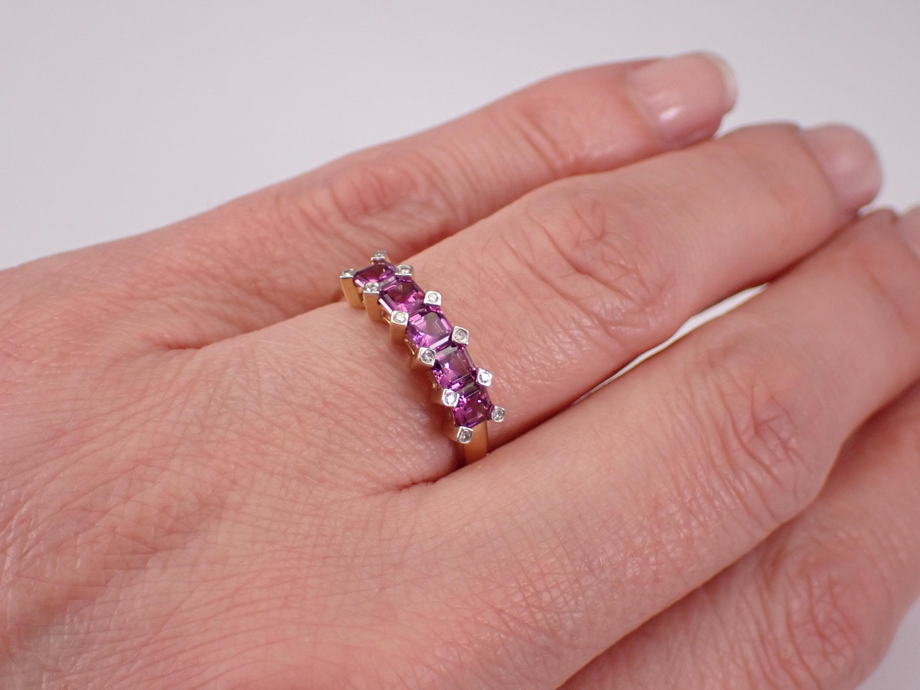 14K Yellow Gold Diamond and Amethyst Wedding Ring Anniversary Band. This ring is set five Asscher Cut Amethysts and twelve Round Brilliant Diamonds. The gemstones in this ring measure 3.5 X 3.5 mm each and amount to a total weight of 1 1/4 carat. The diamonds in this ring are H color, SI/I clarity and weigh a total of .10 carat. This ring is 14KT Yellow Gold, weighs 2.4 grams, measures 5 mm in width and is a finger size 7, which can be resized (please inquire about sizing with the finger size you need). This ring will be accompanied by an appraisal by a GIA Certified Diamond Grader with the retail replacement value of $1,489.00. I will ship this ring promptly in a gift box.