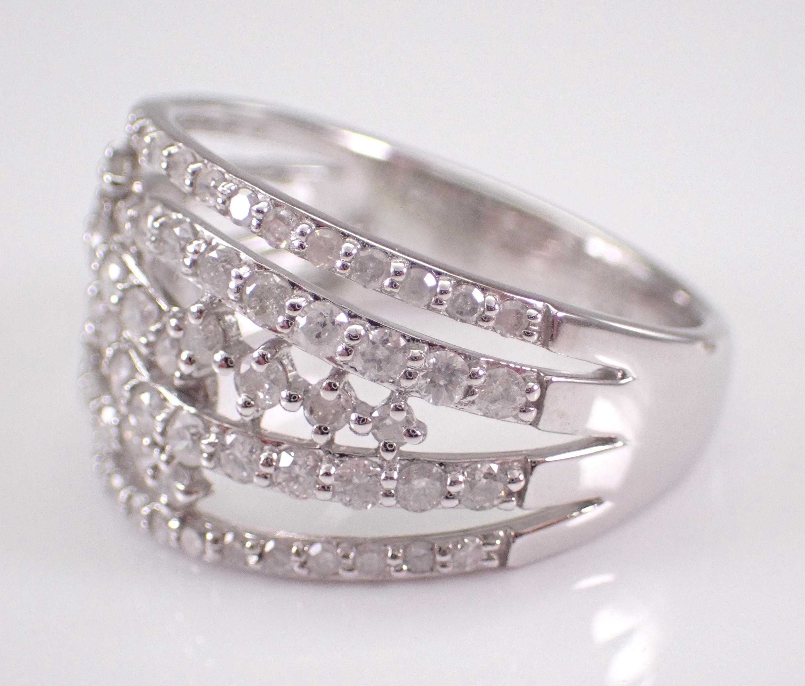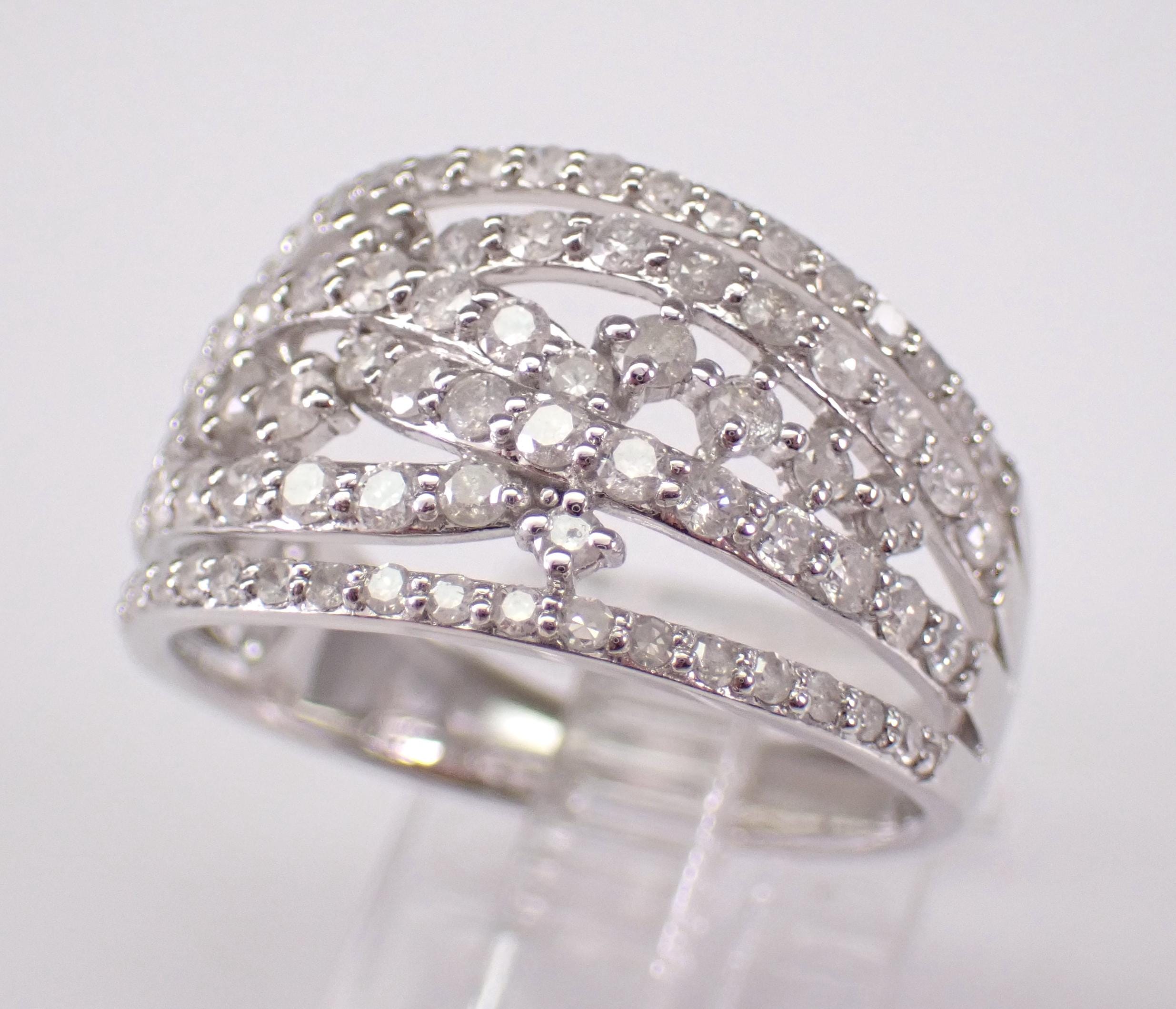 White diamond wedding band anniversary ring. This ring is set with eighty-four genuine, natural Round Brilliant diamonds. These diamonds are H color, I clarity and weigh a total of 1.00 carat. The ring is 10KT White Gold, weighs 4.2 grams, measures 12.5 mm in width and is a finger size 7, can be resized free of charge (please inquire about sizing with the finger size you need). This ring will be accompanied by an appraisal by a GIA Certified Diamond Grader with the retail replacement value of $1,785.00. I will ship this ring promptly in a gift box.