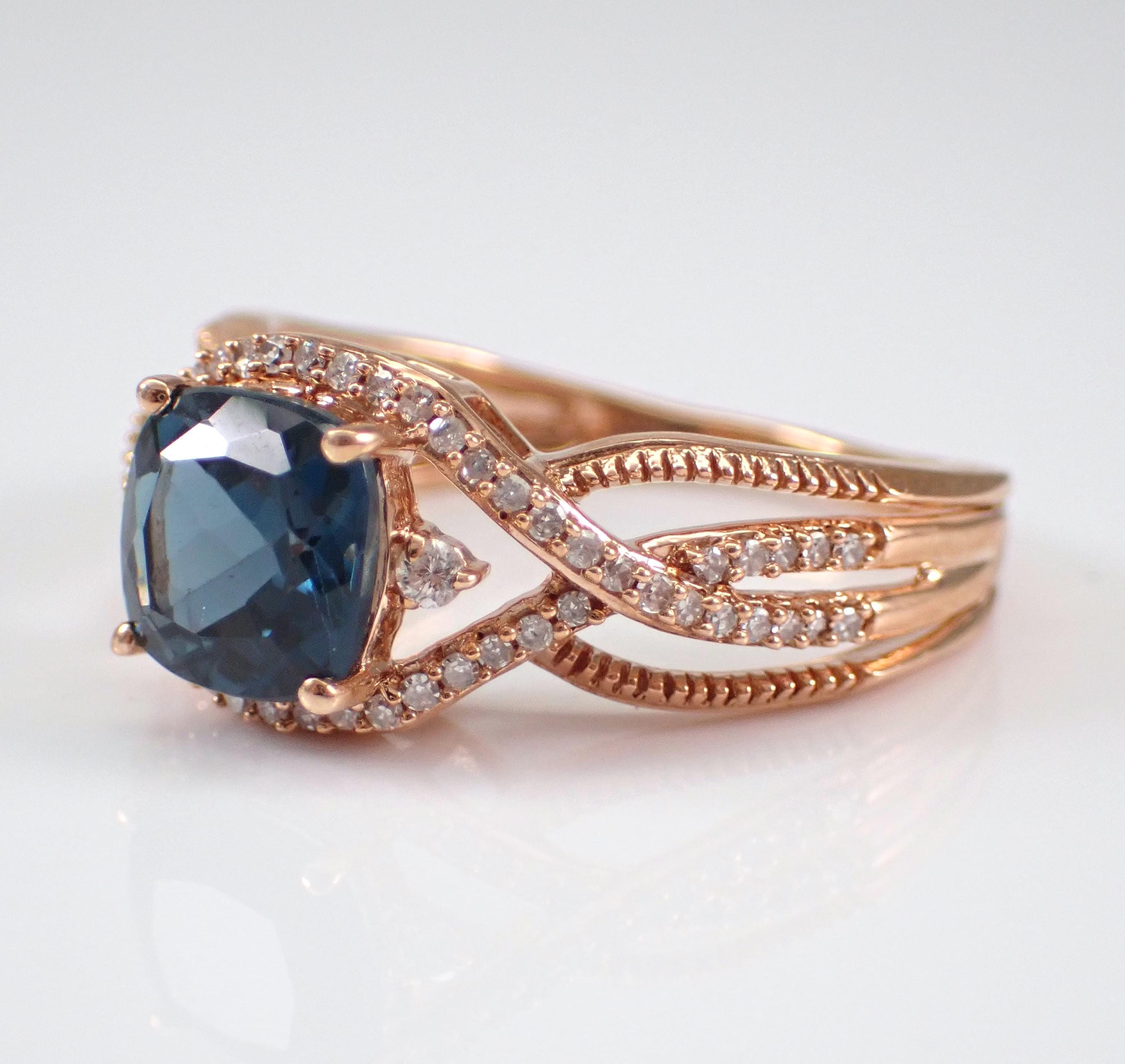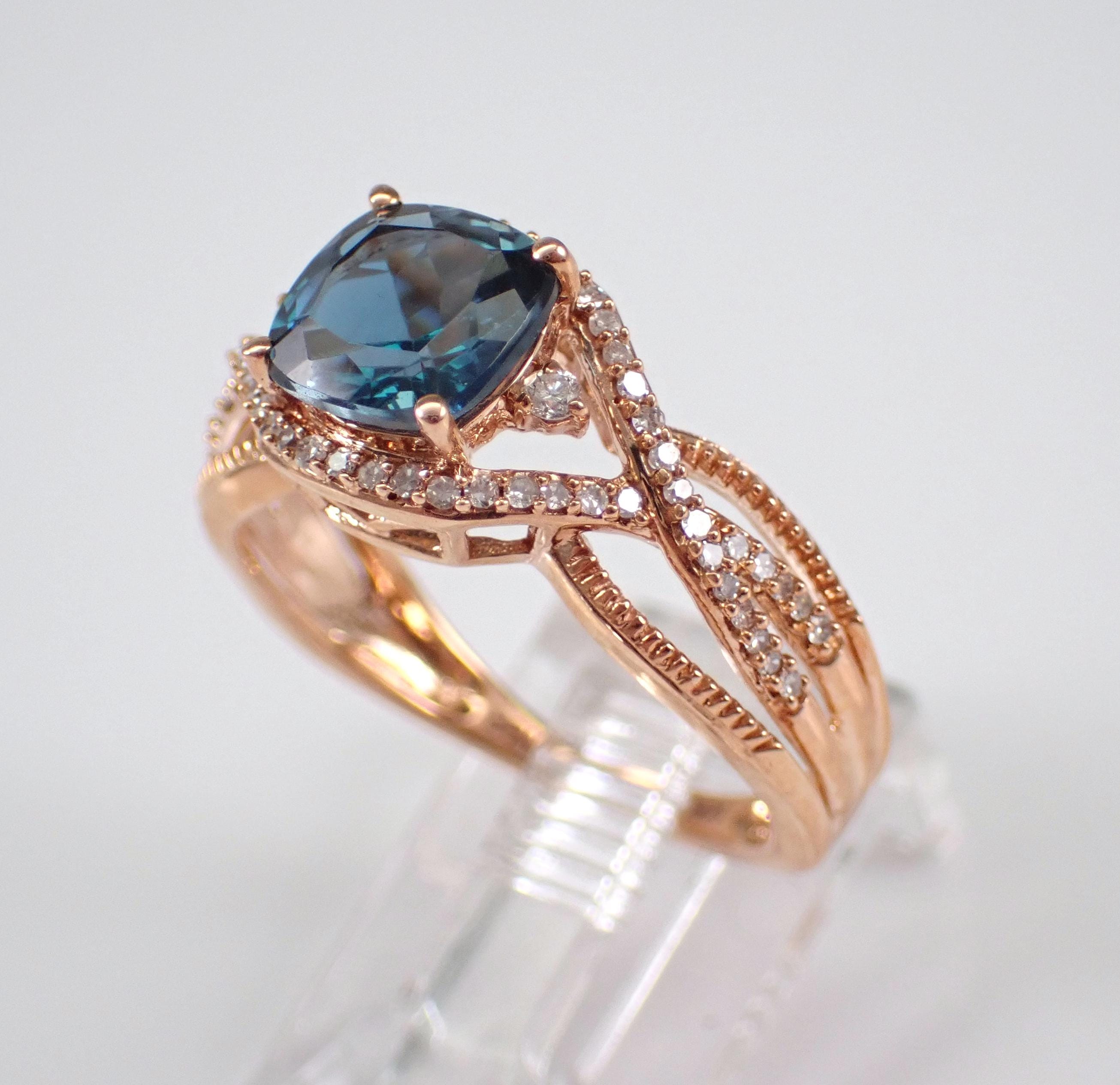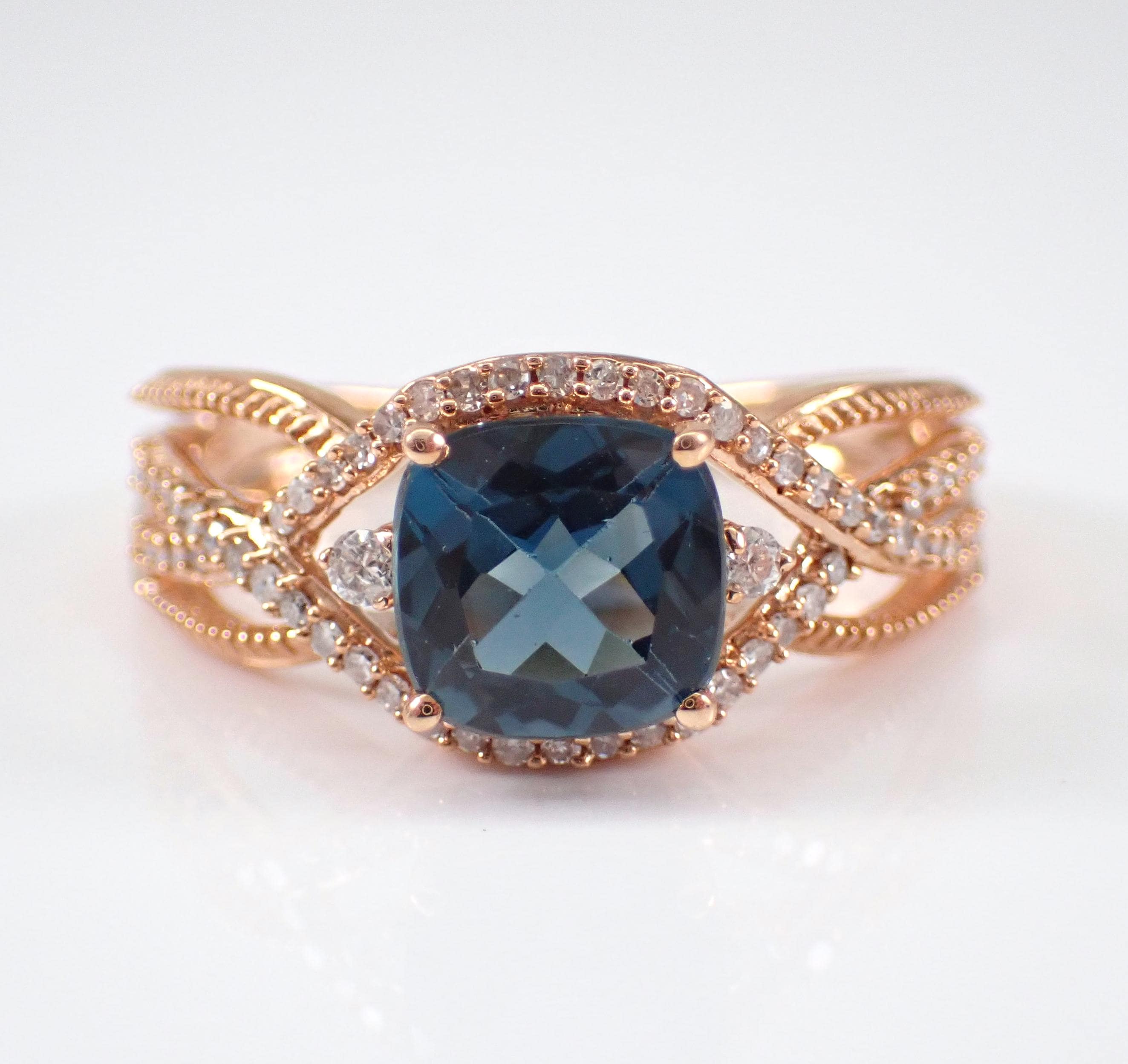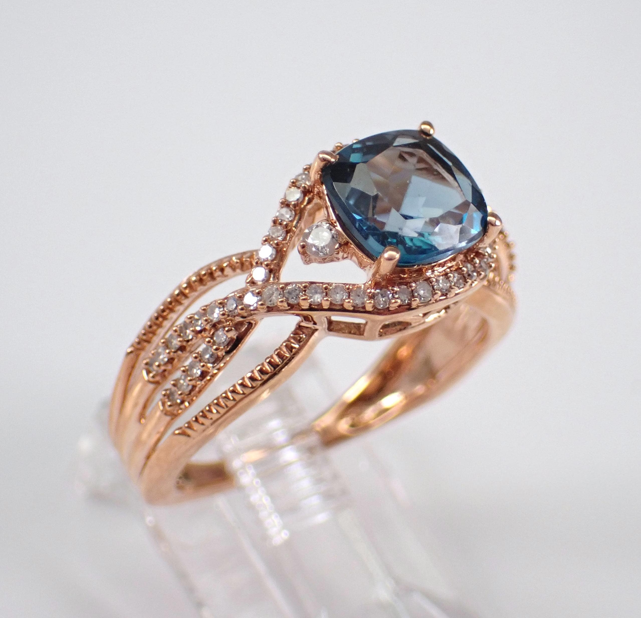 Rose Gold Diamond and London Blue Topaz Engagement Ring. This ring is set with one natural Cushion Cut Blue Topaz in the center. This Blue Topaz measures 7 X 7 mm and weighs 1 1/2 carats. There are sixty-two genuine Round Brilliant Diamonds set in this ring. These diamonds are H color, SI/I clarity and weigh a total of .30 carat. This ring is 10KT Rose Gold, weighs 3.6 grams and is a finger size 7, which can be resized (please inquire about sizing with the finger size you need). This ring will be accompanied by an appraisal by a GIA Certified Diamond Grader with the retail replacement value of $1,385.00. I will ship this ring promptly in a gift box.