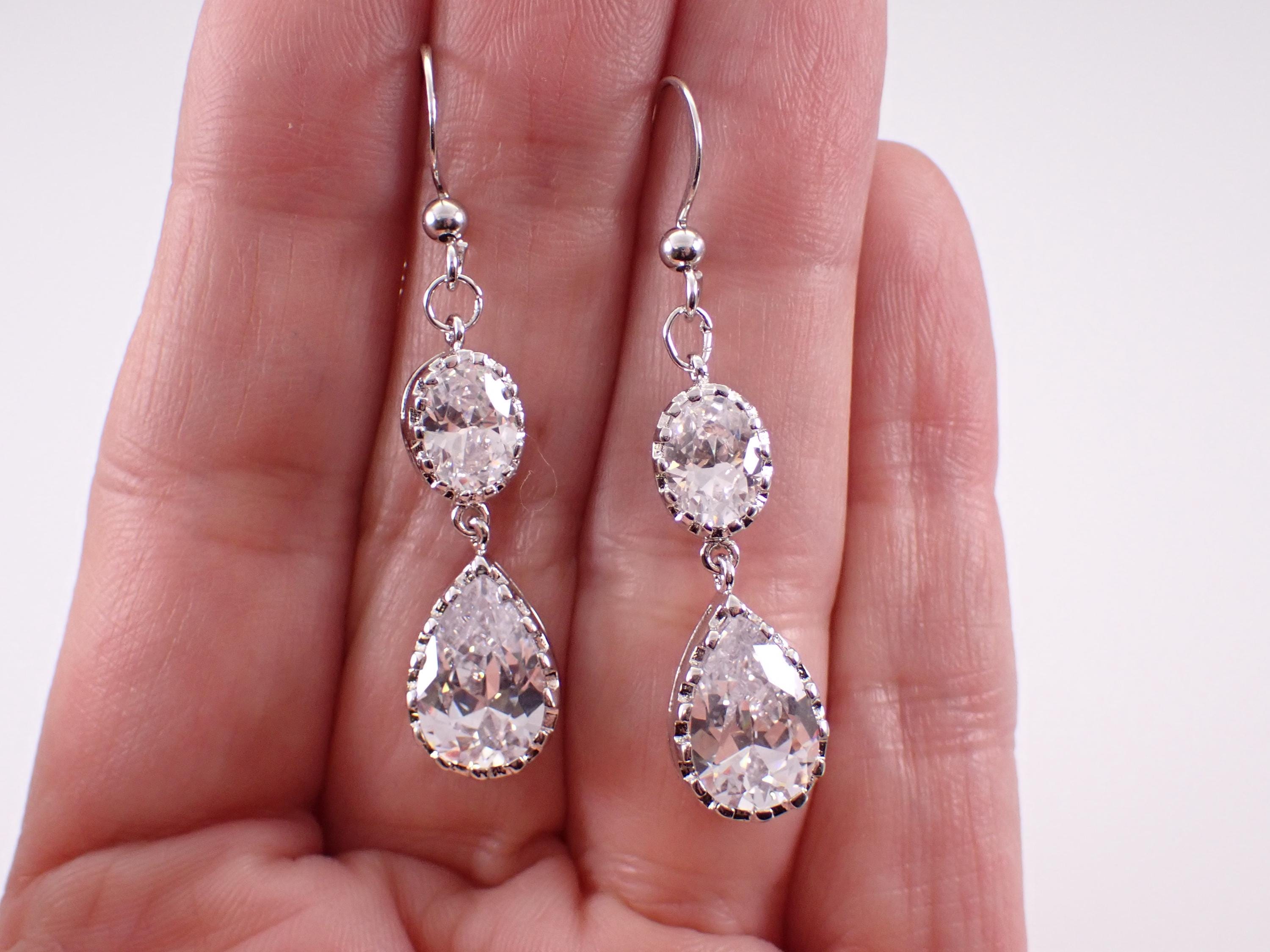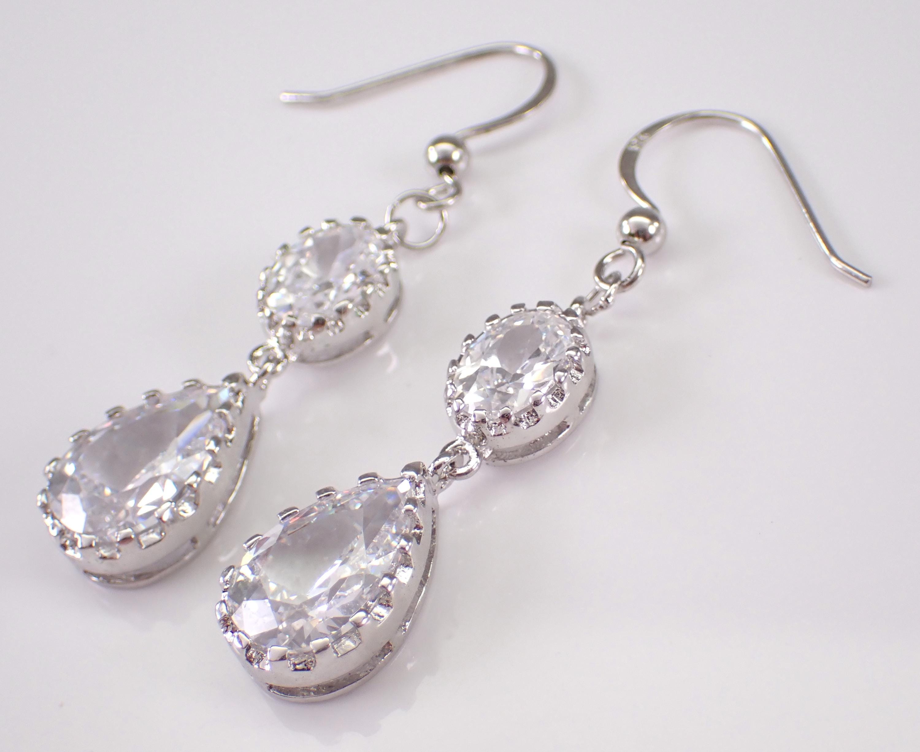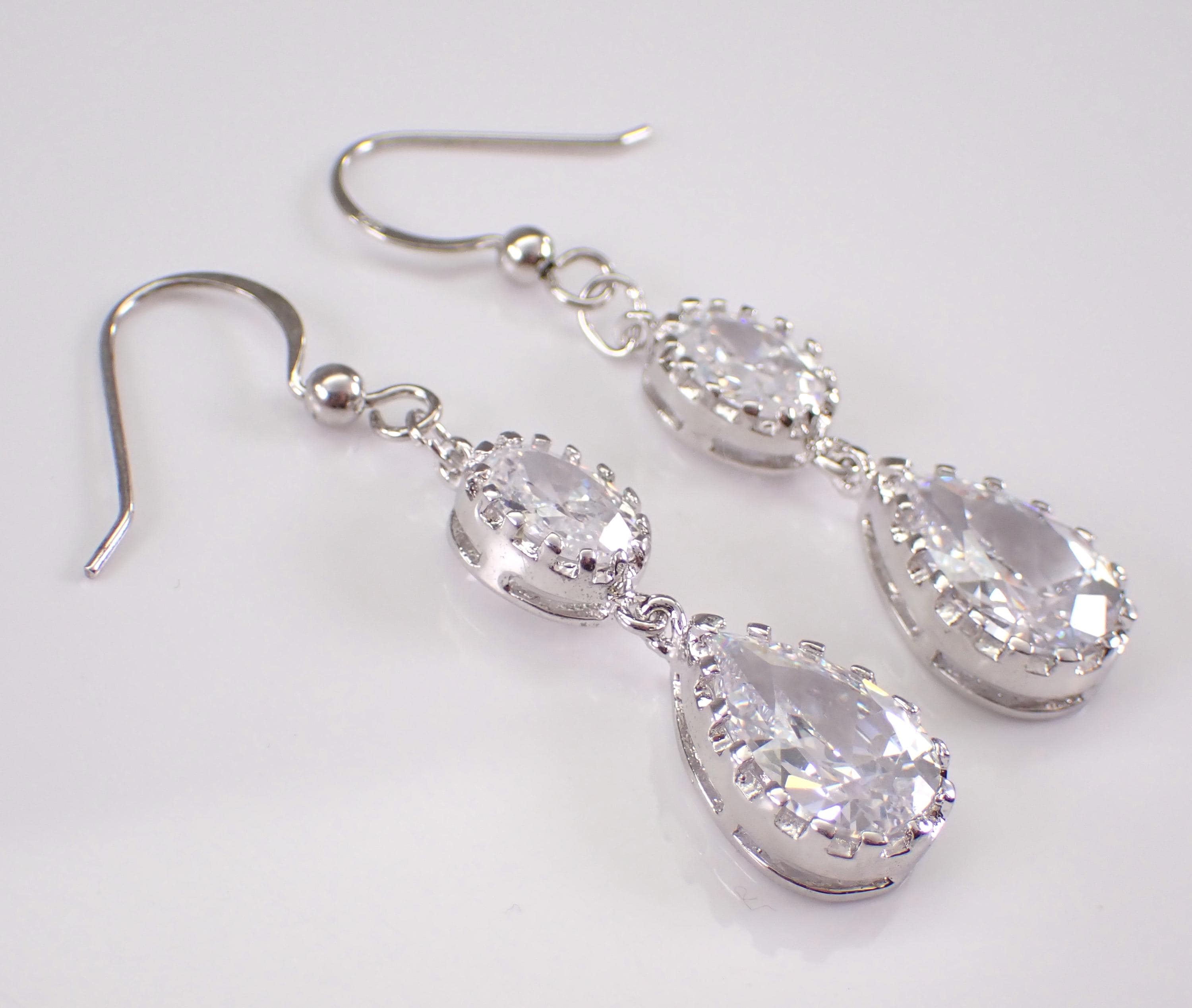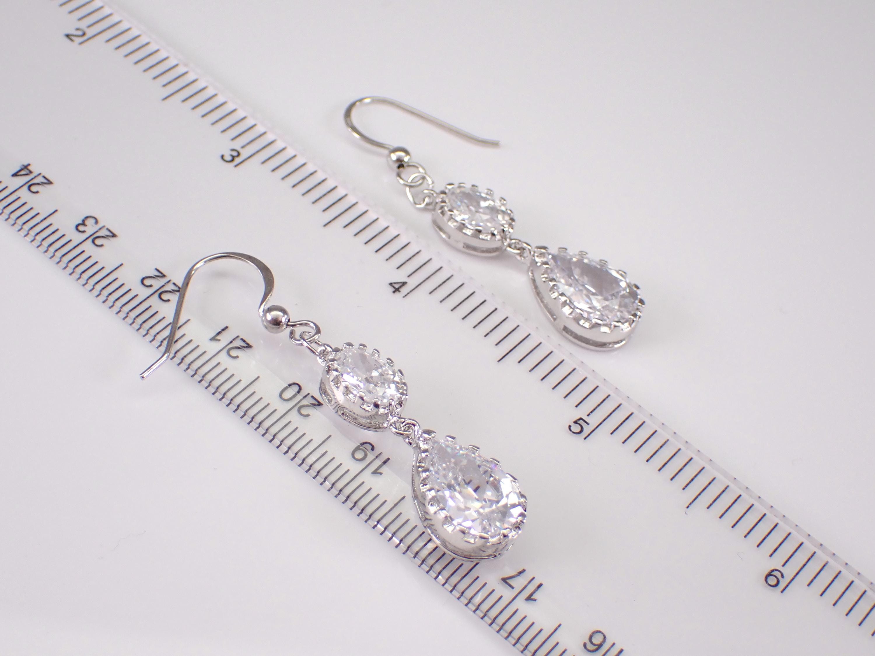Beautiful and unique Cubic Zirconia earrings are crafted of 925 Sterling Silver. There are two pear shaped CZ (12 X 8mm) and two Oval CZ (8 X 6mm) set in these Earrings. Each earring measures 47 mm in length. These earrings weigh a total of 7.2 grams and have french kidney wires. These earrings will be shipped promptly in a gift pouch.