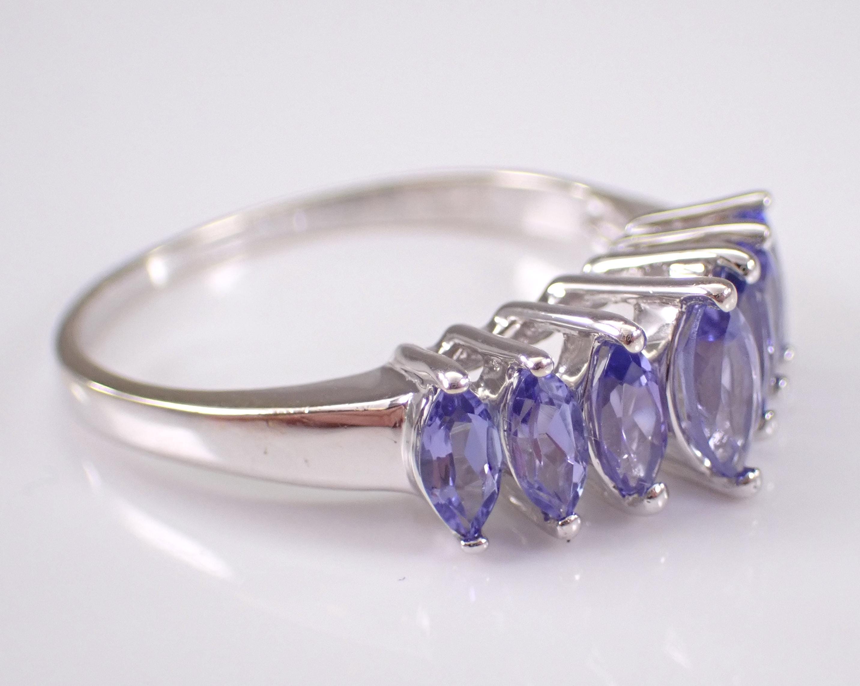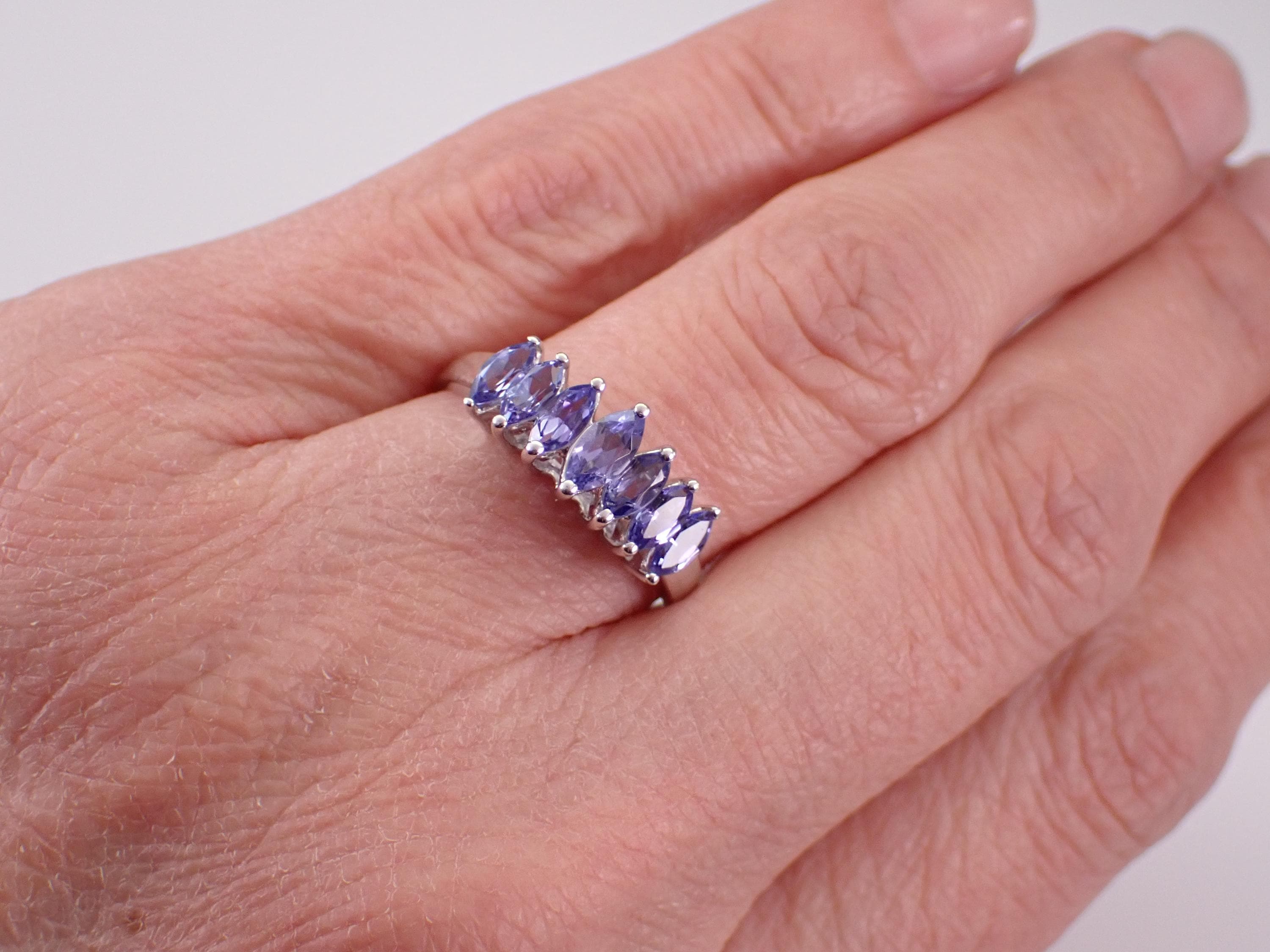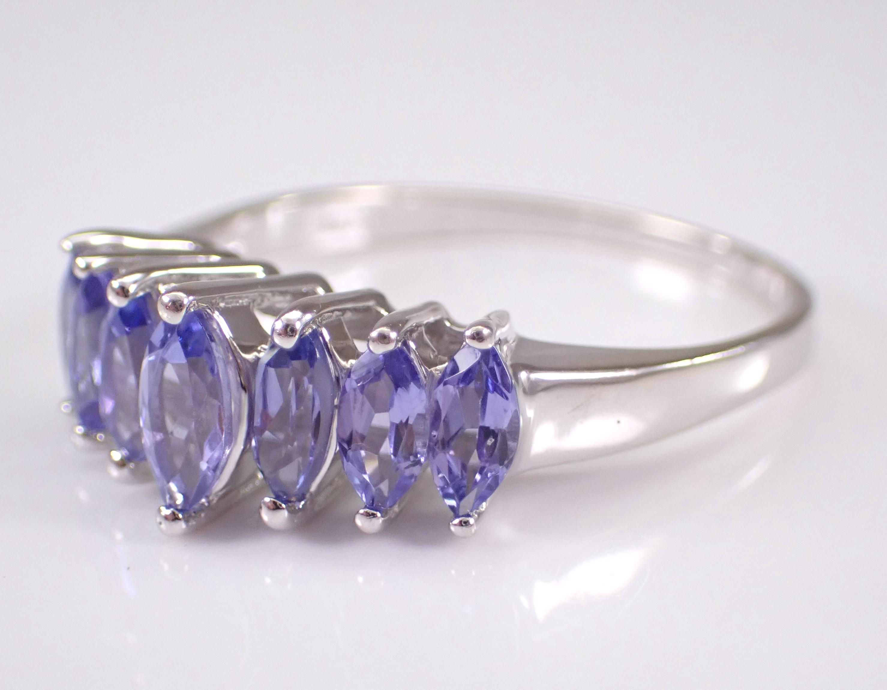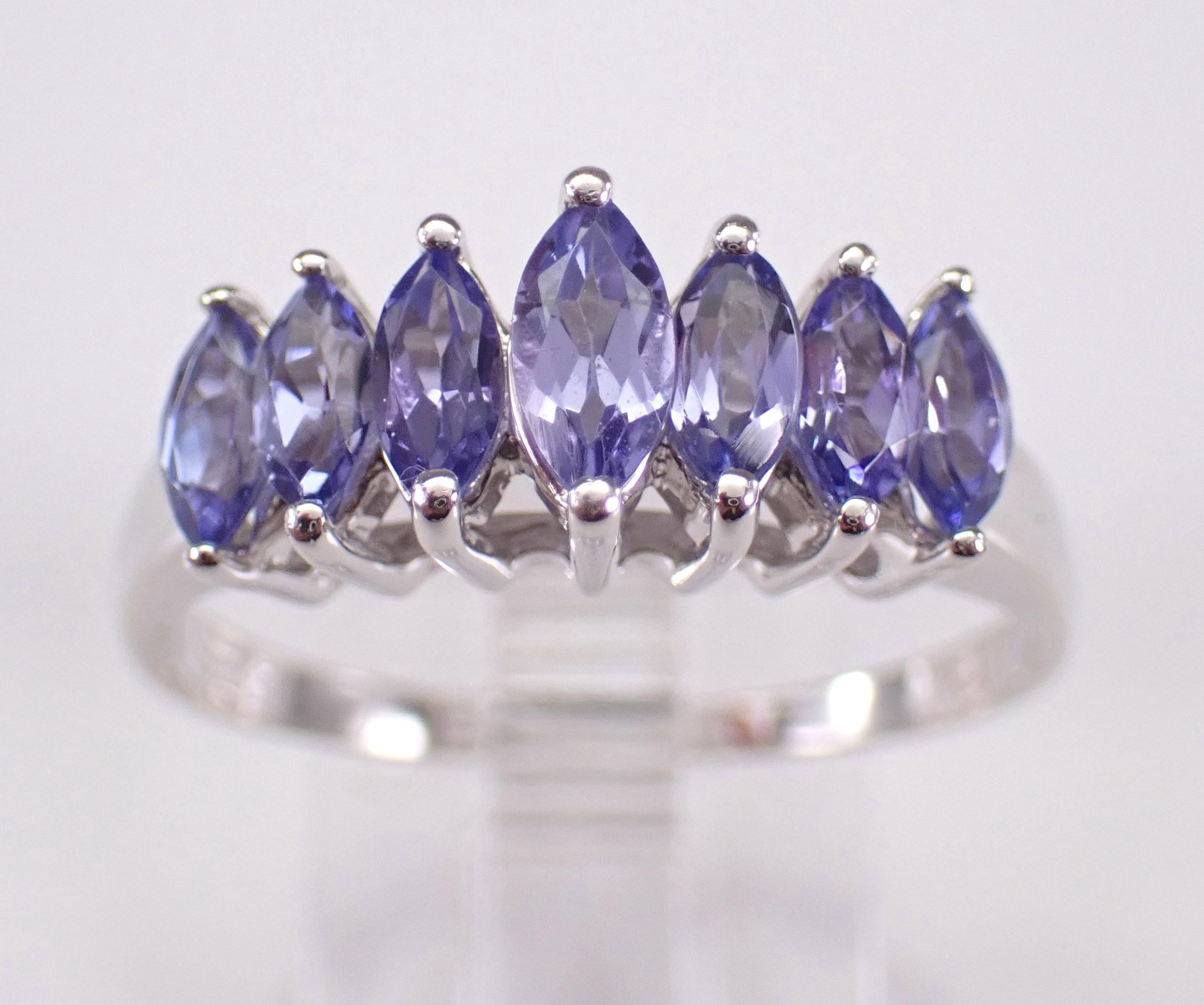 14K White Gold Tanzanite Ring. This ring is set with seven Marquise Tanzanite. The center Tanzanite measures 5 X 3 mm. All the gemstones in this ring weigh a total of 1 1/4 carat. This ring is 14KT White Gold, weighs 3.4 grams and is a finger size 9 1/4, which can be slightly resized. I will ship this ring promptly in a beautiful gift box.