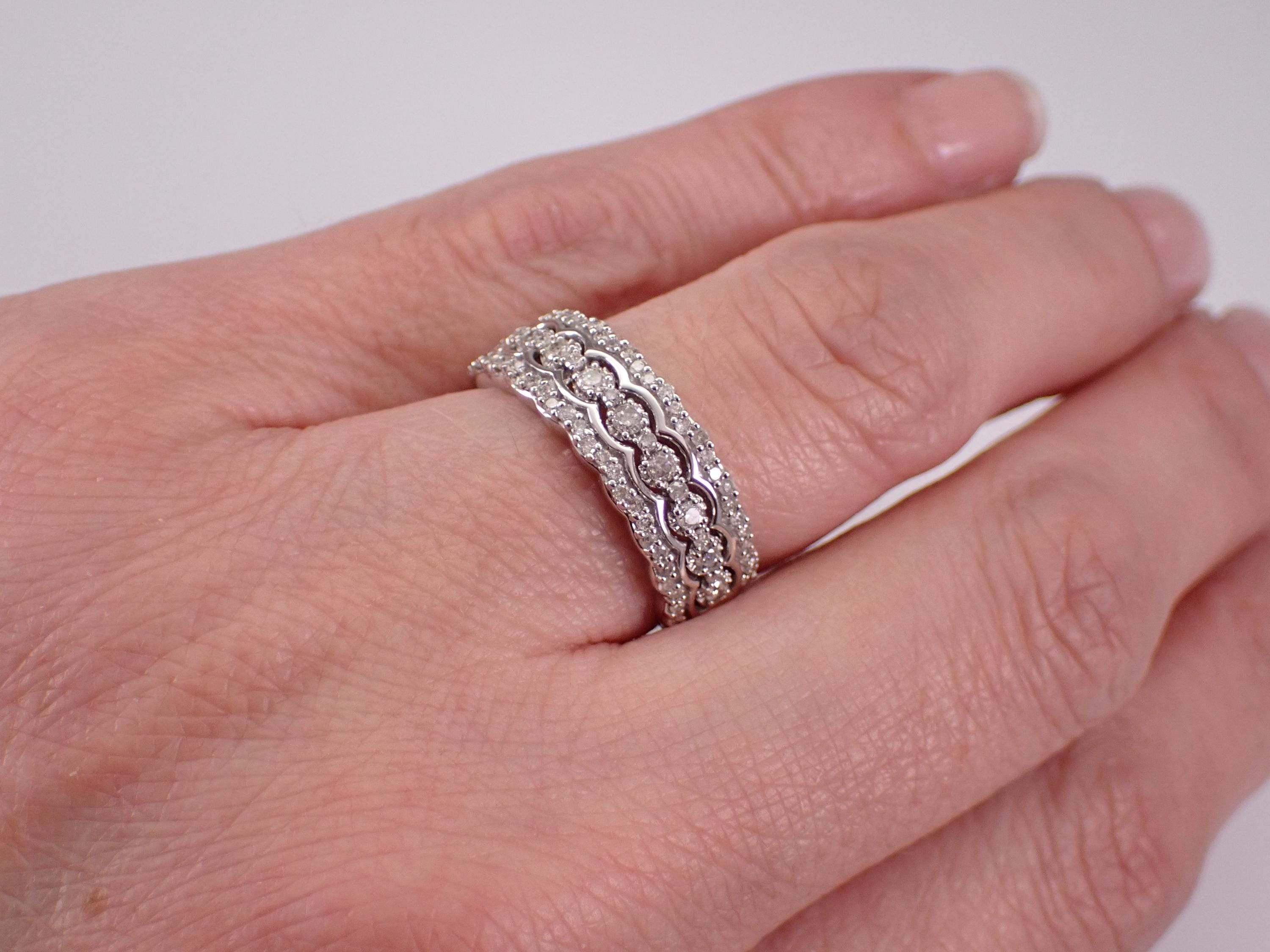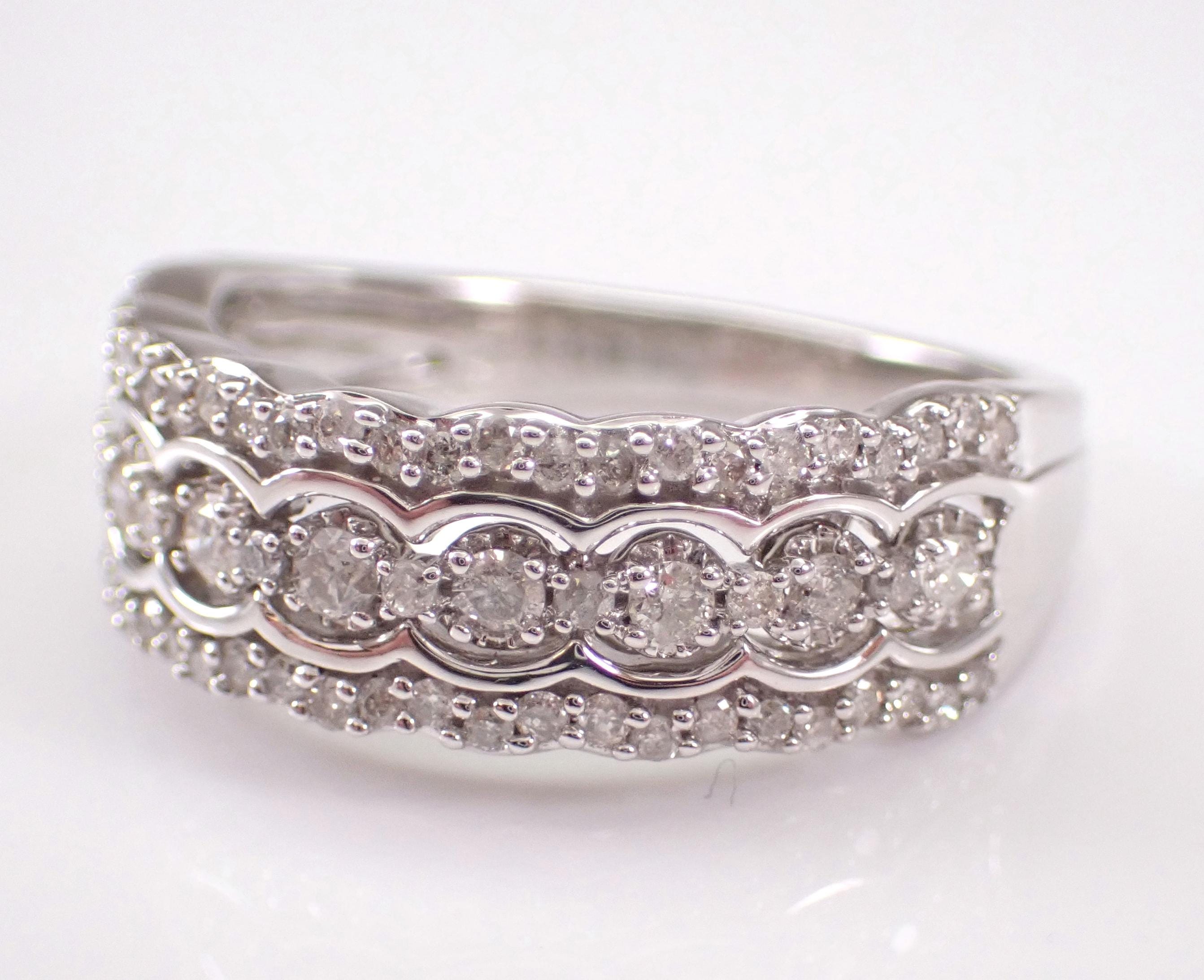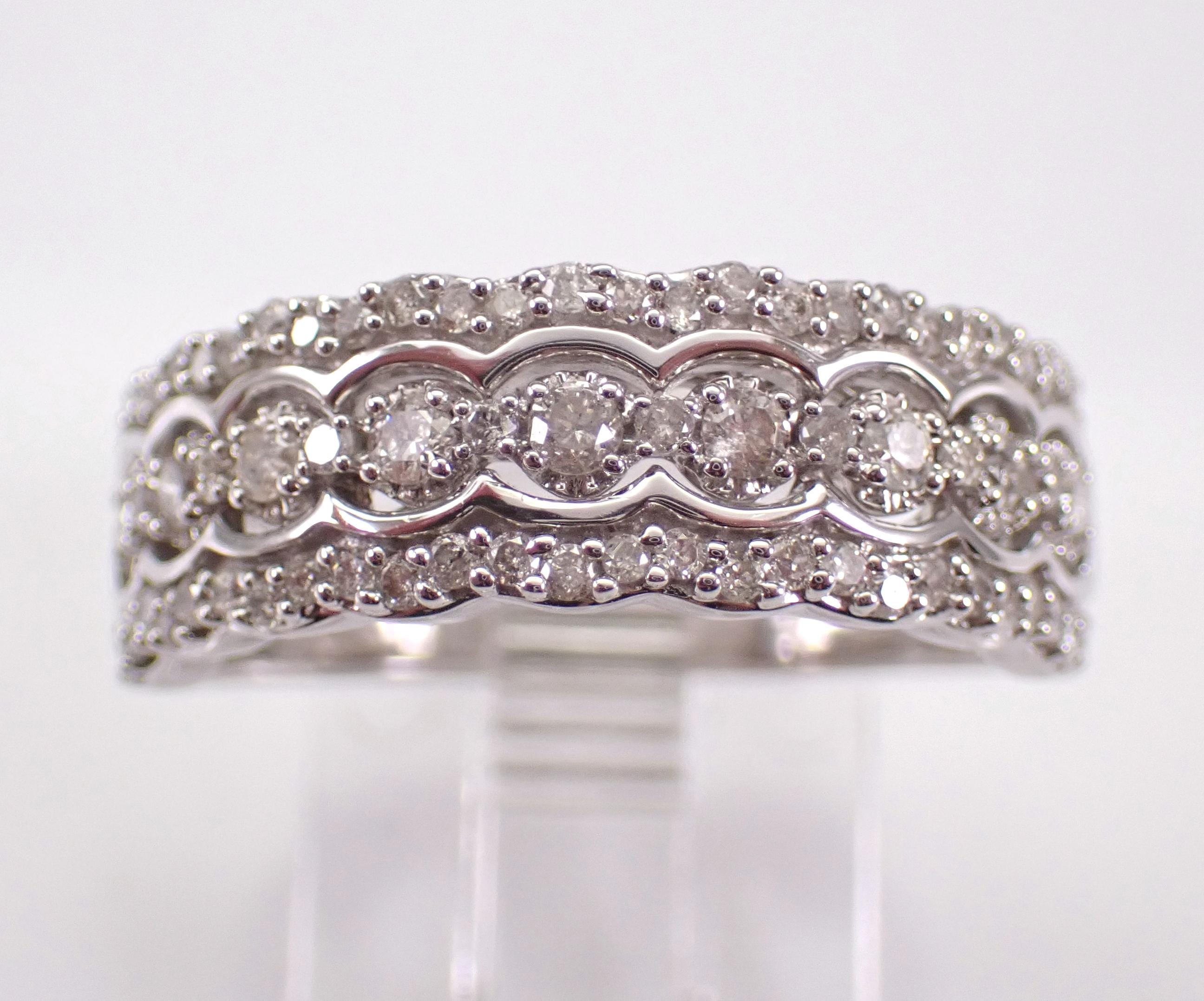 White Gold Diamond Wedding Ring Anniversary Band. This ring is set with seventy-one Round Brilliant Diamonds. These diamonds are H color, I1 clarity and weigh a total of 1/2 carat. This ring is 10KT White Gold, weighs 4.2 grams, measures 7 mm in width and is a finger size 7 1/4, can be resized free of charge (please inquire about sizing with the finger size you need). This ring will be accompanied by an appraisal written by a GIA Certified Diamond Grader with the retail replacement value of $1,785.00. I will ship this ring promptly in a beautiful gift box.