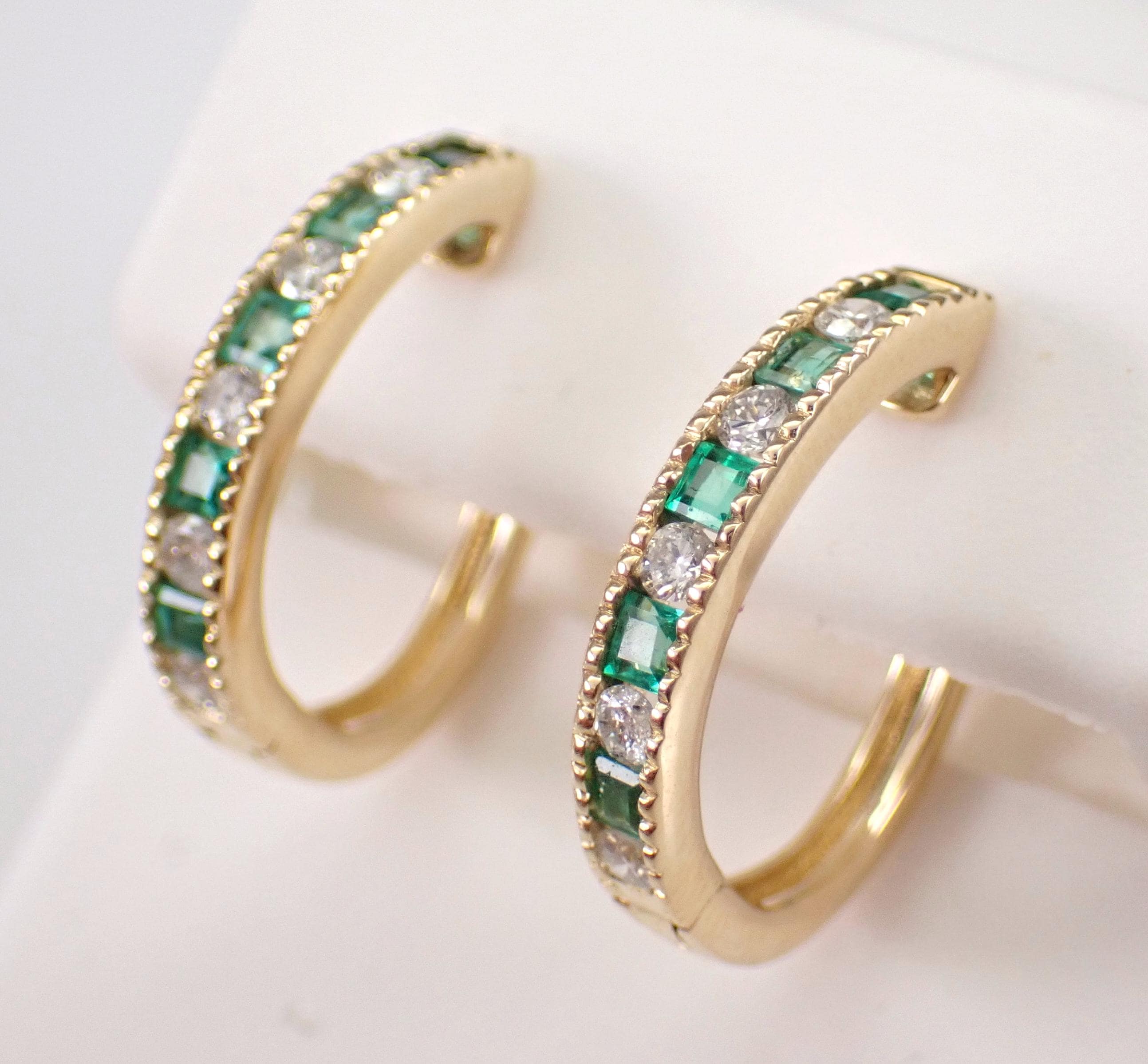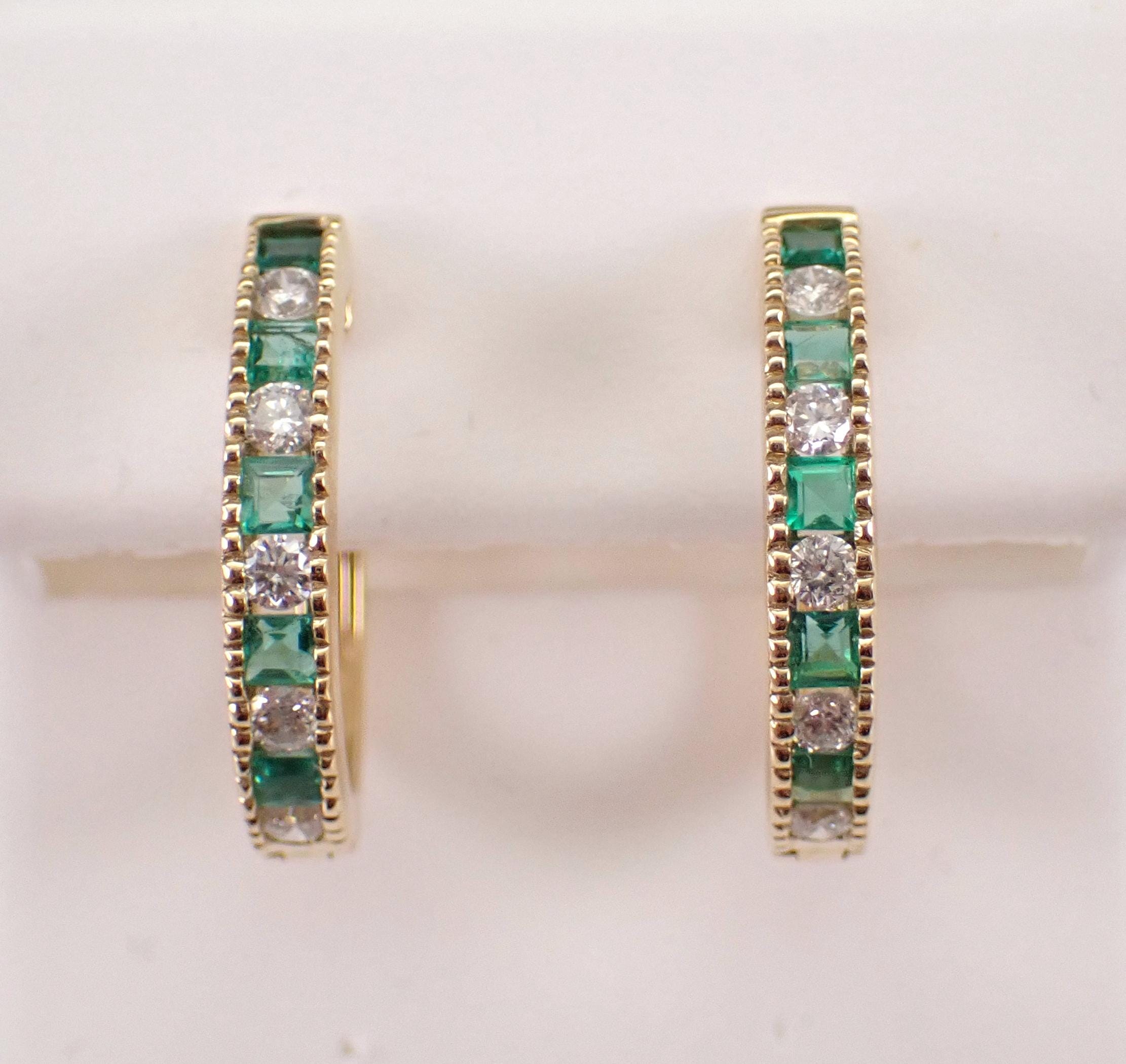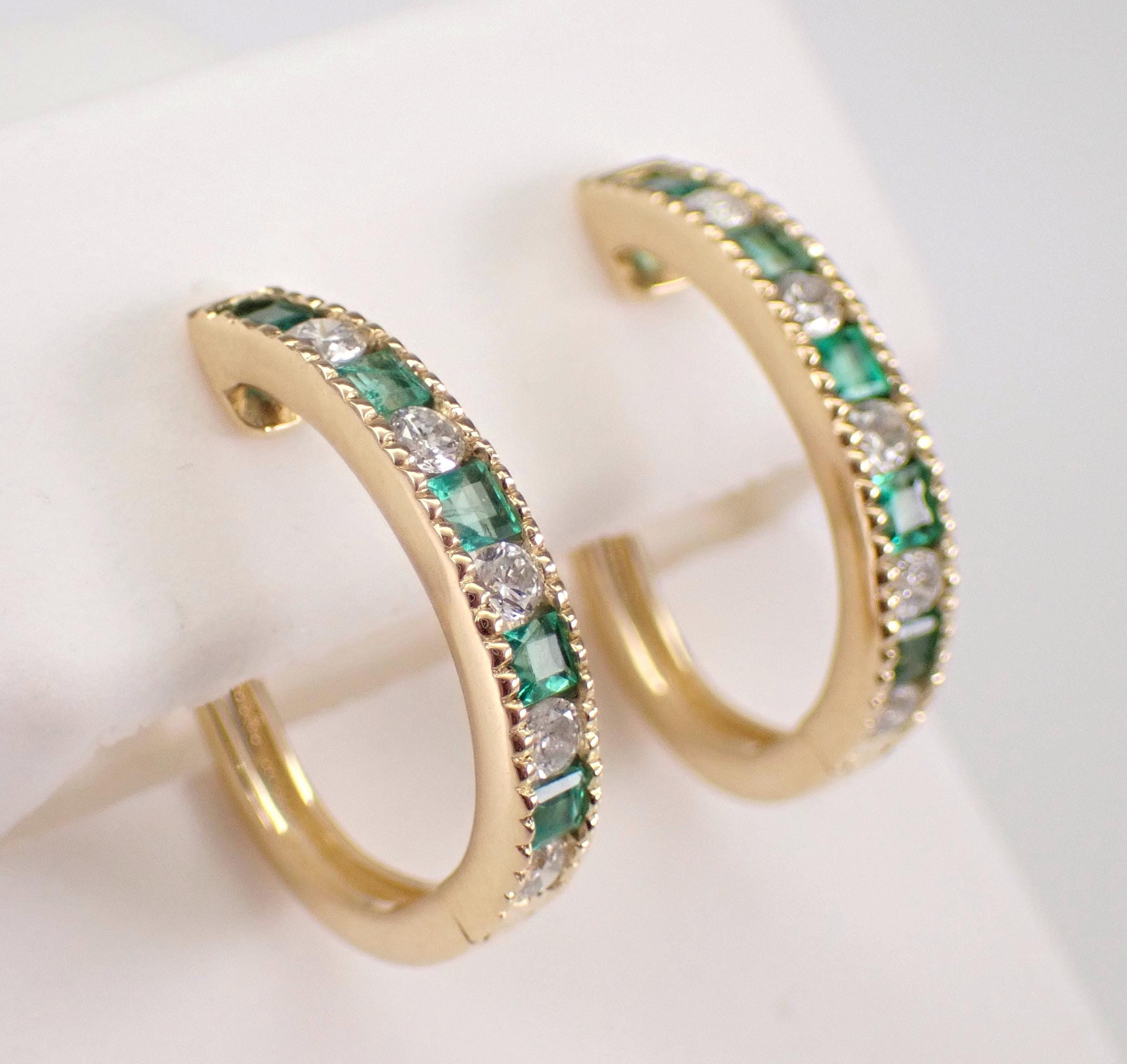 14K Yellow Gold Diamond and Emerald Hoop Earrings. These earrings are set with five genuine Round Brilliant Diamonds and five Princess Cut Emeralds in EACH Earring. The Emeralds in these earrings amount to a total weight of .45 carat. The diamonds are G color, SI clarity and weigh a total of .30 carat. These earrings are 14K Yellow Gold and weigh a total of 3.0 grams. These earrings are for pierced ears and measure 18 X 15 X 3 mm. These earrings will be accompanied by an appraisal written by a GIA Certified Diamond Grader with the retail replacement value of $2,985.00. I will ship these earrings promptly in a gift box.