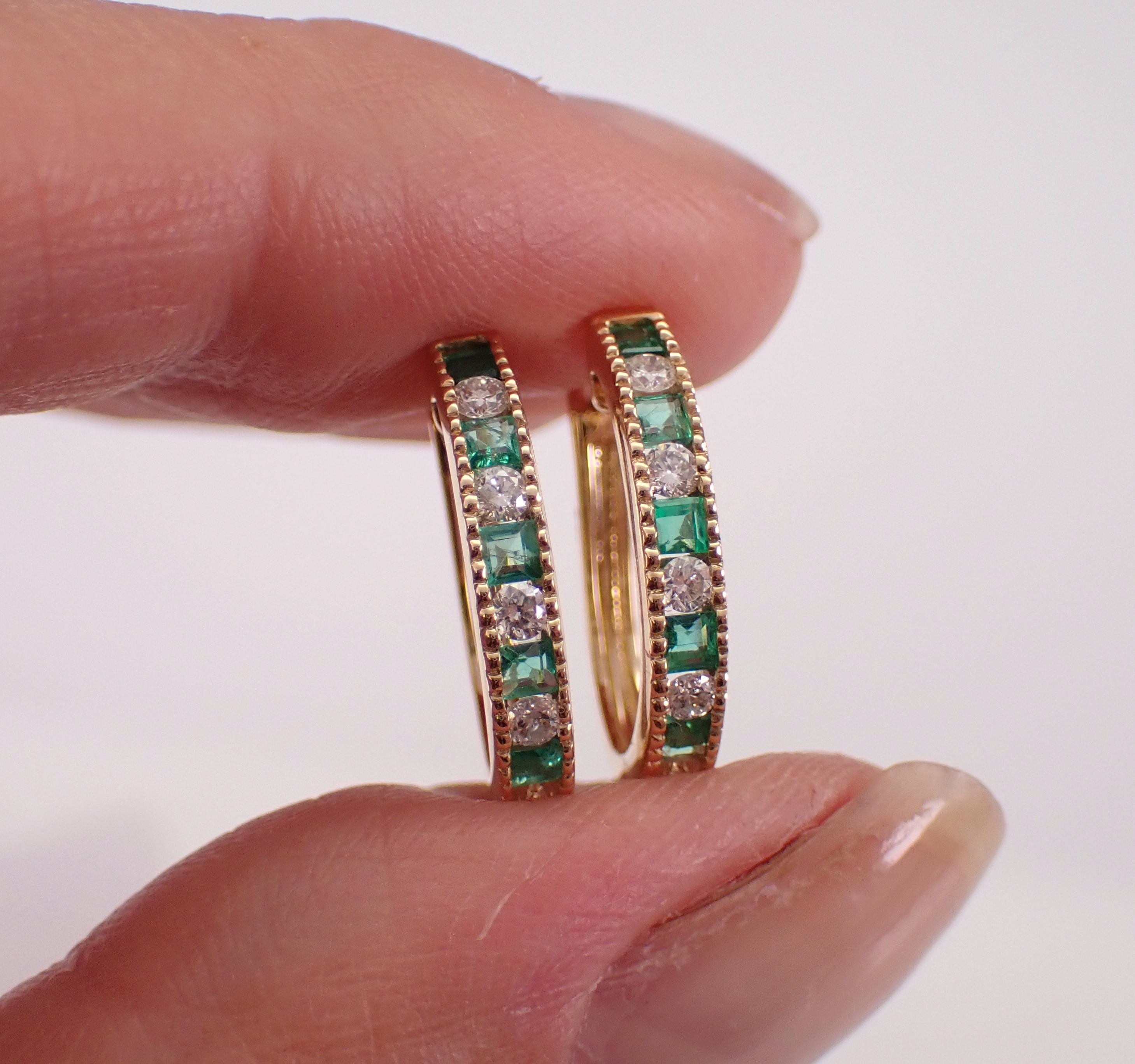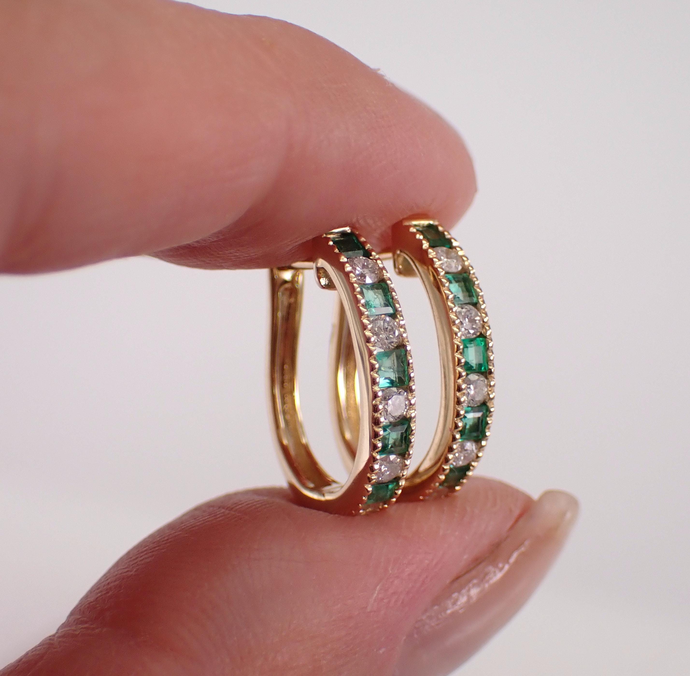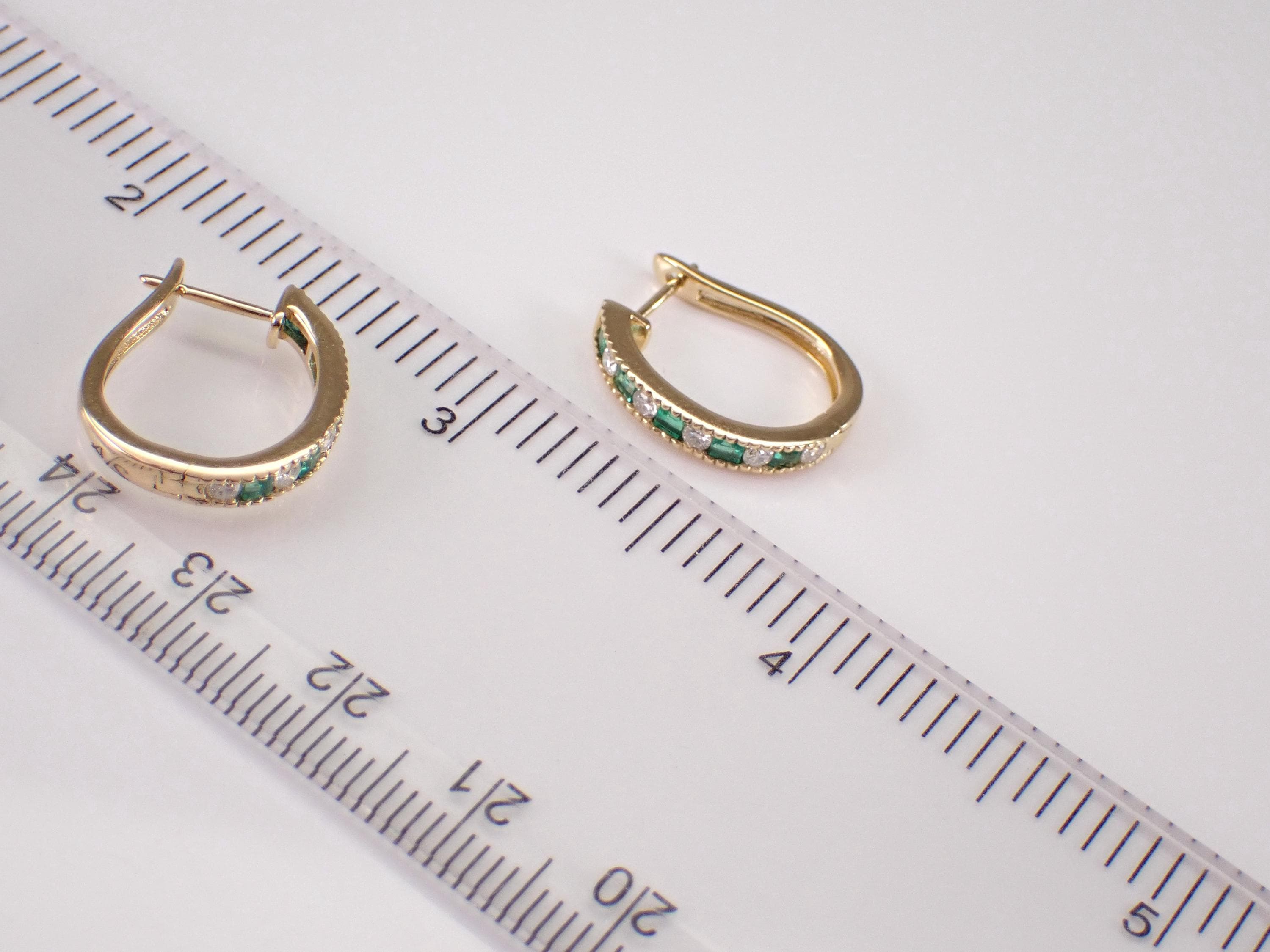 14K Yellow Gold Diamond and Emerald Hoop Earrings. These earrings are set with five genuine Round Brilliant Diamonds and five Princess Cut Emeralds in EACH Earring. The Emeralds in these earrings amount to a total weight of .45 carat. The diamonds are G color, SI clarity and weigh a total of .30 carat. These earrings are 14K Yellow Gold and weigh a total of 3.0 grams. These earrings are for pierced ears and measure 18 X 15 X 3 mm. These earrings will be accompanied by an appraisal written by a GIA Certified Diamond Grader with the retail replacement value of $2,985.00. I will ship these earrings promptly in a gift box.