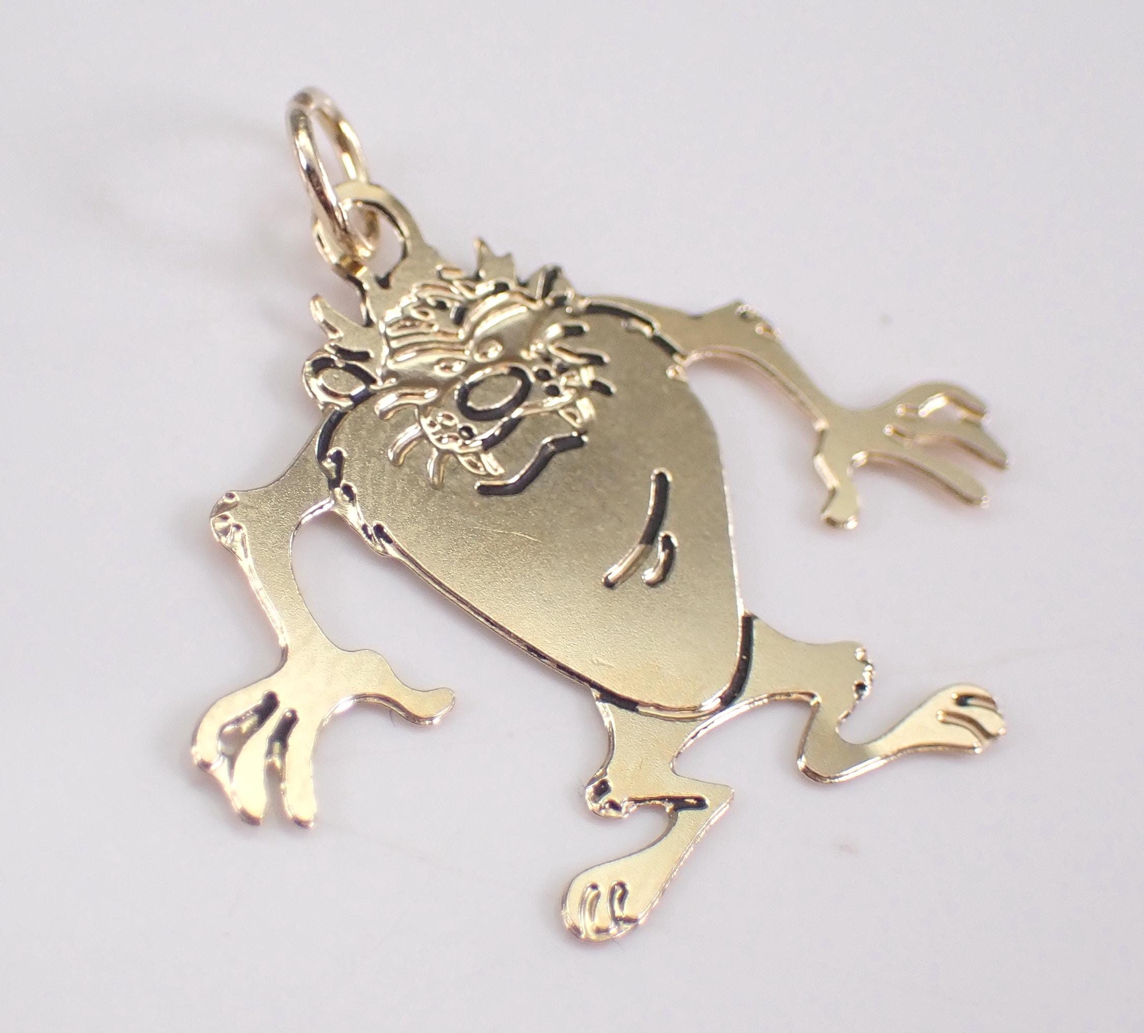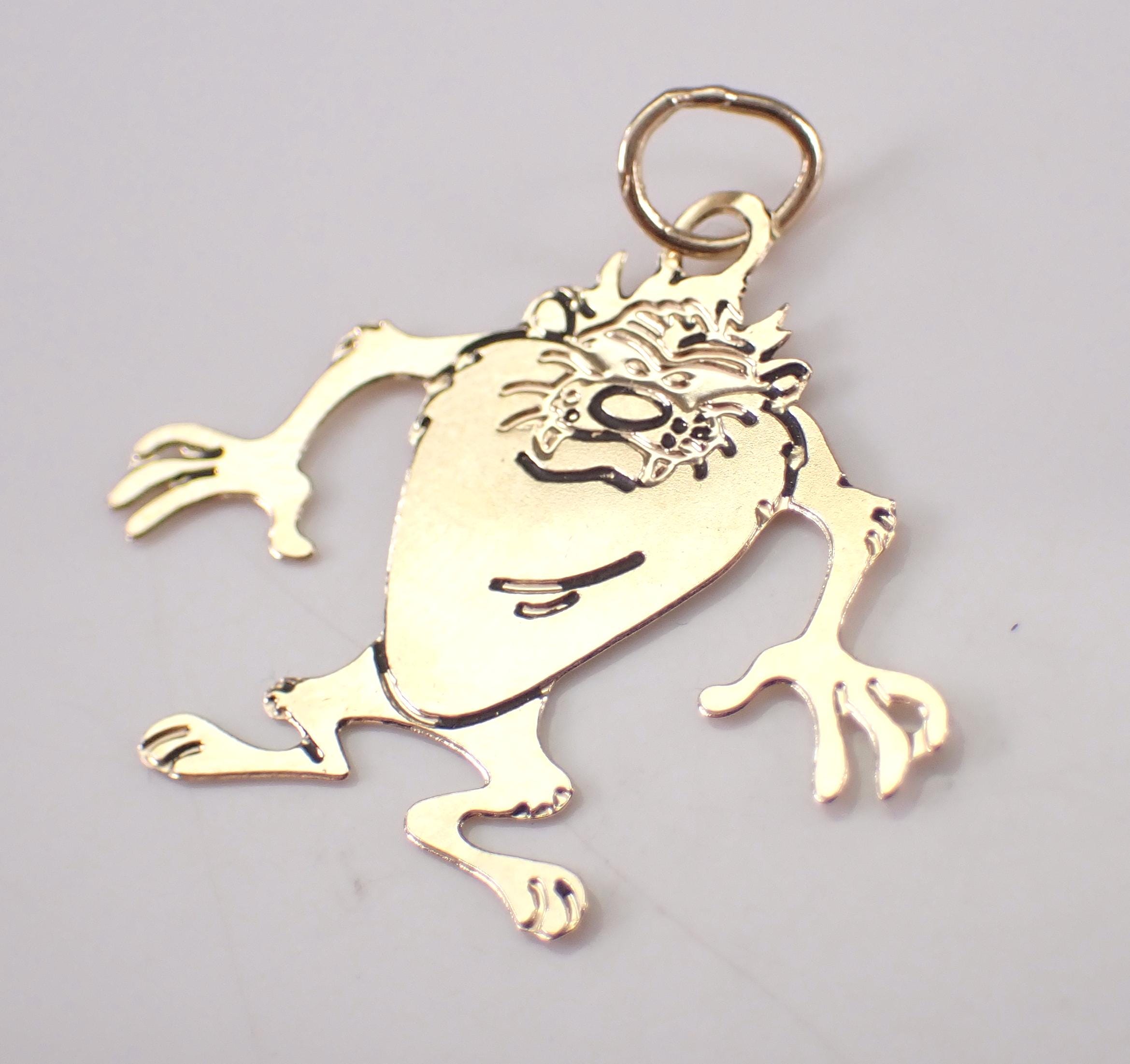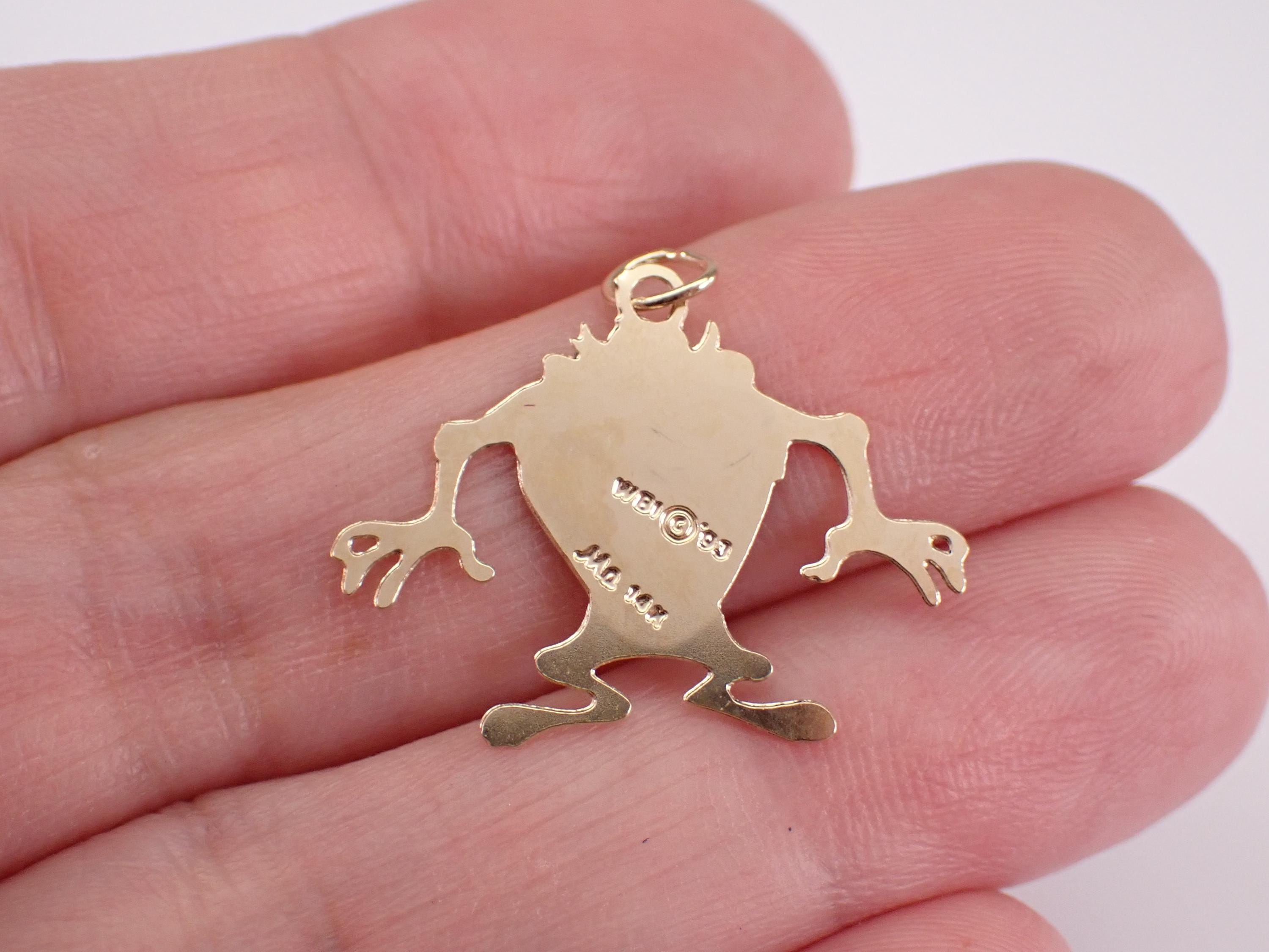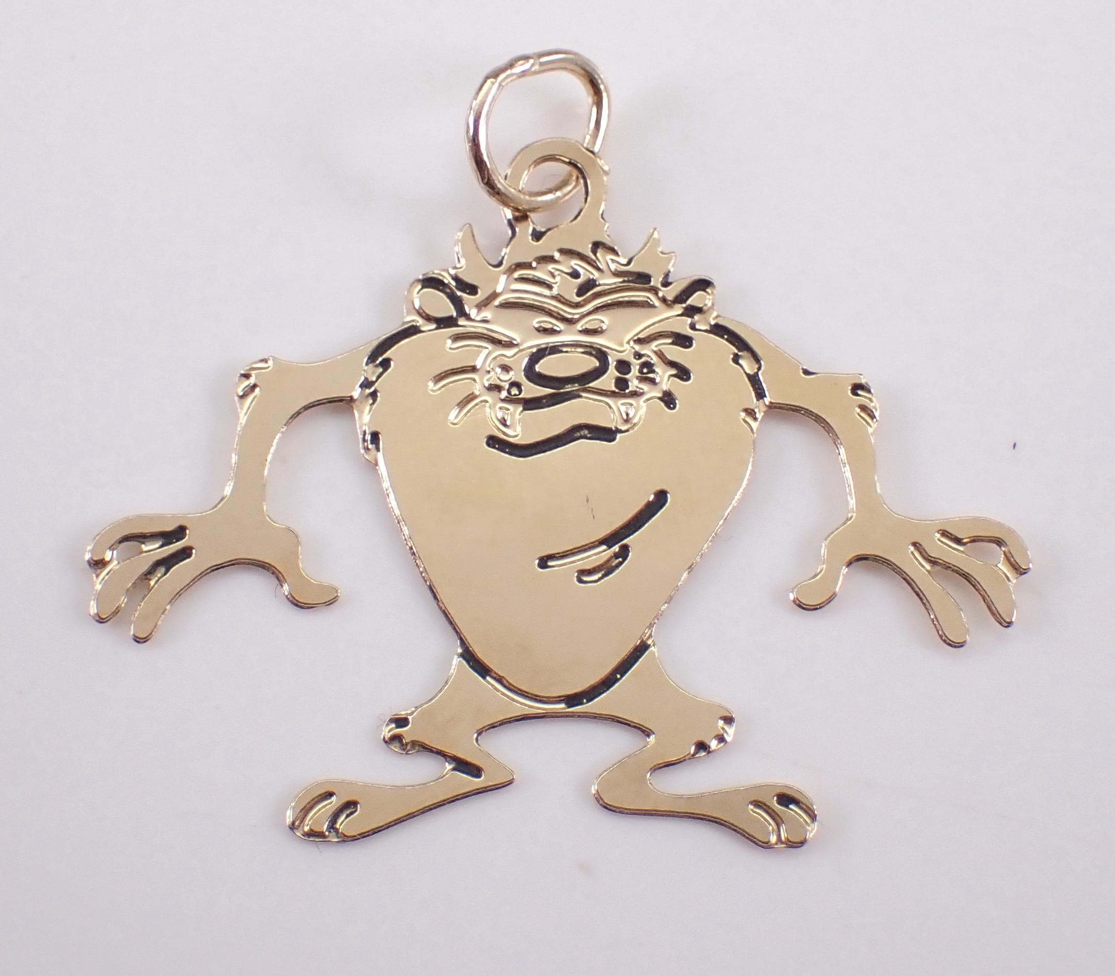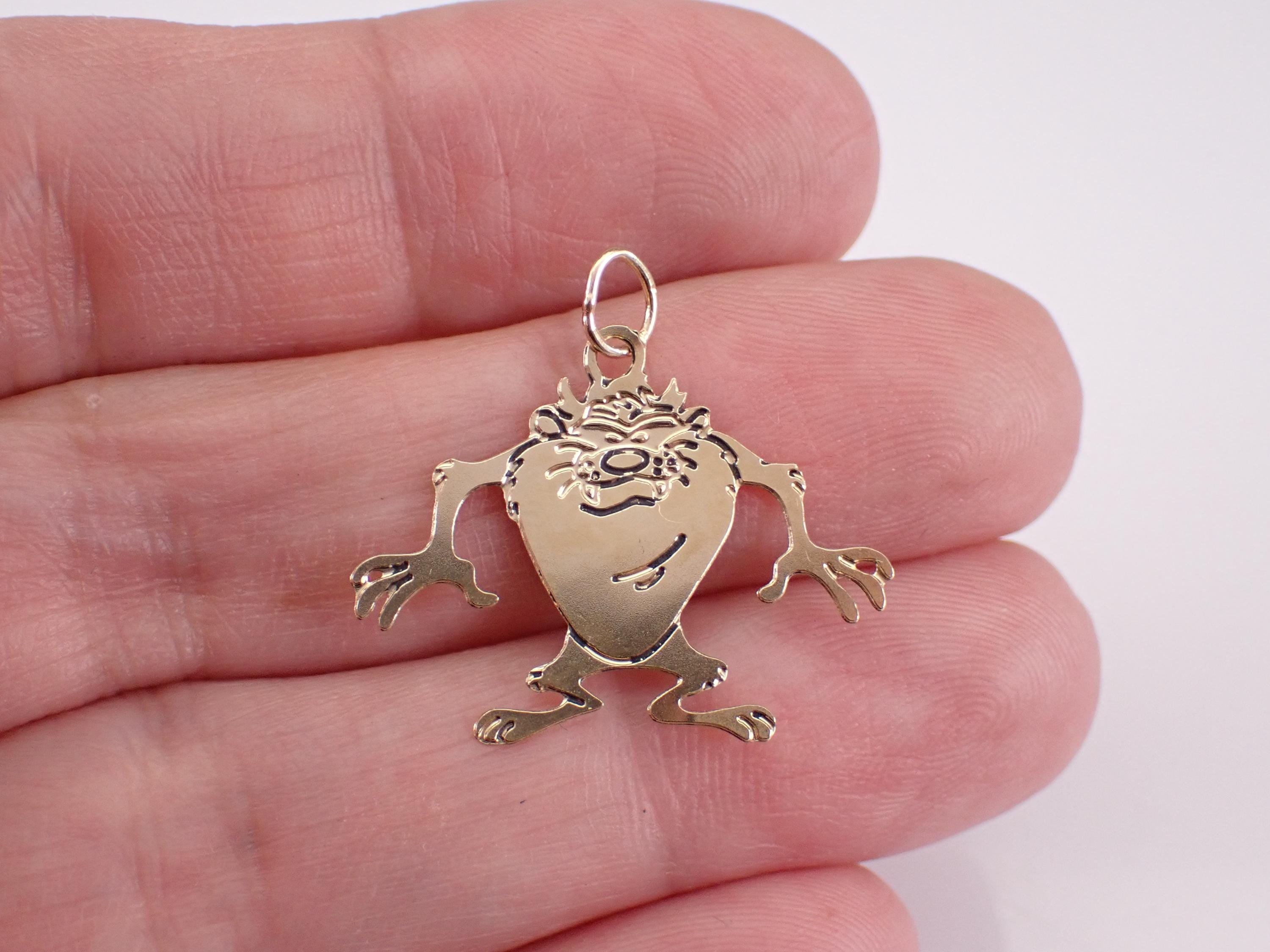 Vintage 14K Yellow Gold Tasmanian Devil Charm Pendant. This charm is Solid 14K Yellow gold and weighs .6 grams. This pendant measures 19.5 X 26 mm. This would make an adorable gift for be worn either on a chain or on a charm bracelet. I will ship this pendant promptly in a gift pouch.
