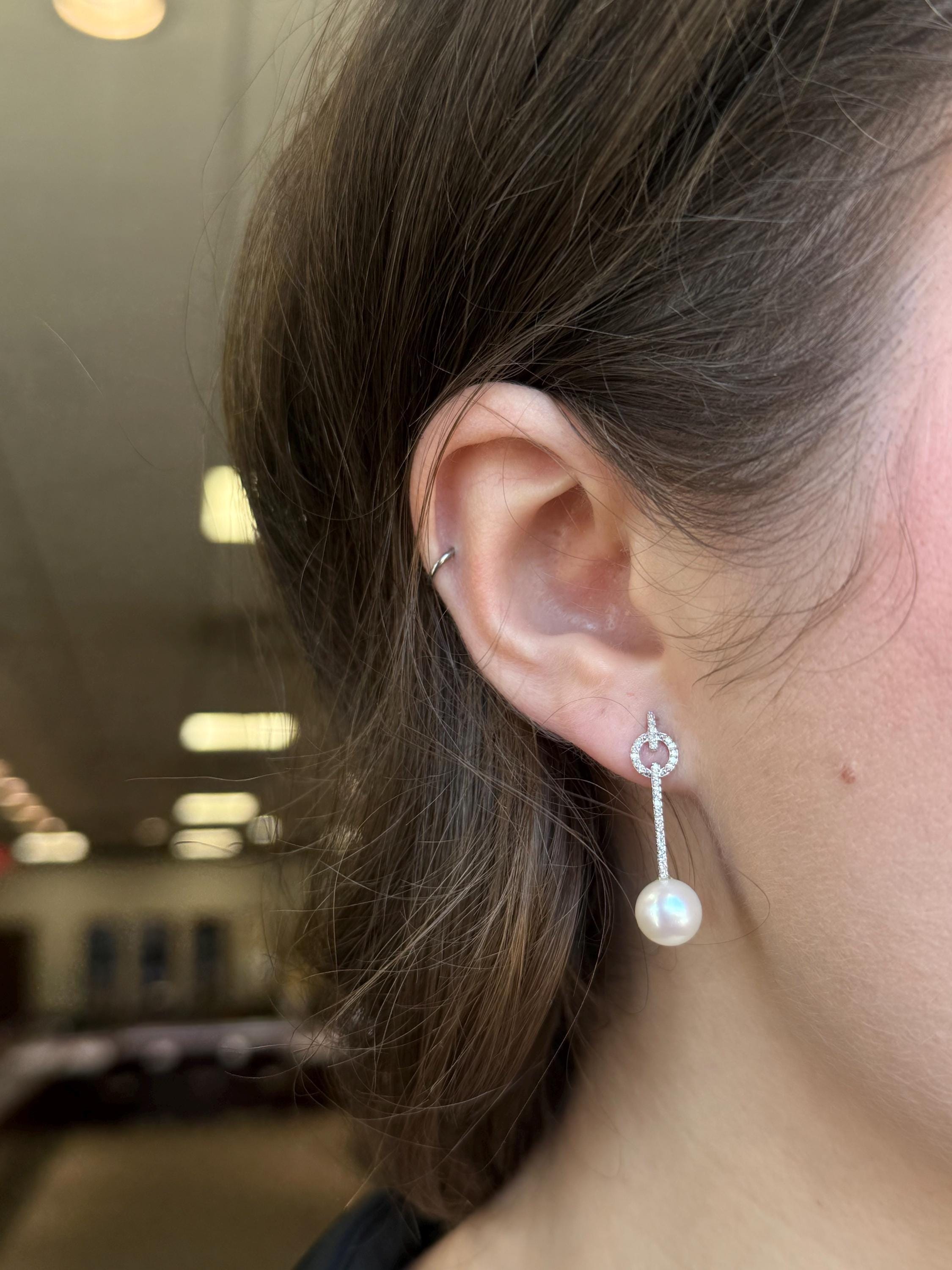 14K White Gold Pearl and Diamond Dangle Drop Earrings. There is one Pearl set to dangle off each earring. These Pearls measure 8.5 mm in diameter each. There are twenty-eight genuine natural Round Diamonds set in EACH earring. These diamonds are H color, SI/I1 clarity and weigh a total of .20 carat. These earrings are 14KT White Gold and weigh a total of 3.4 grams. These earrings are for pierced ears, measure 30 mm in length and the earrings have friction post backings. These earrings will be accompanied by an appraisal written by a GIA Certified Diamond Grader with the retail replacement value of $1,495.00. I will ship these earrings promptly in a gift box.
