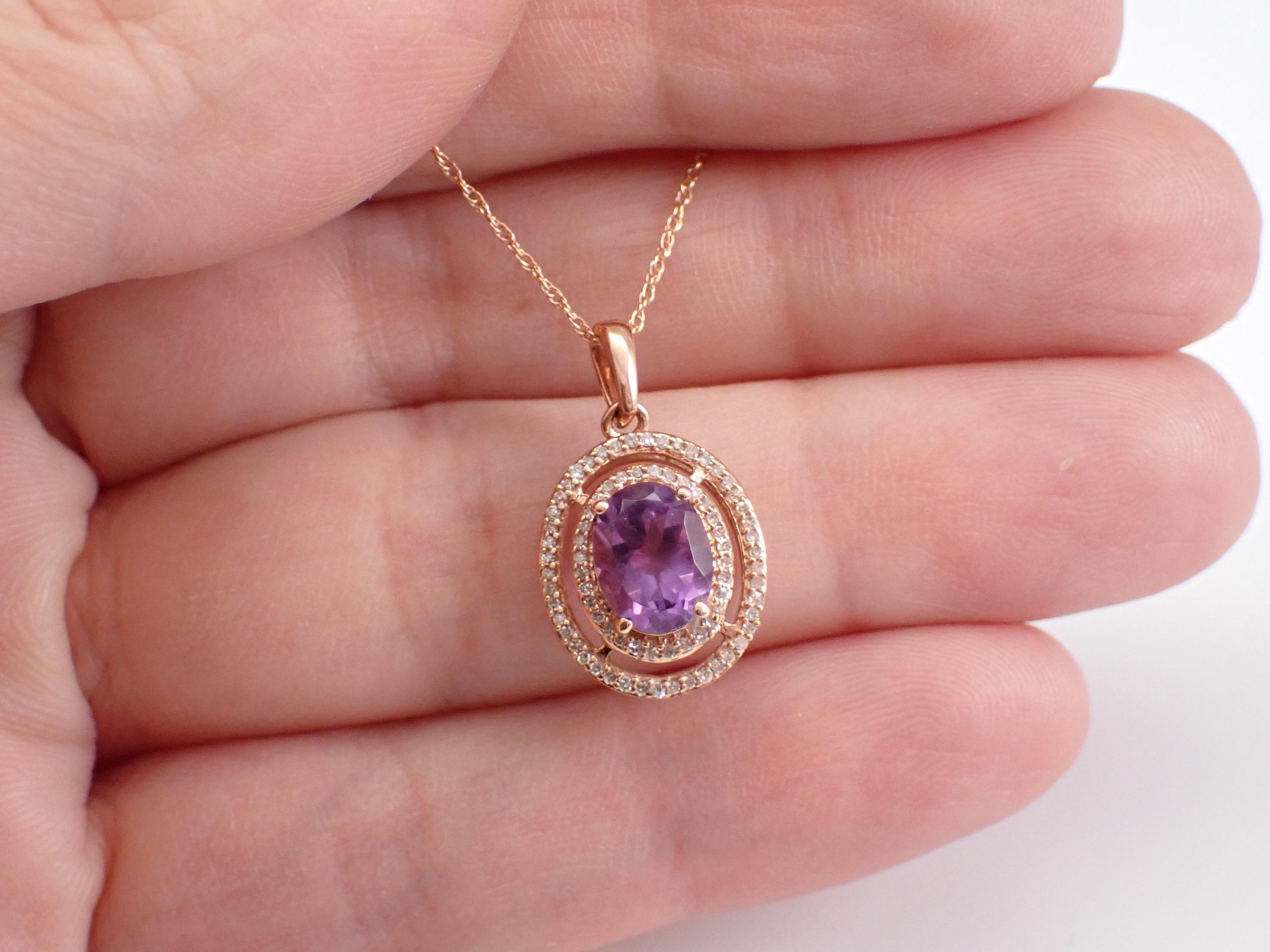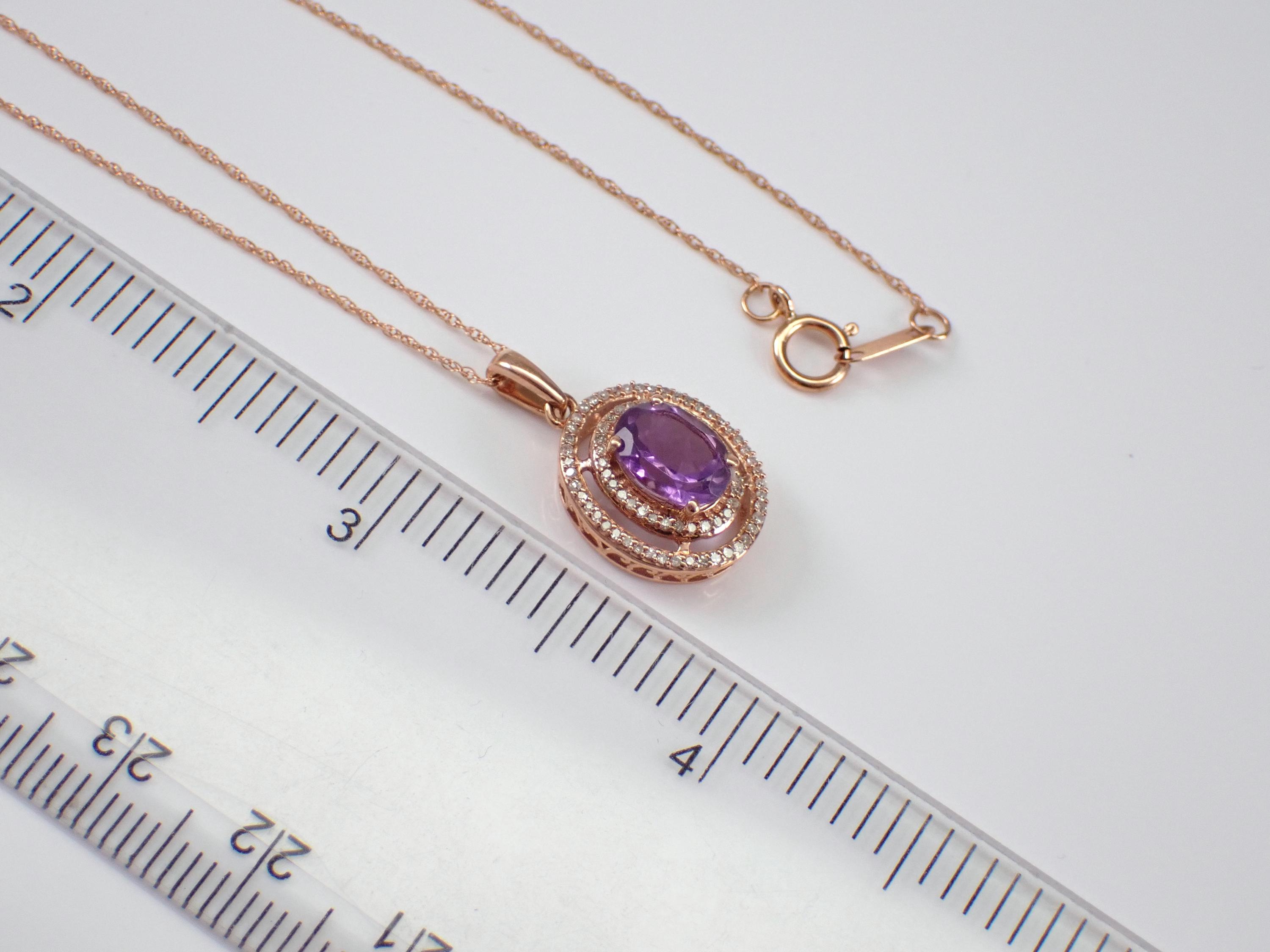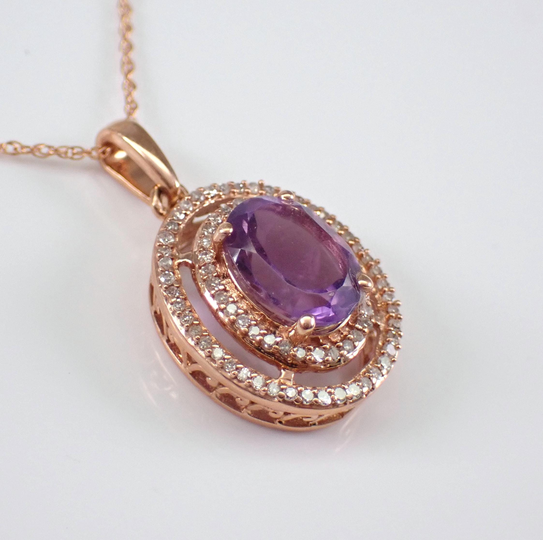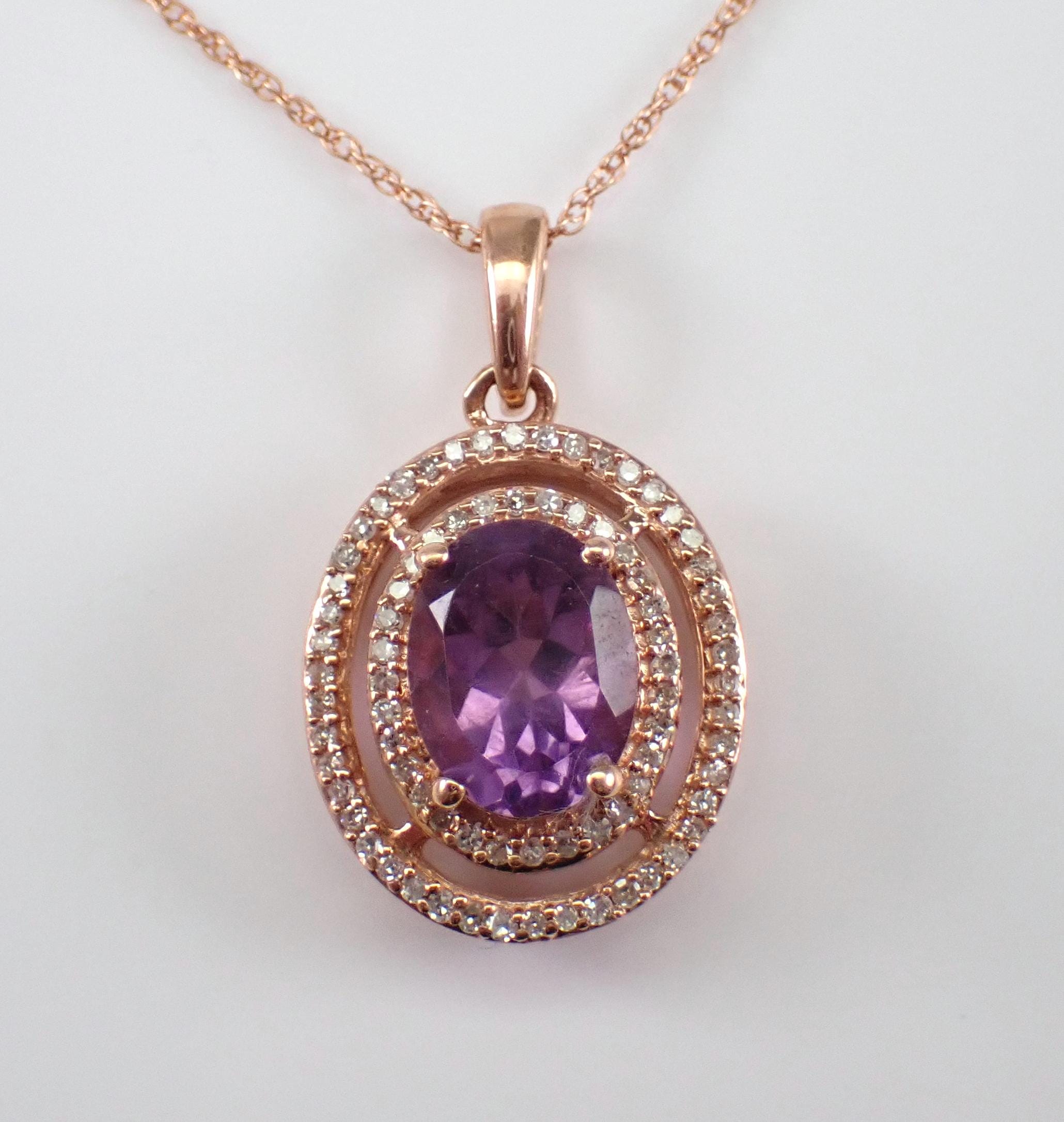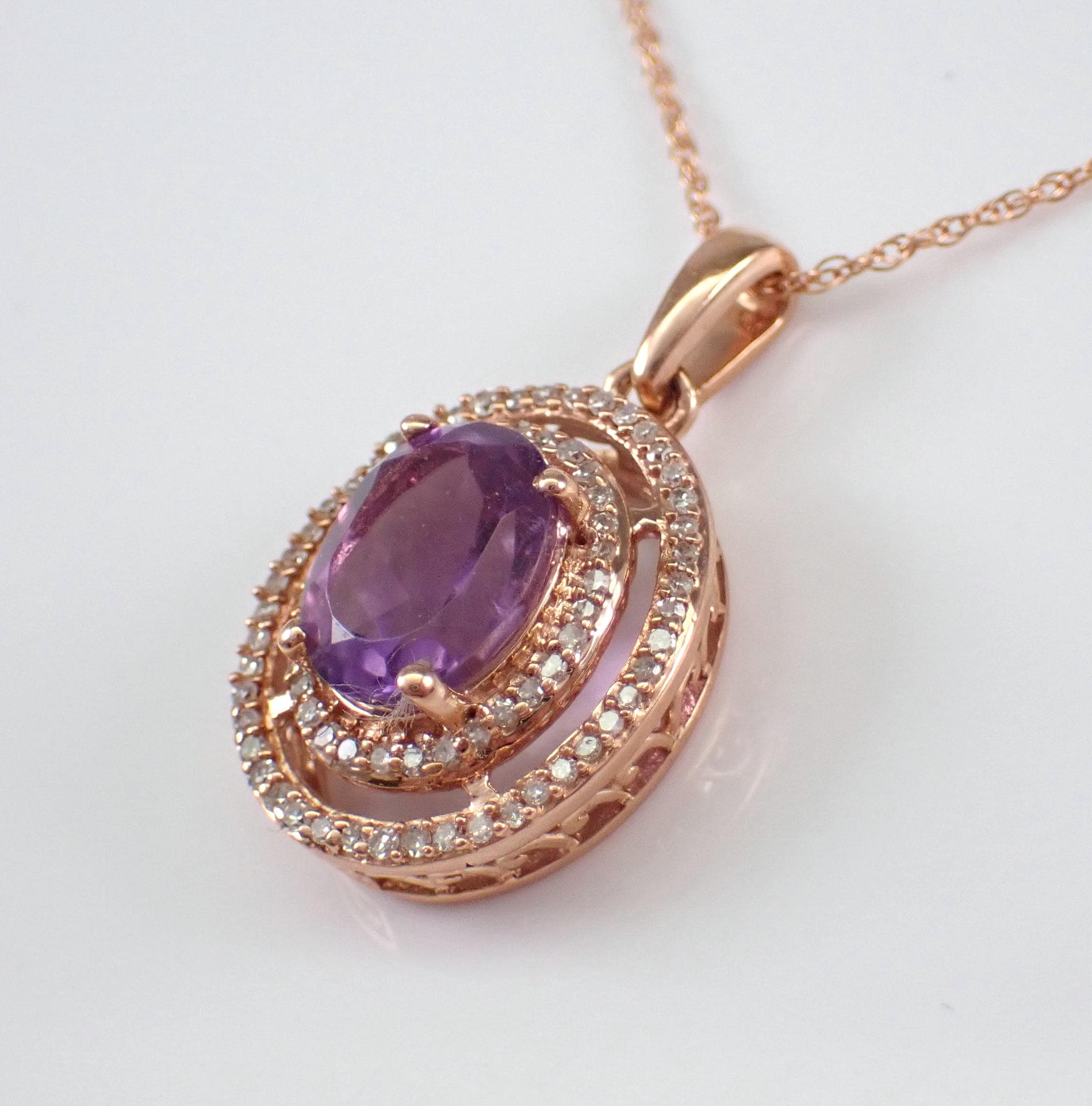 Rose Gold Diamond and Amethyst Necklace with Chain. This necklace is set with an Oval Amethyst and eighty-six natural Round Brilliant Diamonds. The Amethyst measures 8 X 6 mm and weighs 1 1/2 carats. The diamonds in this pendant are H color, SI/I1 clarity and weigh a total of .20 carat. The pendant is 10K Rose Gold and comes with an 18" 10K Rose Gold chain and together weigh 2.3 grams. The pendant measures 14 X 12 mm. This necklace will be accompanied by an appraisal written by a GIA Certified Diamond Grader with the retail replacement value of $1,389.00. I will ship this necklace promptly in a beautiful gift box.
