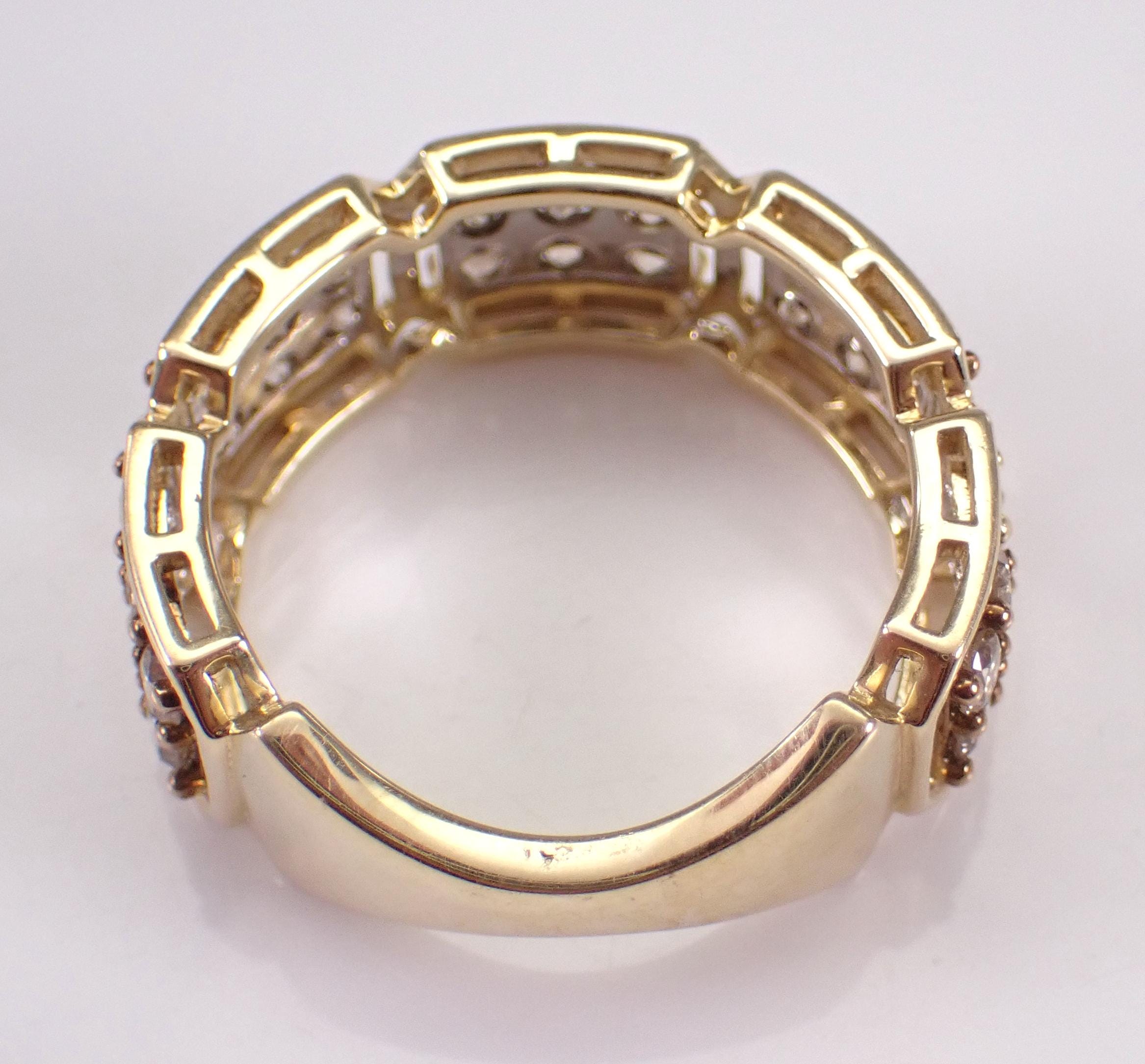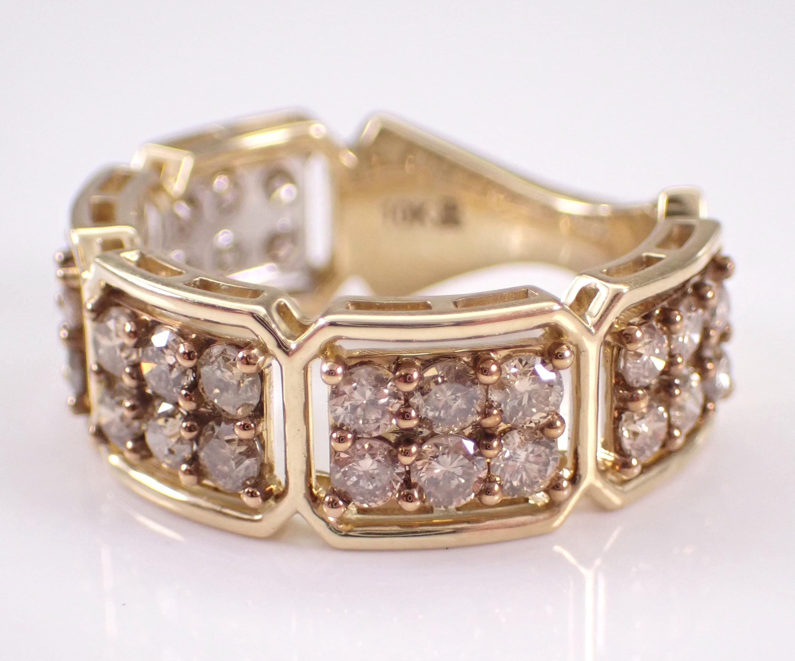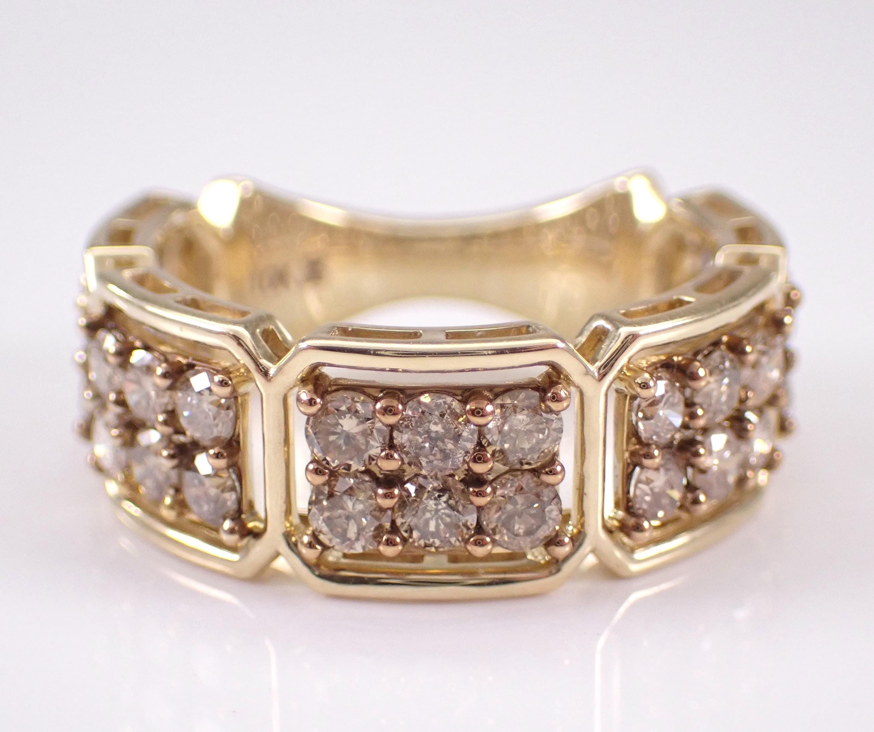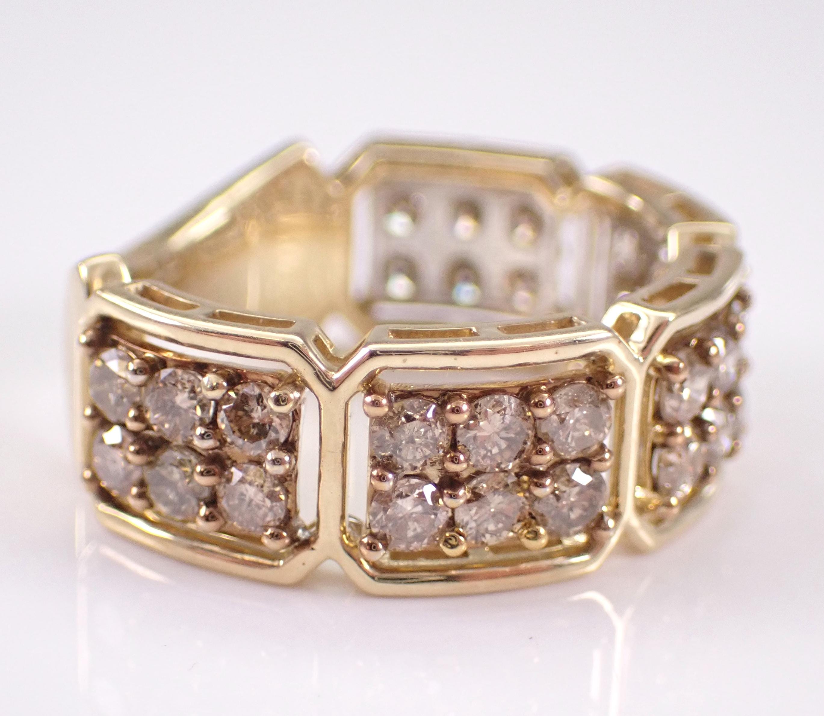 Yellow Gold Diamond Wedding Ring Anniversary Band. This ring is set with thirty Round Brilliant Diamonds. These diamonds are a light brown/Champagne color, SI/I clarity and weigh a total of 1.00 carat. This ring is 10KT Yellow Gold, weighs 4.8 grams, measures 8 mm in width and is a finger size 7, which can be resized free of charge (please inquire about sizing with the finger size you need). This ring will be accompanied by an appraisal written by a GIA Certified Diamond Grader with the retail replacement value of $2,995.00. I will ship this ring promptly in a beautiful gift box.