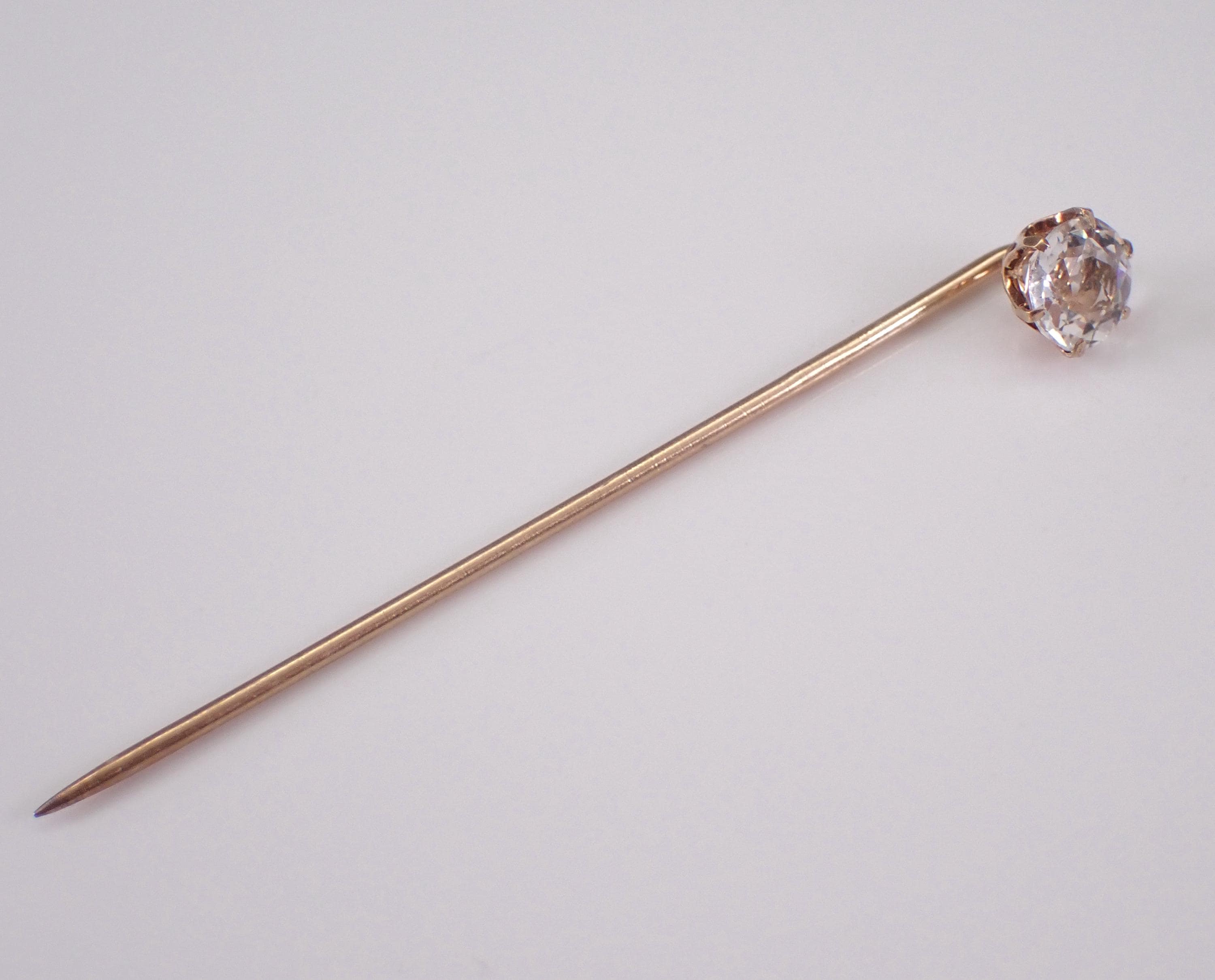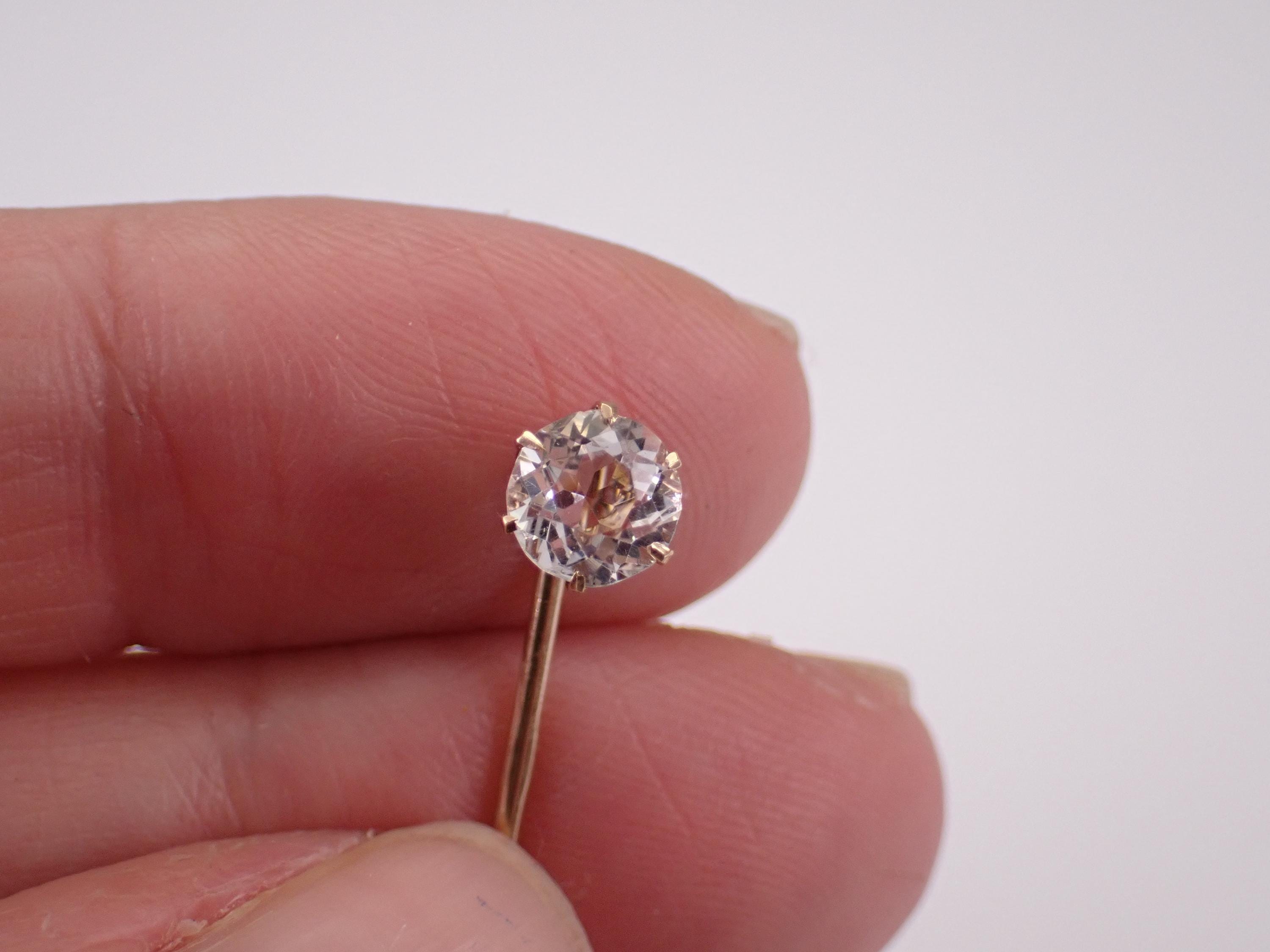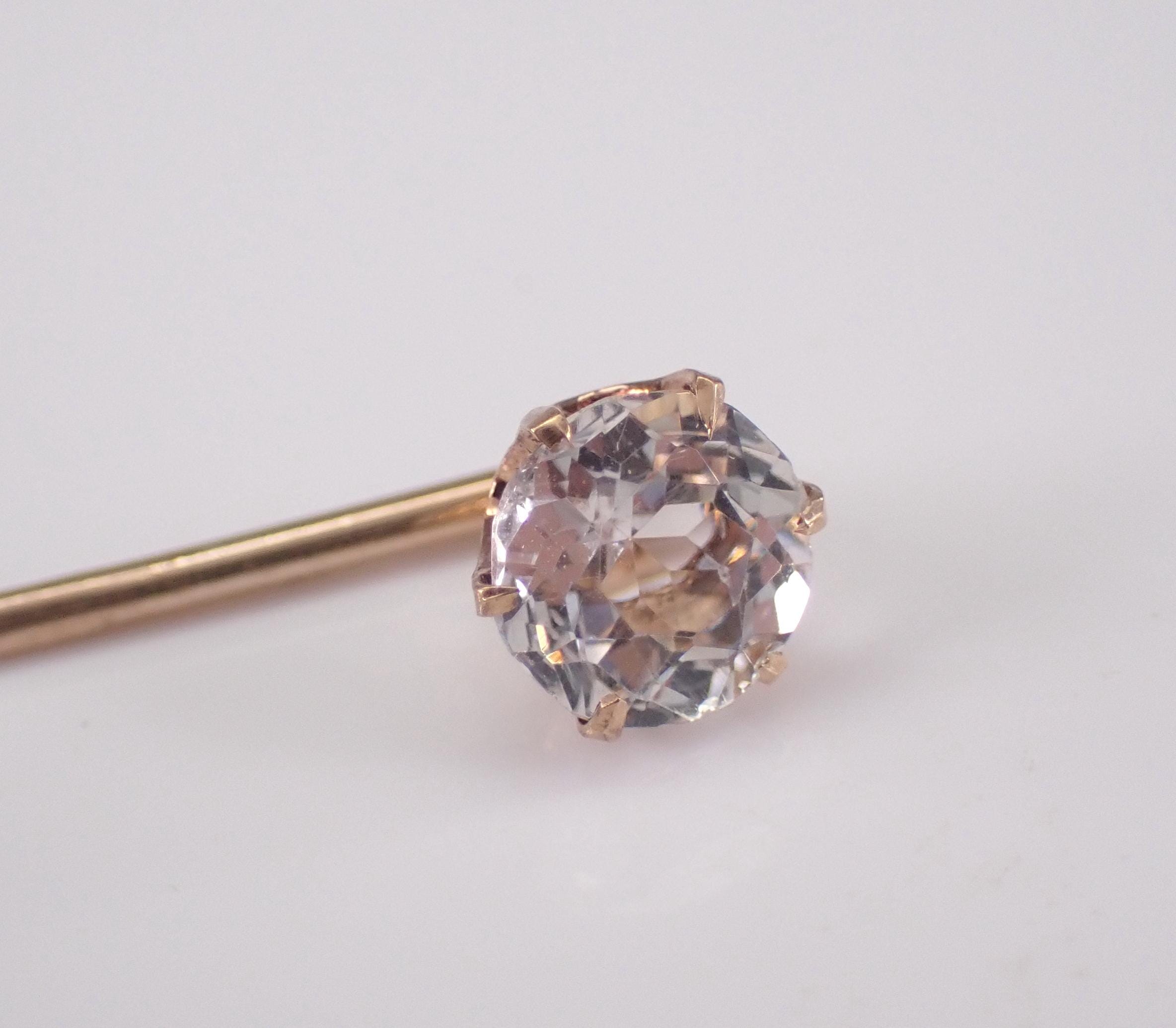 Yellow Gold Vintage Cubic Zirconia Stick Pin. This pin is made of 10KT Yellow Gold and weighs .9 grams. The Cubic Zirconia measures 5.5 mm in diameter. I will ship this pin promptly in a beautiful gift box.