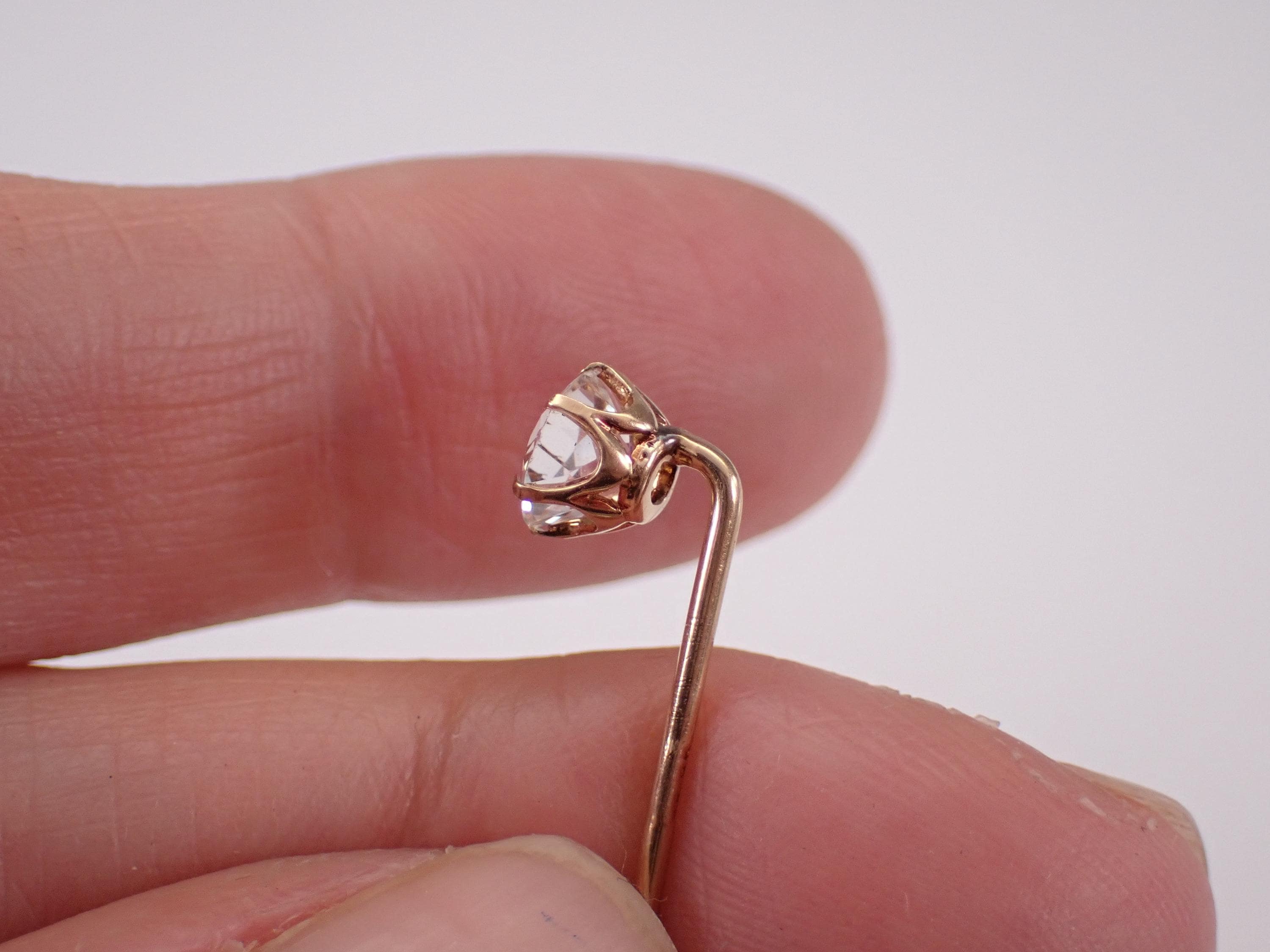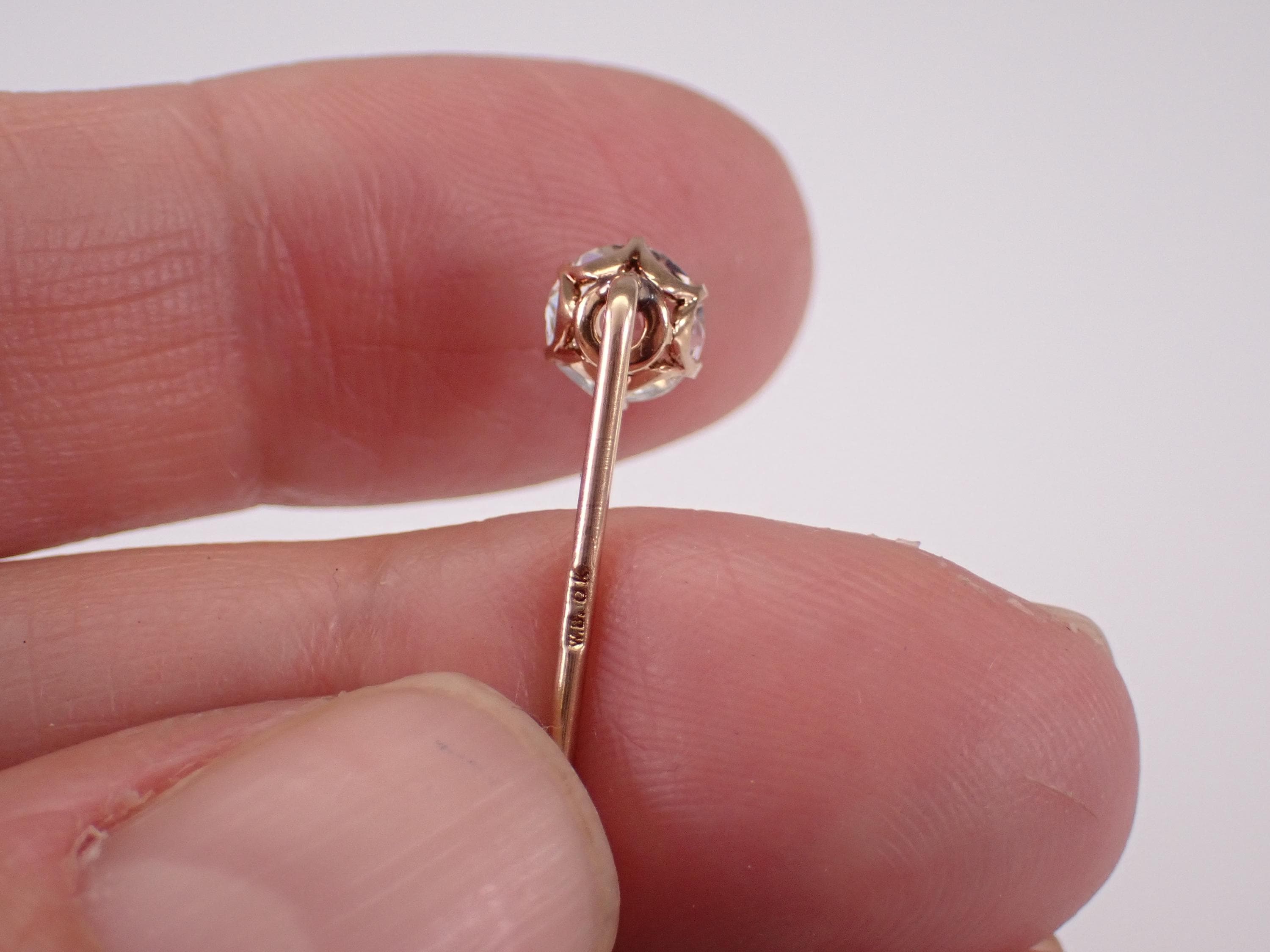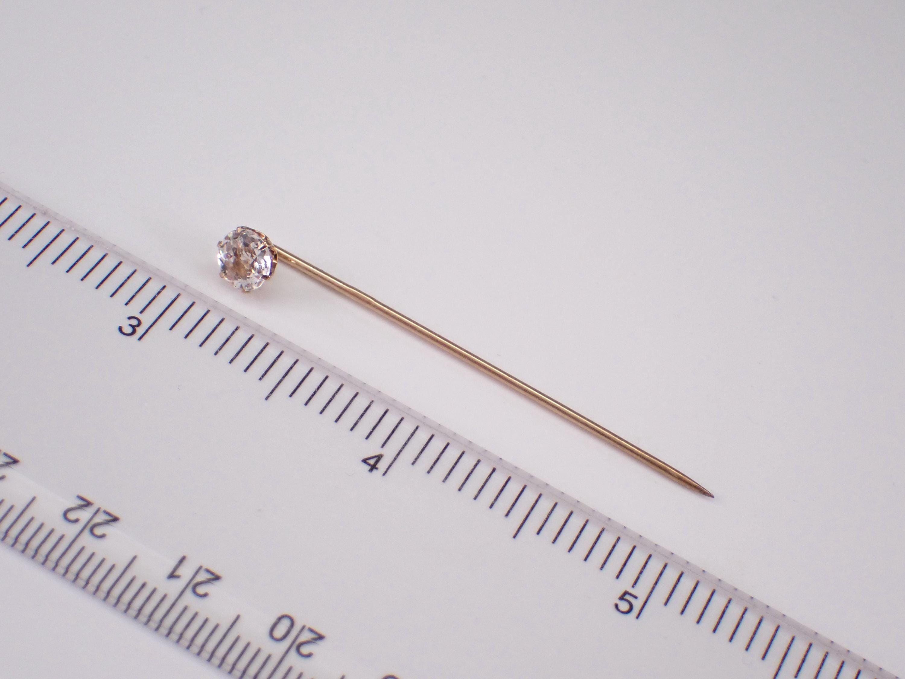 Yellow Gold Vintage Cubic Zirconia Stick Pin. This pin is made of 10KT Yellow Gold and weighs .9 grams. The Cubic Zirconia measures 5.5 mm in diameter. I will ship this pin promptly in a beautiful gift box.