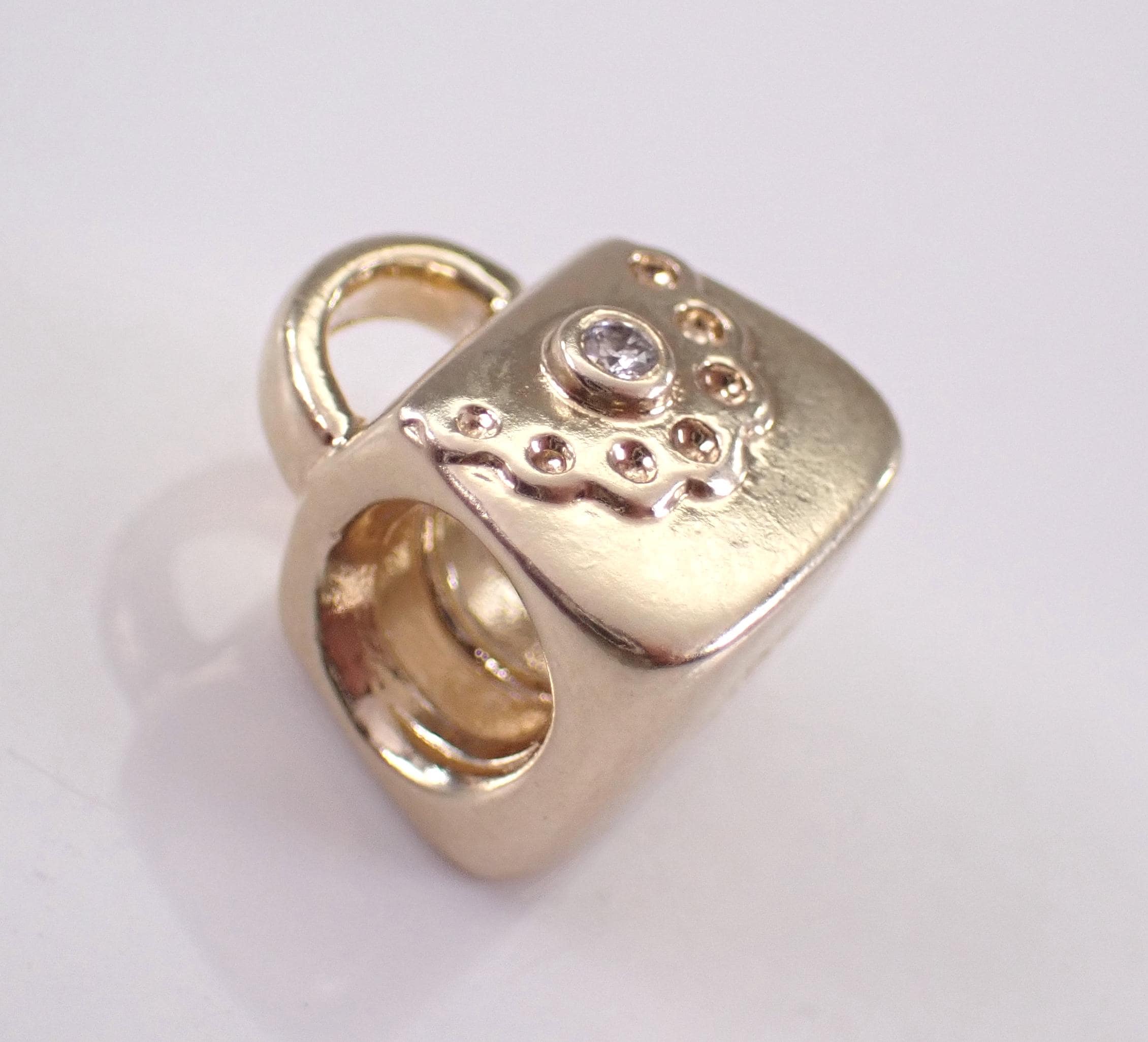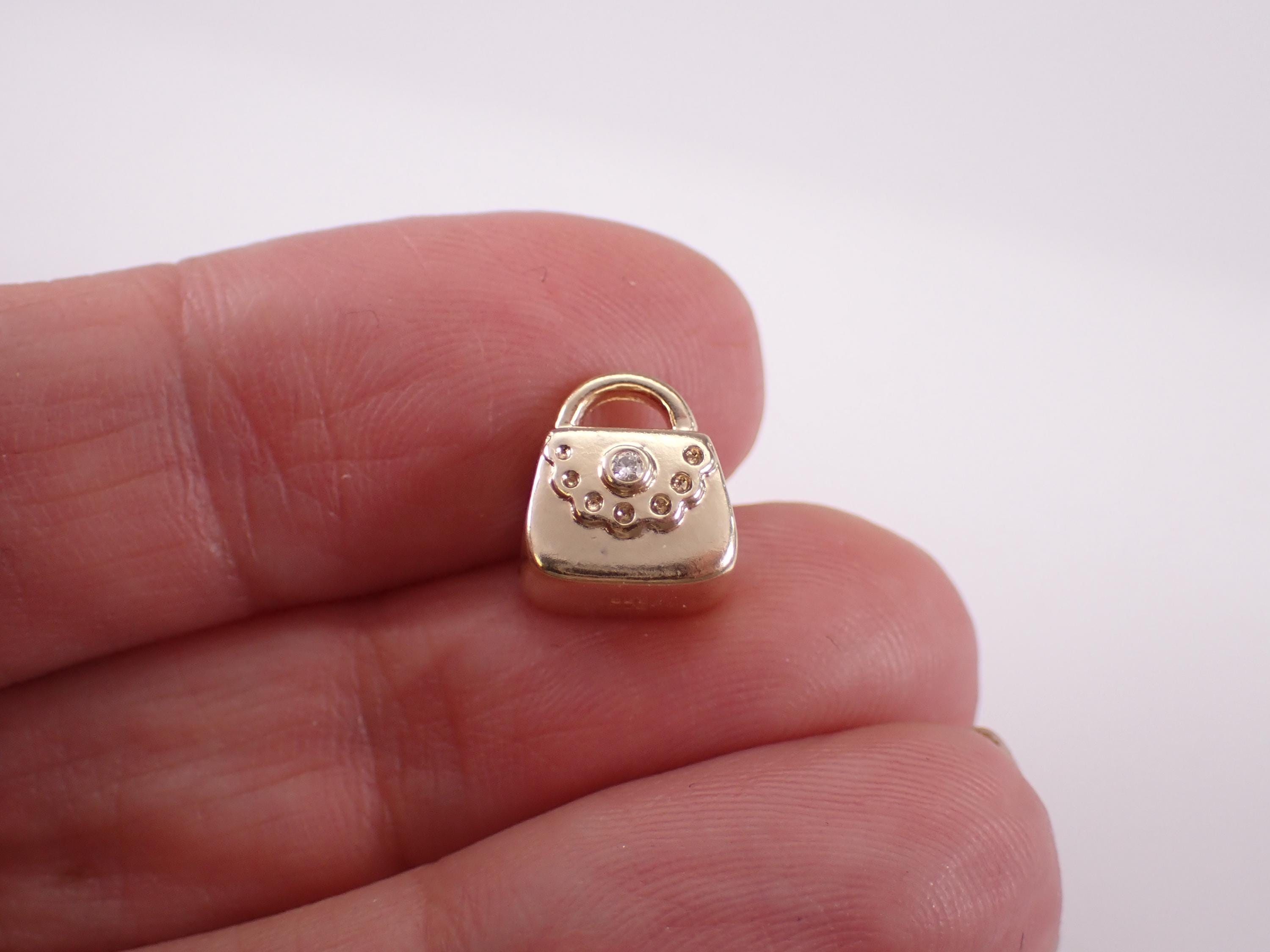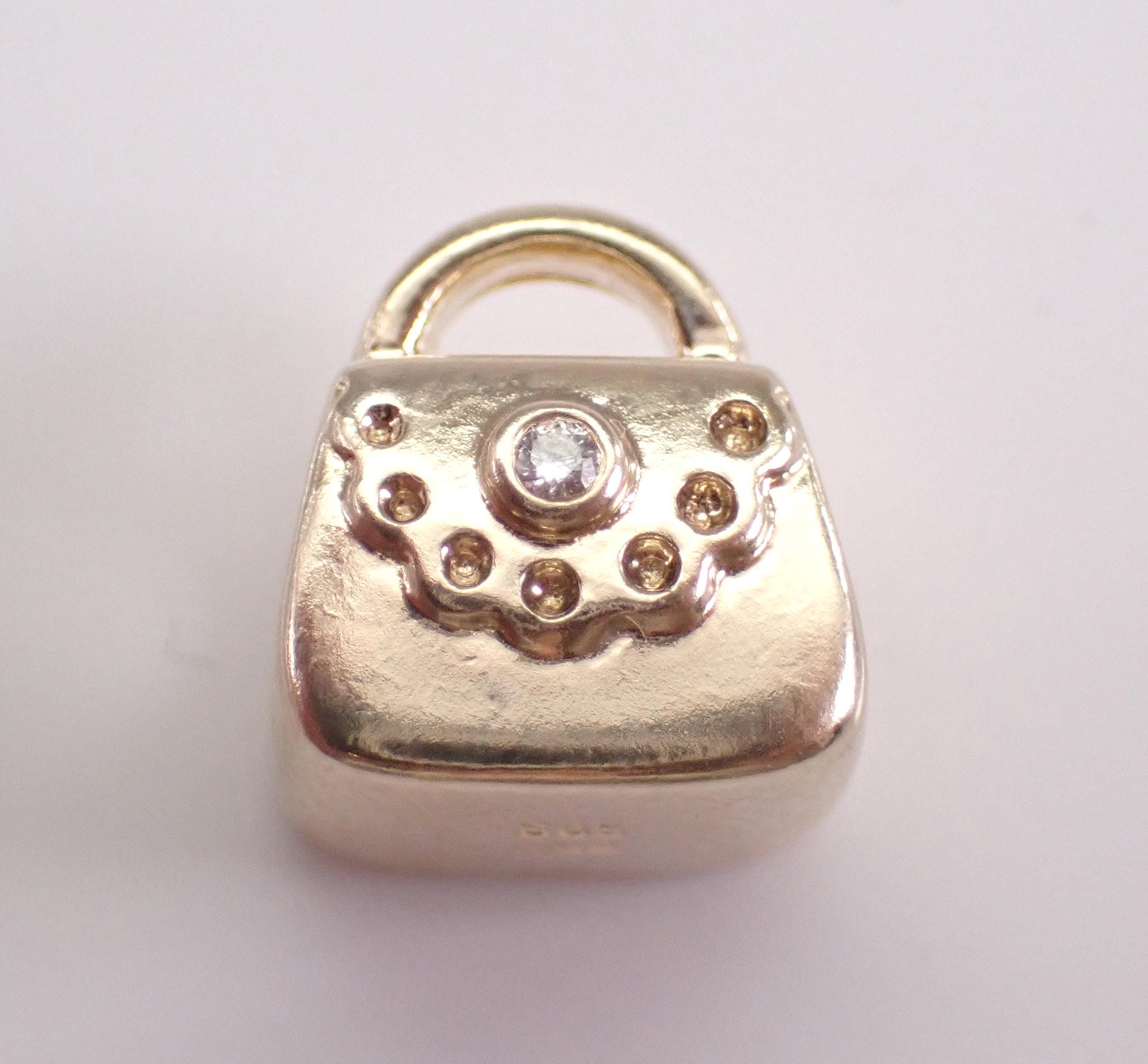 1. Pandora 14K Yellow Gold Diamond Purse Charm (retired). This charm is set with one genuine diamond. This charm weighs 3.7 grams and measures 9 X 7 mm without the handle.