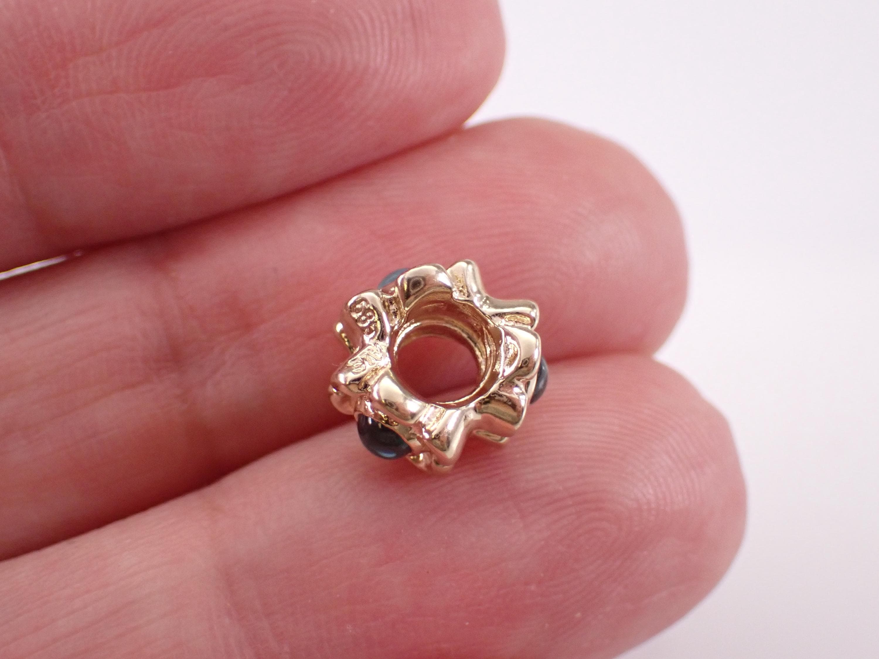 2. Pandora 14K Yellow Gold Blue Topaz Flower Spacer Charm (retired). This charm weighs 2.7 grams, measures 9 mm in diameter and 7 mm in width.