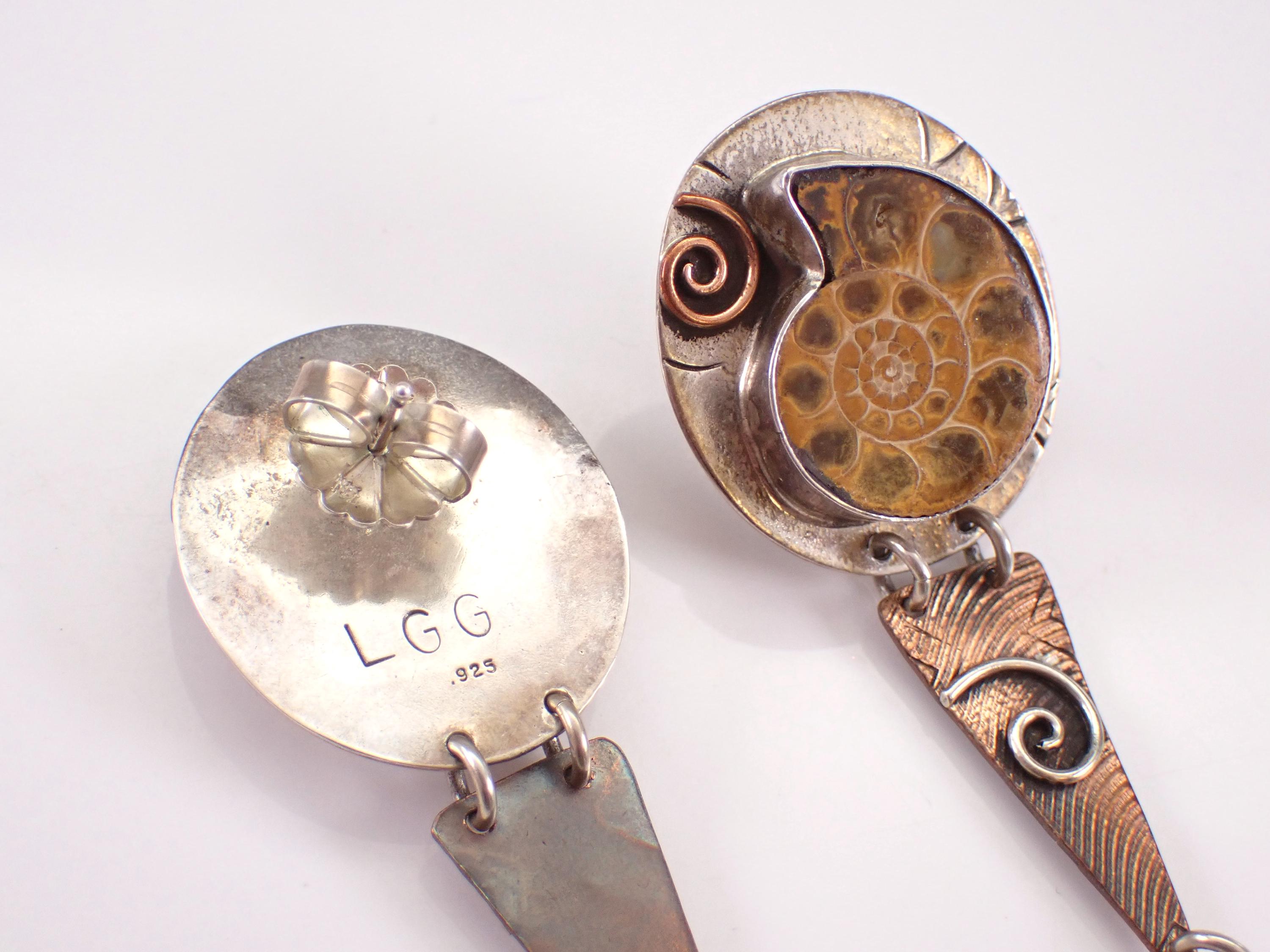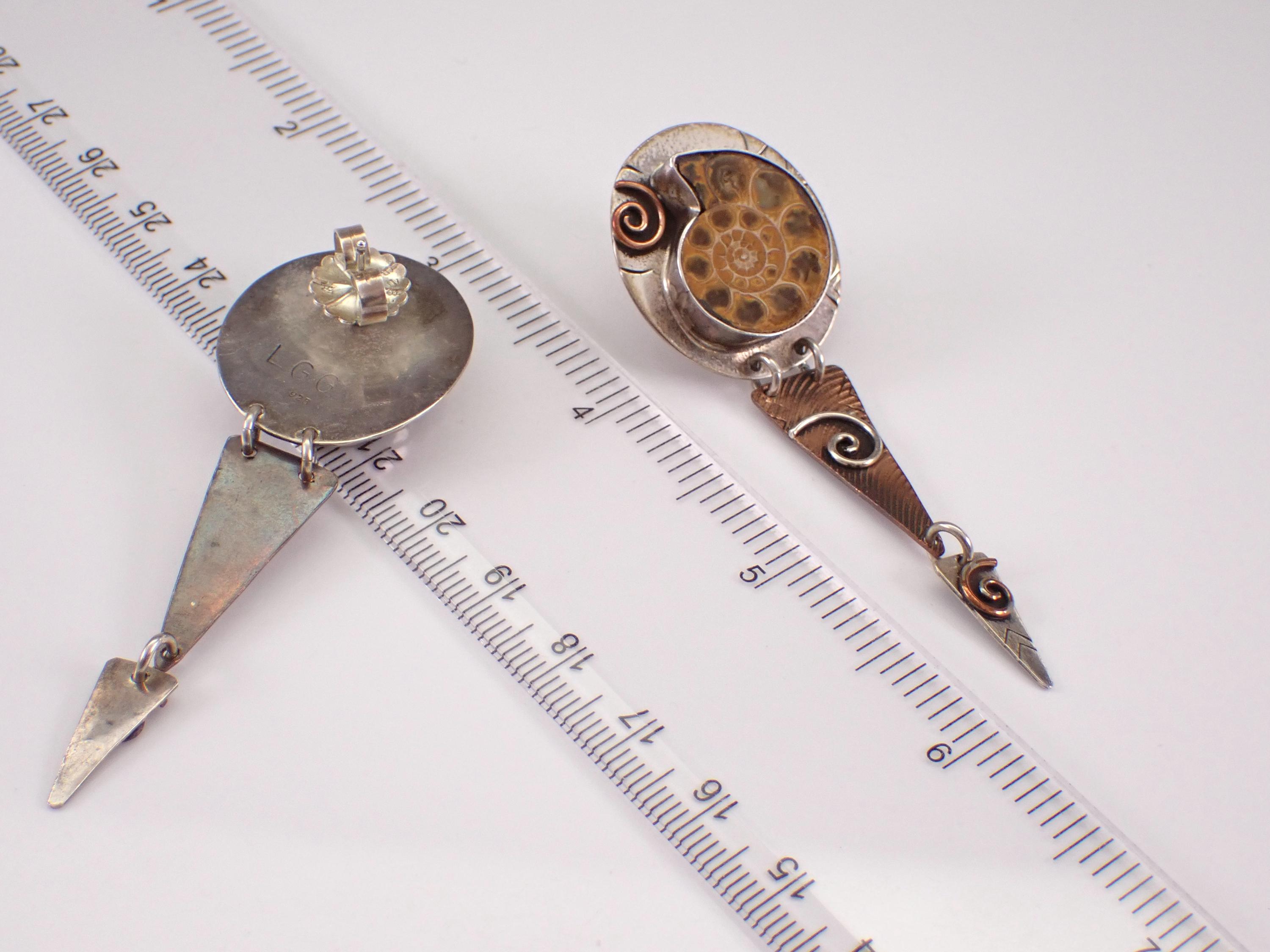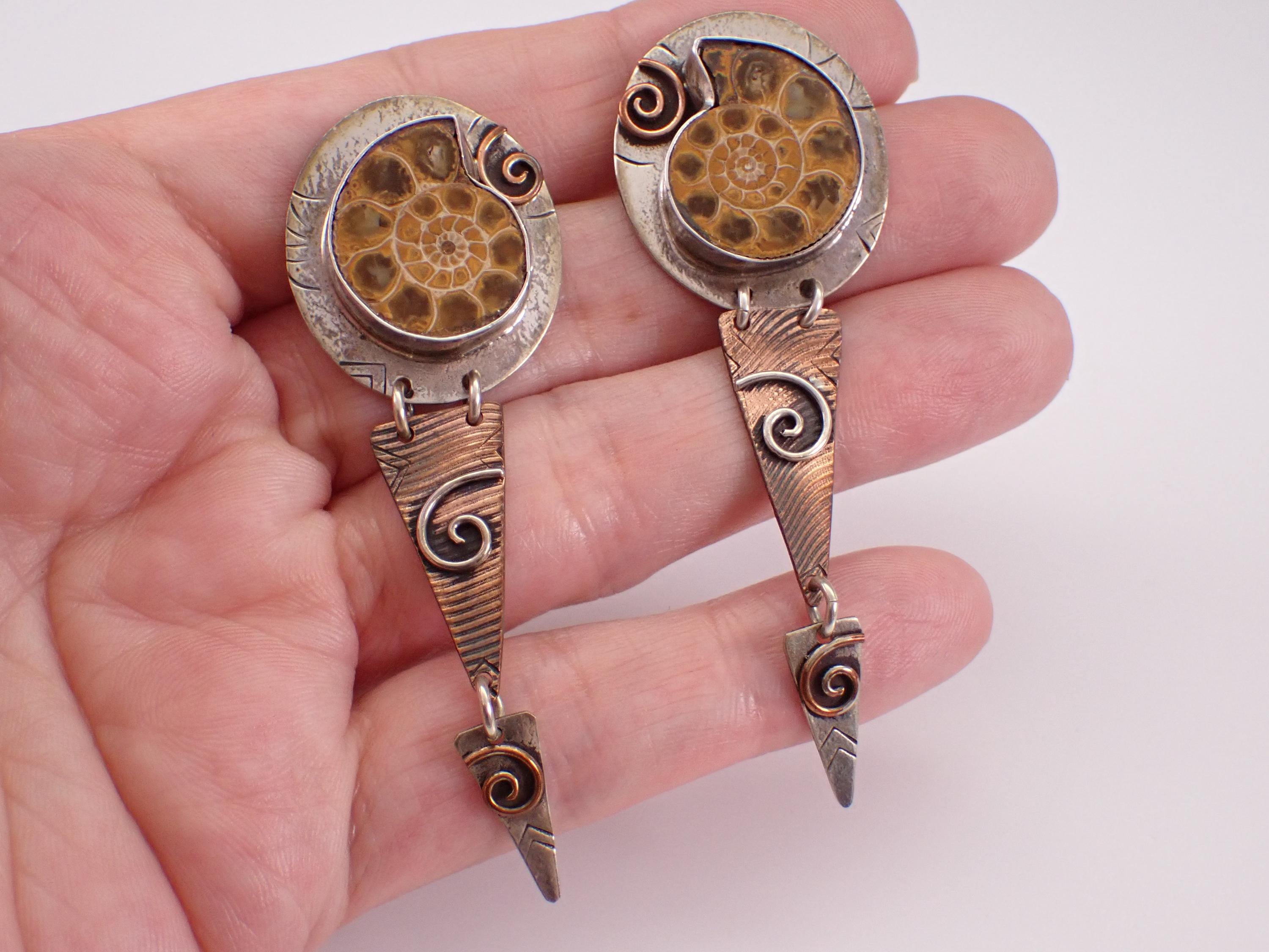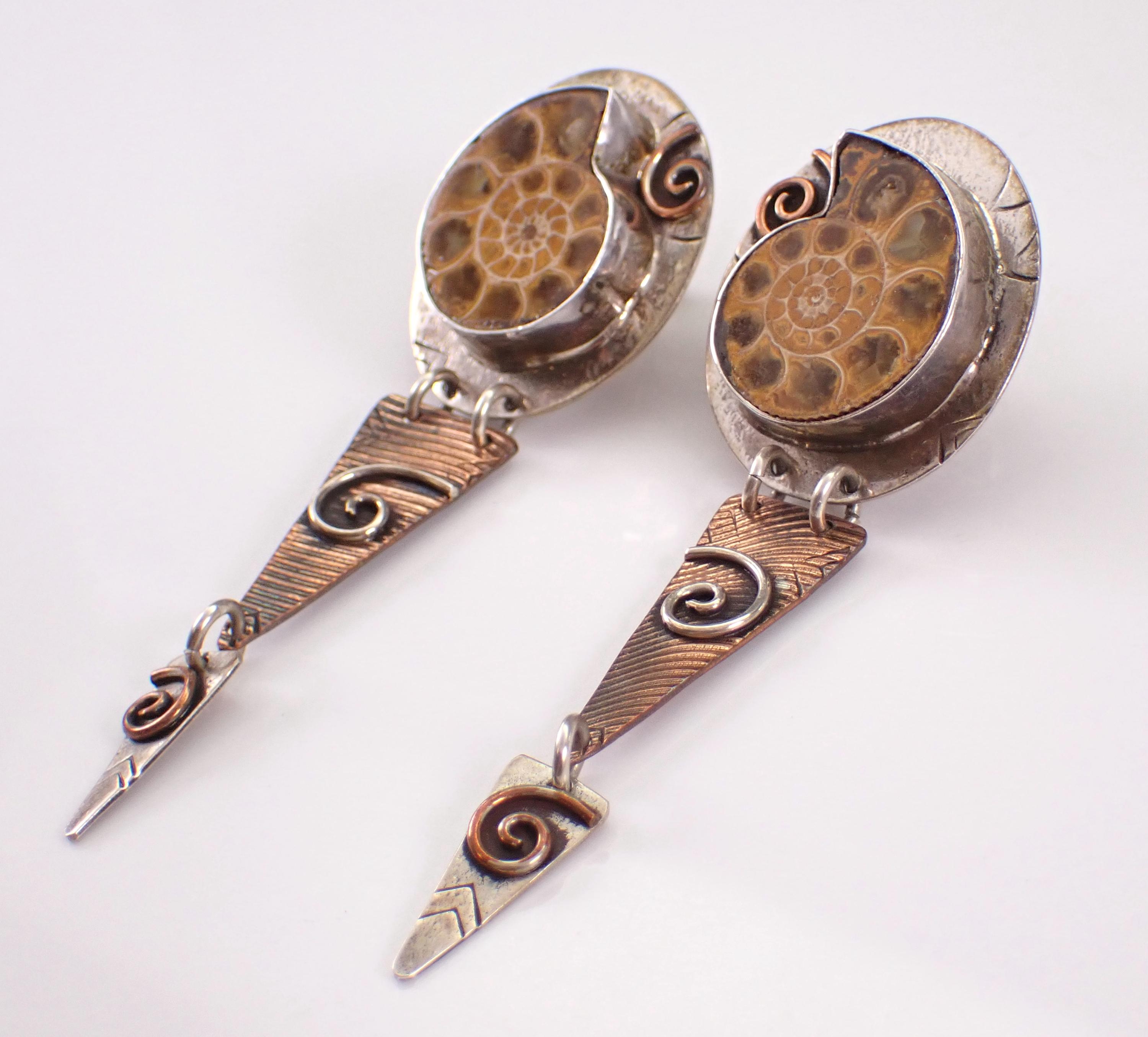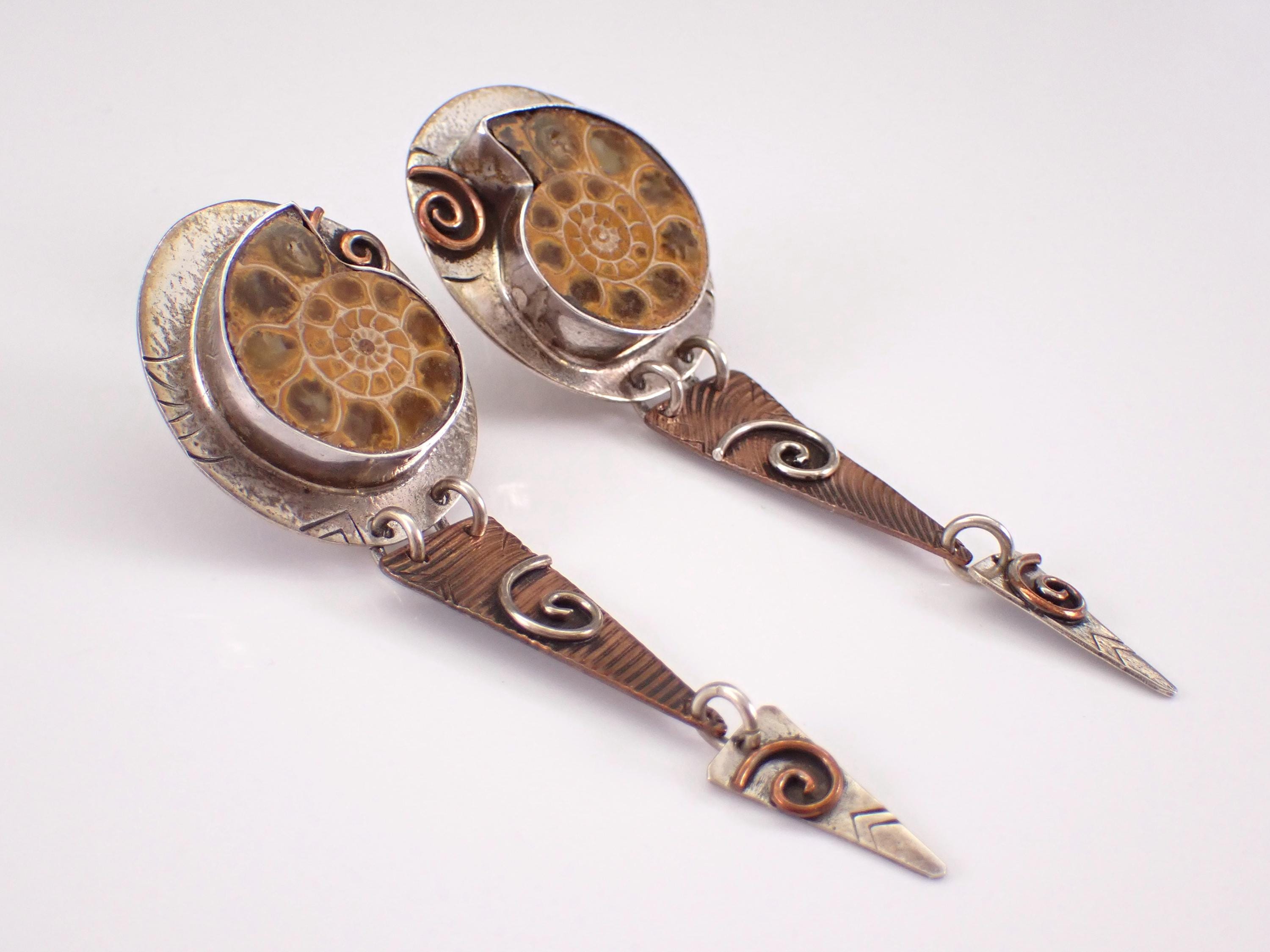 Vintage Langman Gallery sterling silver Ammonite Fossil Shell Earrings. These earrings are set with Ammonite Fossils. These earrings measures 70 mm in length (2 3/4") and weigh a total of 15.0 grams. These earrings have large friction post backings for pierced ears. These earrings are made of Sterling Silver and Copper. These earrings will be shipped promptly in a gift pouch.
