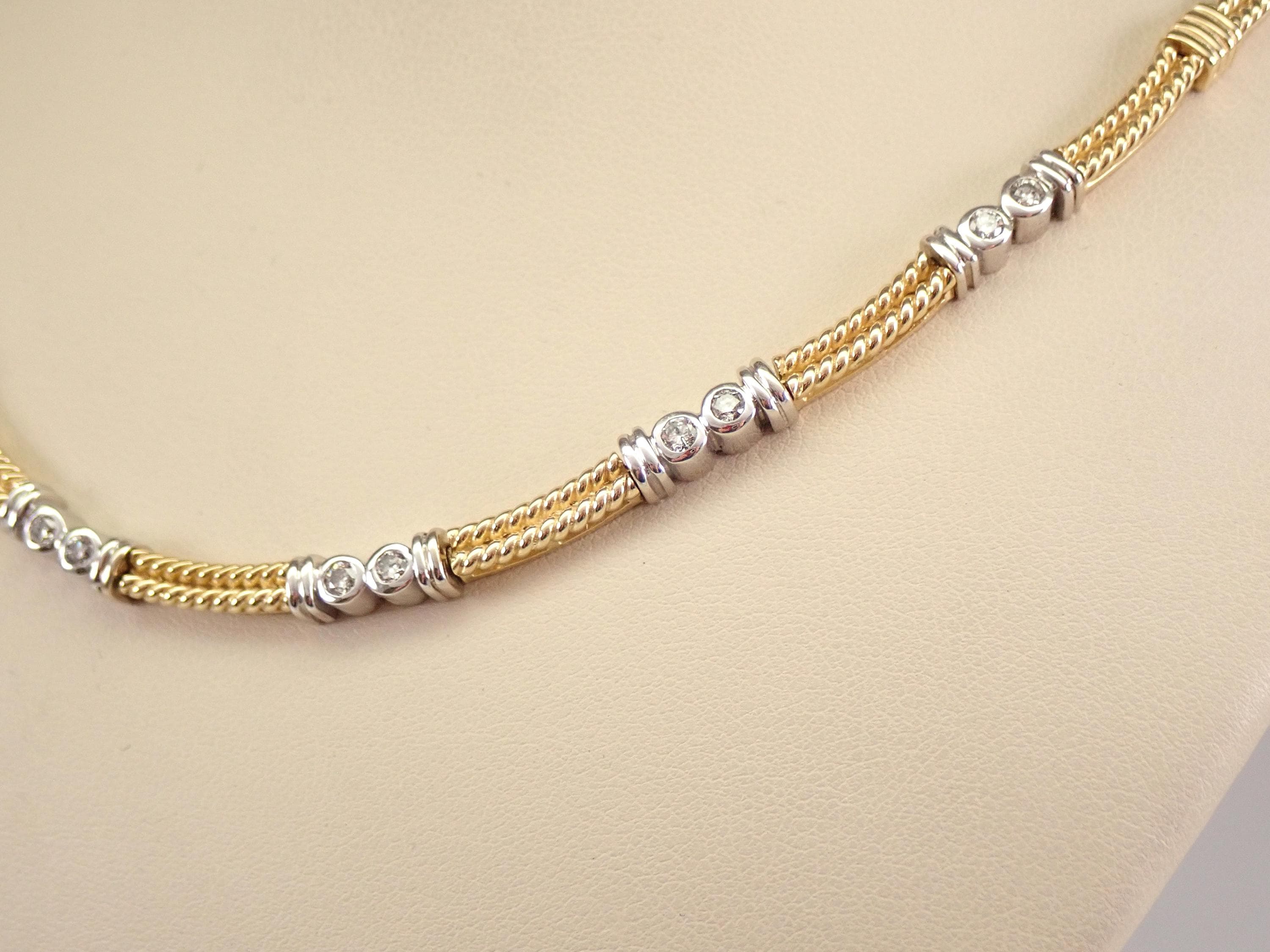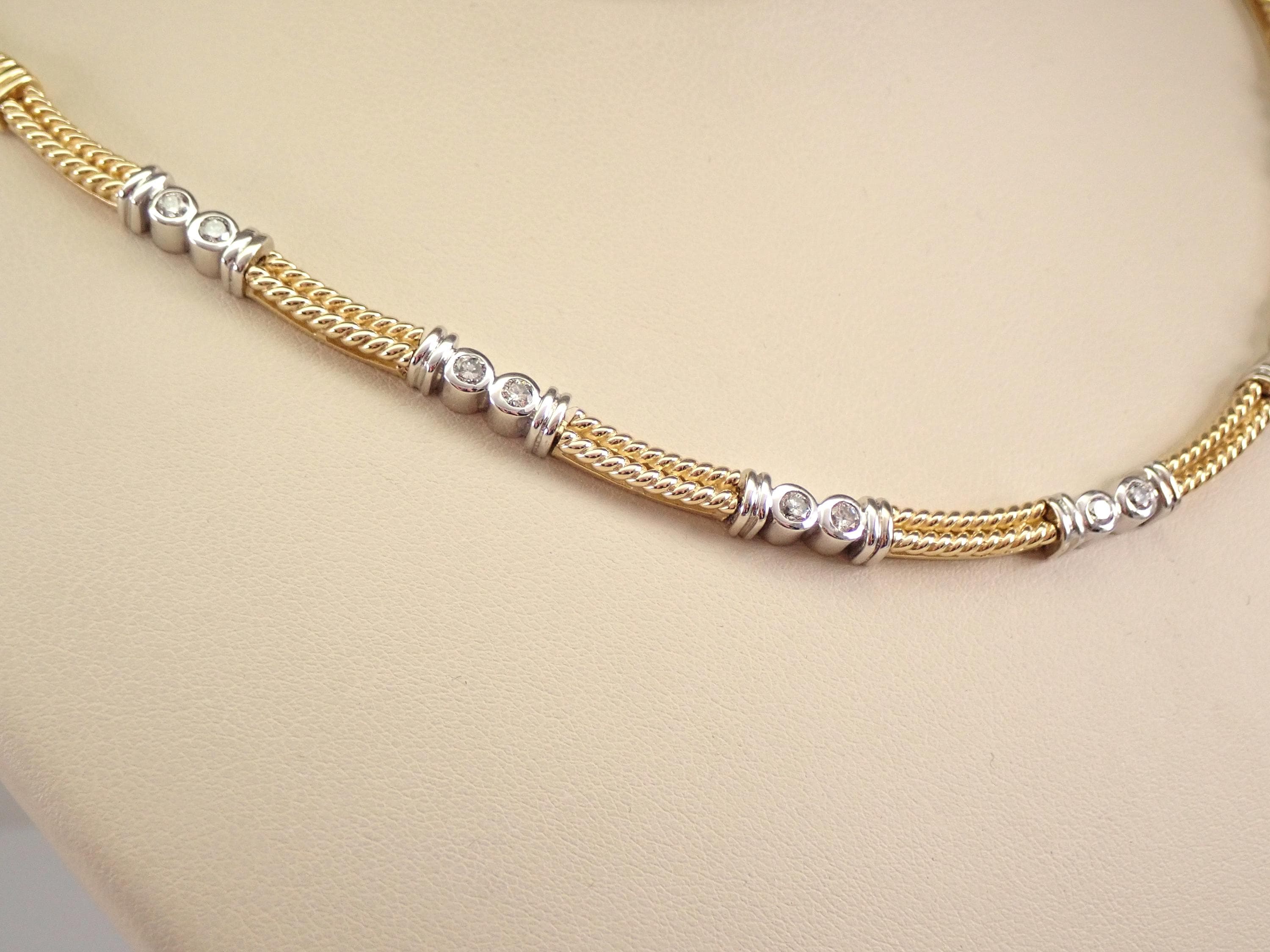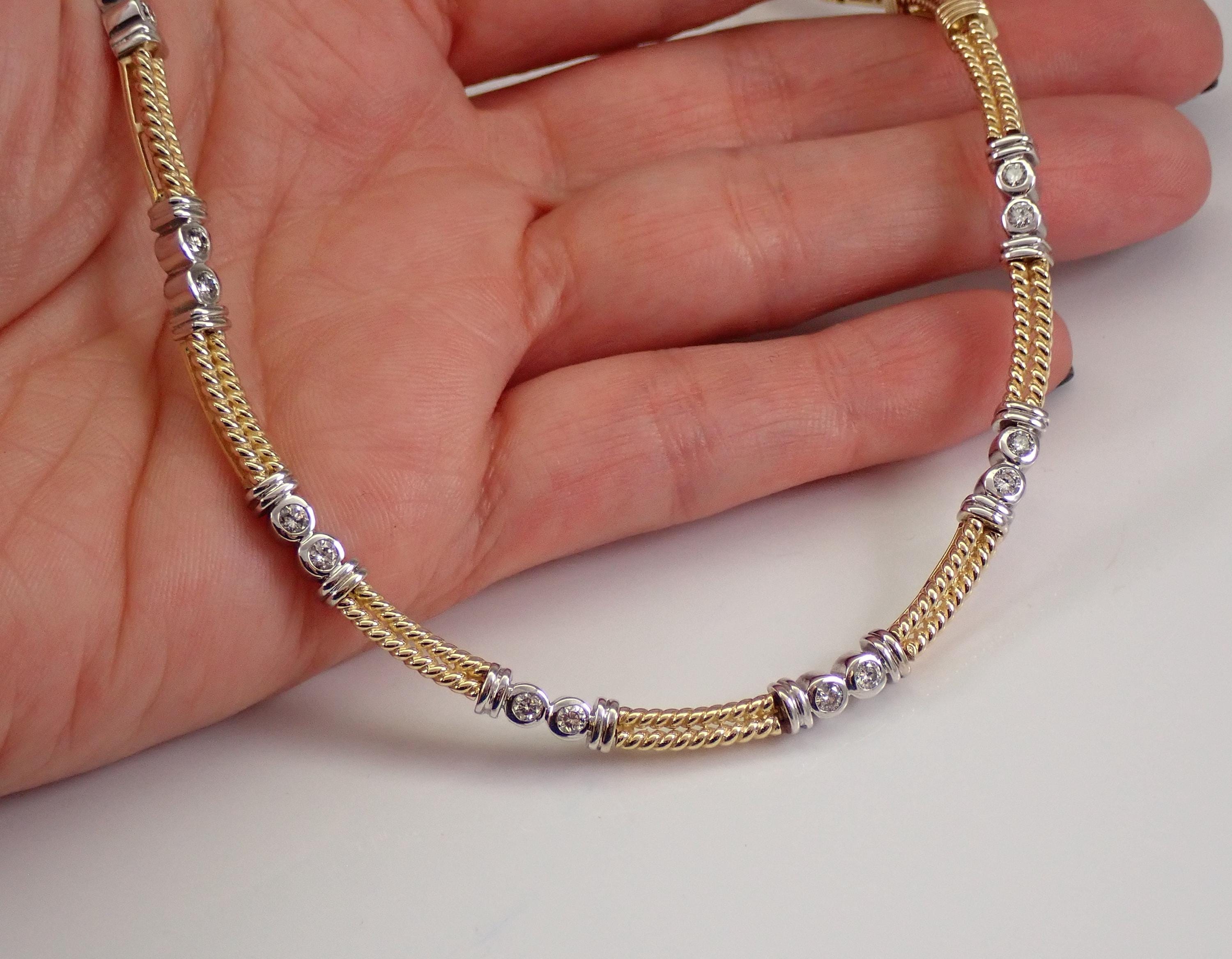 14K Yellow and White Gold Vintage Diamond Necklace. This necklace is set with fourteen genuine natural Round Brilliant Diamonds. These diamonds are H color, SI clarity and weigh a total of .70 carat. This necklace is 14KT Yellow and White Gold and measures 17" in length. This necklace weighs 35.9 grams and will be accompanied by an appraisal by a GIA Certified Diamond Grader with the replacement value of $9,895.00. I will ship this pin promptly in a beautiful gift box.