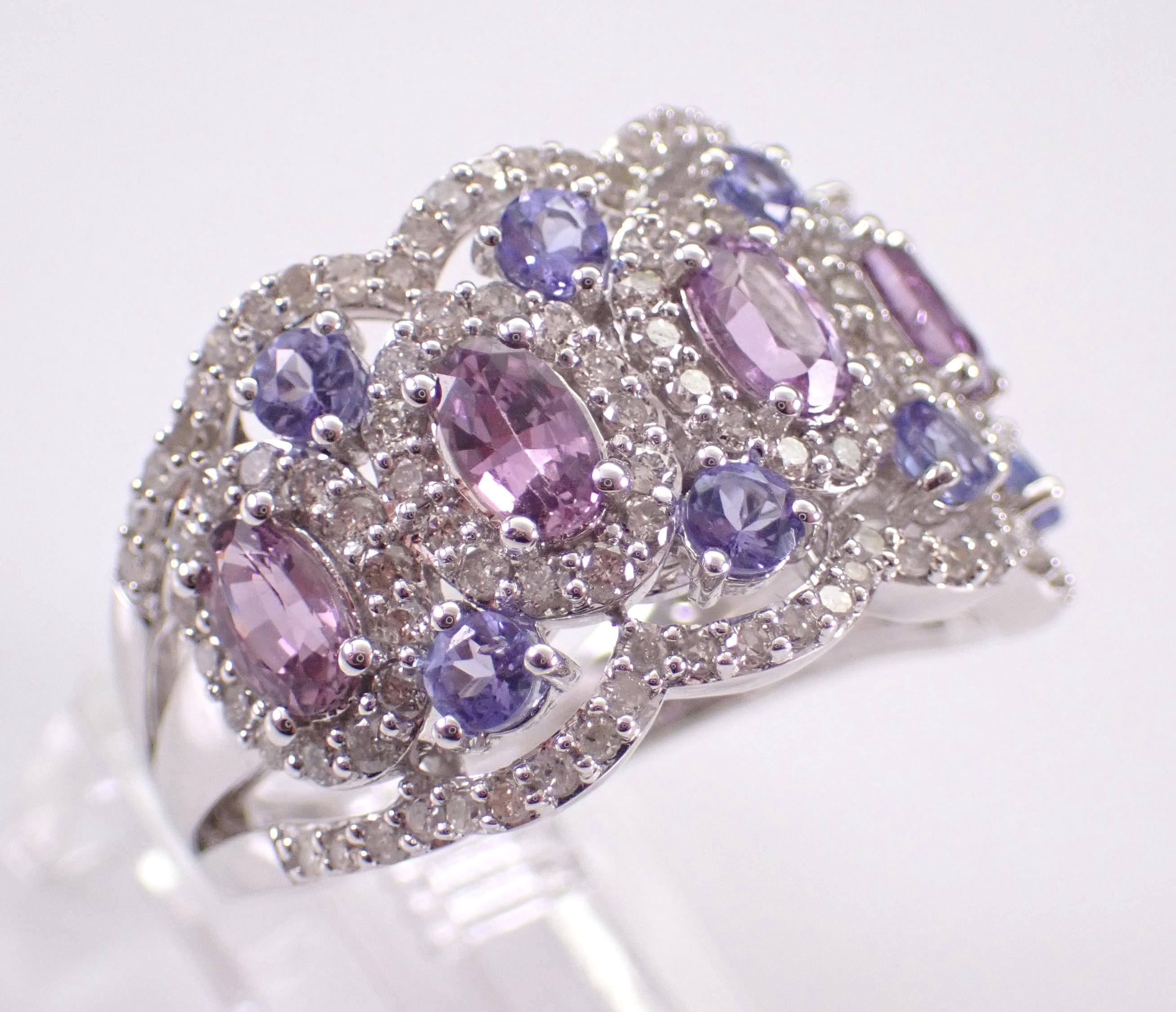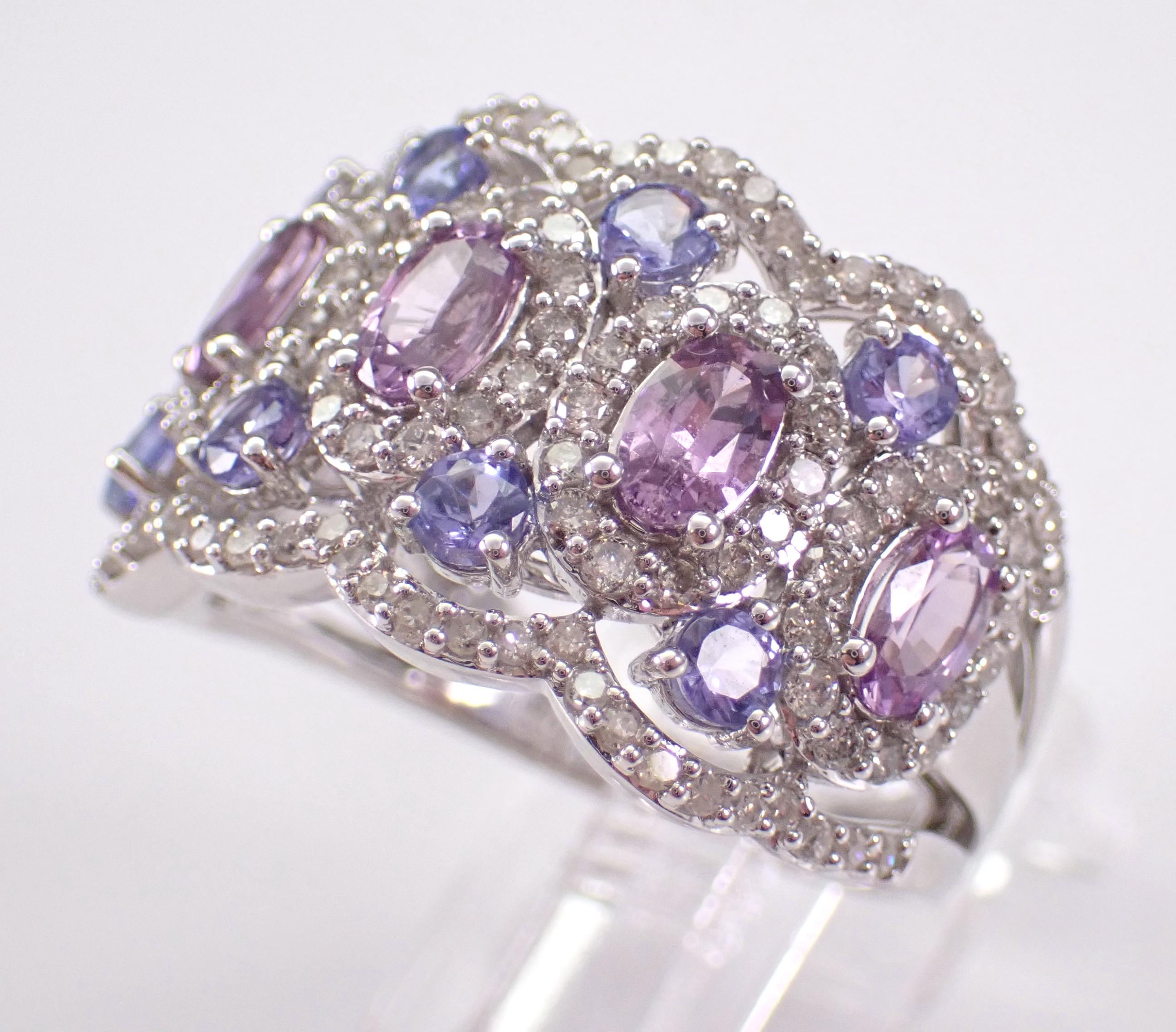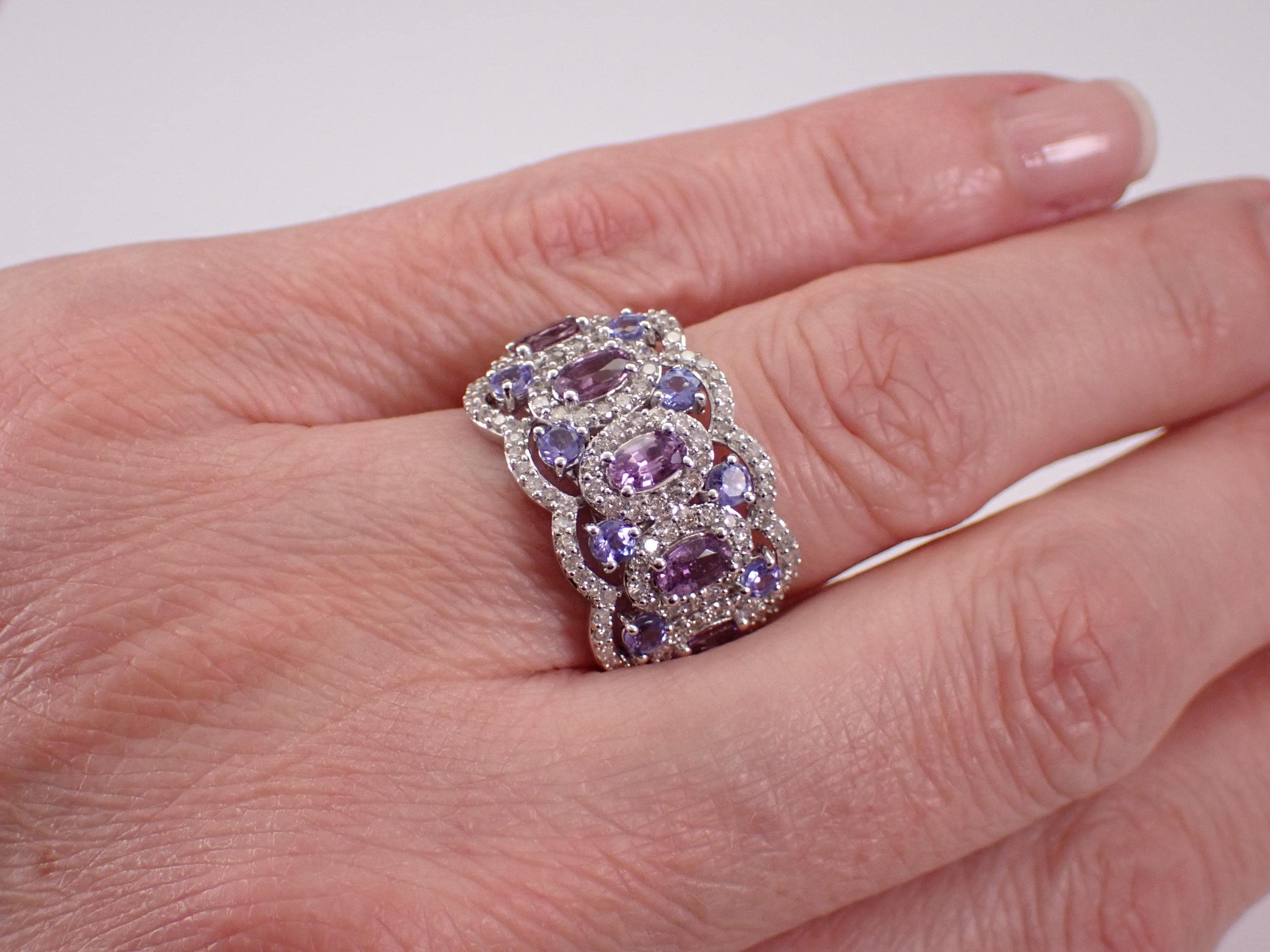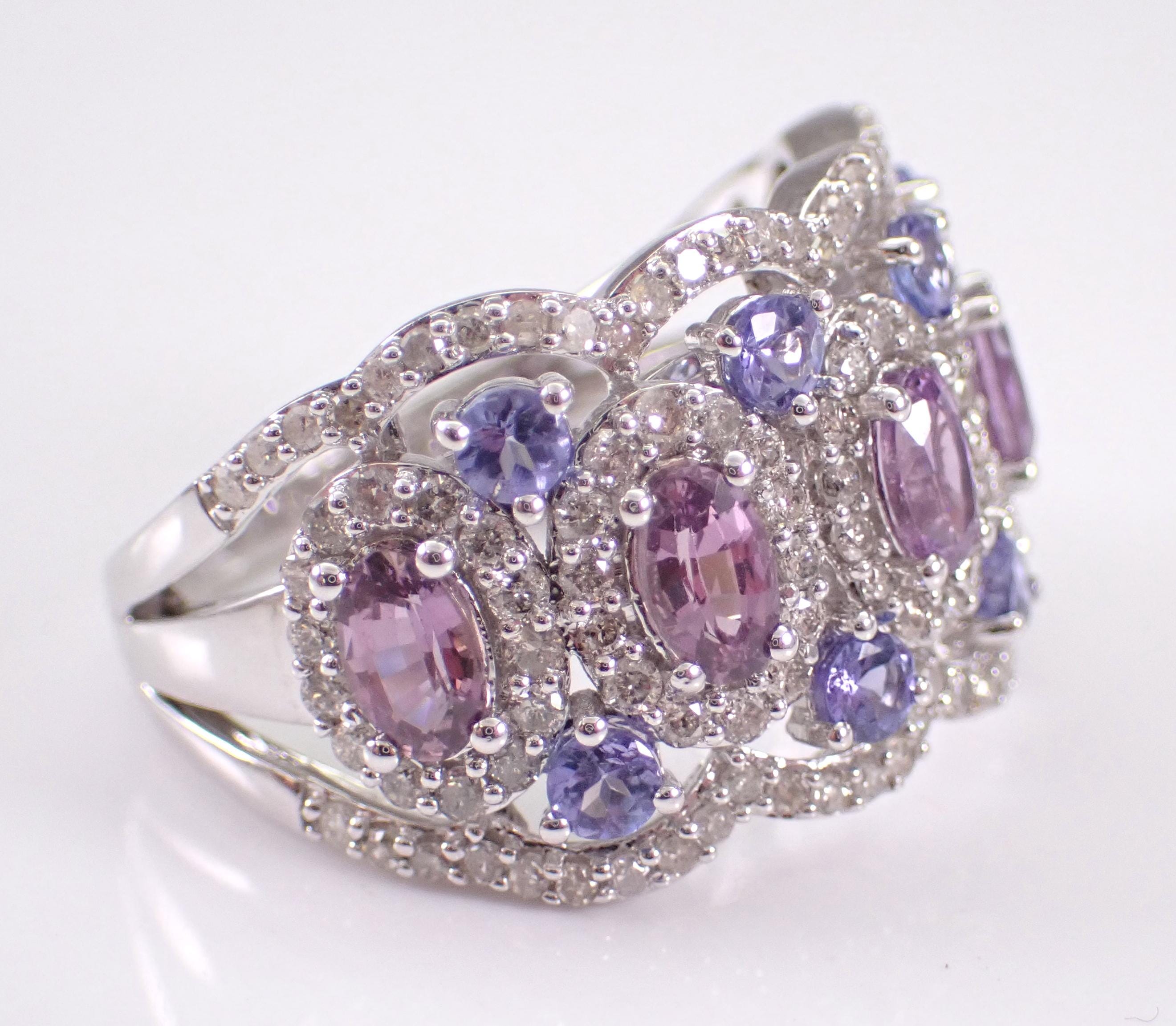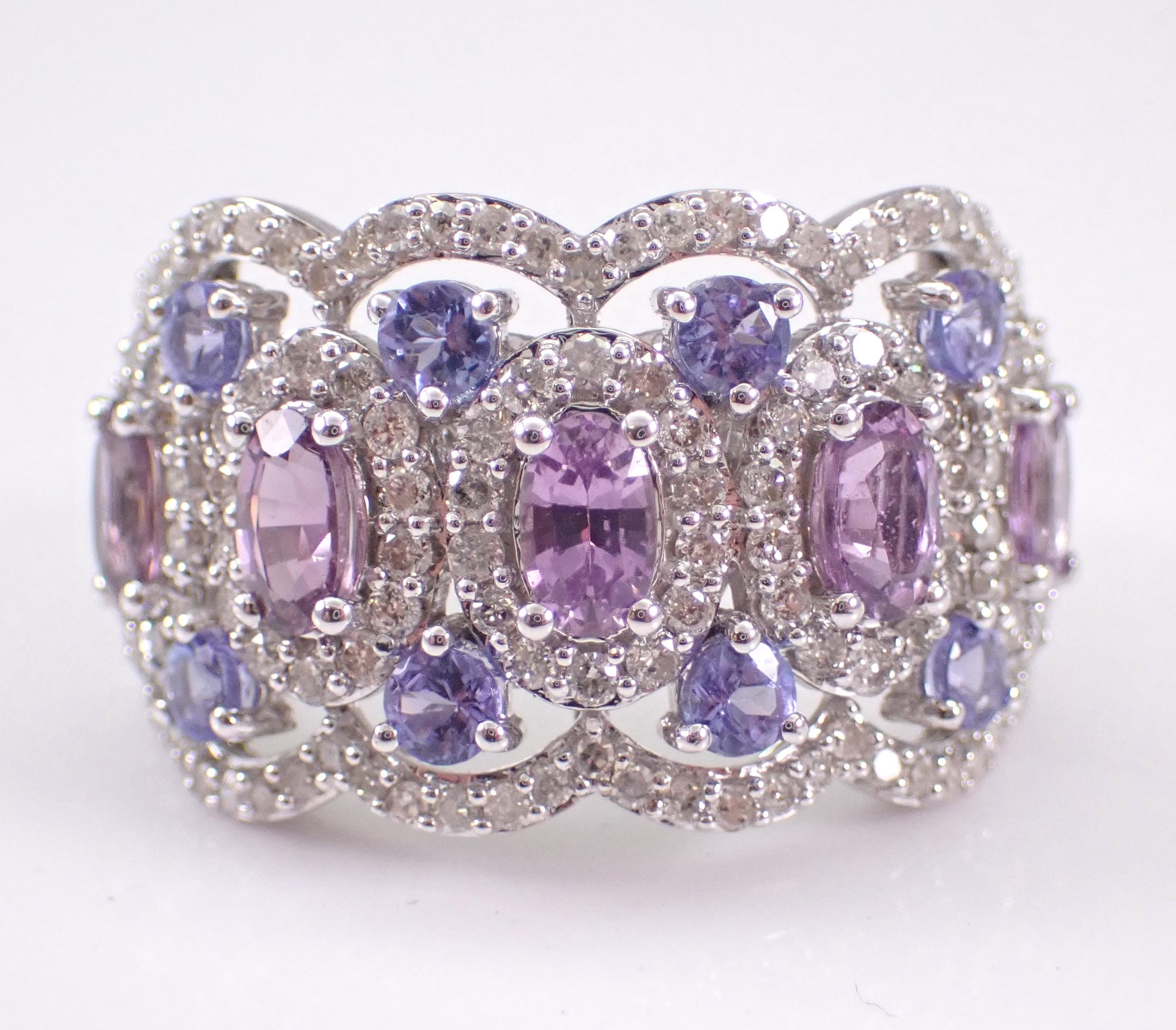 14K White Gold Diamond, Tanzanite and Amethyst Anniversary Ring. This ring is set with five genuine Oval Amethysts, eight Round Tanzanite and one hundred and thirty-two (132) natural Round Brilliant Diamonds. These diamonds are H color, SI/I1 clarity and weigh a total of 1.02 carat. The Tanzanite are a beautiful lilac color and weigh a total of 1/2 carat. The Amethysts measure 4 X 3 mm and weigh a total of 1 3/4 carats. This ring is solid 14KT White Gold, weighs 6.2 grams, measures 14 mm in width at its widest and is a finger size 7, which is resizable free of charge (please inquire about sizing with the finger size you need). The ring will be accompanied by an appraisal by a GIA Certified Diamond Grader with the retail replacement value of $3,695.00. I will ship this ring promptly in a gift box.