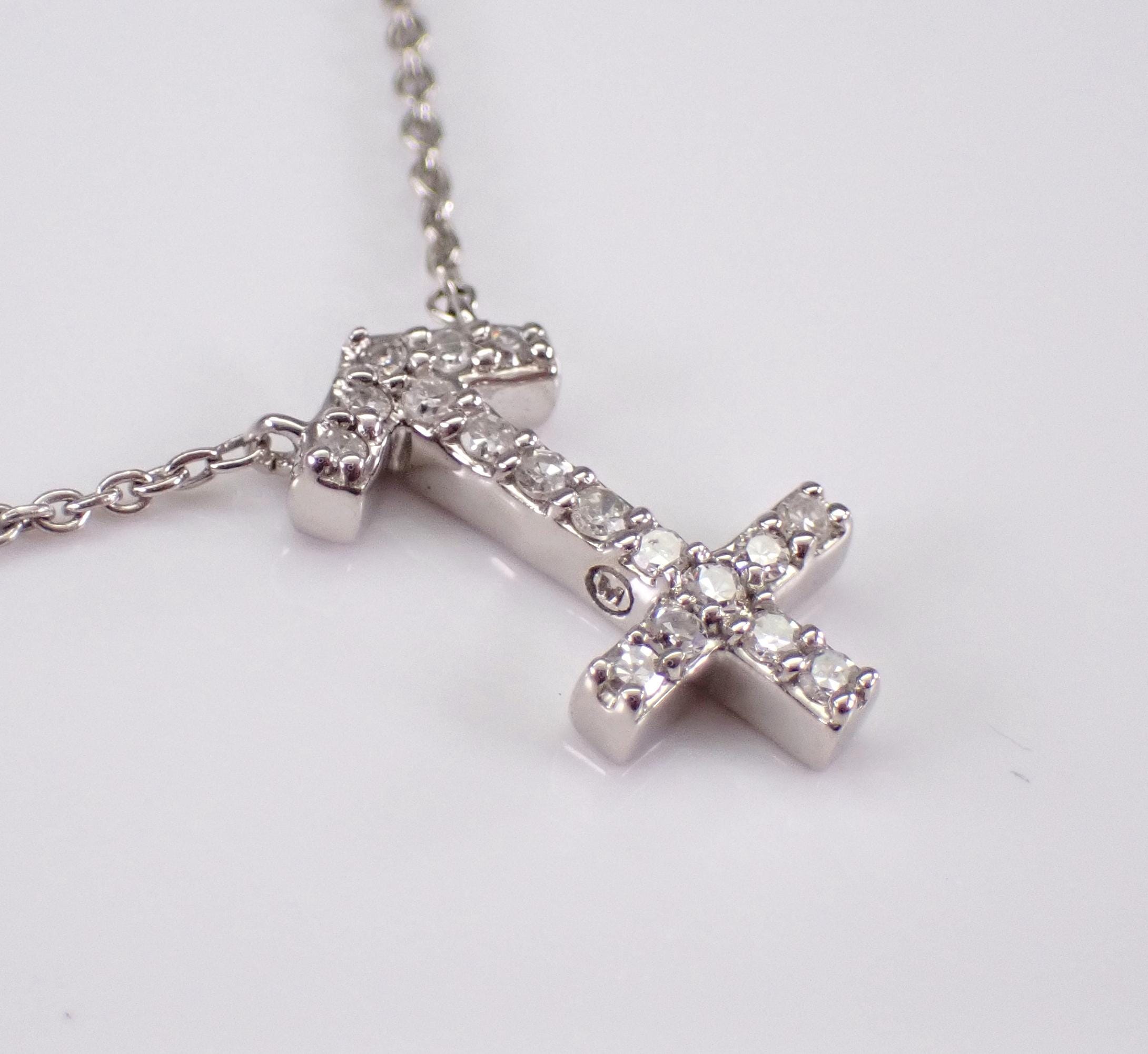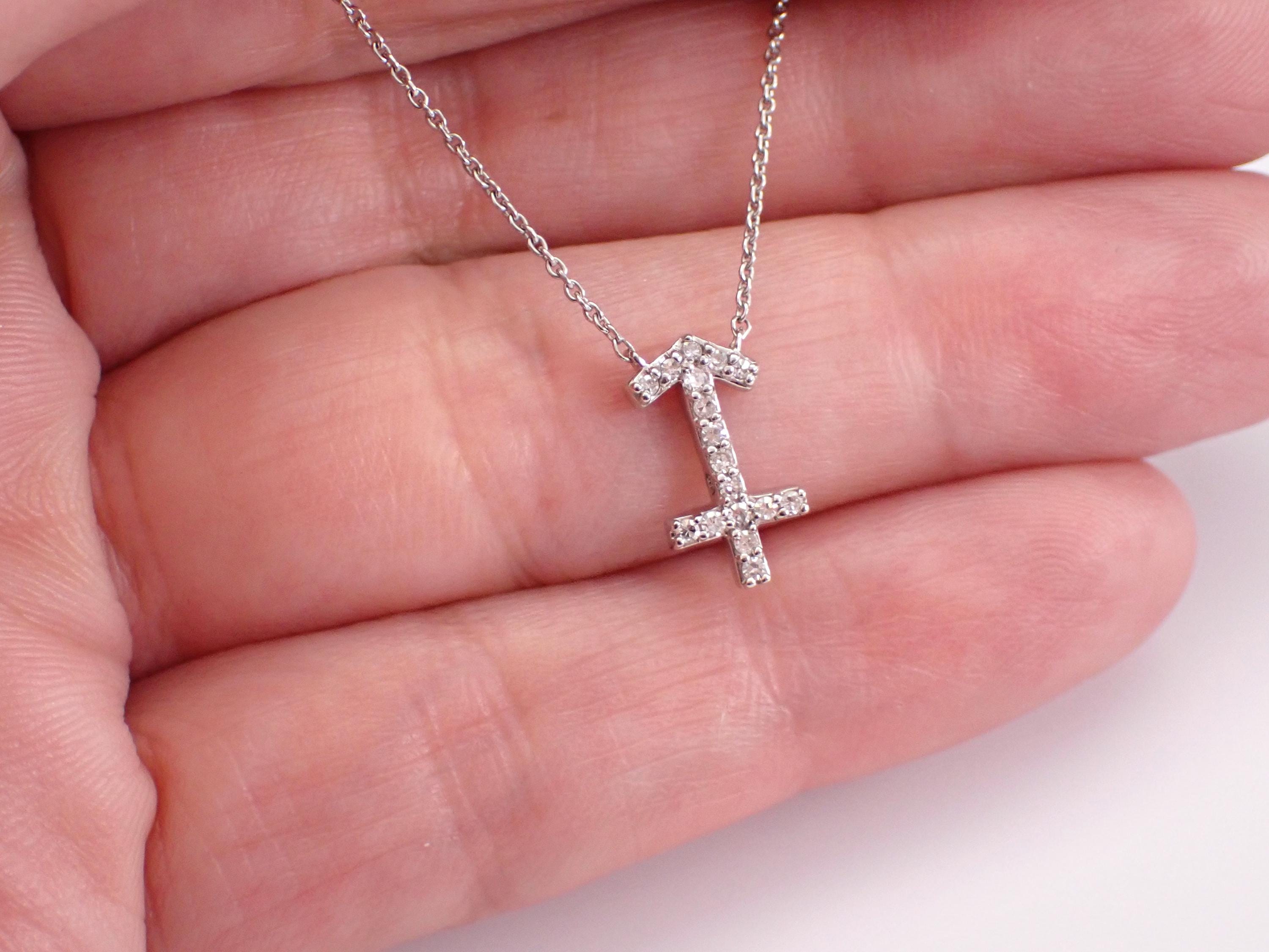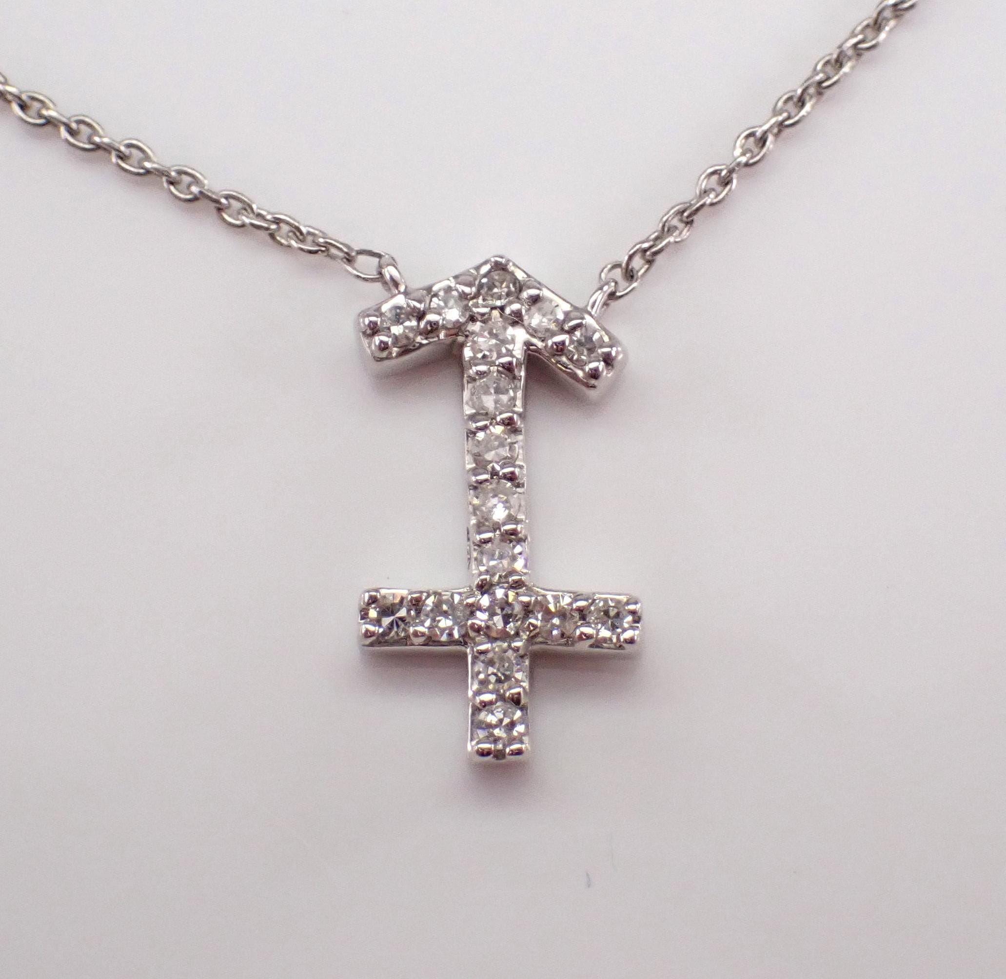 14K White Gold Diamond Sagittarius Sign Necklace. This necklace is set with seventeen genuine natural Round Brilliant Diamonds. These diamonds are H color, SI/I clarity and weigh a total of .10 carat. The centerpiece is attached to a 14K White Gold chain that has an overall length of 20" with two adjustment loops. This necklace weighs 2.2 grams and the pendant measures 12.5 X 7 mm. This necklace will be accompanied by an appraisal with the retail replacement value of $1,395.00. I will ship this necklace promptly in a gift box.