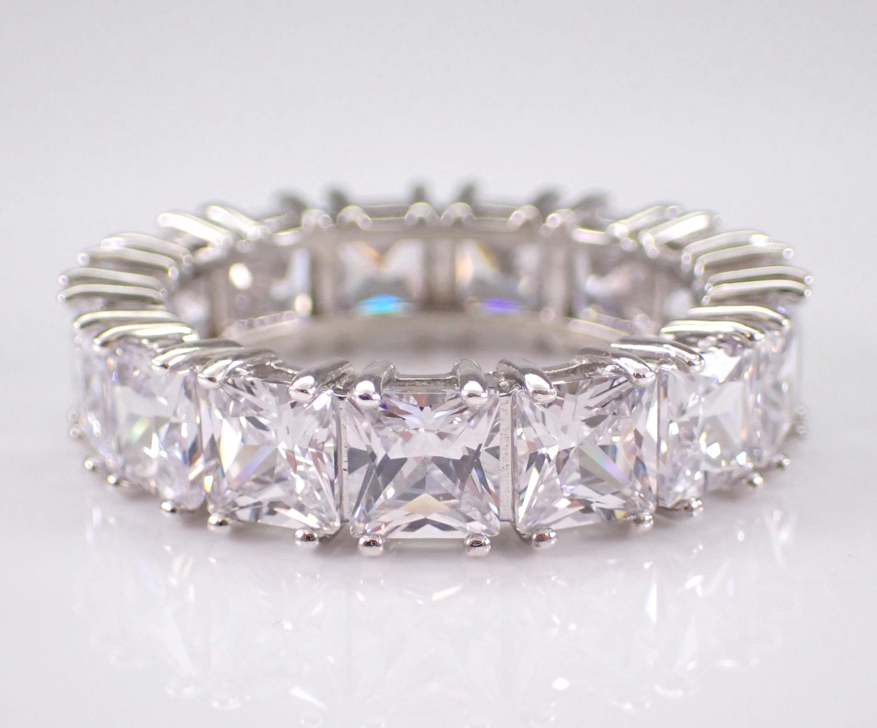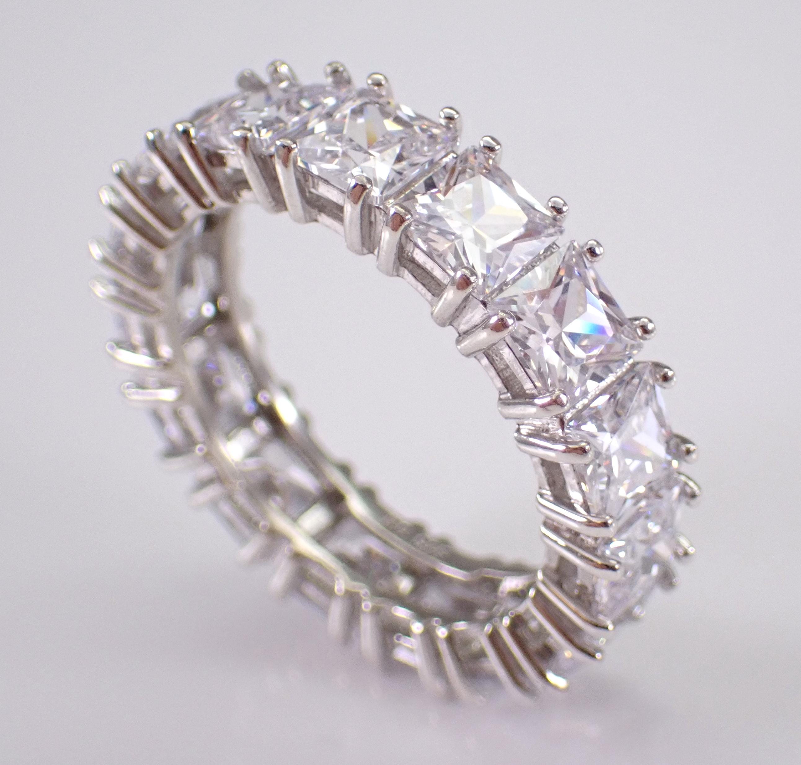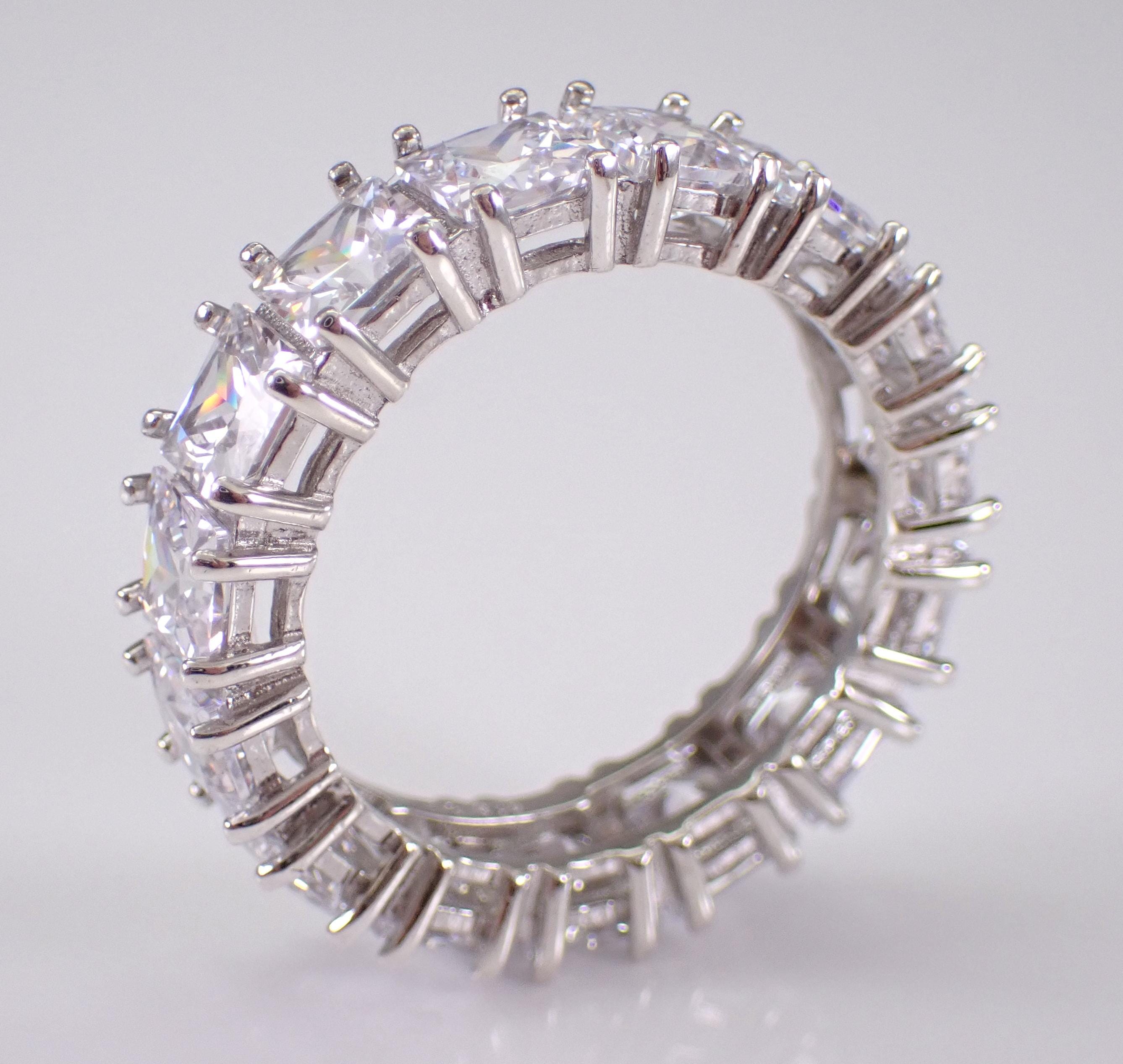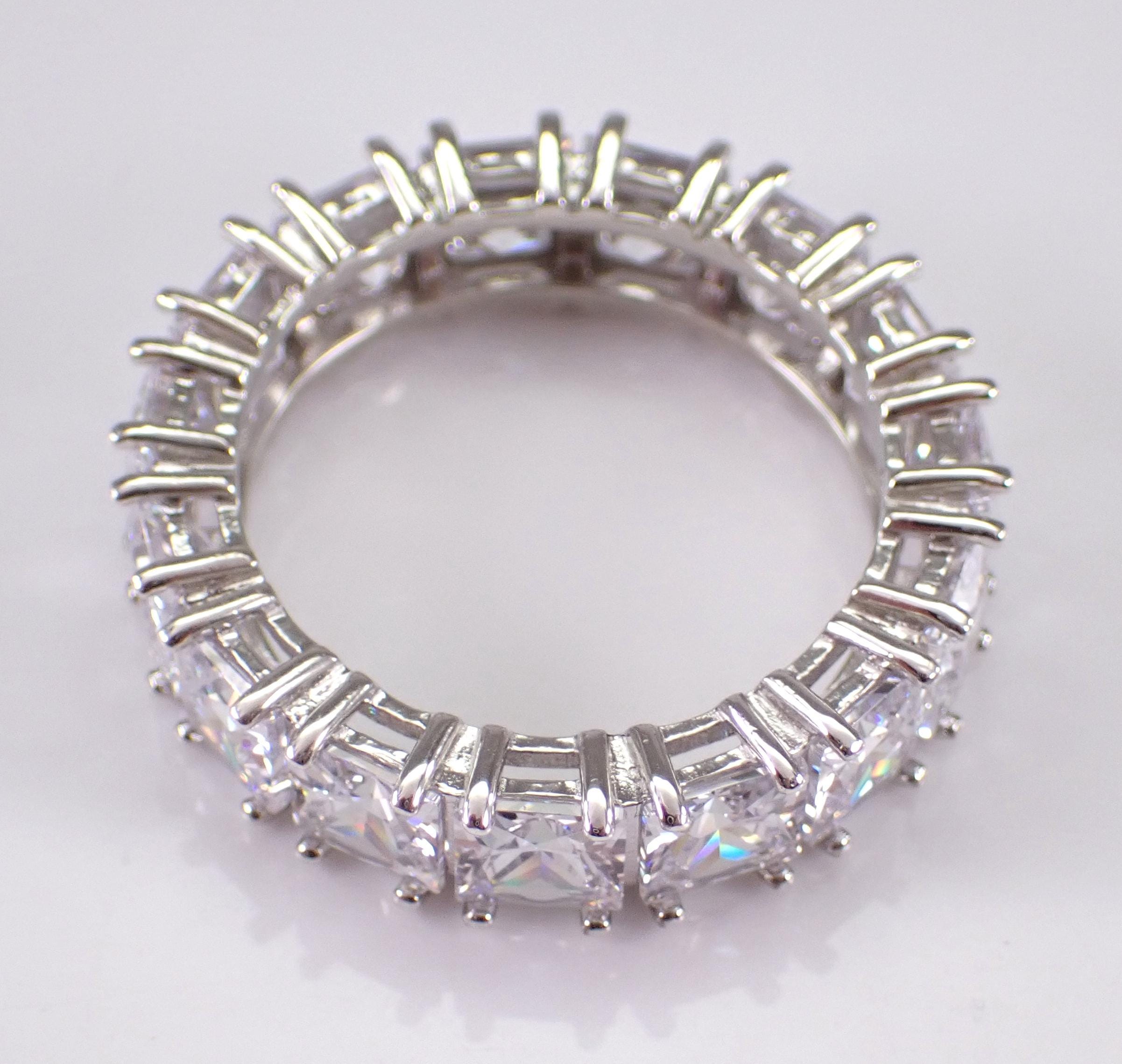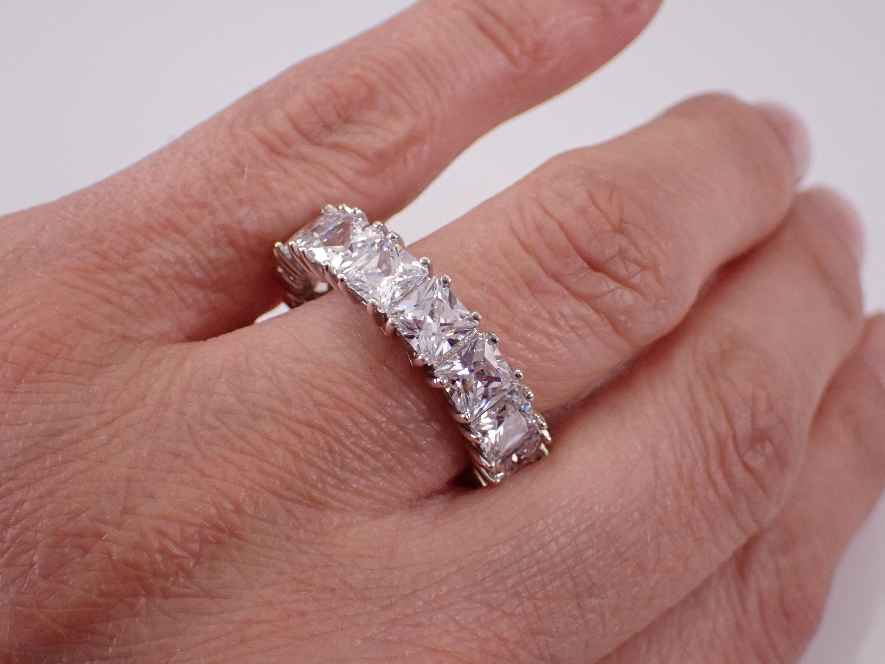 Classic wedding ring made of Sterling Silver, stamped “925”. There are fifteen Princess Cut Cubic Zirconia (CZ) set throughout this ring. Each of the Square CZ's measure 5 X 5 mm each and have the appearance of a 7 carat diamond band. The ring weighs 7.1 grams, measures 6.5 mm in width and is a finger size 10.
