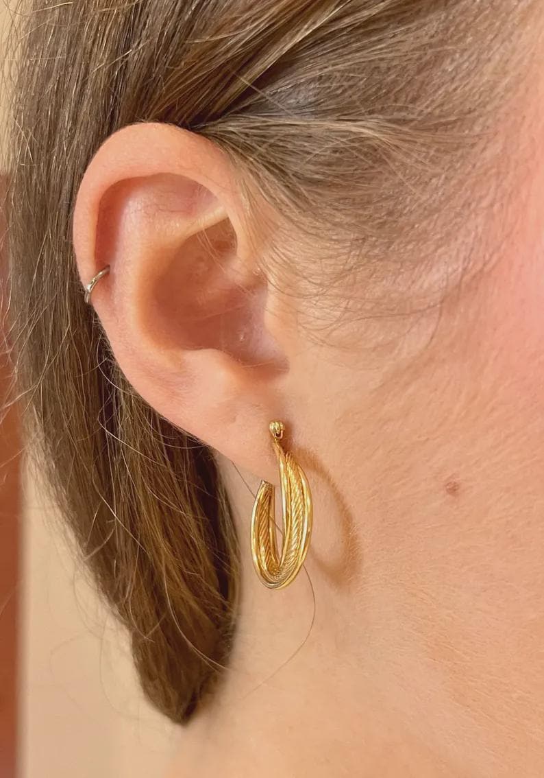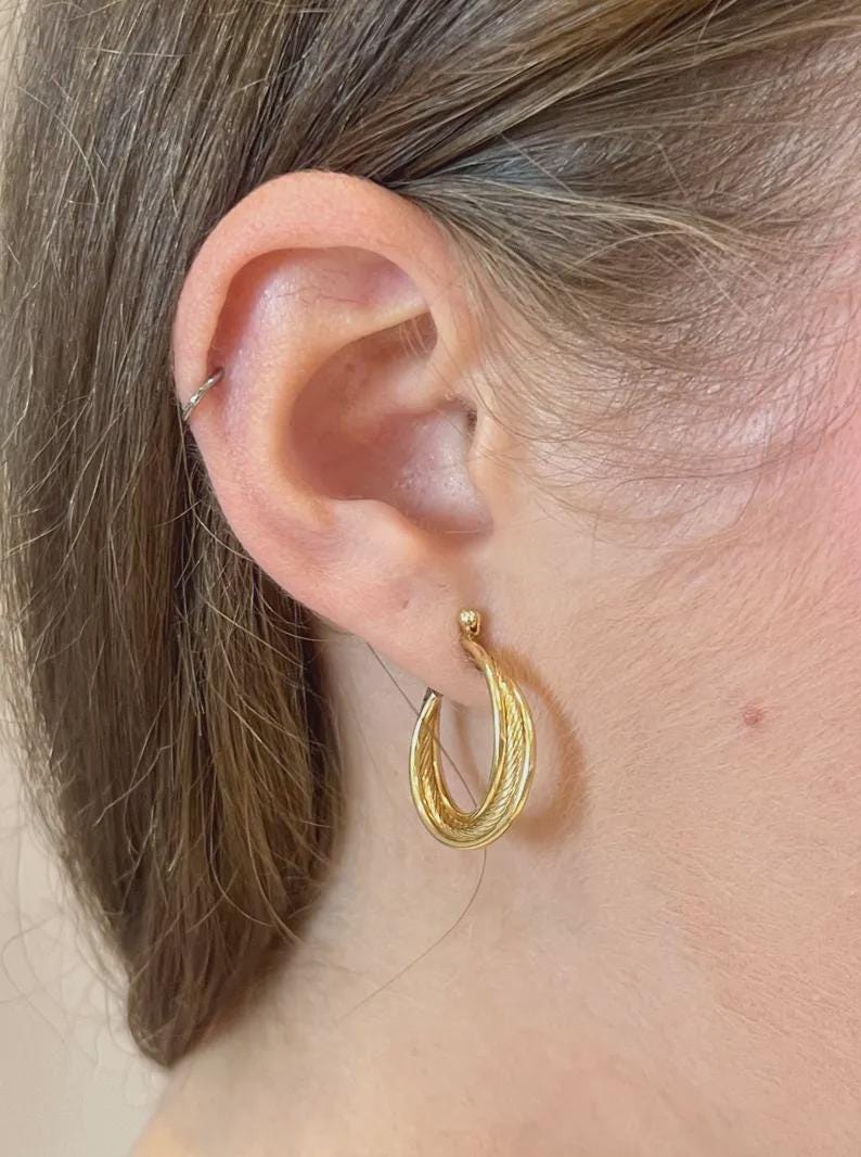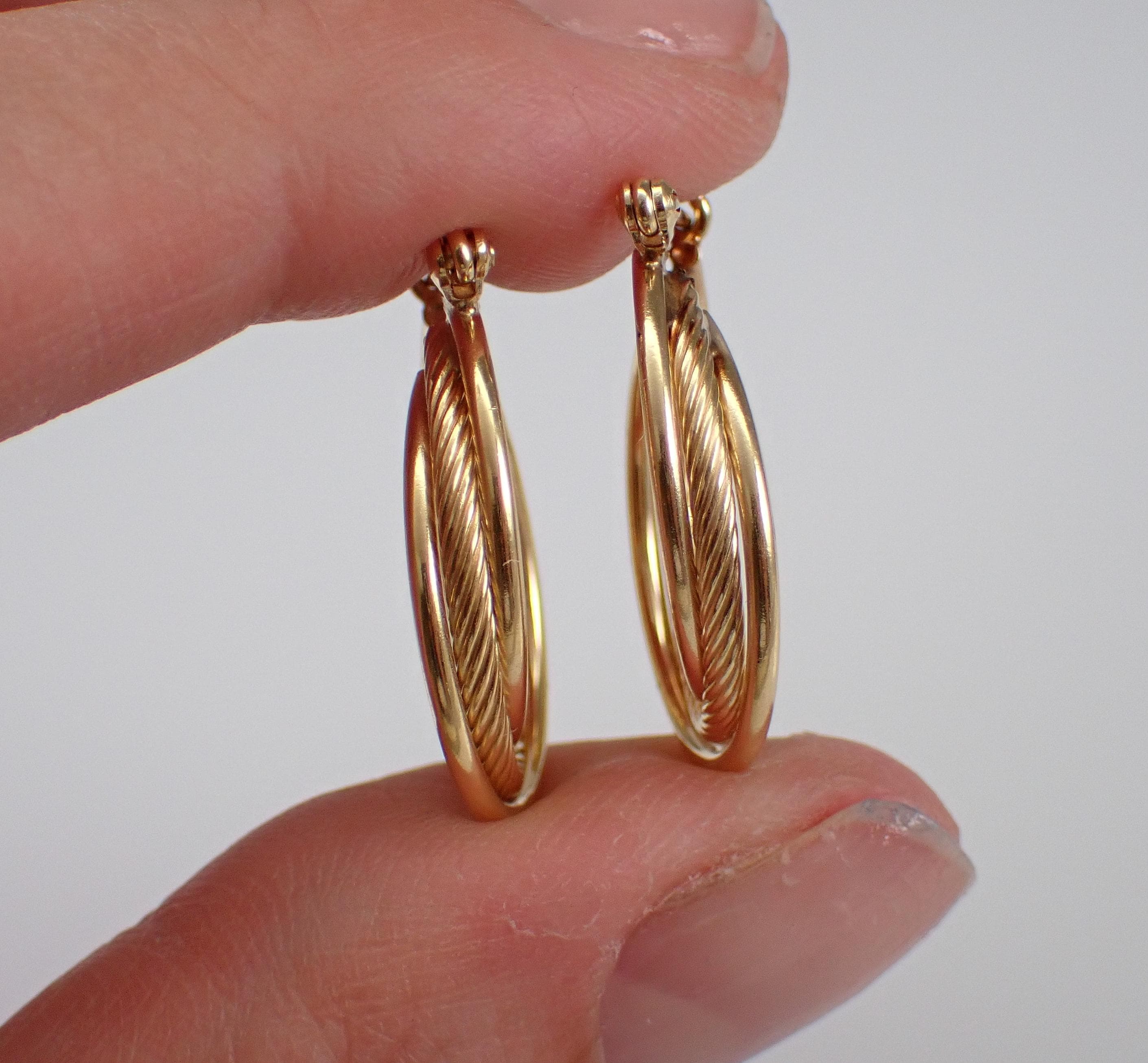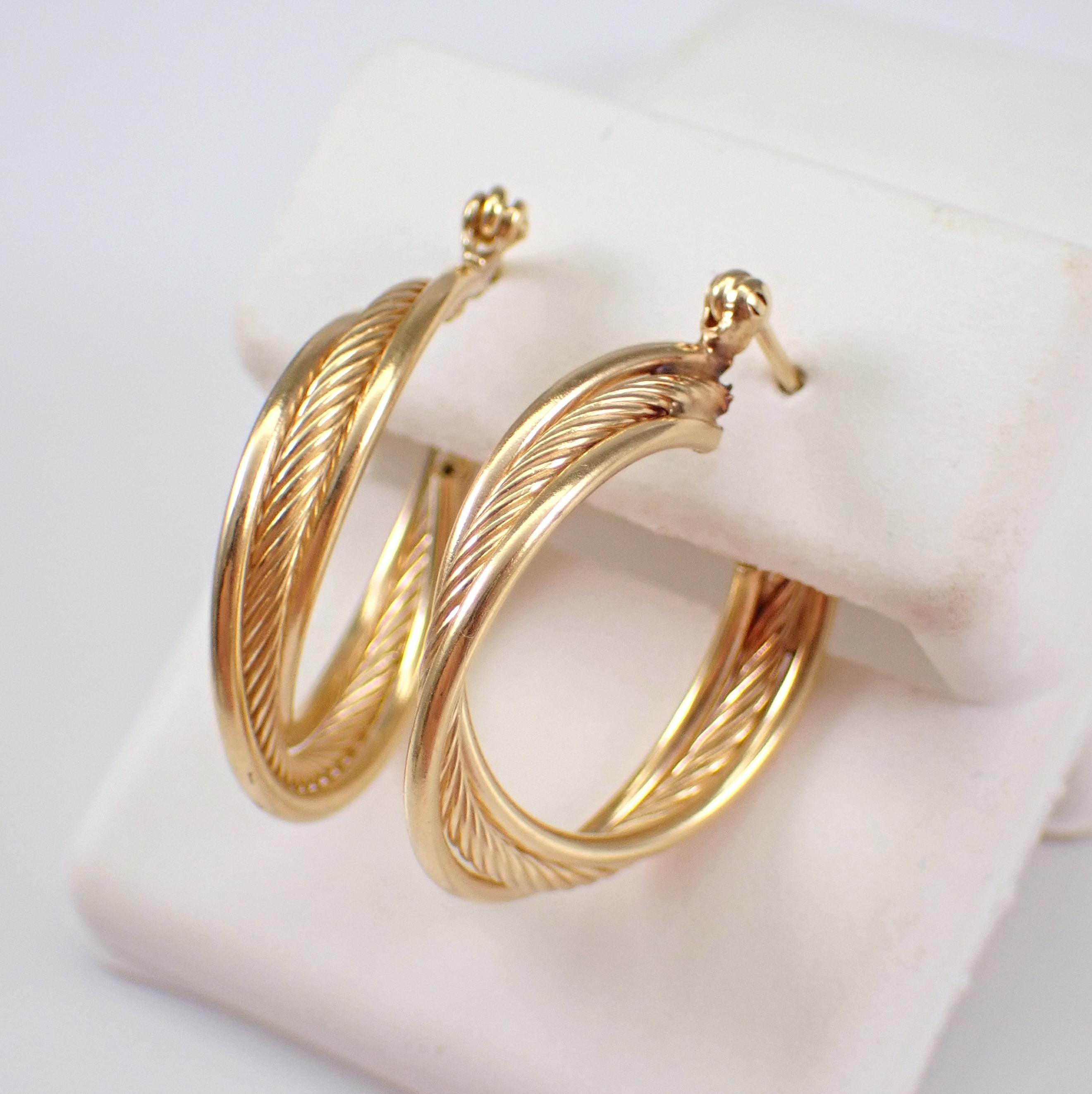 14K Yellow Gold Vintage Hoop Earrings. These earrings are 14K Yellow Gold and weigh a total of 2.6 grams. These earrings are for pierced ears and measure 19.5 mm in diameter (3/4"). These earrings will be shipped promptly in a gift box.