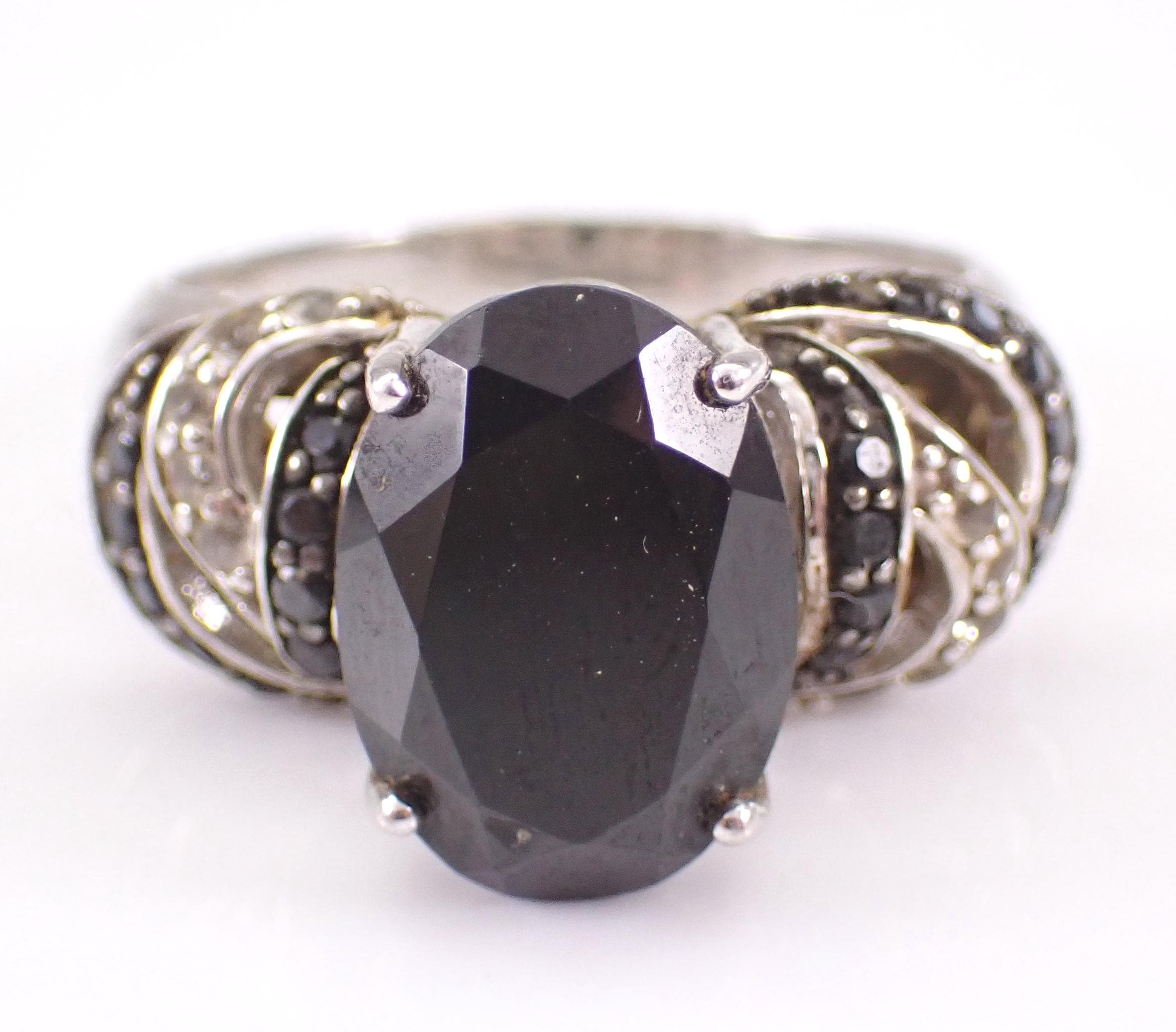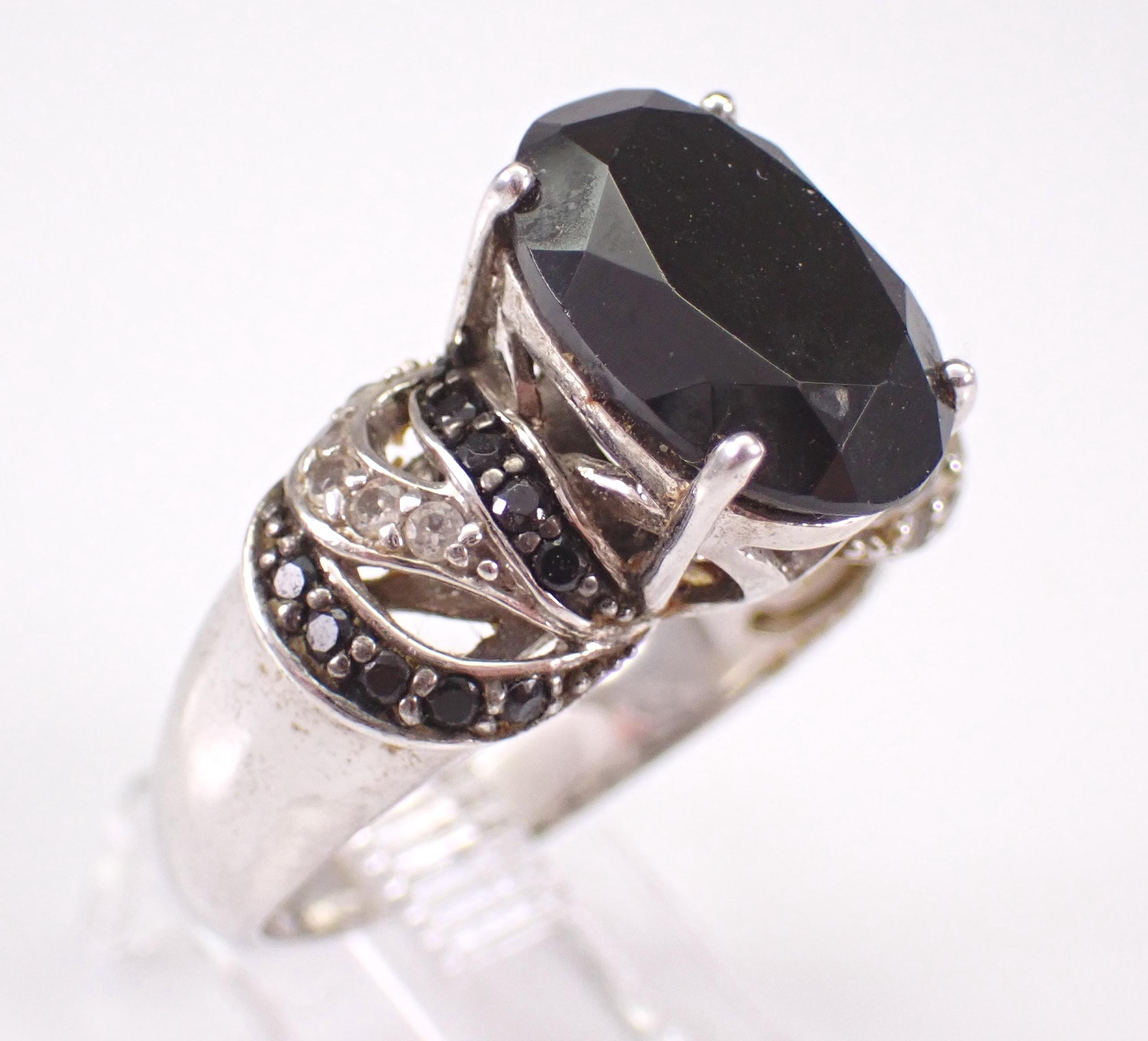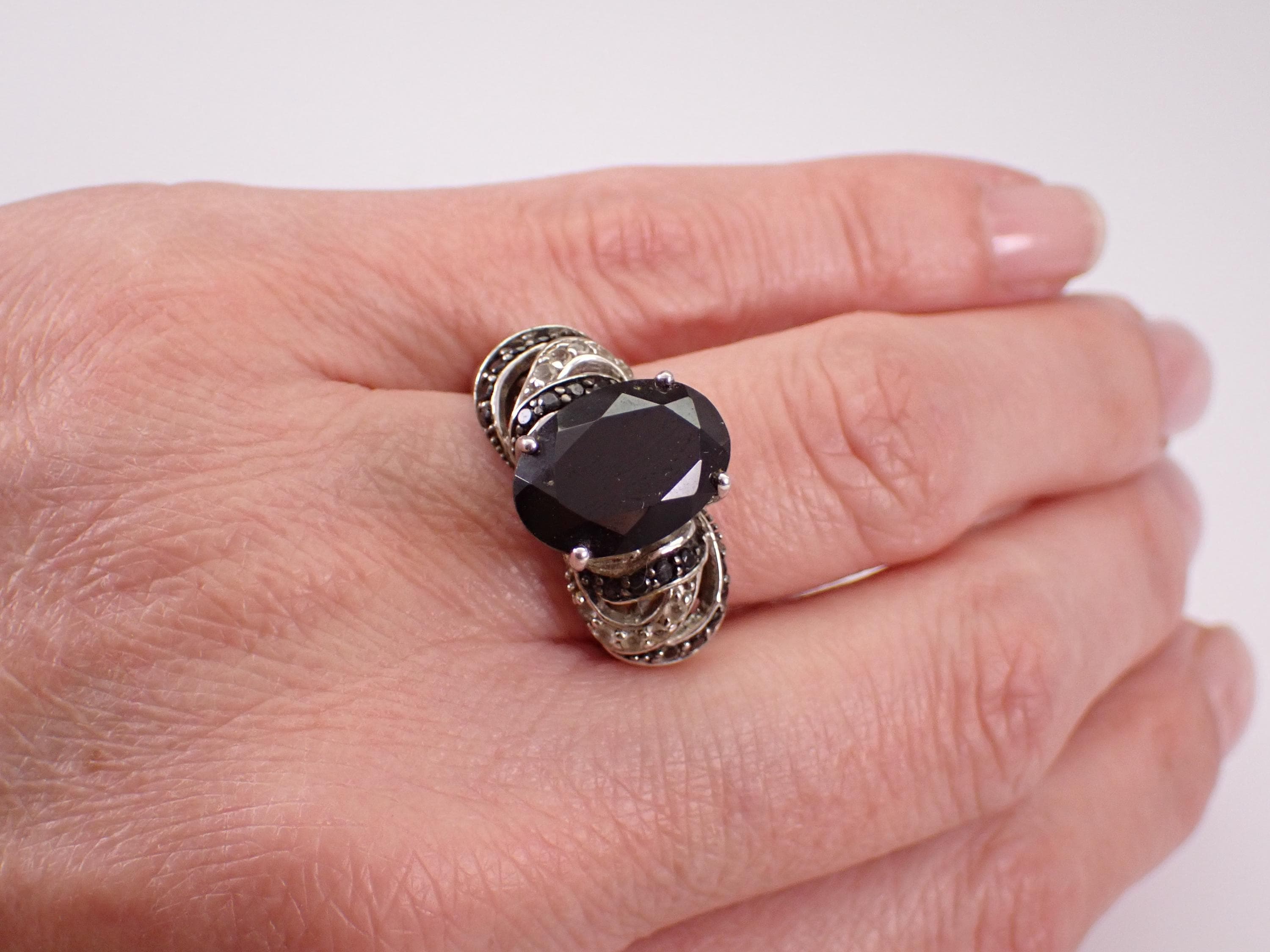Vintage Sterling Silver Onyx ring. This ring is set with an Oval Black Onyx in the center. This Onyx is genuine and measures 14 X 10 mm. There are also black and colorless Cubic Zirconia set throughout this setting. This ring is finger size 10 and the ring weighs 7.5 grams. This ring will be shipped promptly in a gift pouch.