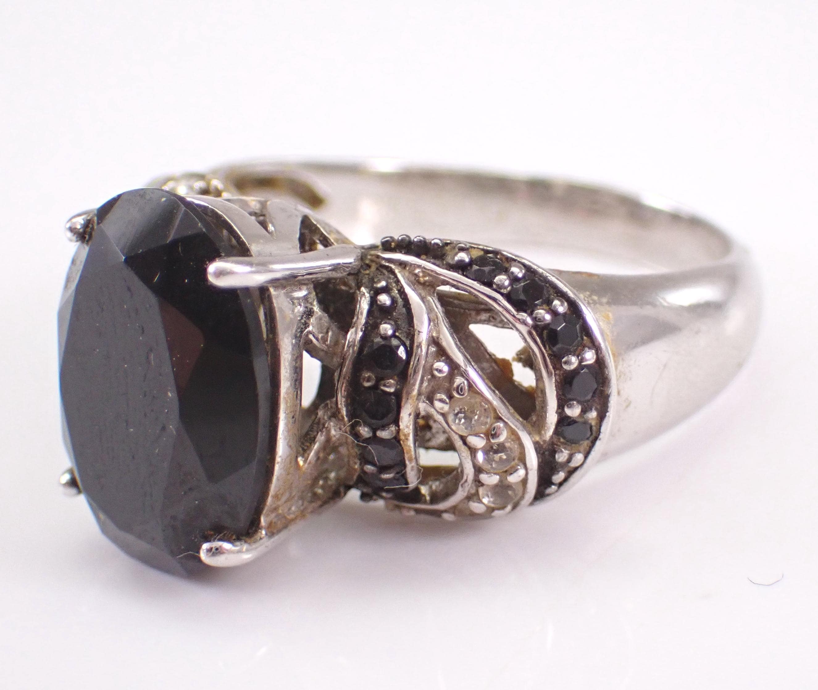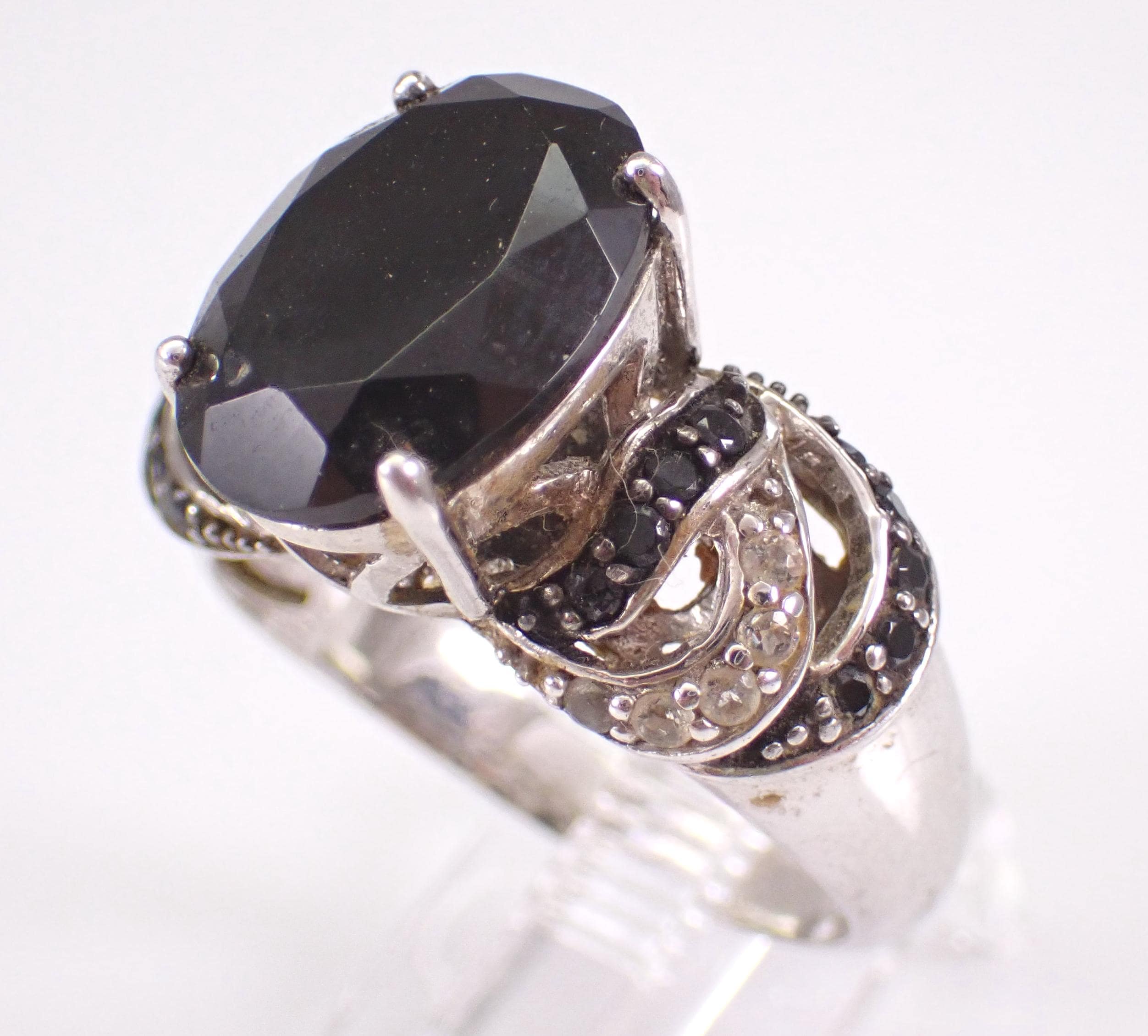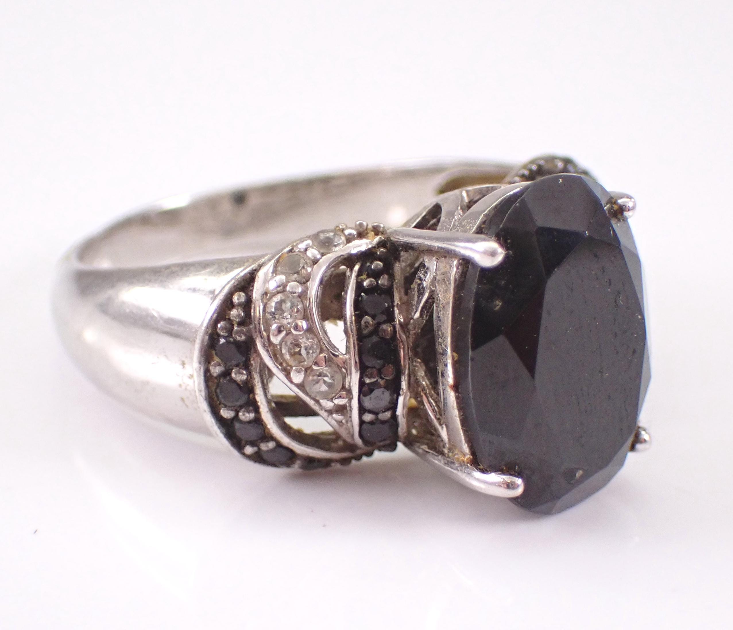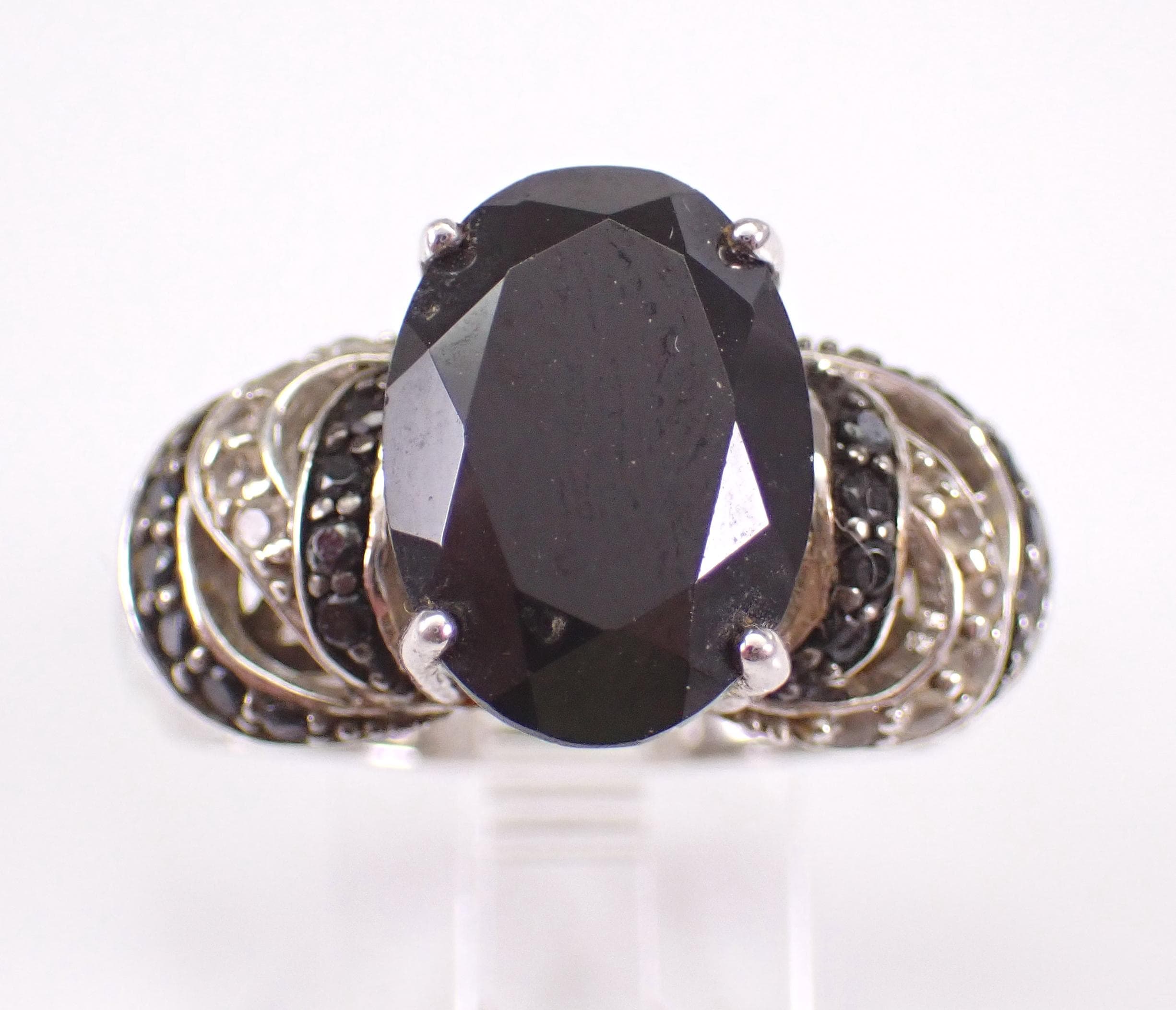 Vintage Sterling Silver Onyx ring. This ring is set with an Oval Black Onyx in the center. This Onyx is genuine and measures 14 X 10 mm. There are also black and colorless Cubic Zirconia set throughout this setting. This ring is finger size 10 and the ring weighs 7.5 grams. This ring will be shipped promptly in a gift pouch.
