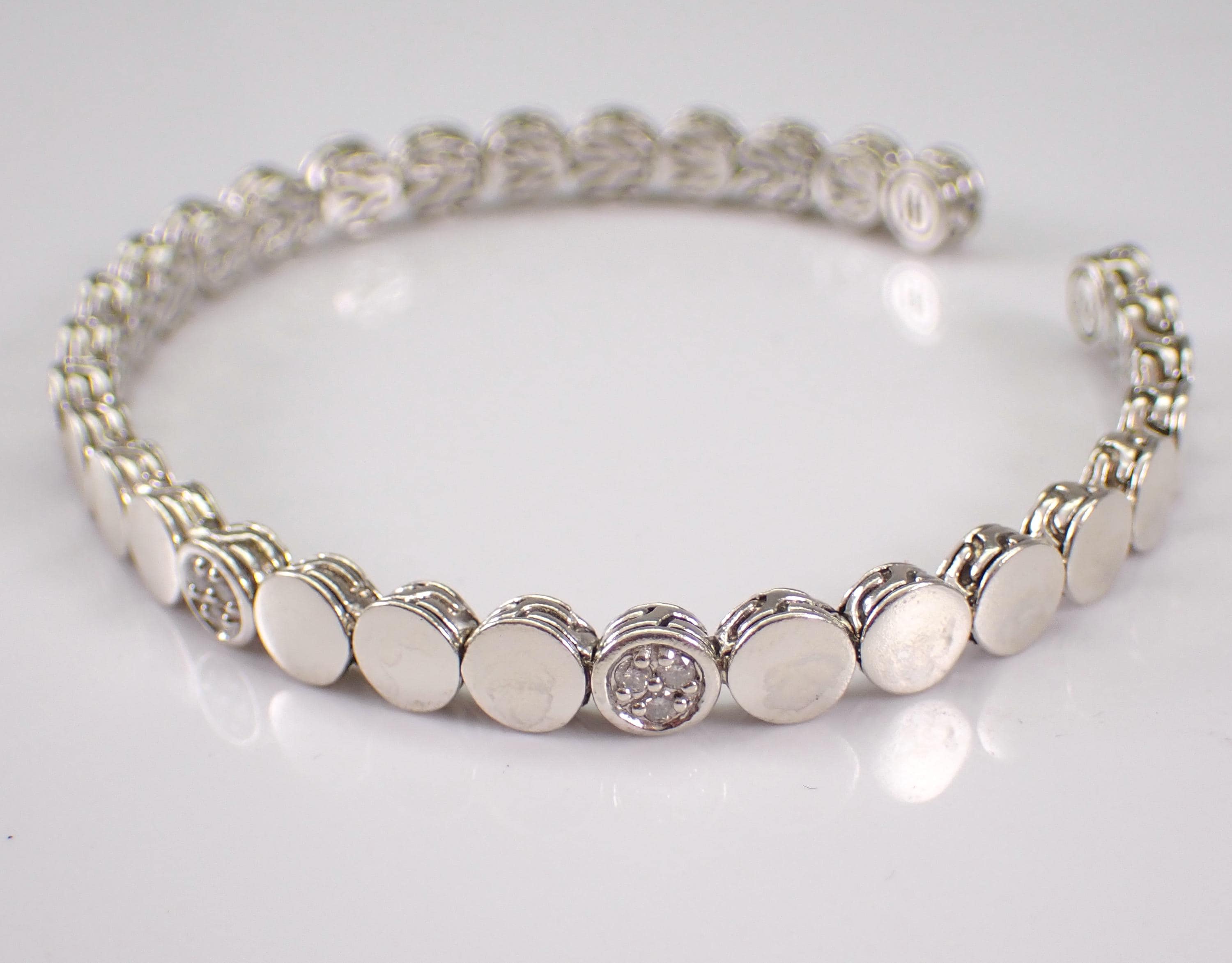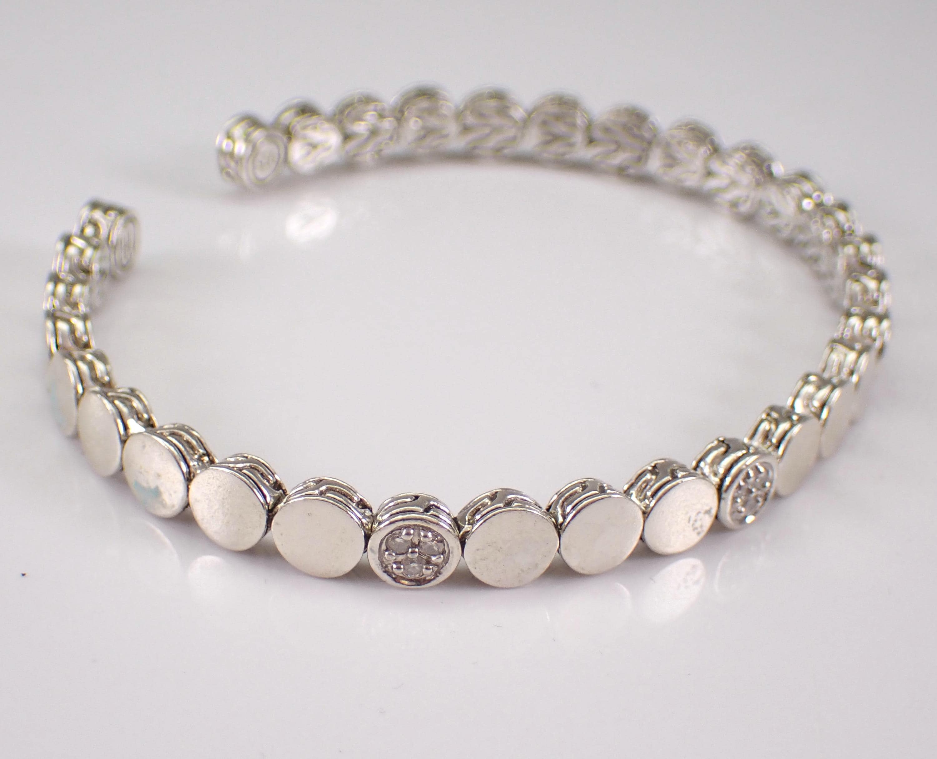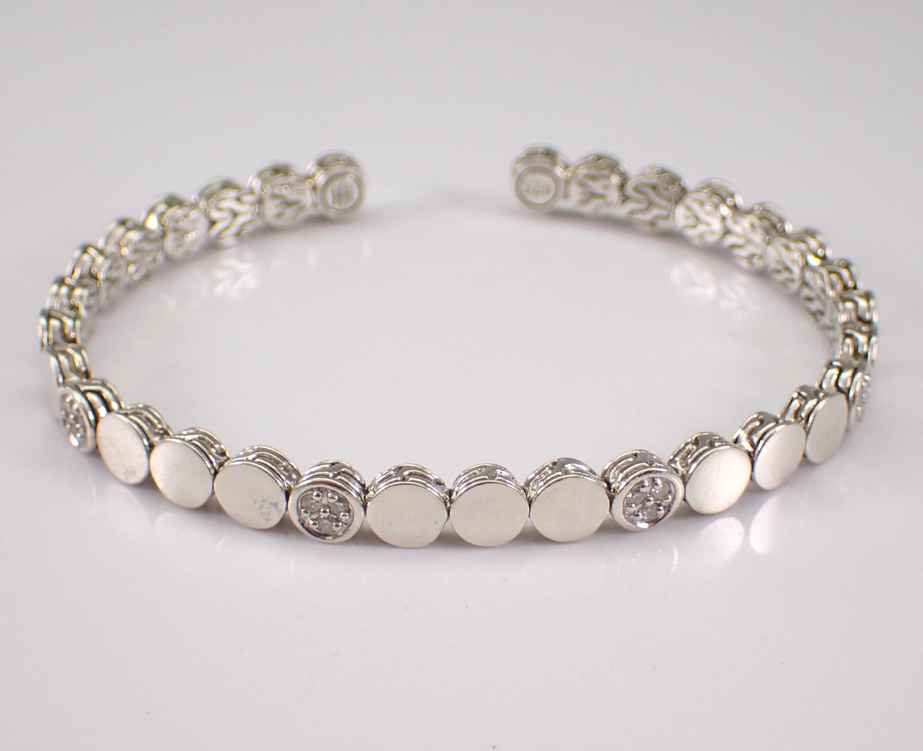 Vintage Genuine John Hardy Sterling Silver Diamond Flex Bangle Bracelet. This bracelet is from their Dot Collection. The bracelet is set with twelve genuine Round Diamonds. These diamonds are H color, SI/I clarity and weigh a total of .15 carat. This bracelet weighs 17.2 grams and measures 5 mm in width. This bracelet fits a standard ladies wrist. This bracelet is perfect for everyday wear or any special occasion, like Mothers Day, Birthday, Anniversary, Graduation, etc. The Bracelet will be shipped promptly in its original gift pouch with the paperwork.