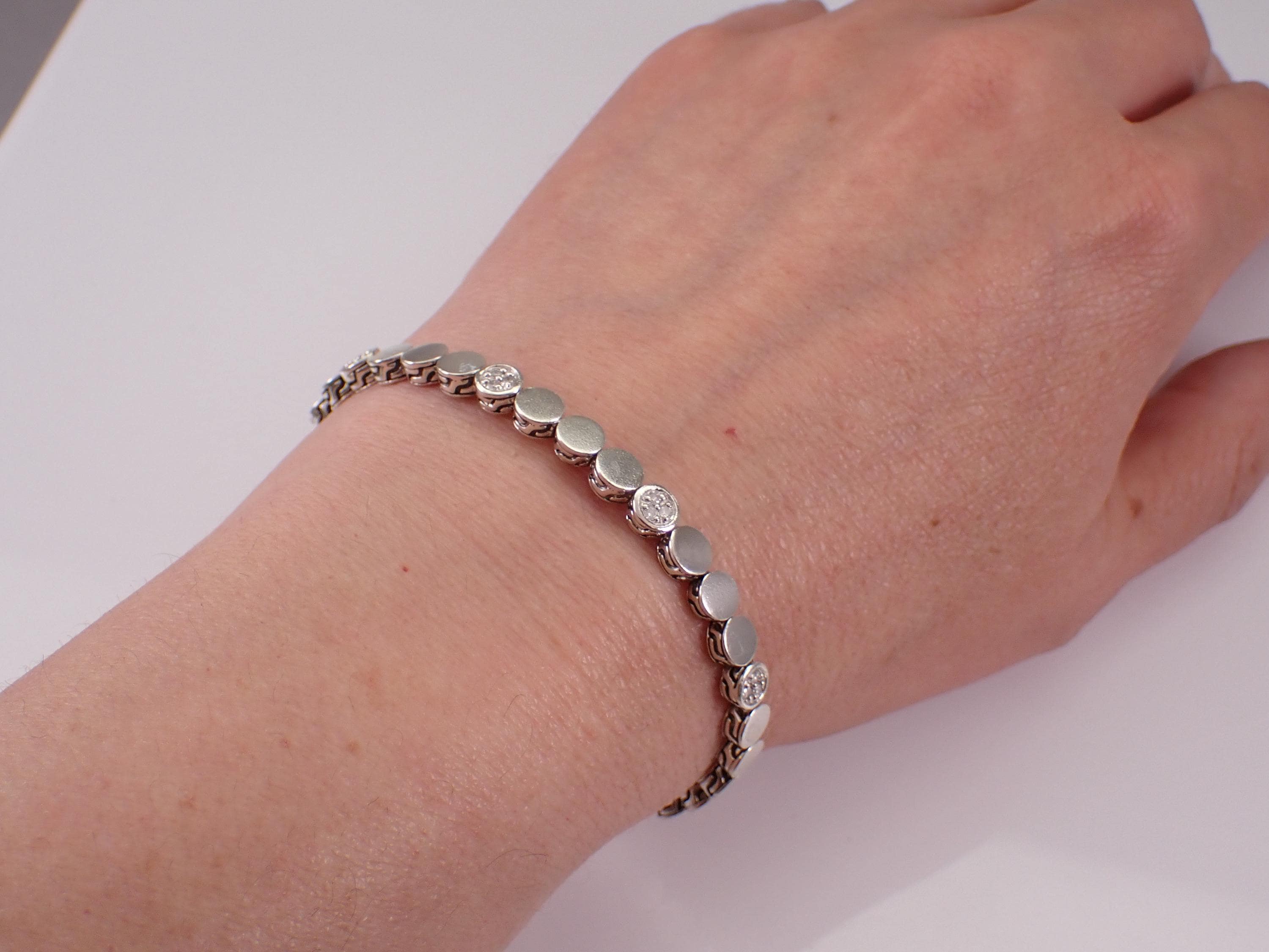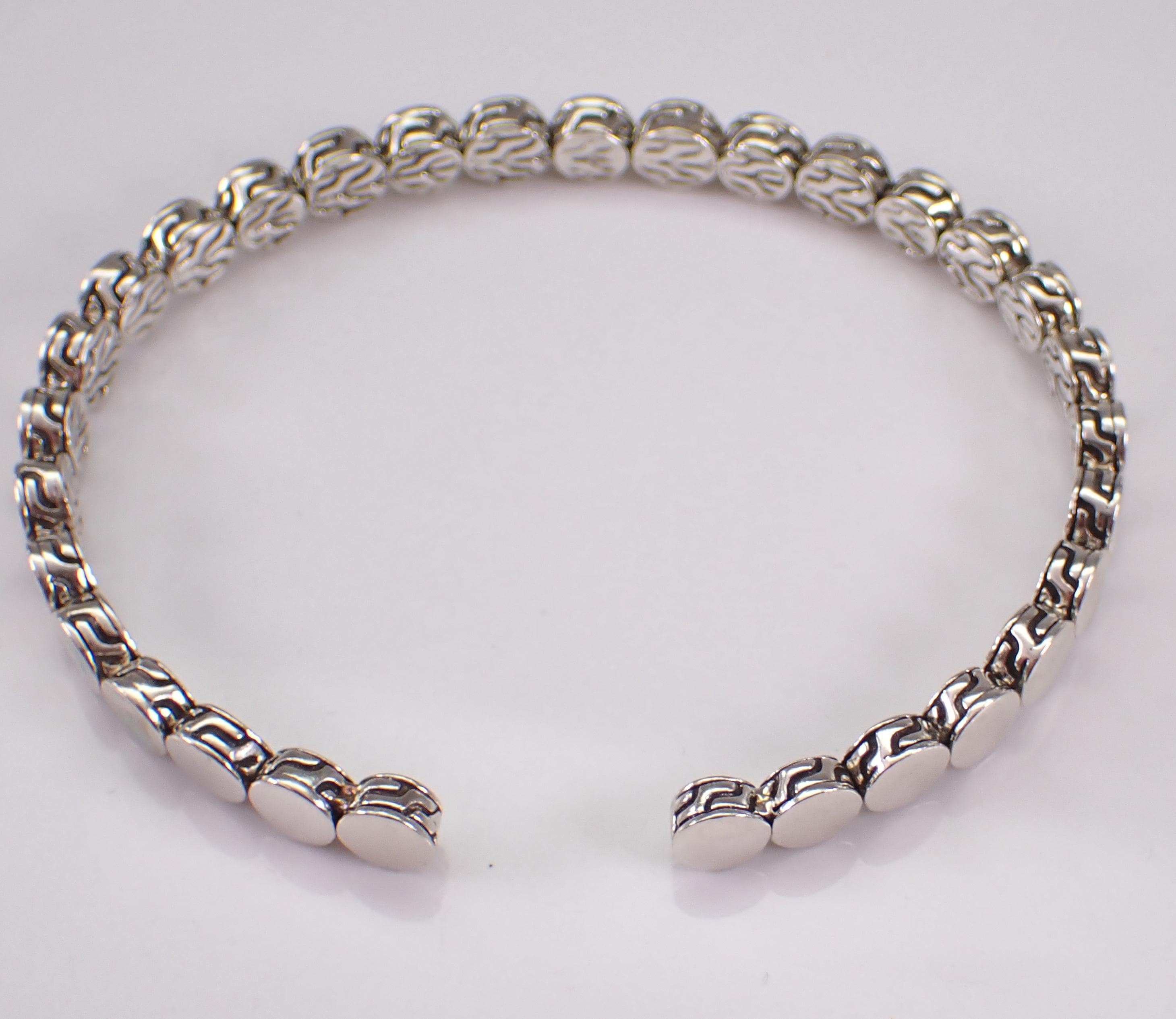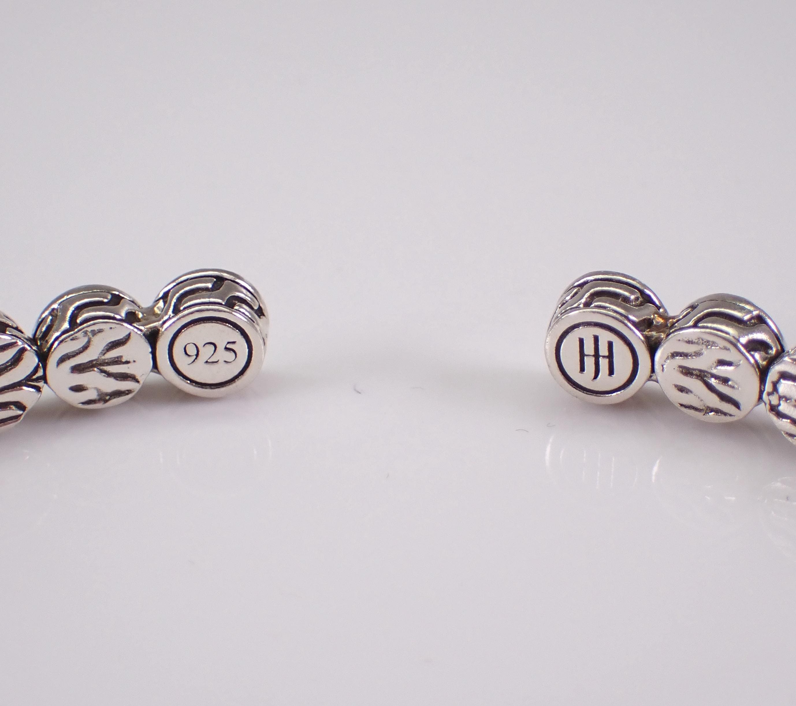 Vintage Genuine John Hardy Sterling Silver Diamond Flex Bangle Bracelet. This bracelet is from their Dot Collection. The bracelet is set with twelve genuine Round Diamonds. These diamonds are H color, SI/I clarity and weigh a total of .15 carat. This bracelet weighs 17.2 grams and measures 5 mm in width. This bracelet fits a standard ladies wrist. This bracelet is perfect for everyday wear or any special occasion, like Mothers Day, Birthday, Anniversary, Graduation, etc. The Bracelet will be shipped promptly in its original gift pouch with the paperwork.