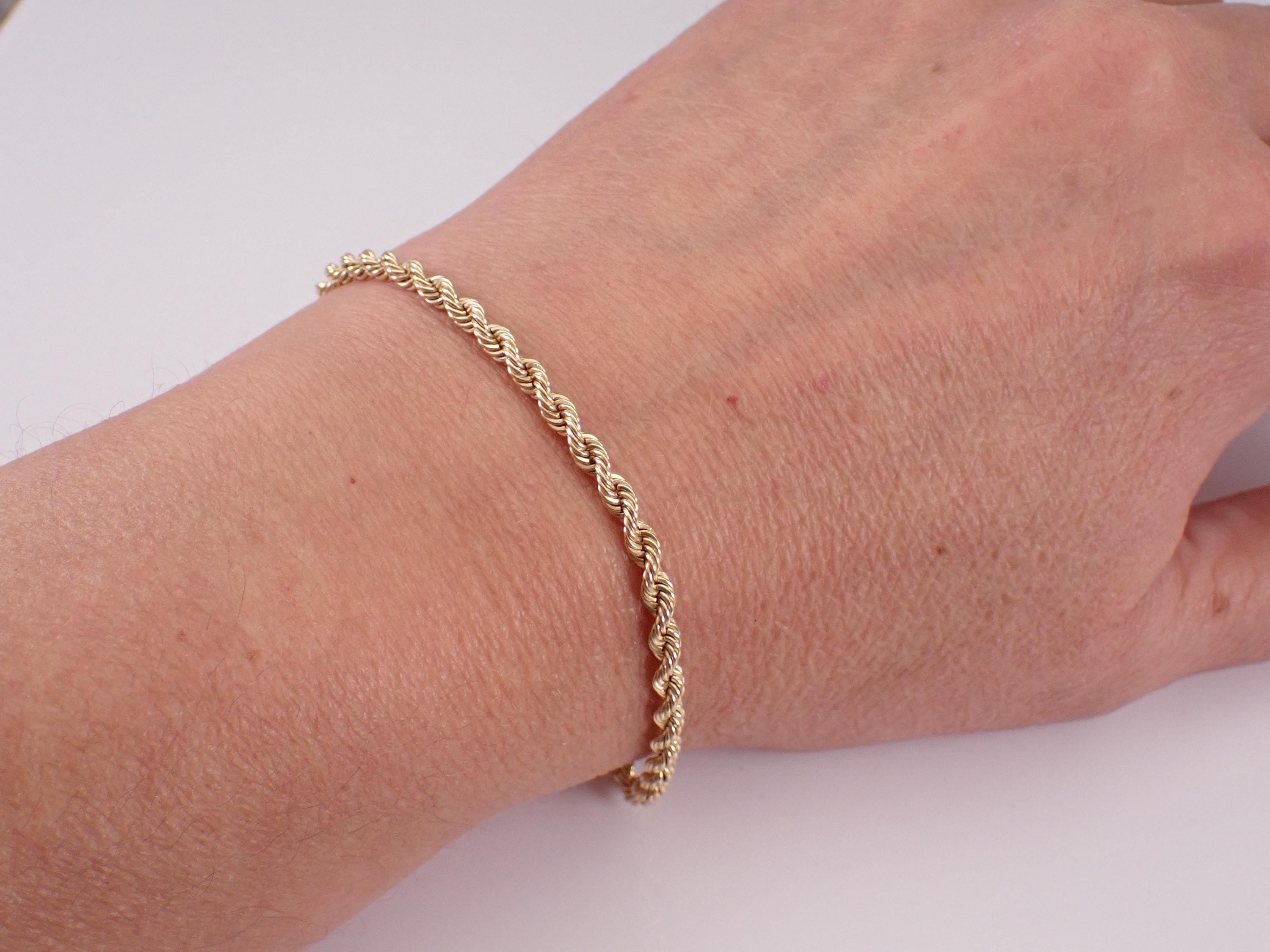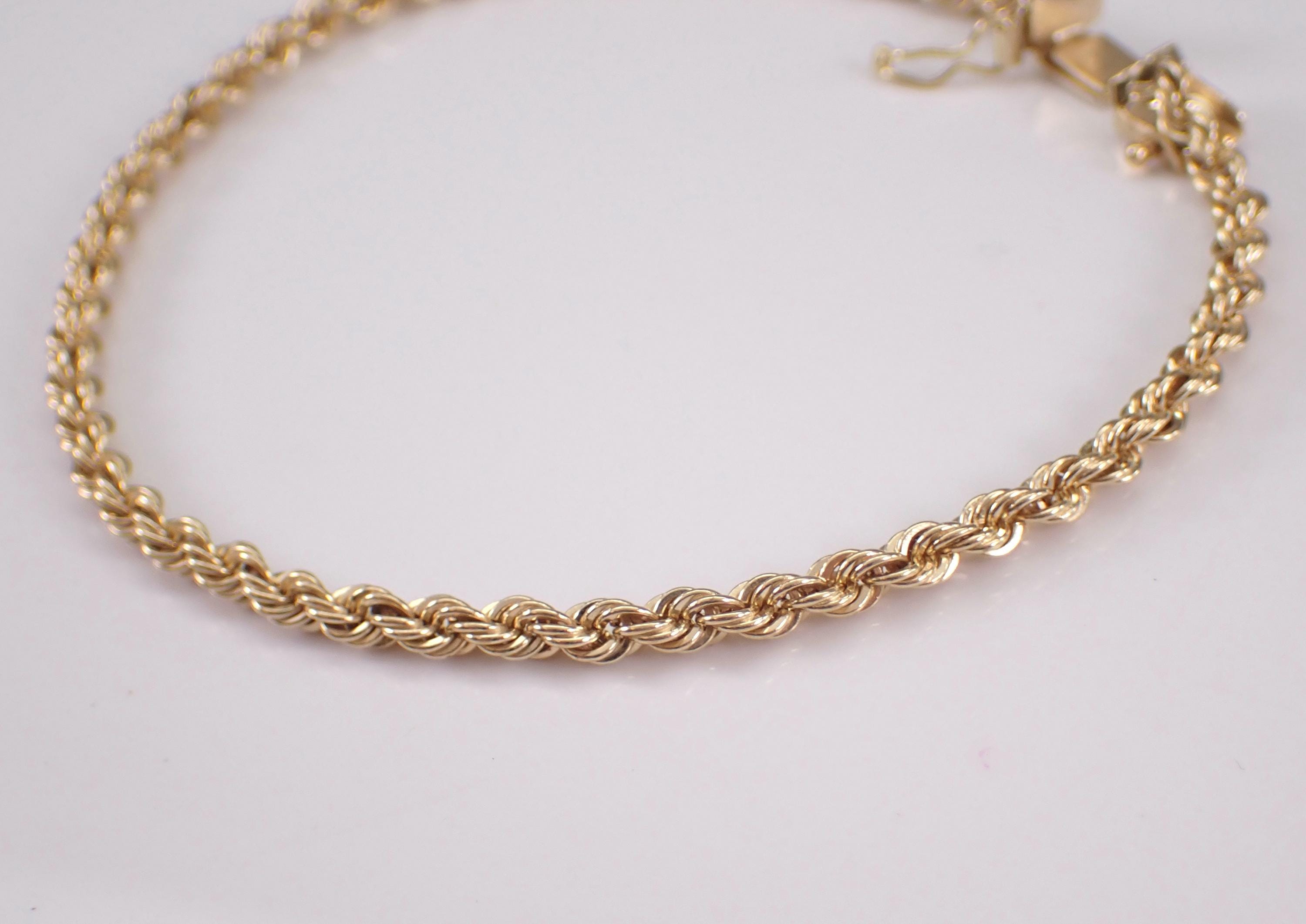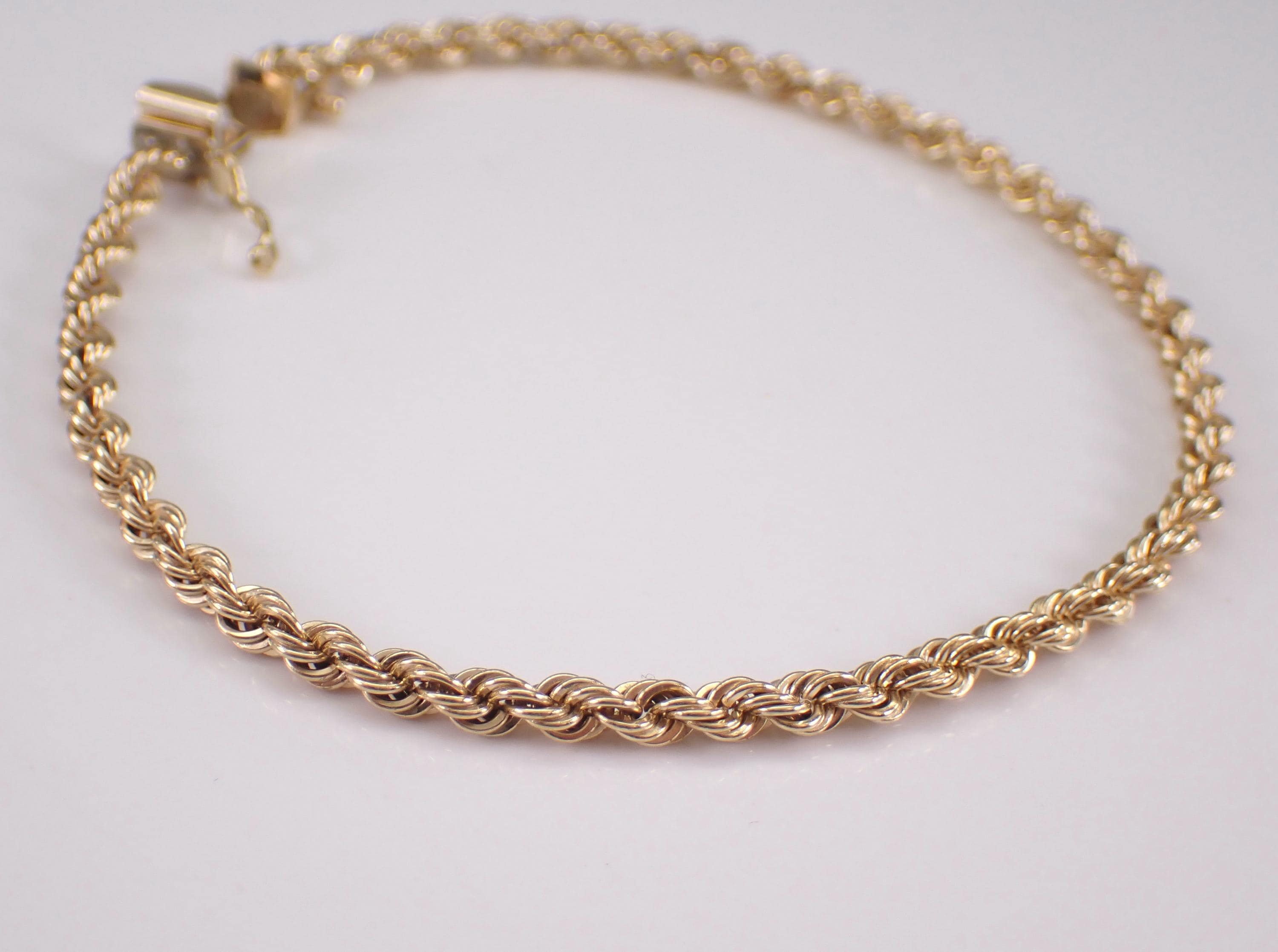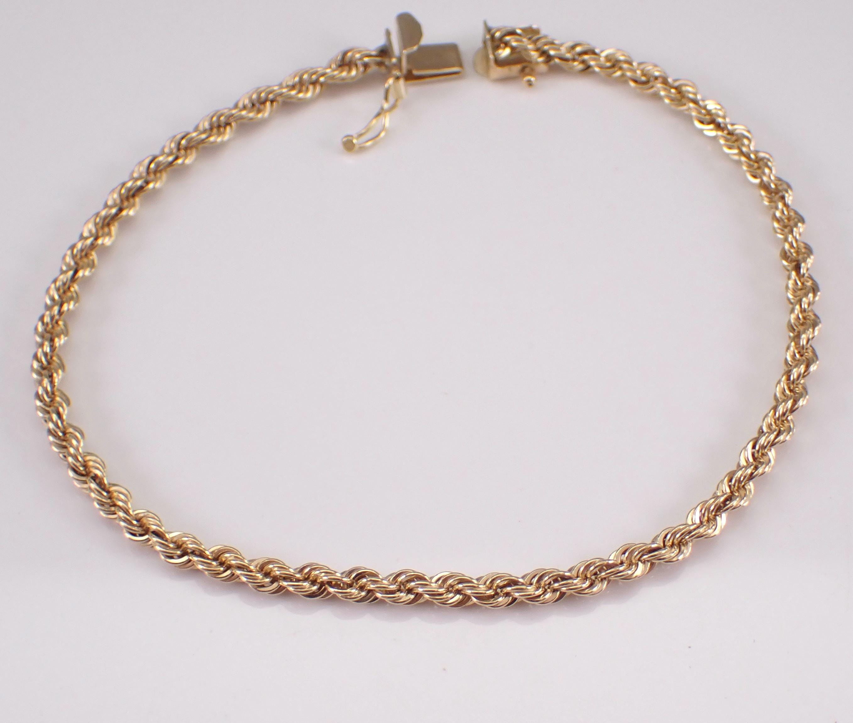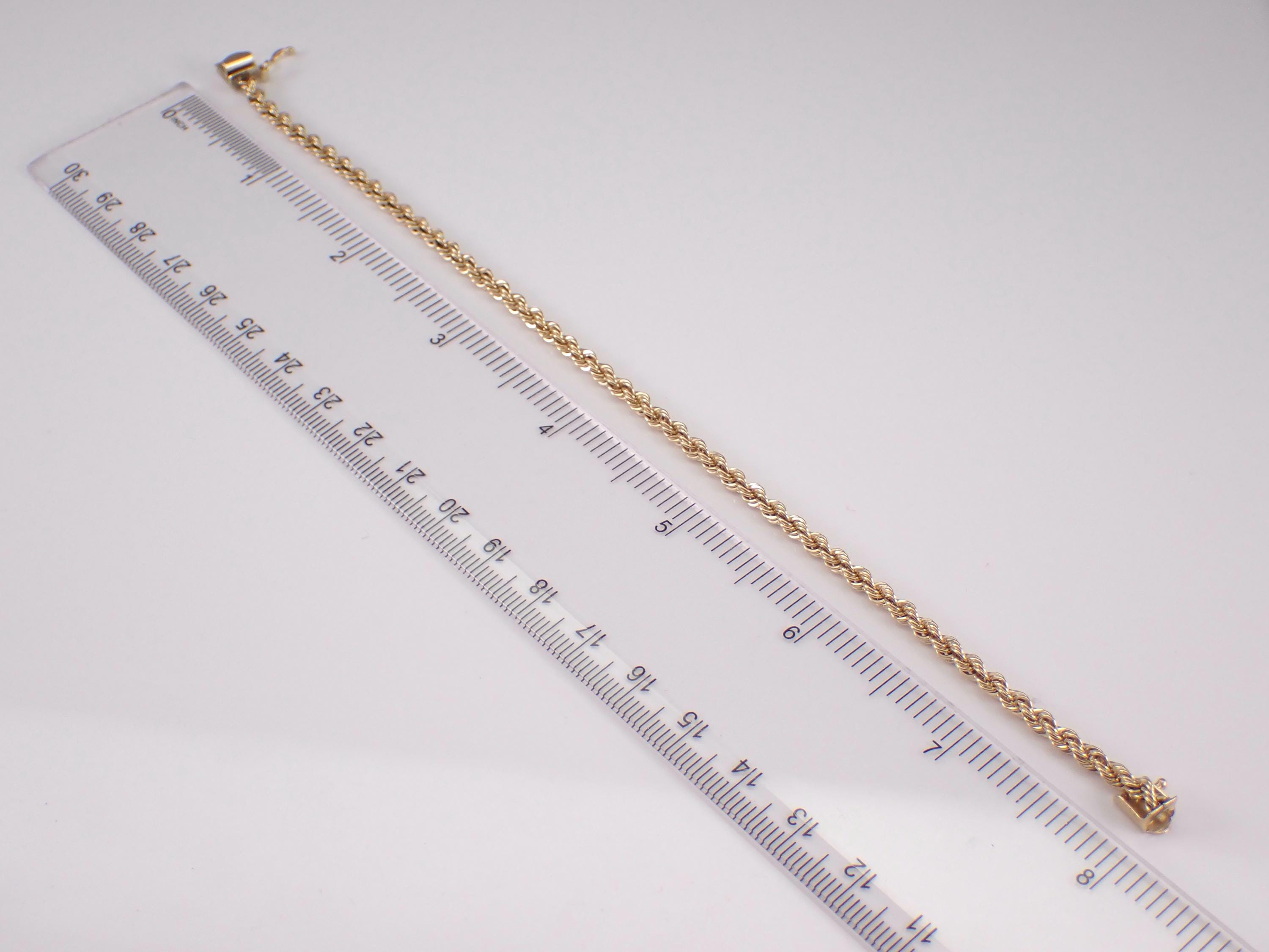 Vintage Estate 14K Yellow Gold Rope Chain Link Bracelet. This Bracelet weighs 8.0 grams and measures 7 3/4" in length and 3.25mm in width. This bracelet will be shipped promptly in a gift box accompanied by an appraisal for insurance and authentication purposes.