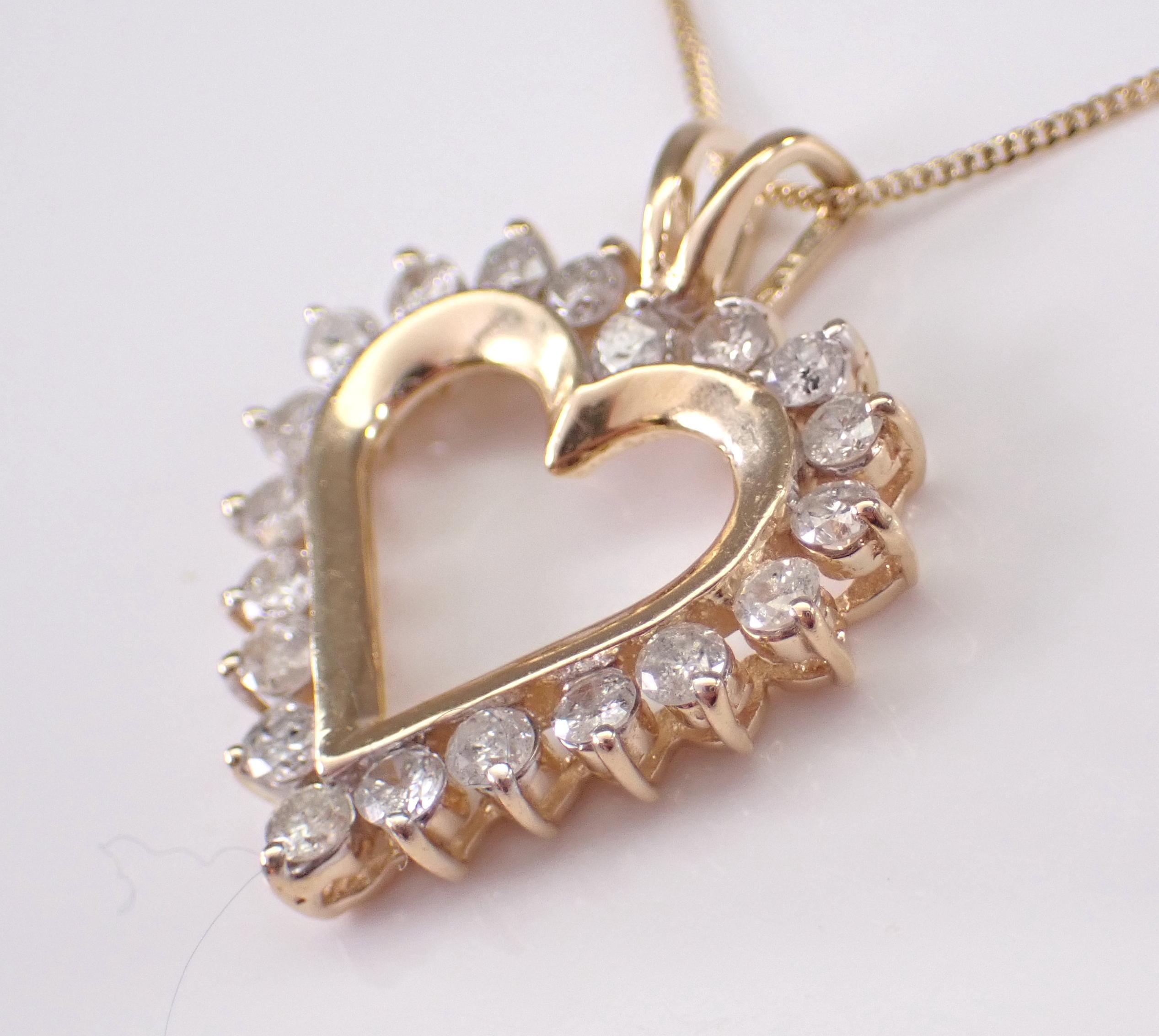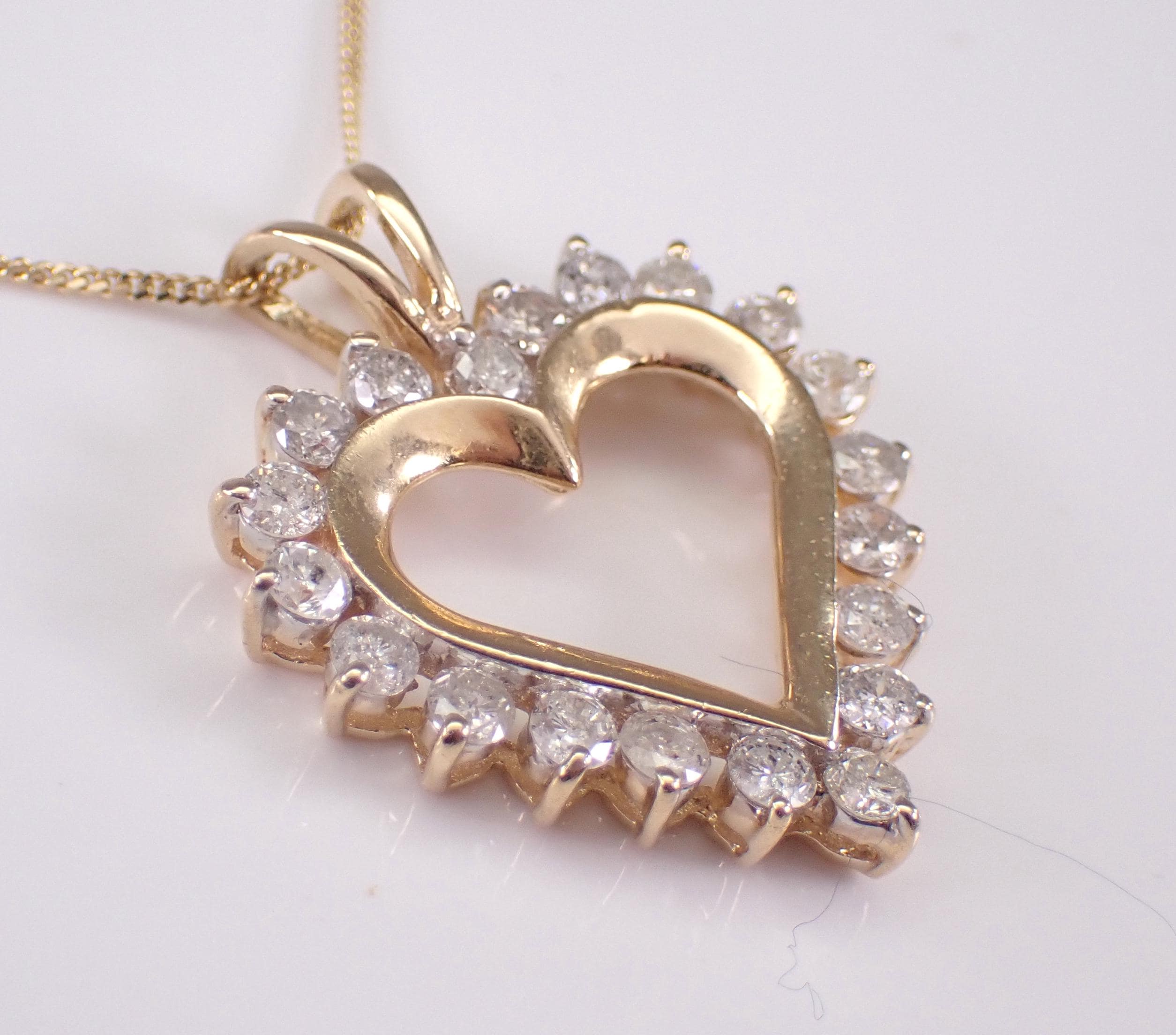 14K Yellow Gold Diamond Heart Pendant with Chain. This heart is set with twenty genuine Round Brilliant Diamonds. These diamonds are H color, SI/I1 clarity and combine to a total weight of 1.00 carat. The heart measures 20 X 21 mm without the bail and weighs 4.8 grams with the 19" included chain. The pendant and the chain are both 14K Yellow Gold and accompanied by an appraisal for insurance and authentication purposes. The necklace will be shipped promptly in a gift box.