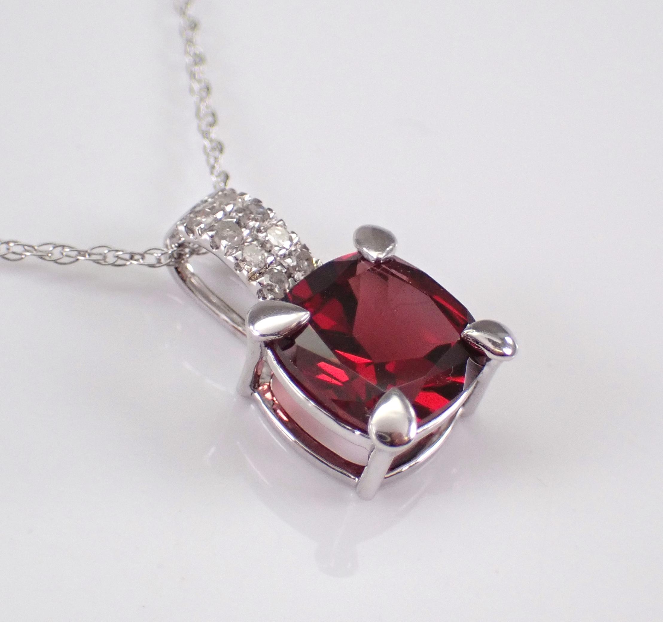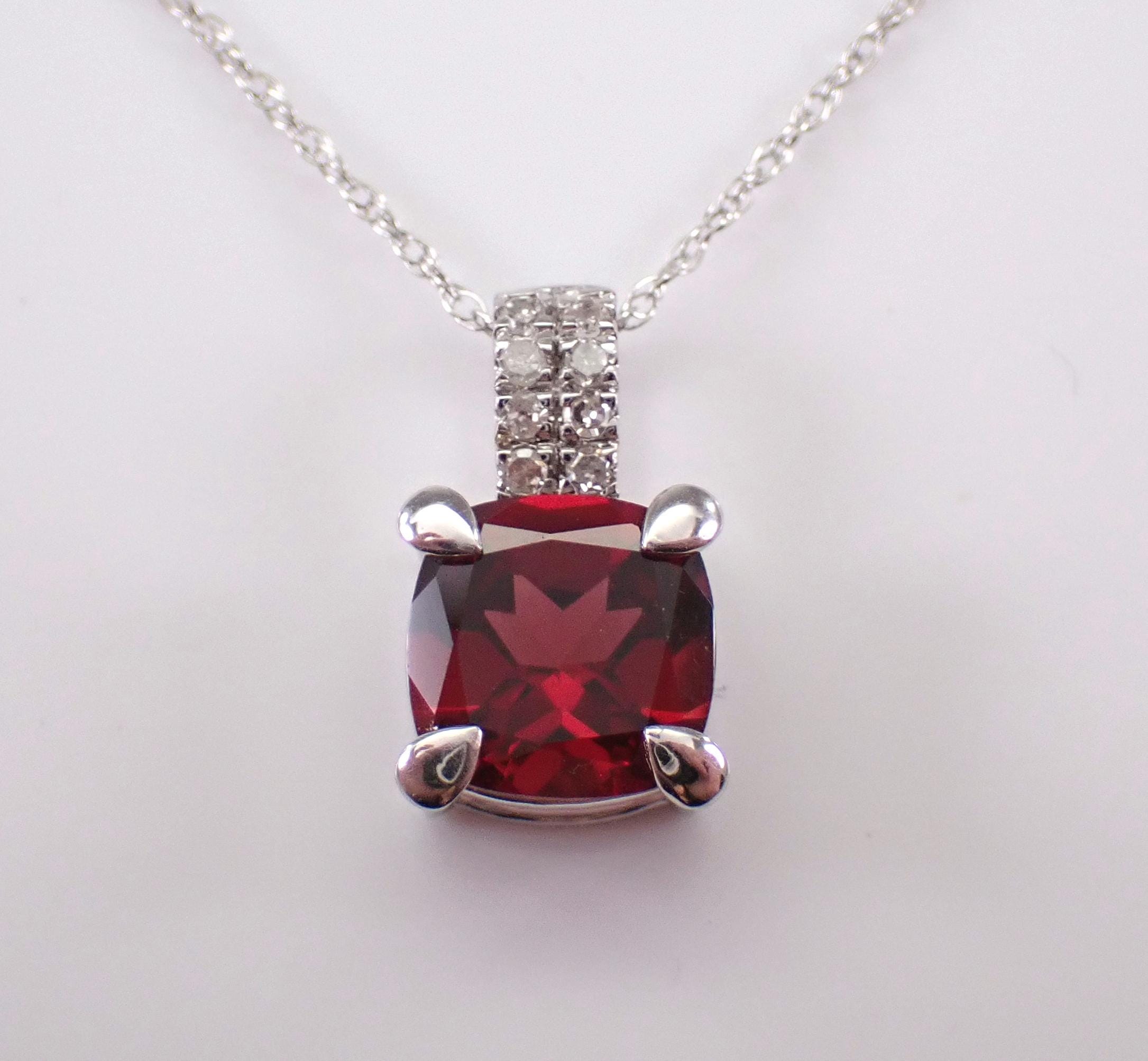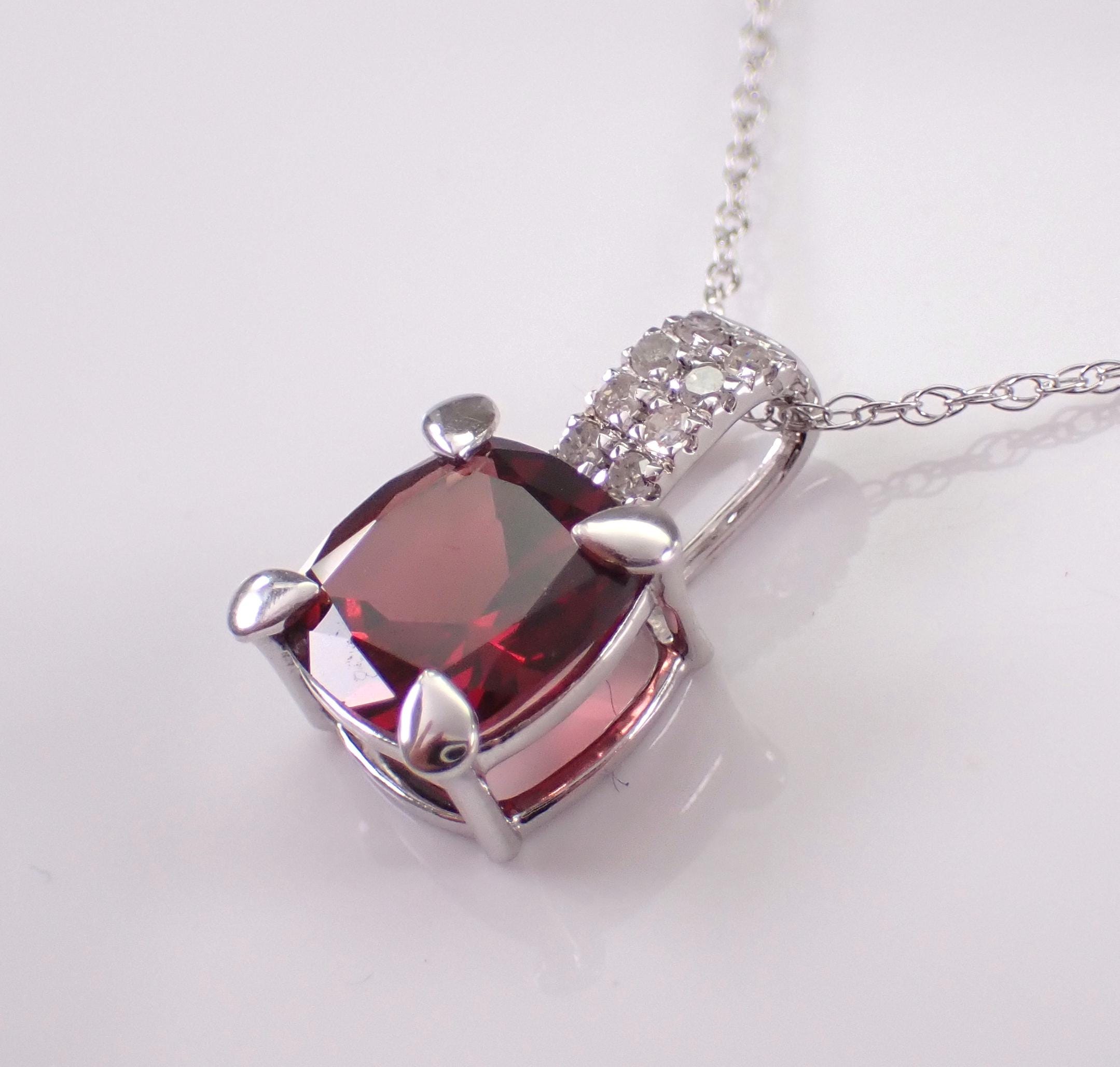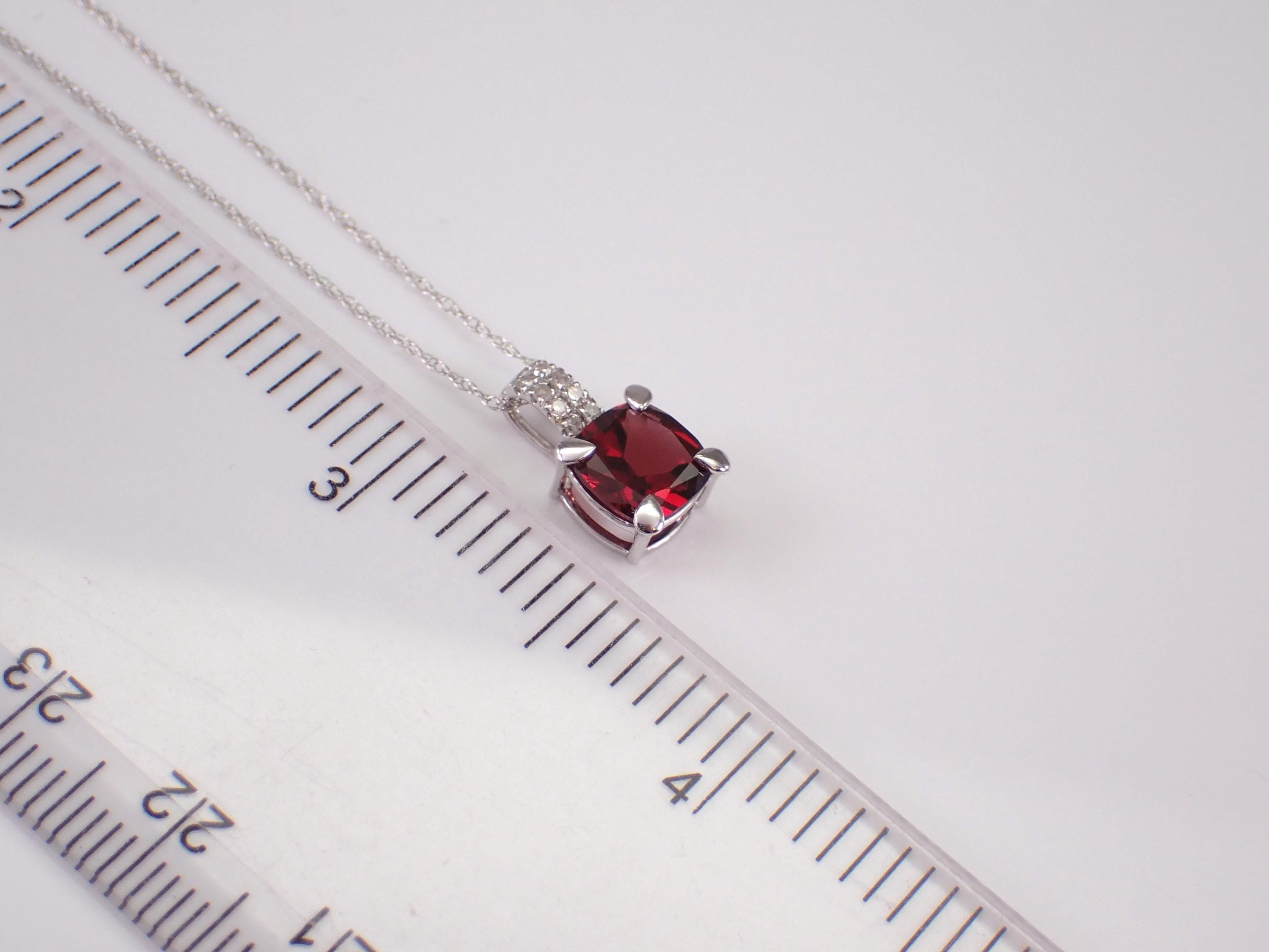 White Gold Diamond and Garnet Pendant Necklace. This pendant is set with one Cushion Cut Garnet and eight genuine natural round diamonds. These diamonds are I color, I1 clarity and weigh a total of .05 carat. The Garnet measures 7 X 7 mm and weighs 1 1/2 carats. This pendant is 10KT White Gold and comes with an 18" 10KT White Gold chain. Both the pendant and chain weigh a total of 1.2 grams and the pendant measures 13 X 7 mm. This necklace will be accompanied by an appraisal written by a GIA Certified Diamond Grader with the retail replacement value of $1,089.00. I will ship this necklace promptly in a beautiful gift box.