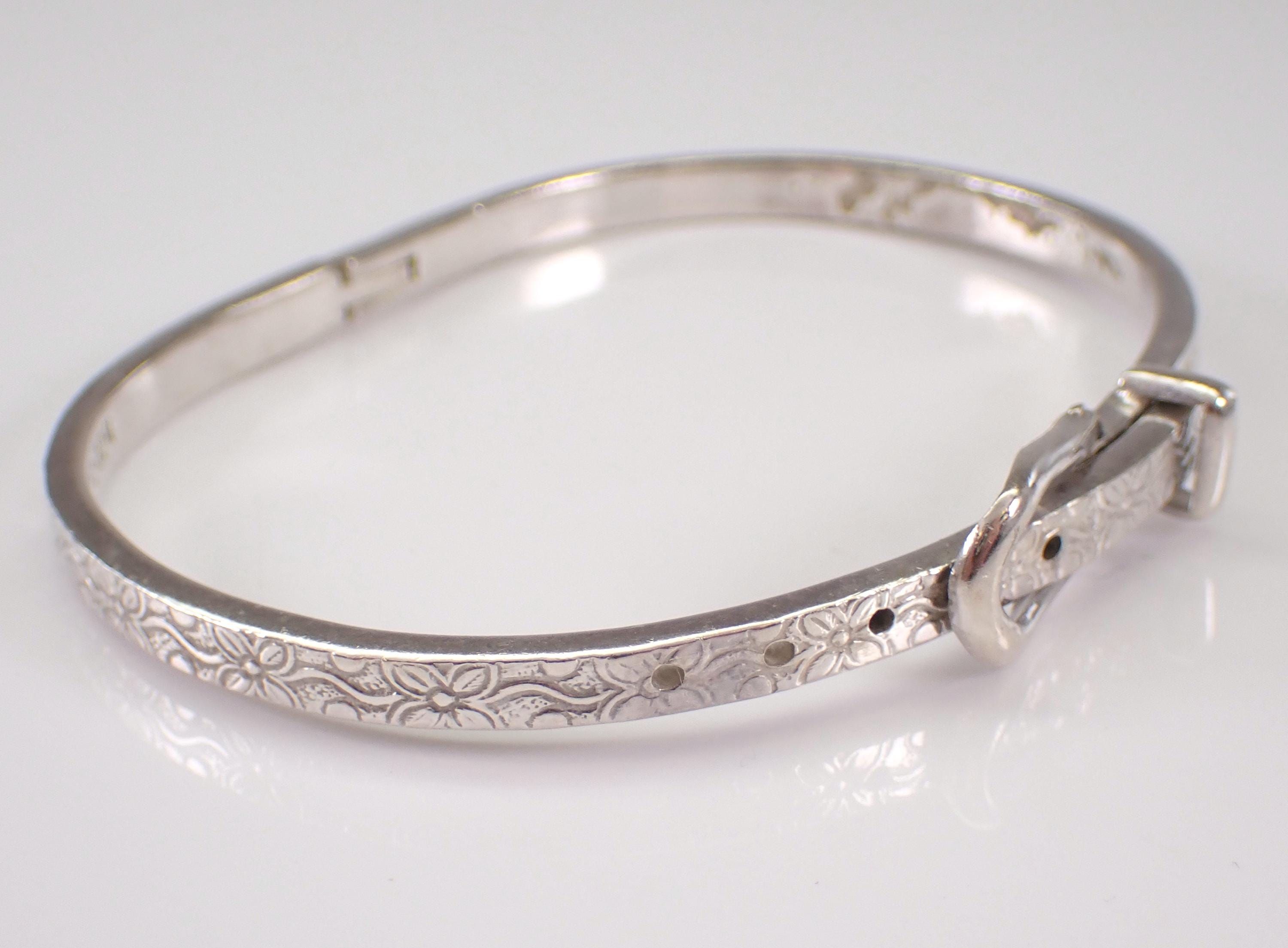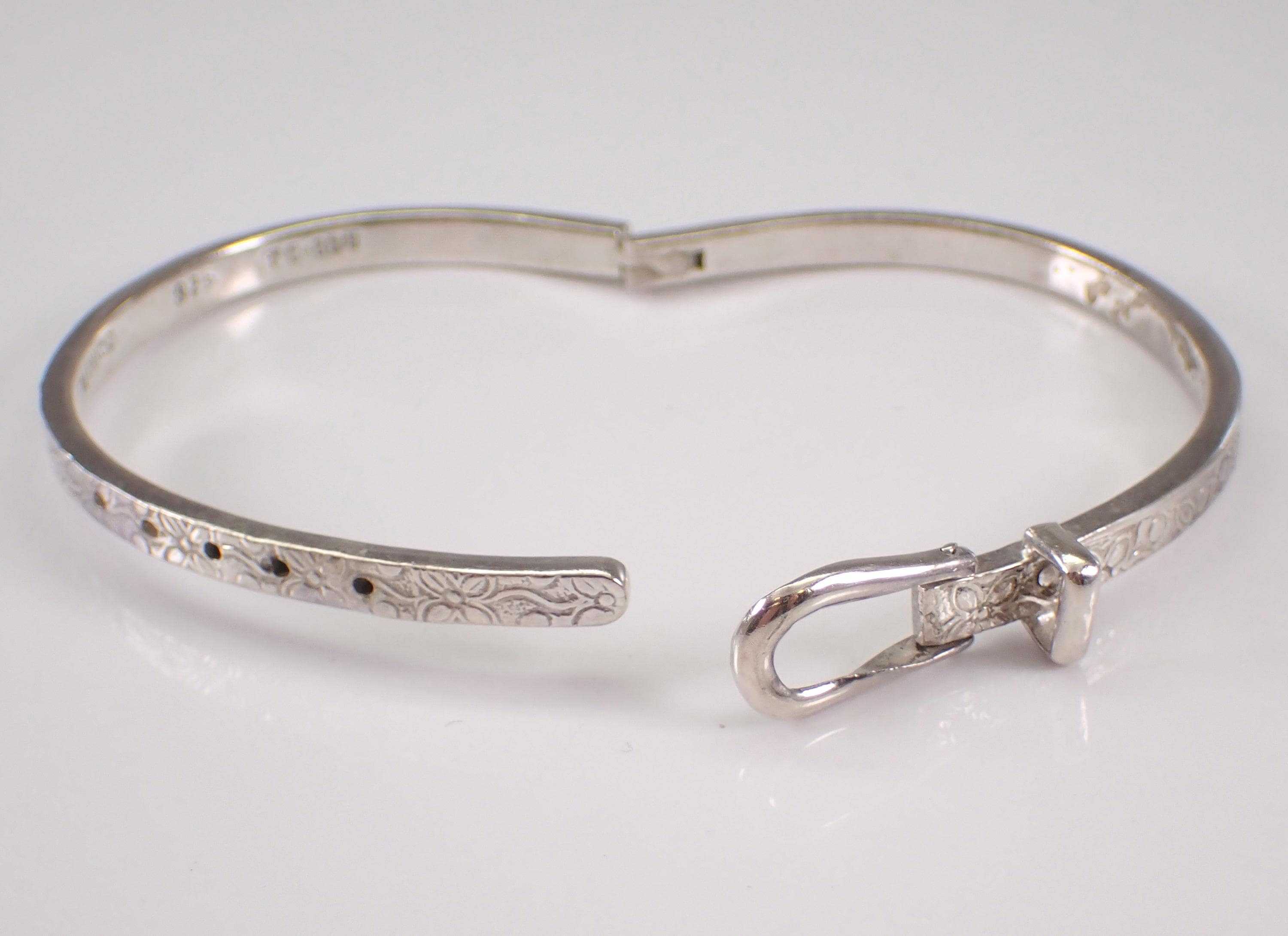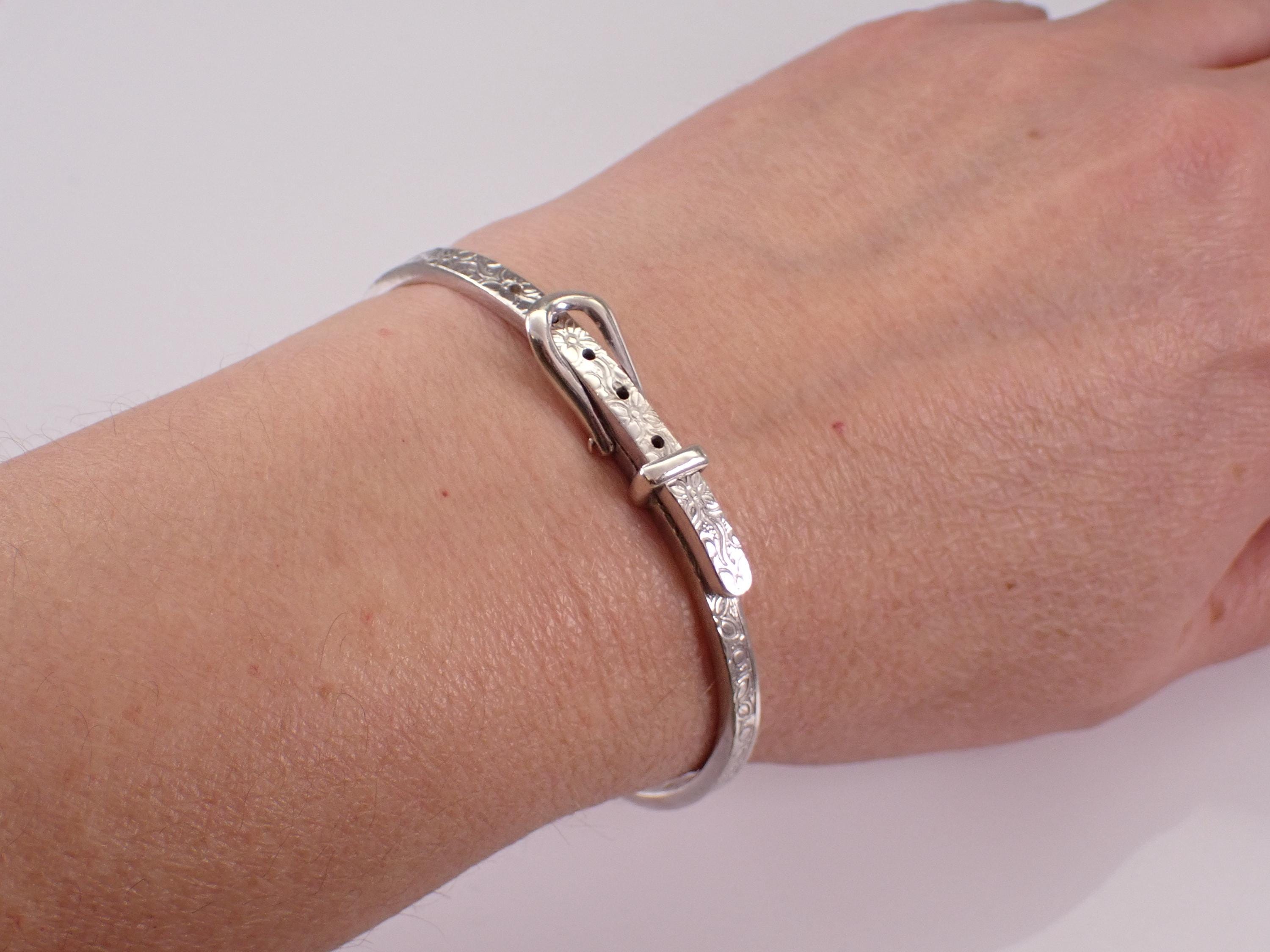 Vintage Sterling Silver Belt Buckle Bangle Bracelet. This bracelet is sterling silver, weighs 19.5 grams, measures 4 mm in width and fits a standard ladies wrist but is also self adjustable by moving the clasp at different notches. This bracelet is perfect for everyday wear or any special occasion, like Mothers Day, Birthday, Anniversary, Graduation, etc. The Bracelet will be shipped promptly in a gift pouch.
