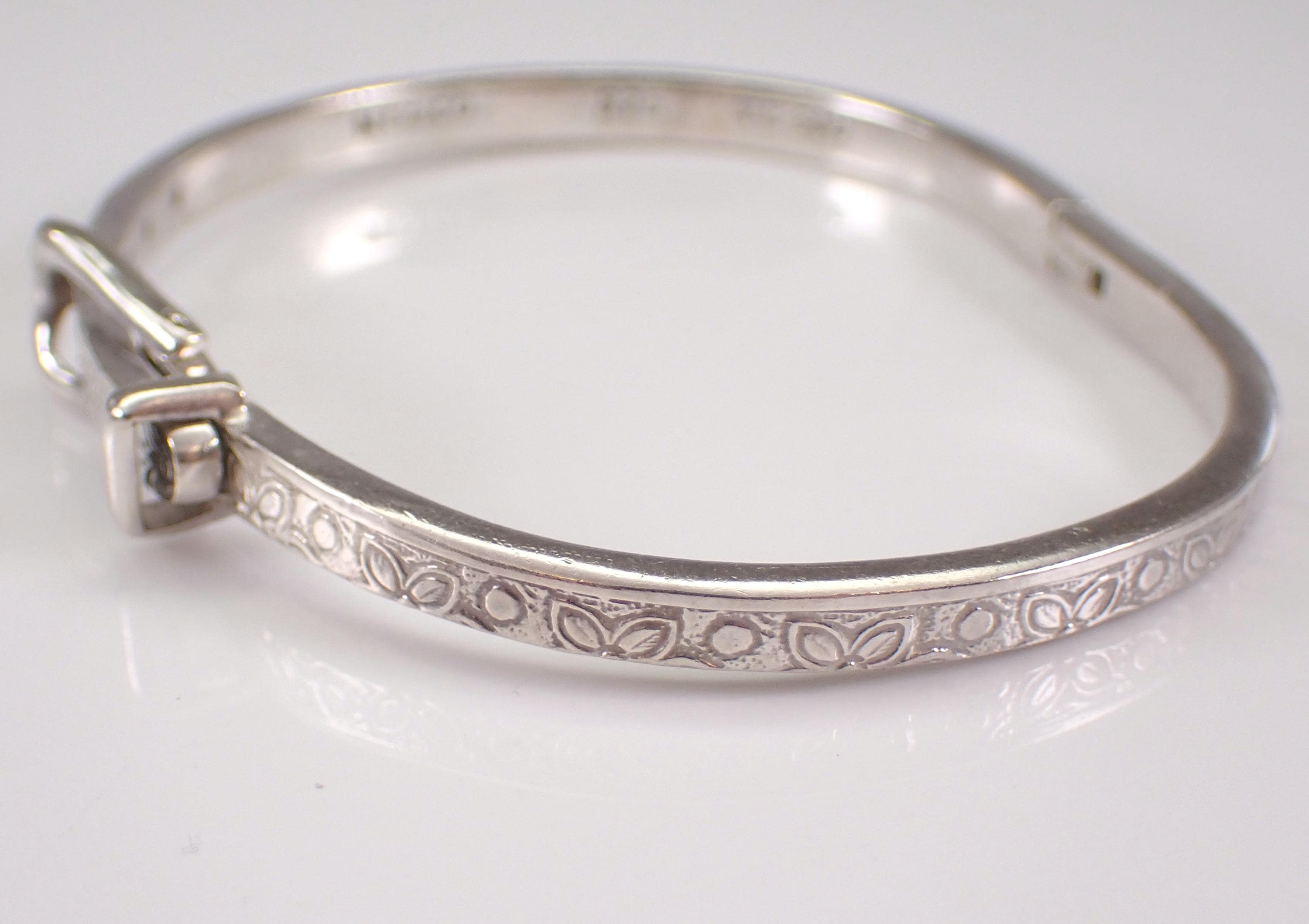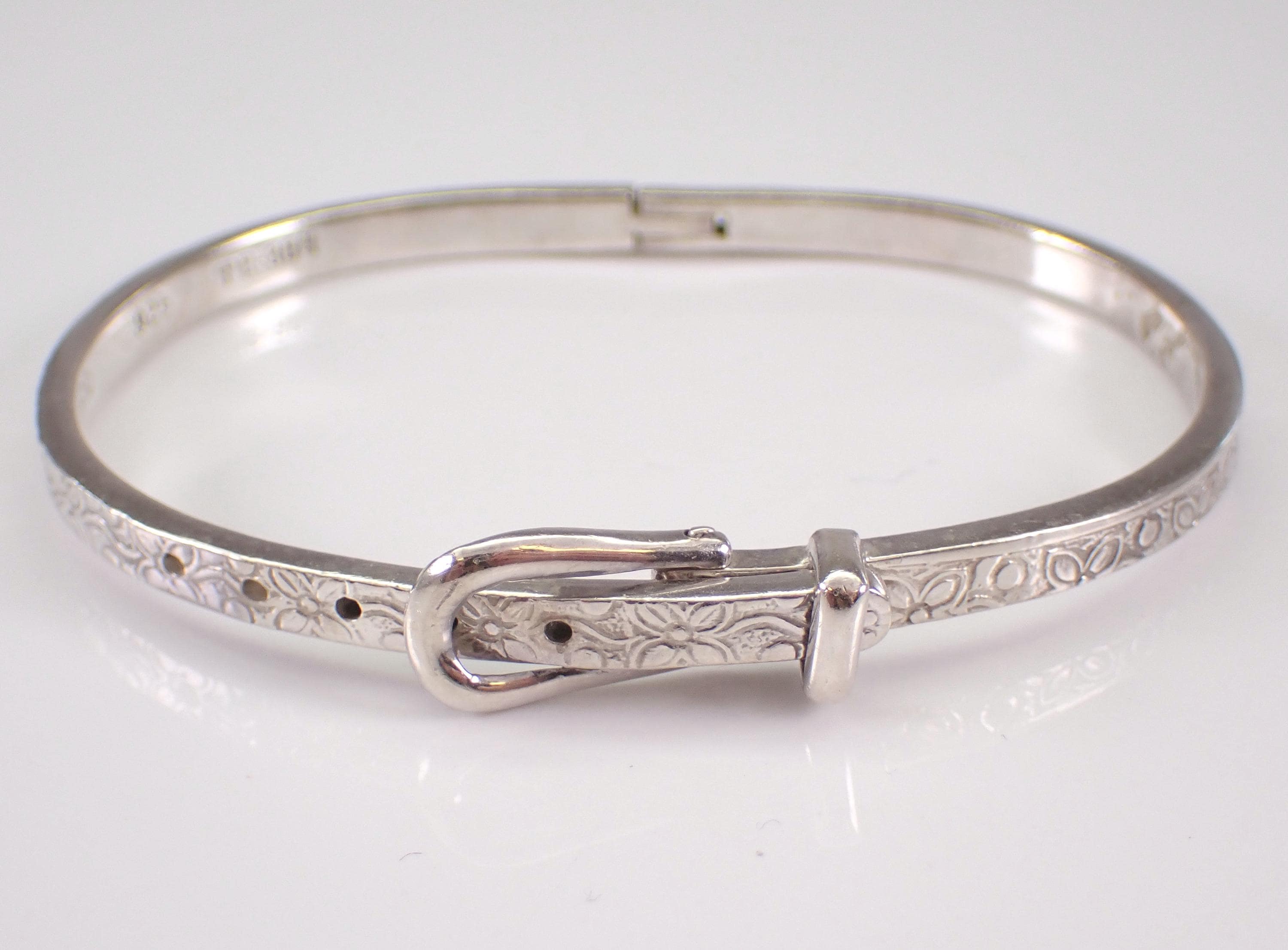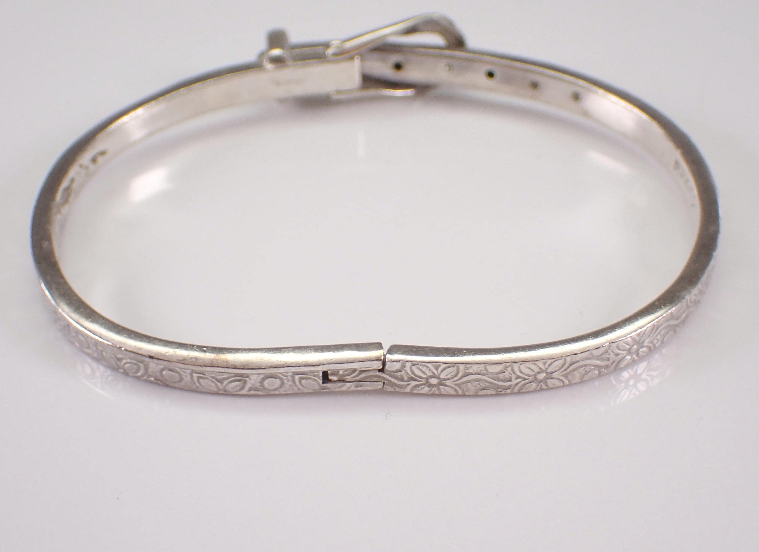 Vintage Sterling Silver Belt Buckle Bangle Bracelet. This bracelet is sterling silver, weighs 19.5 grams, measures 4 mm in width and fits a standard ladies wrist but is also self adjustable by moving the clasp at different notches. This bracelet is perfect for everyday wear or any special occasion, like Mothers Day, Birthday, Anniversary, Graduation, etc. The Bracelet will be shipped promptly in a gift pouch.