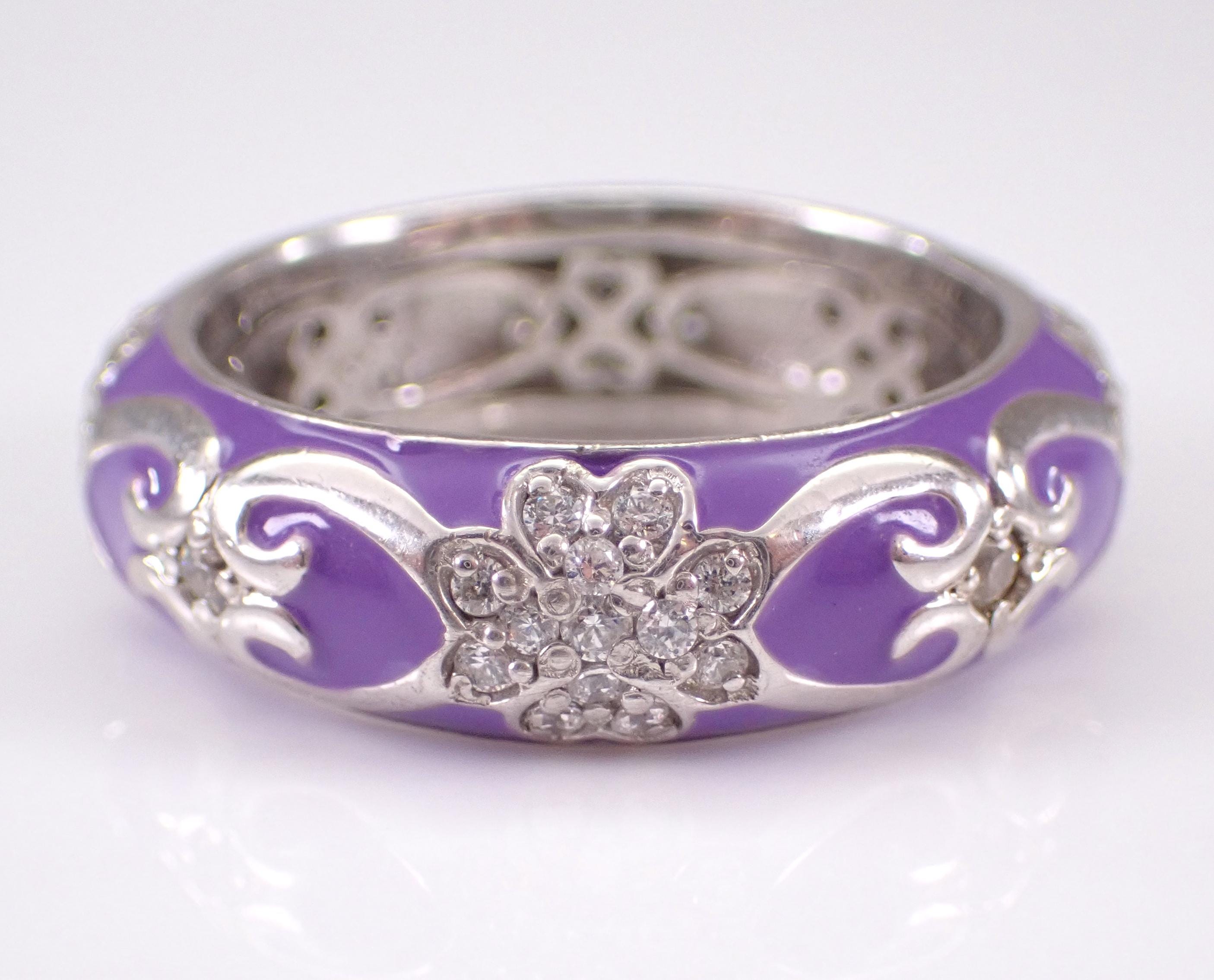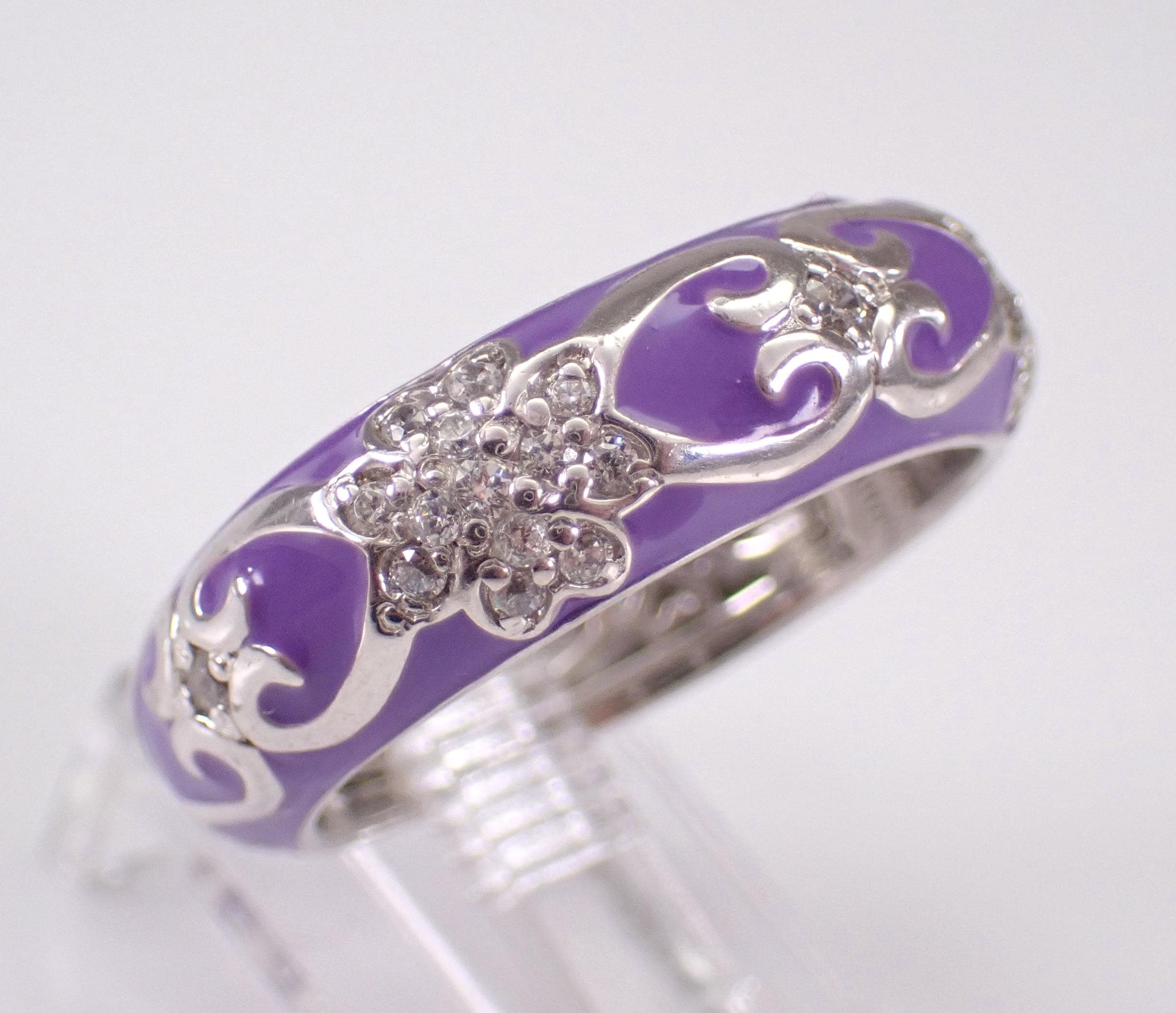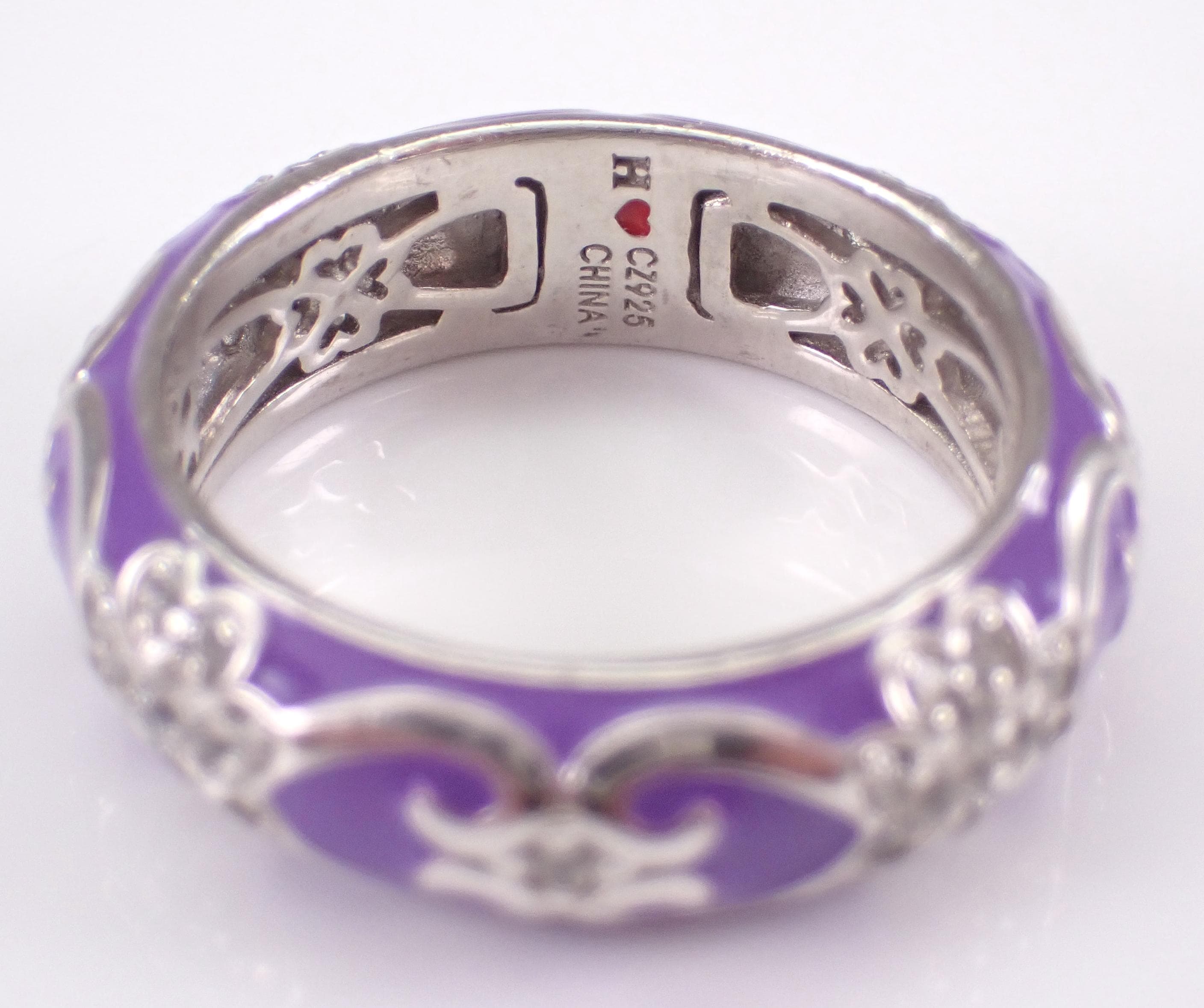 Vintage Sterling Silver Purple Enamel and Cubic Zirconia (CZ) ring. This ring is in very good, like new condition, is finger size 8, measures 6.5 mm in width and weighs 6.7 grams. This ring has a hallmark inside of an H and a heart which is Hidalgo Silver collection. This ring will be shipped promptly in a gift pouch, not the original pouch.
