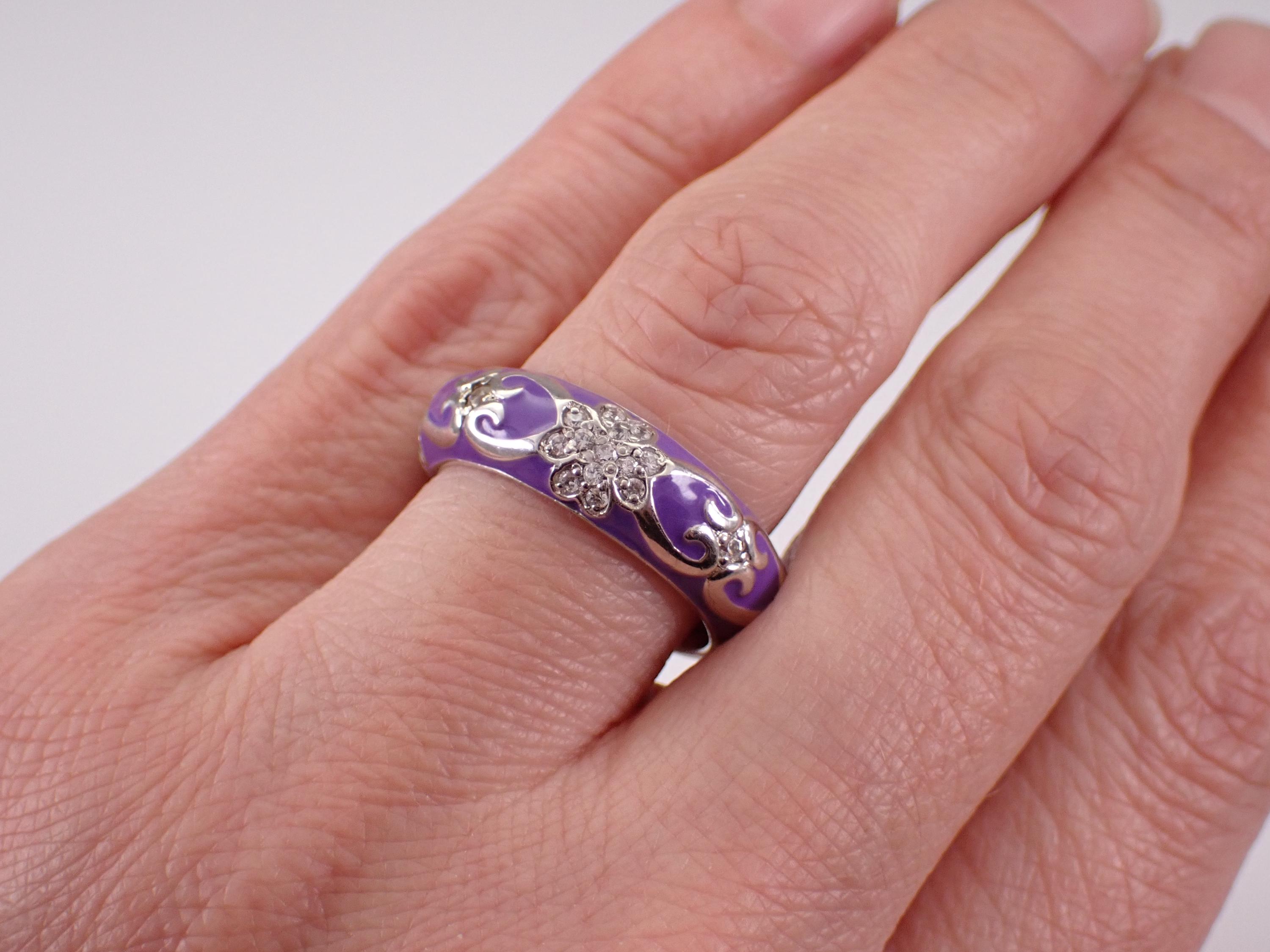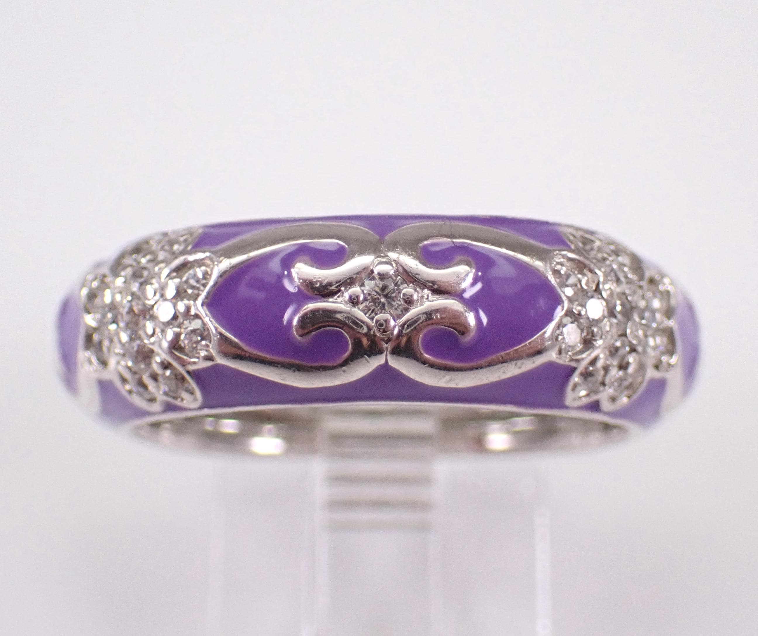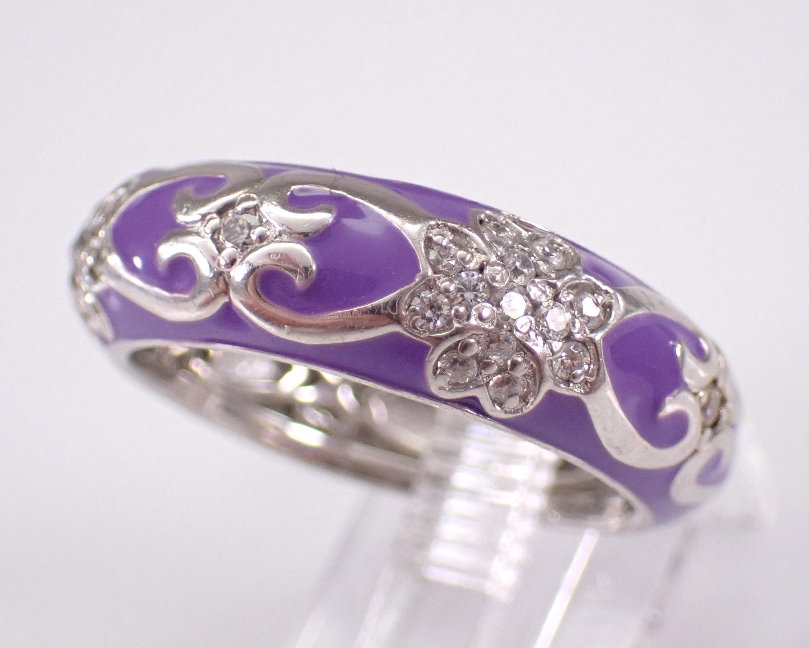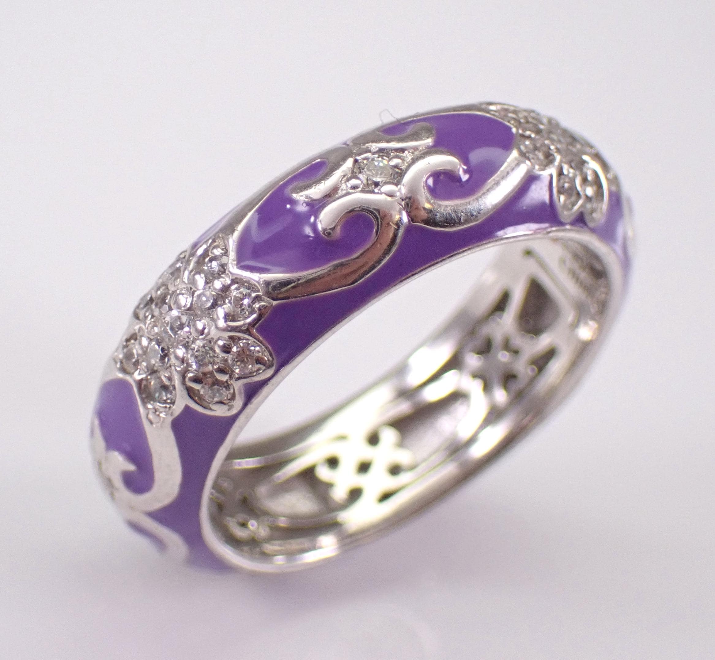 Vintage Sterling Silver Purple Enamel and Cubic Zirconia (CZ) ring. This ring is in very good, like new condition, is finger size 8, measures 6.5 mm in width and weighs 6.7 grams. This ring has a hallmark inside of an H and a heart which is Hidalgo Silver collection. This ring will be shipped promptly in a gift pouch, not the original pouch.