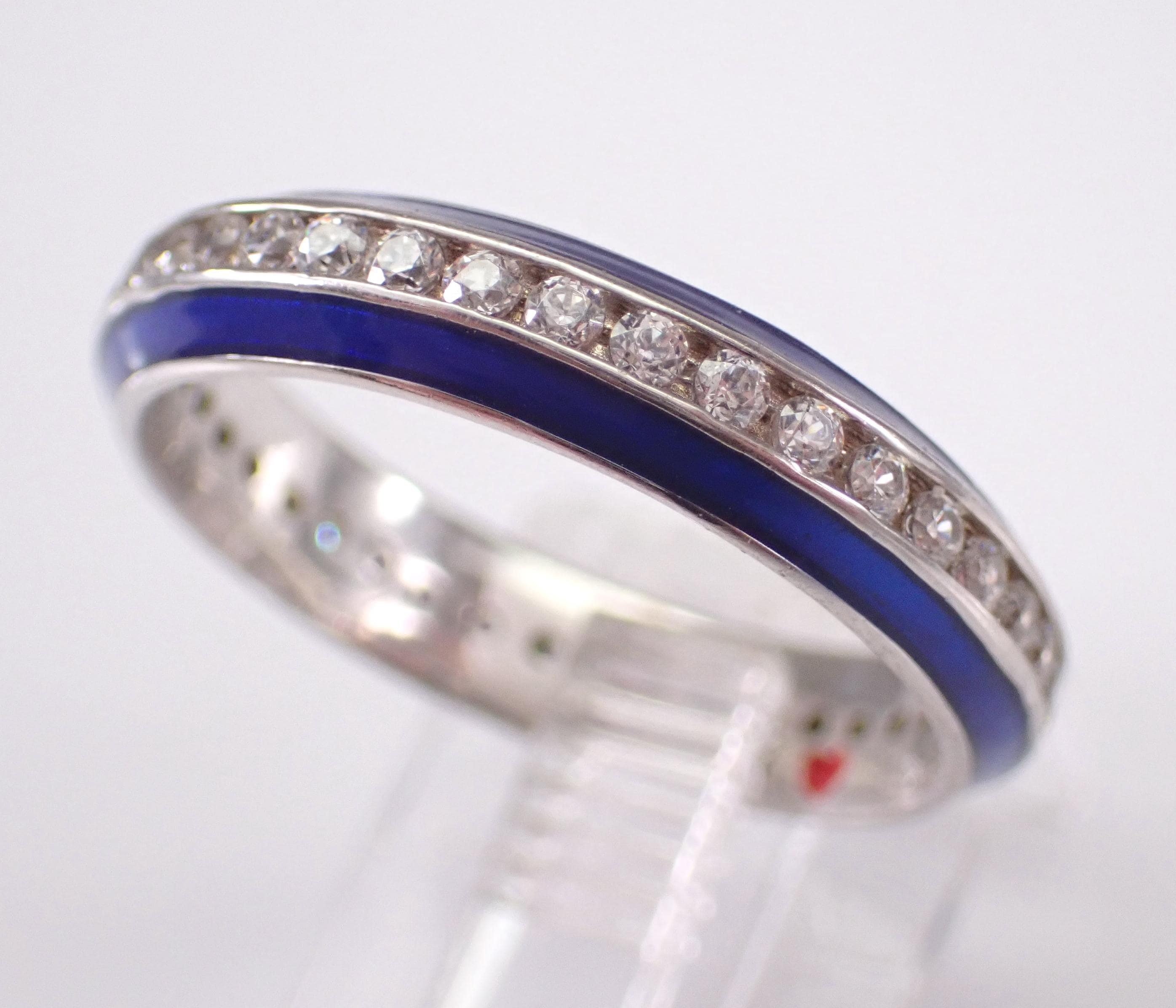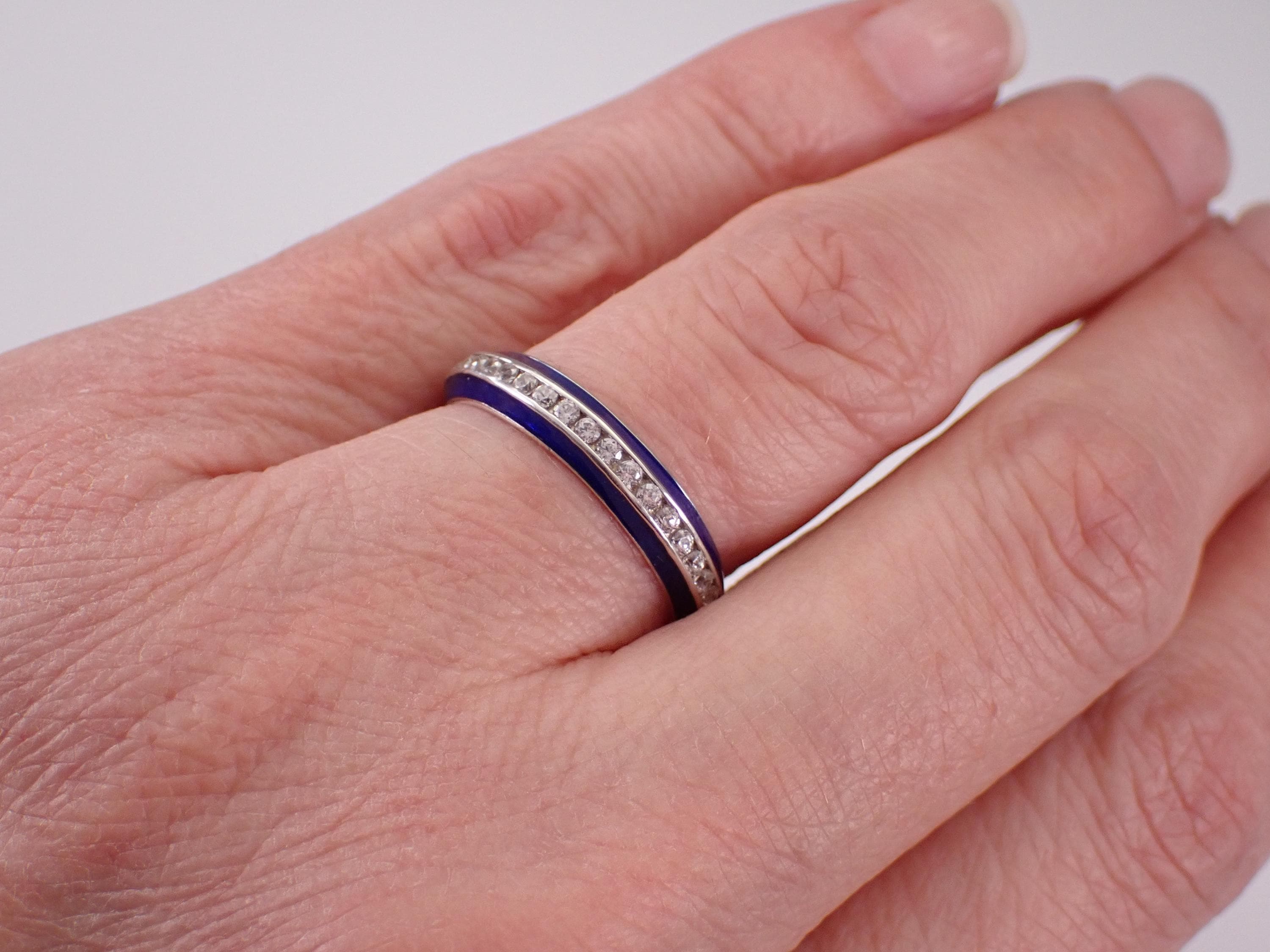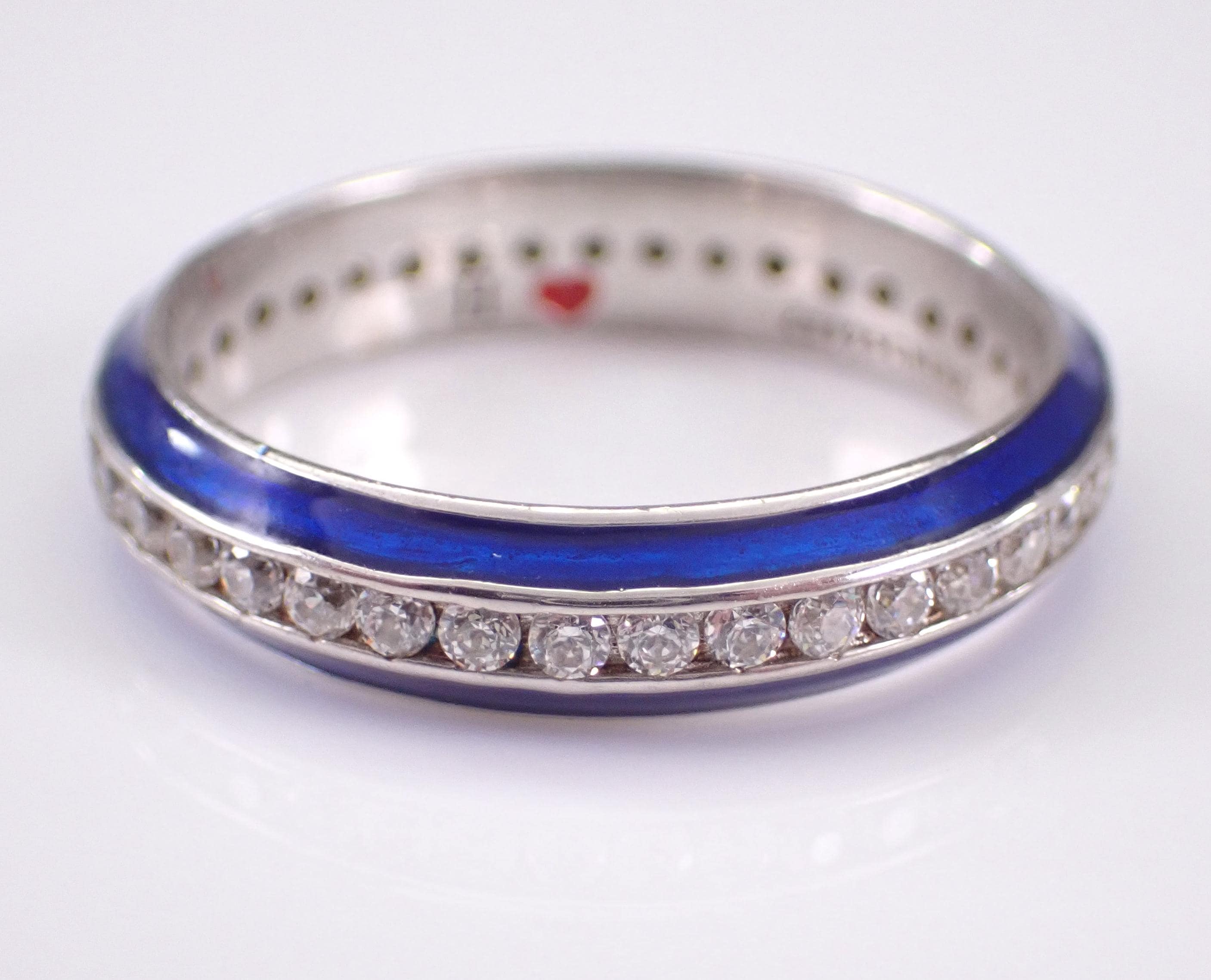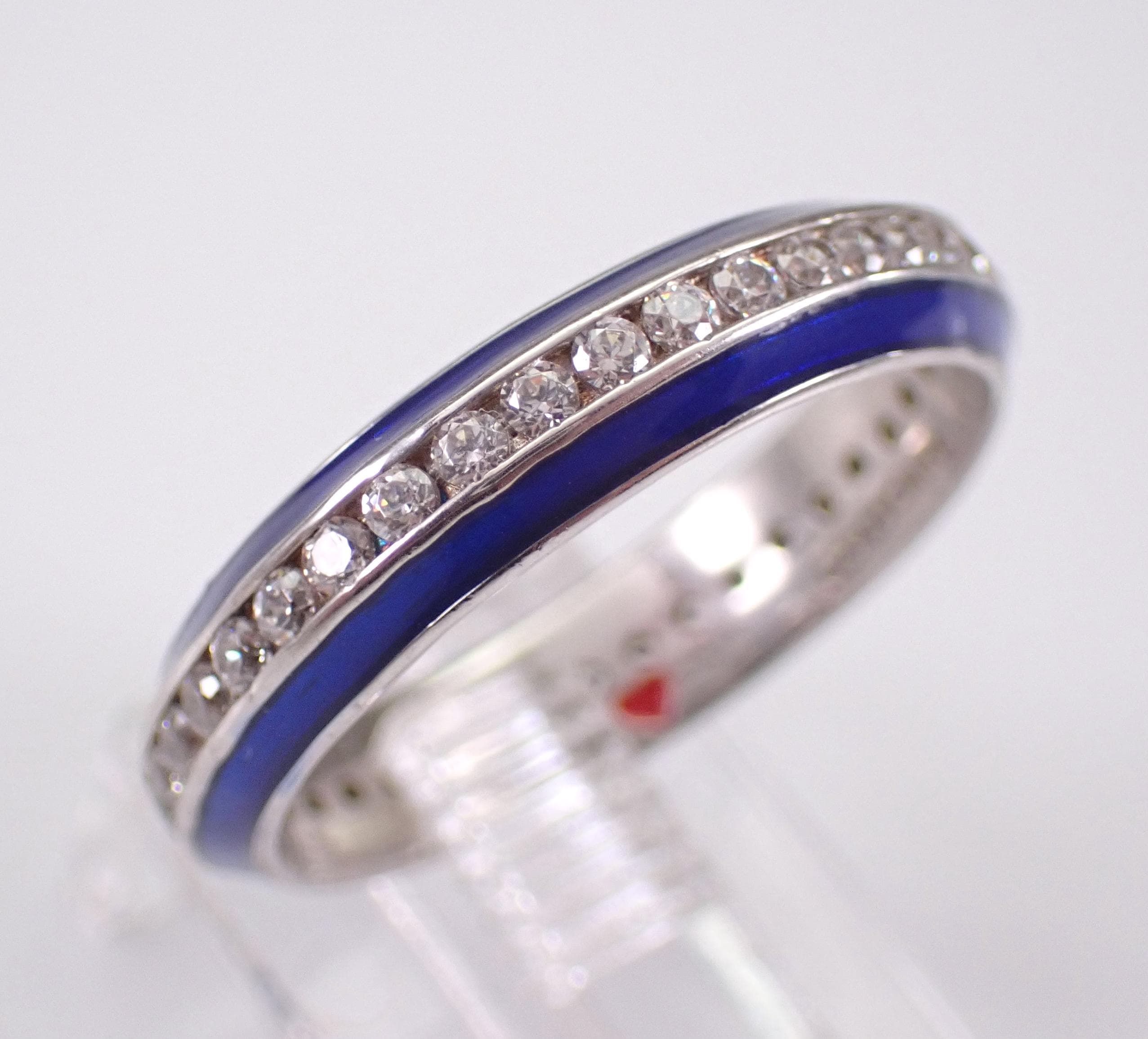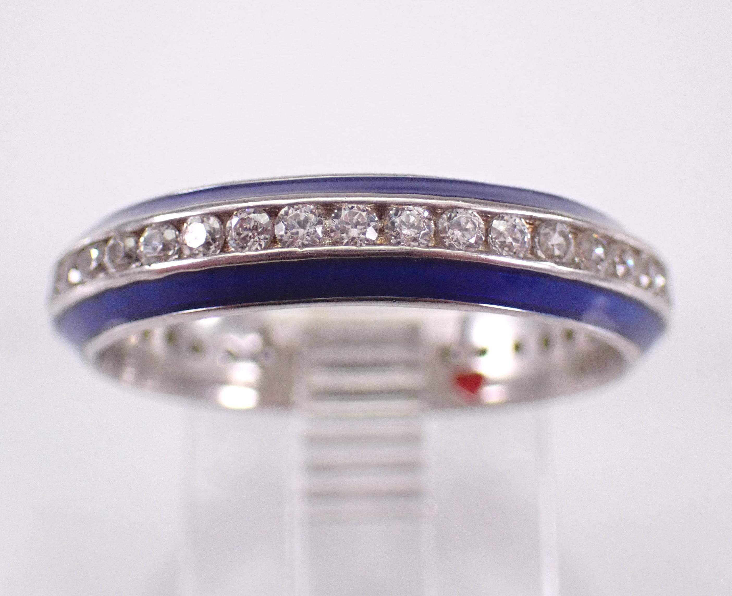 Vintage Sterling Silver Blue Enamel and Cubic Zirconia (CZ) ring. This ring is in very good, like new condition, is finger size 7 1/4, measures 4 mm in width and weighs 2.7 grams. This ring has a hallmark inside of an H and a heart which is Hidalgo Silver collection. This ring will be shipped promptly in a gift pouch, not the original pouch.
