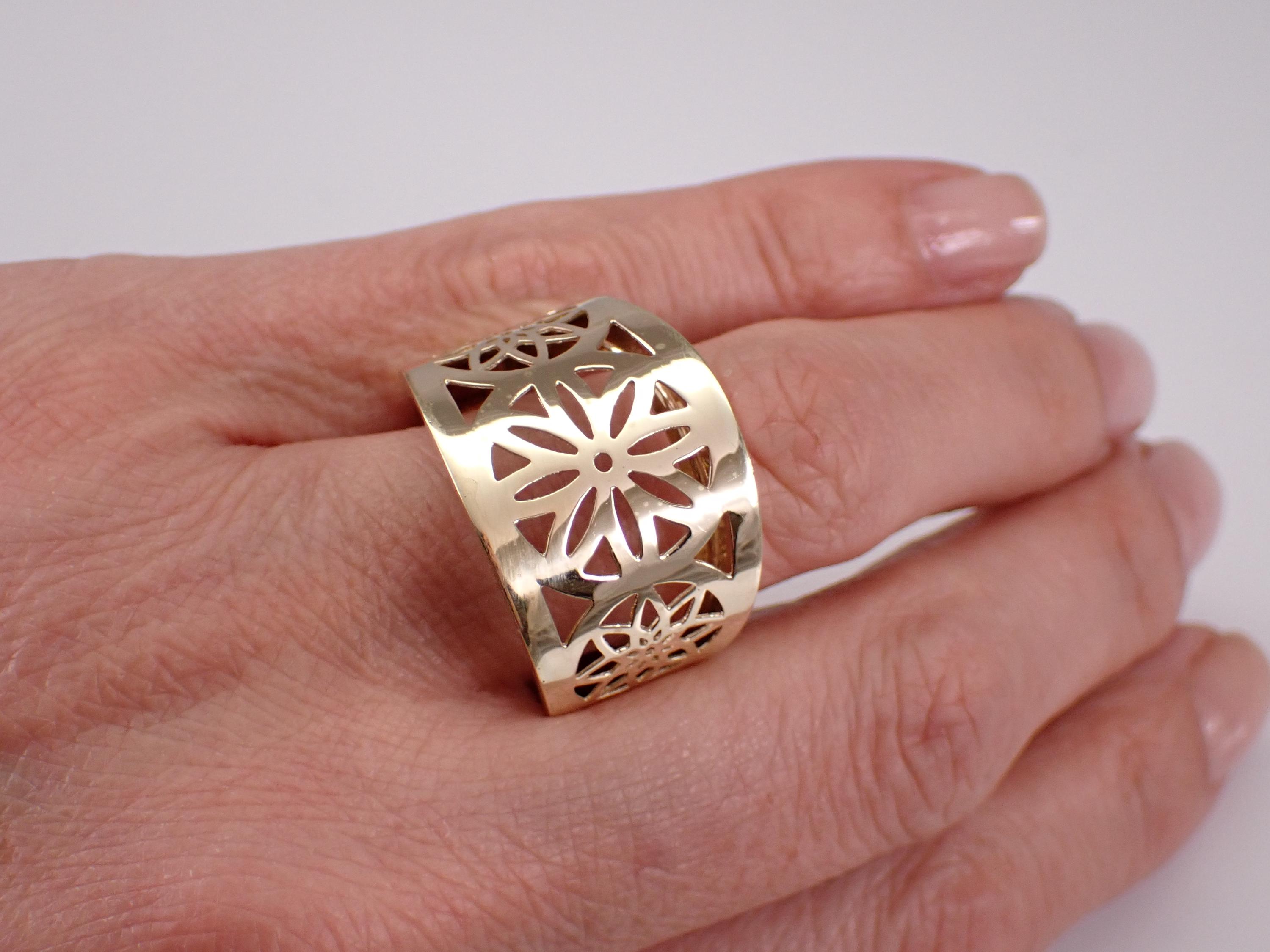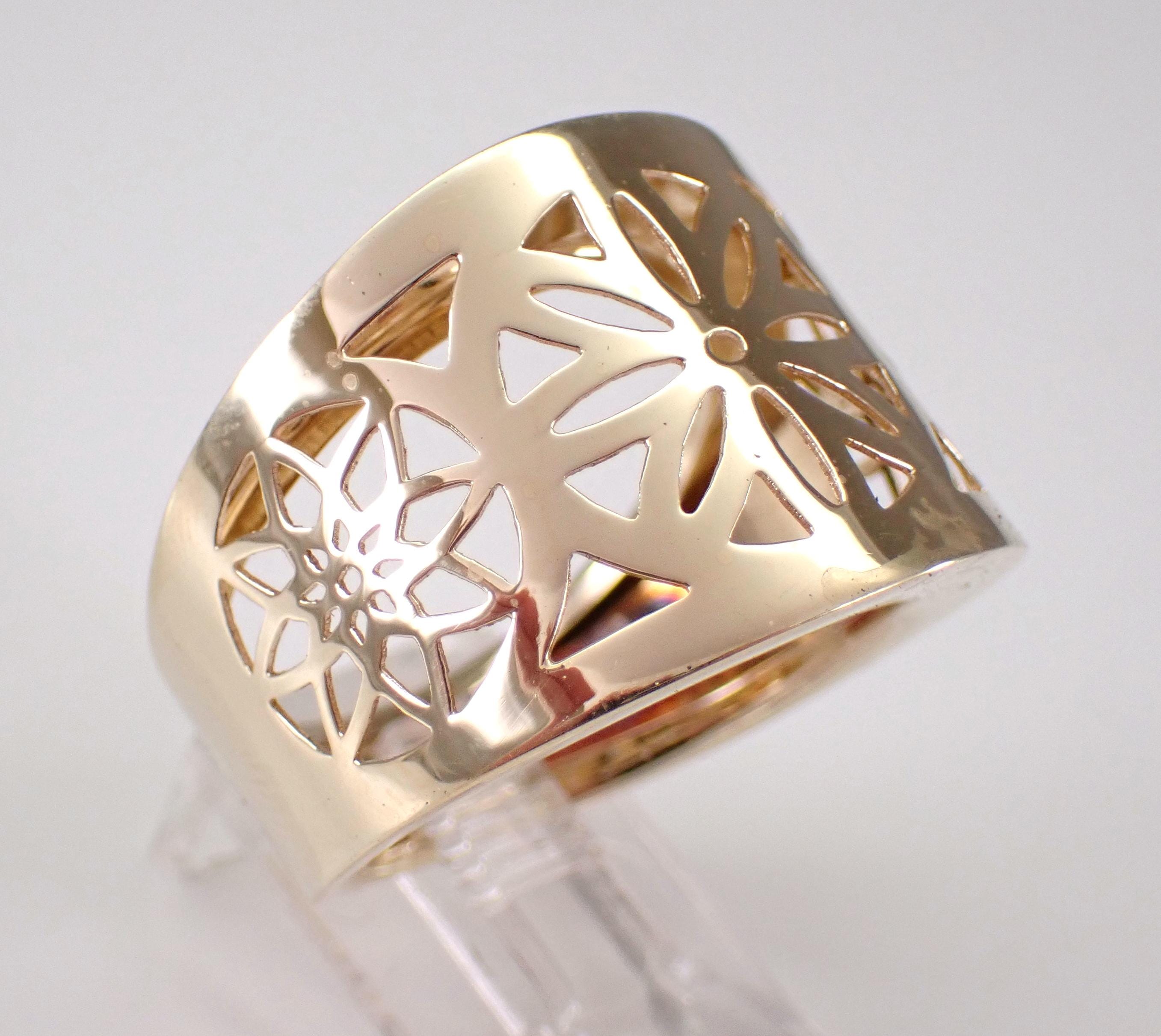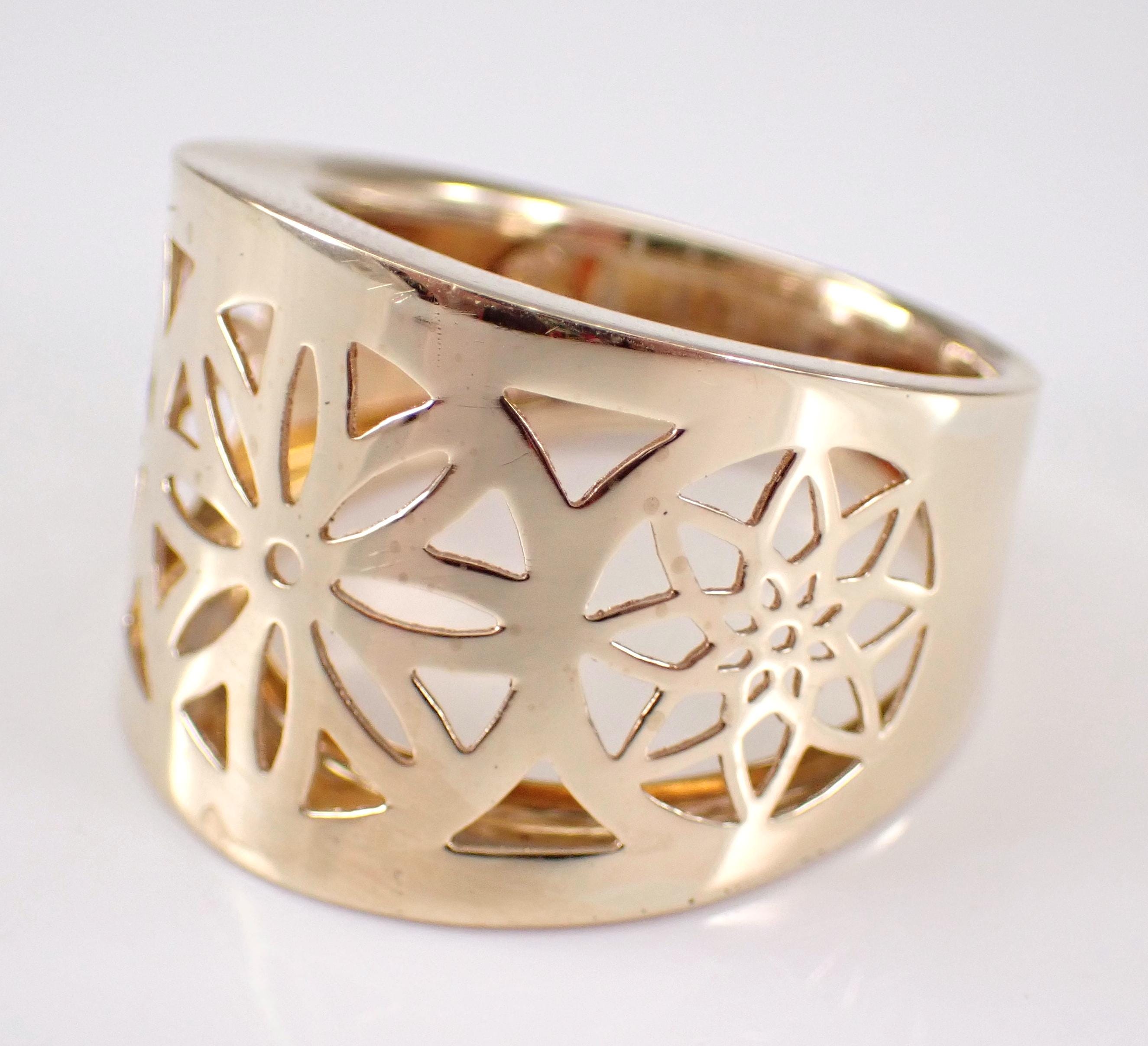 14K Yellow Gold Vintage Estate Flower Ring. This ring weighs 5.3 grams, measures 18.5 mm in width at its widest point and is a finger size 10, can be slightly resized (please inquire about sizing with the finger size you need). This ring dates back to Circa 1980's and has a dainty unique filigree flower design throughout the front. I will ship this ring promptly in a beautiful gift box accompanied by an appraisal for insurance and authentication purposes.