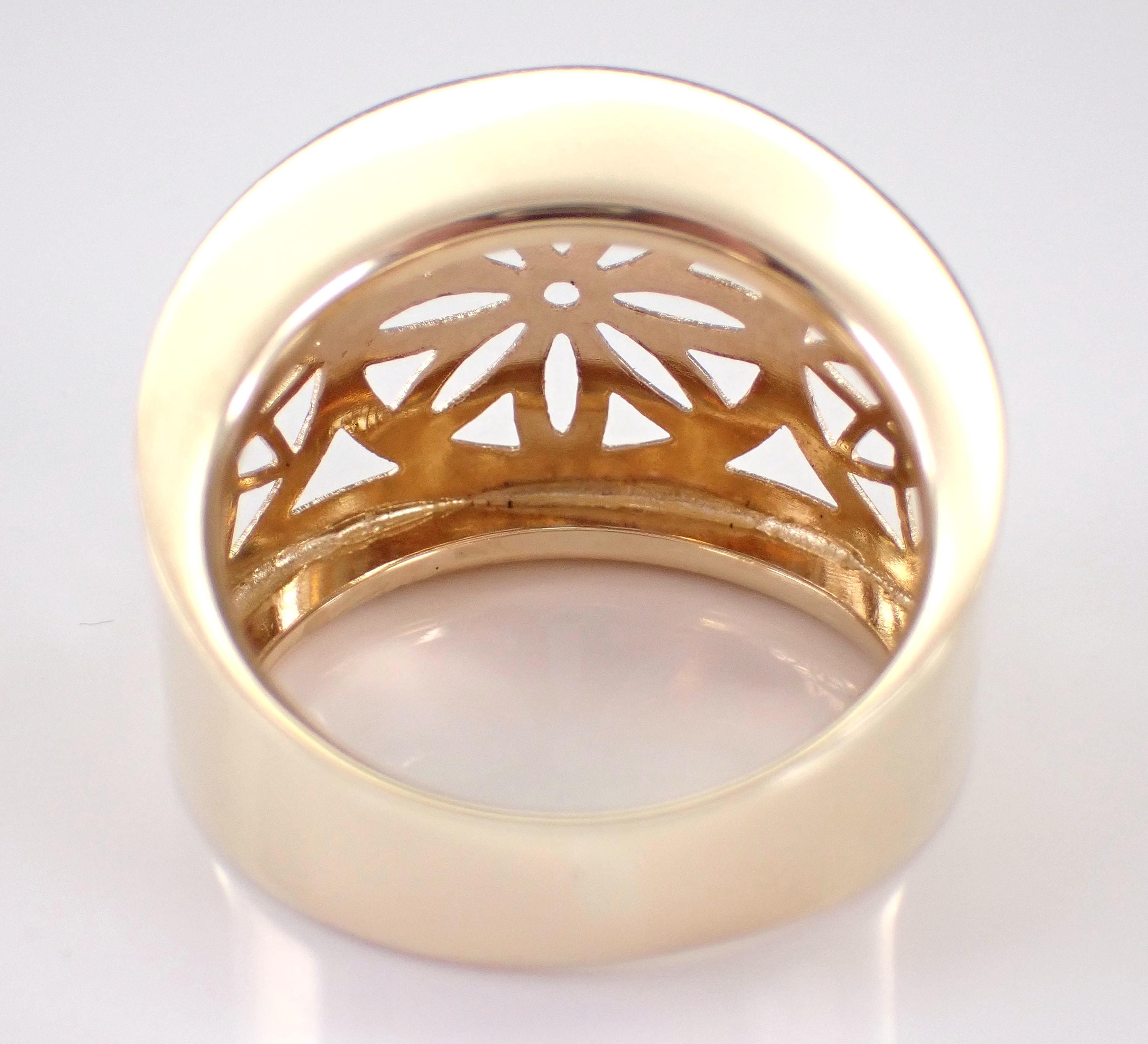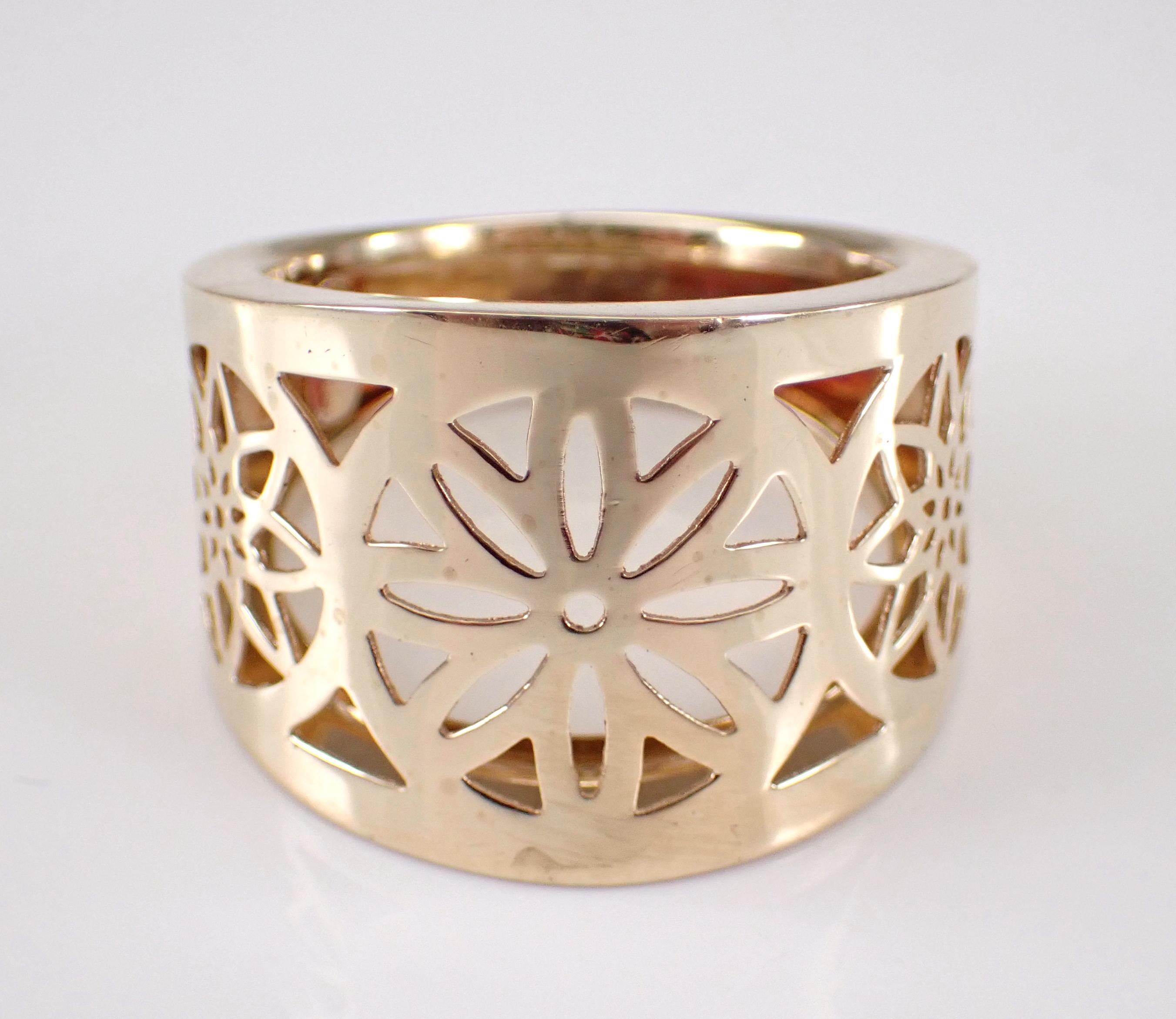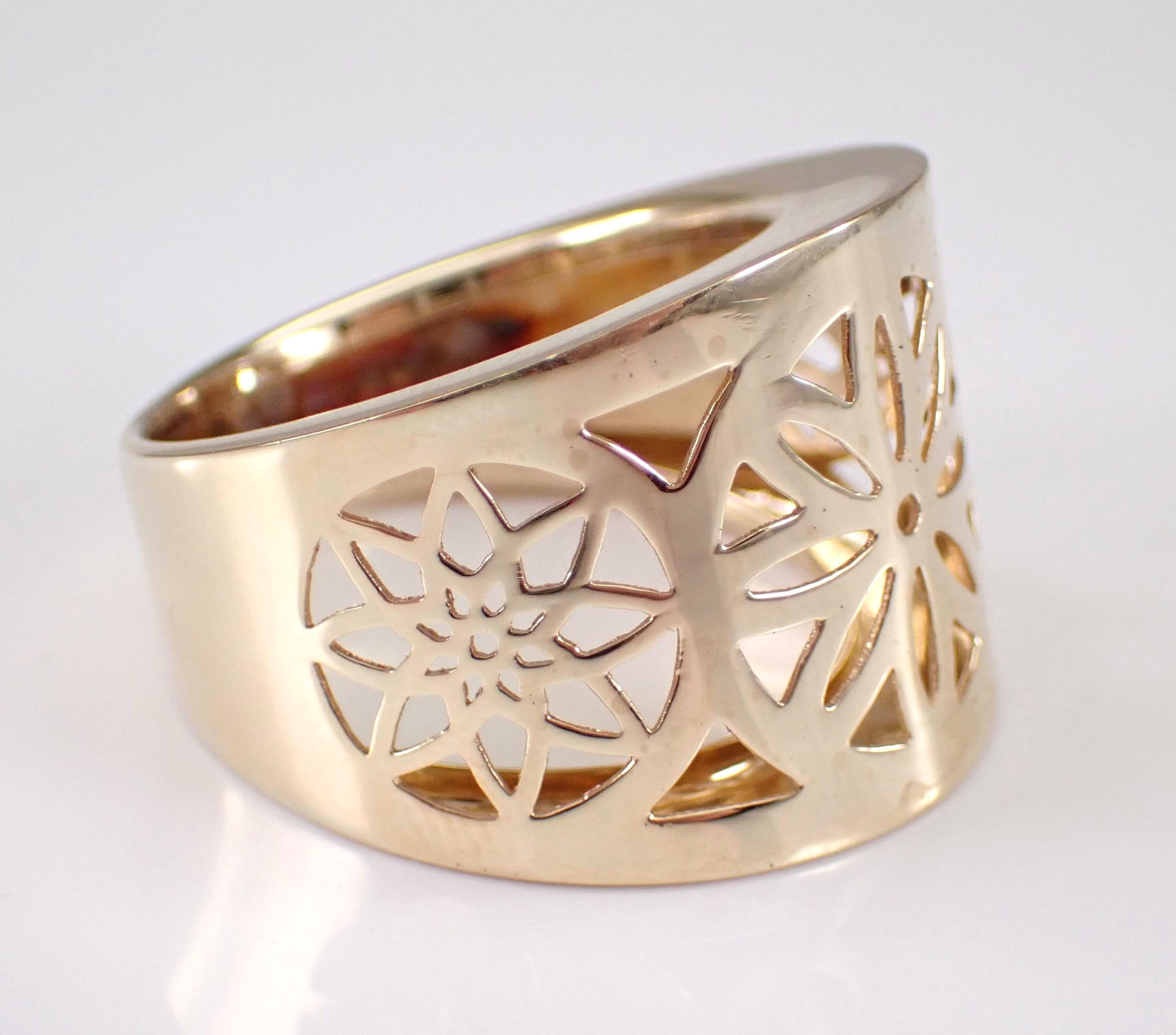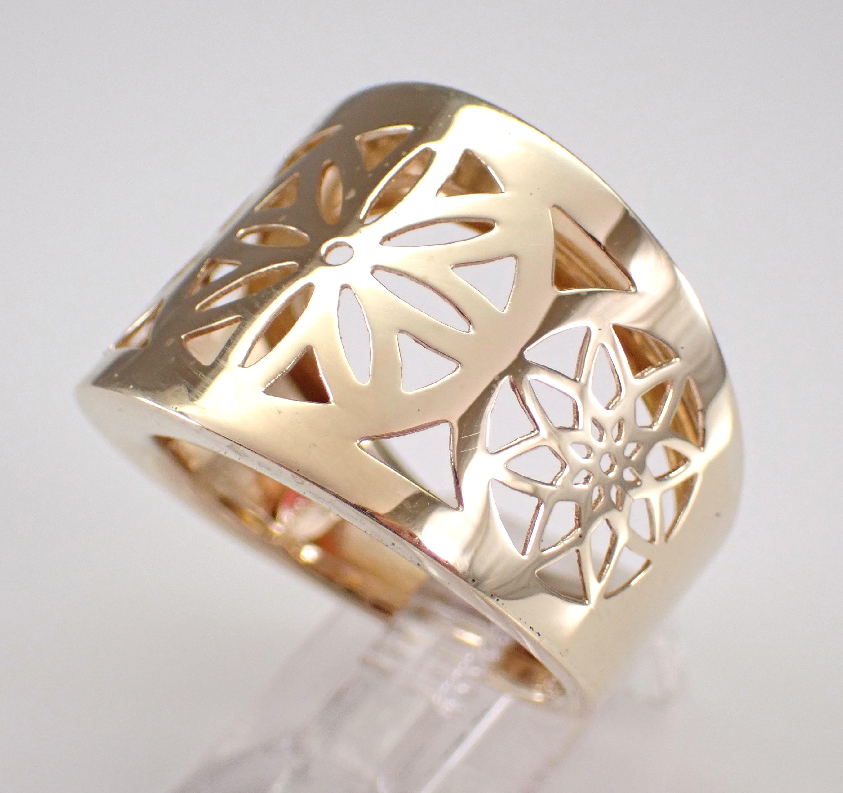 14K Yellow Gold Vintage Estate Flower Ring. This ring weighs 5.3 grams, measures 18.5 mm in width at its widest point and is a finger size 10, can be slightly resized (please inquire about sizing with the finger size you need). This ring dates back to Circa 1980's and has a dainty unique filigree flower design throughout the front. I will ship this ring promptly in a beautiful gift box accompanied by an appraisal for insurance and authentication purposes.