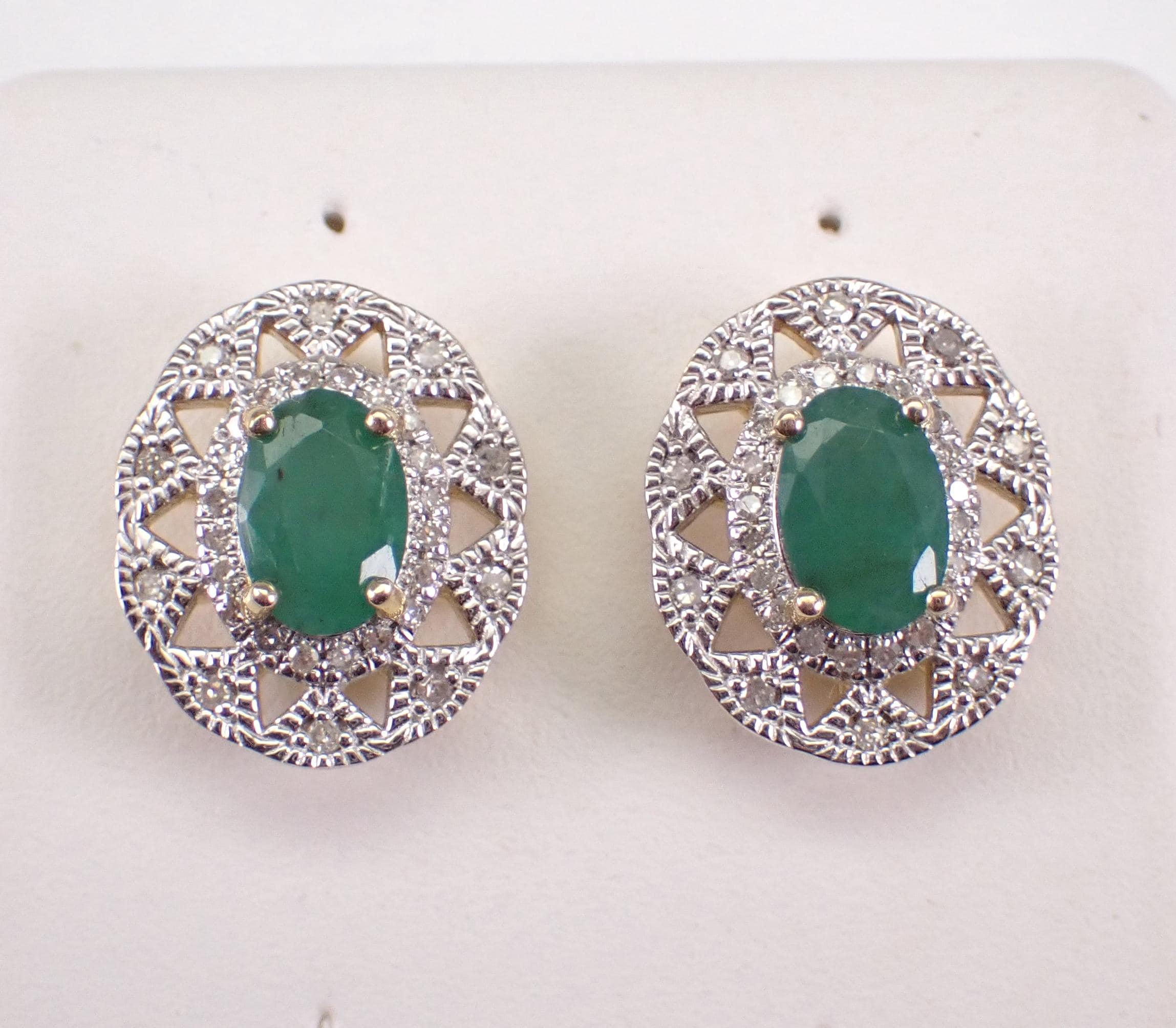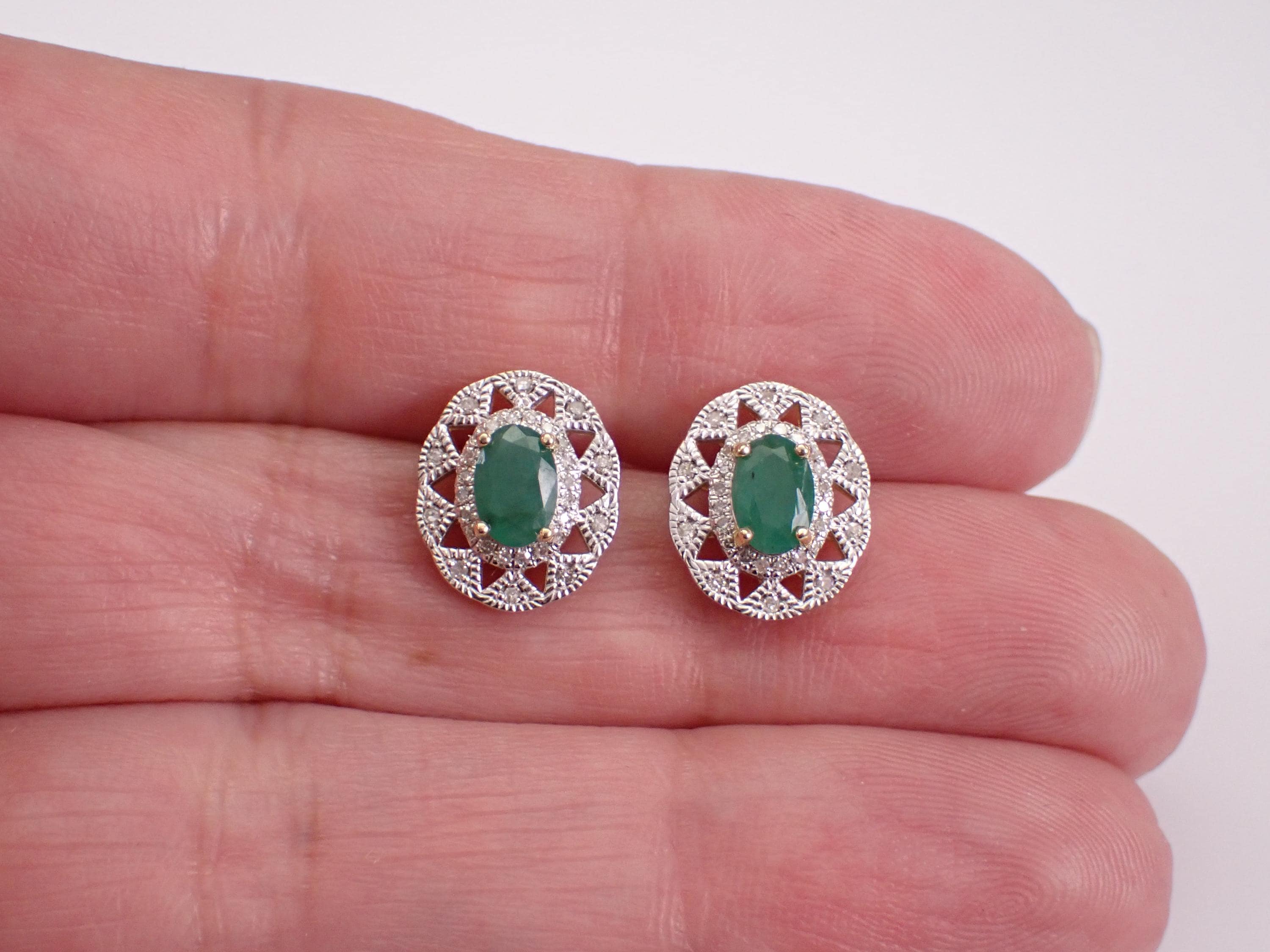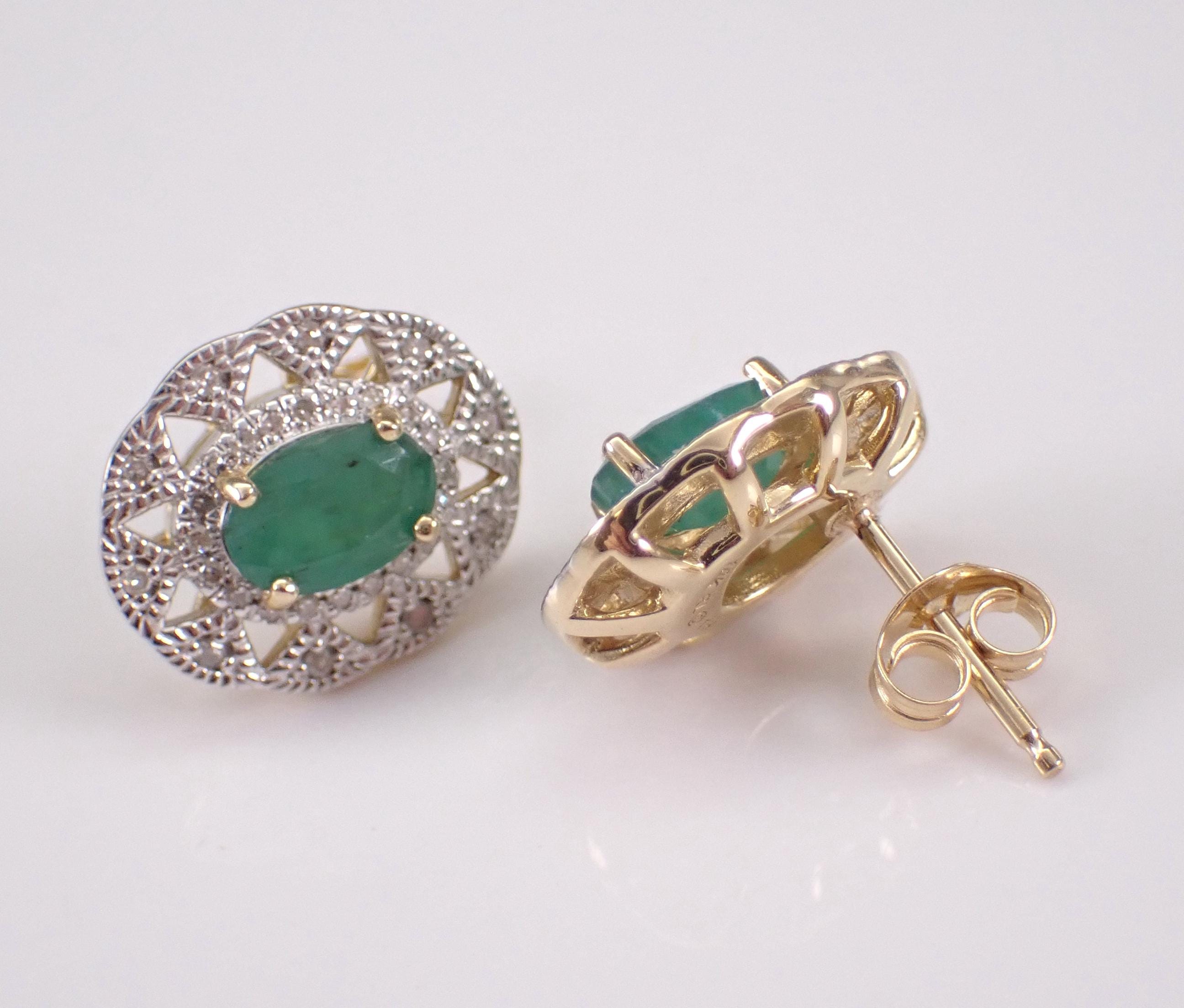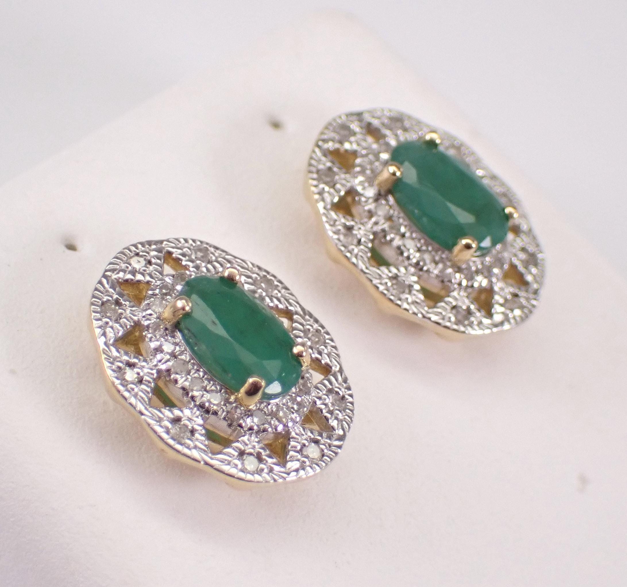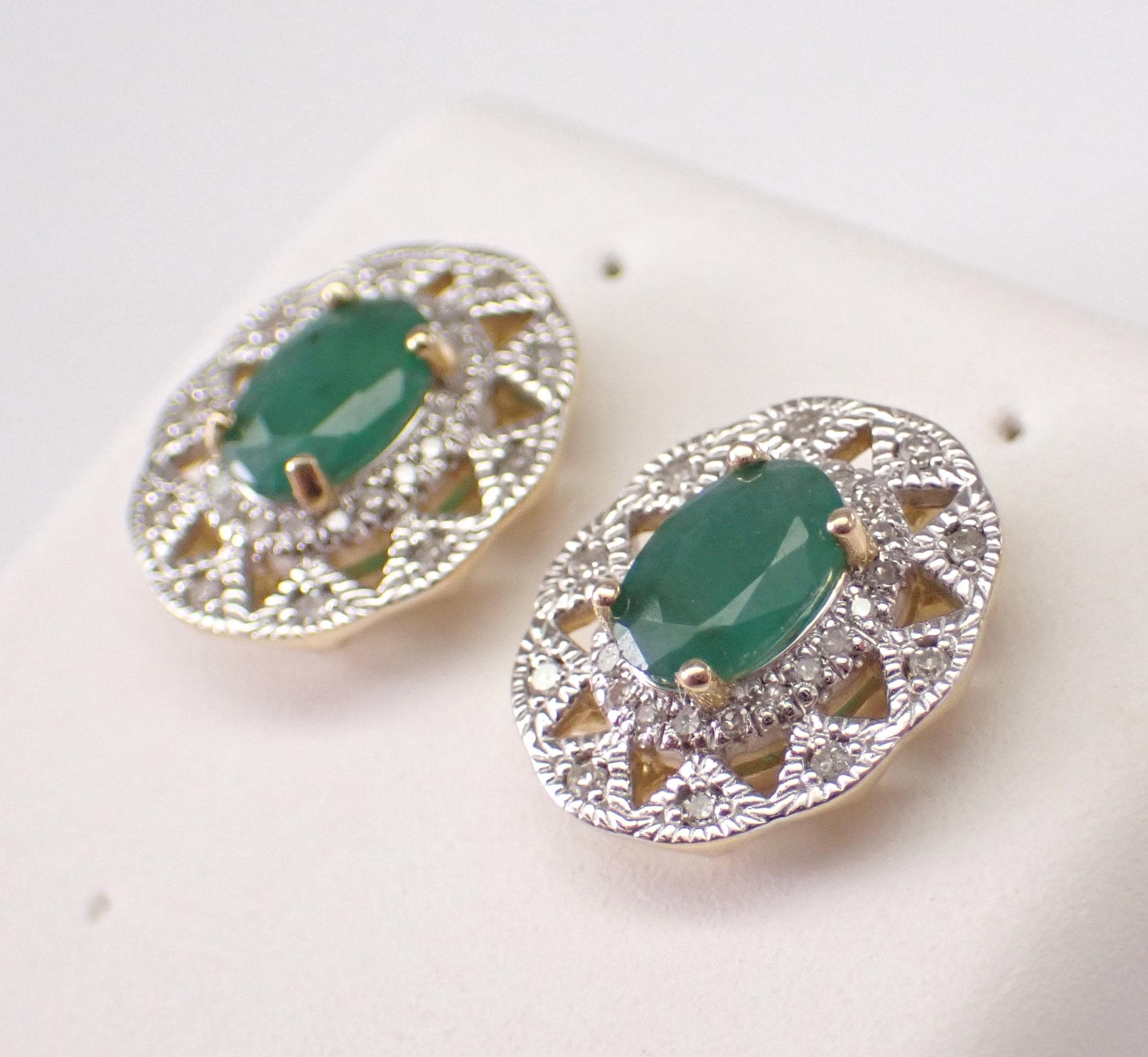 Yellow Gold Diamond and Emerald Halo Stud Earrings. These earrings are set with a genuine Oval Emerald in each earring. These Emeralds measure 6 X 4 mm each and weigh a total of 1 carat. There are sixty natural Round Brilliant Diamonds set in these earrings. These Diamonds are H color, I1 clarity and amount to a total weight of .15 carat. These earrings are 10K Yellow Gold, weigh 2.6 grams and measure 12 X 10 mm each. These earrings are for pierced ears and have friction post backings. These earrings will be accompanied by an appraisal written by a GIA Certified Diamond Grader with the retail replacement value of $1,495.00. I will ship these earrings promptly in a gift box.